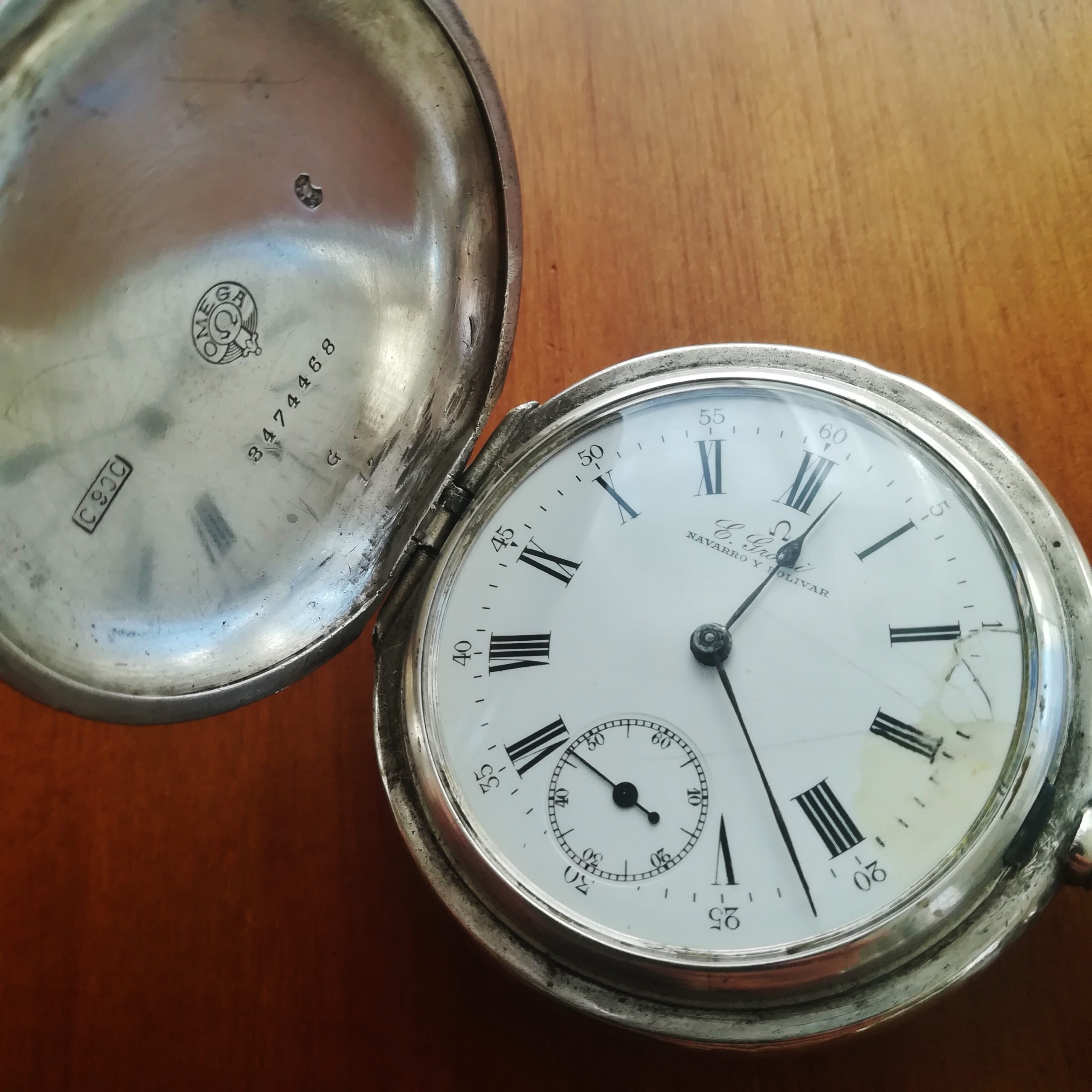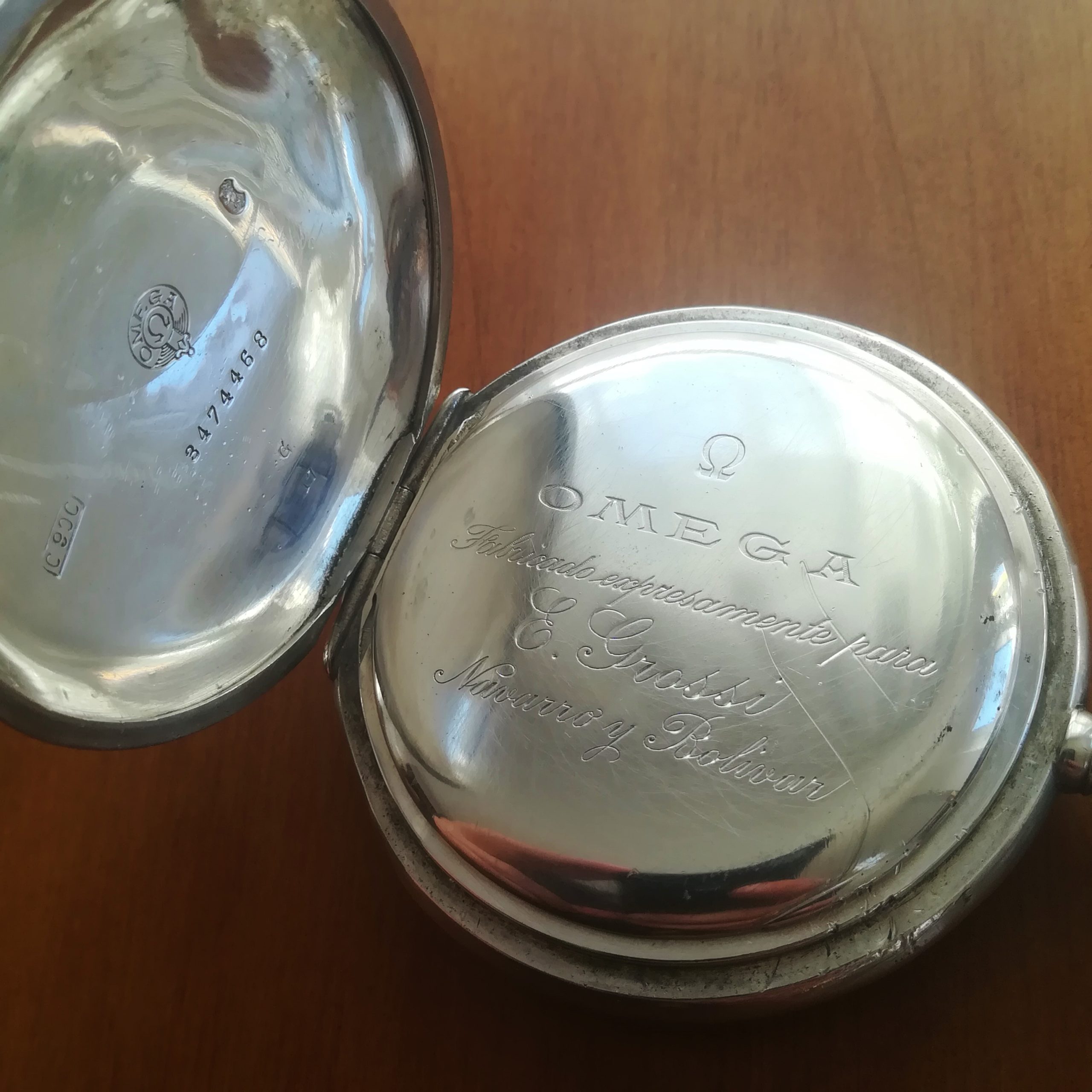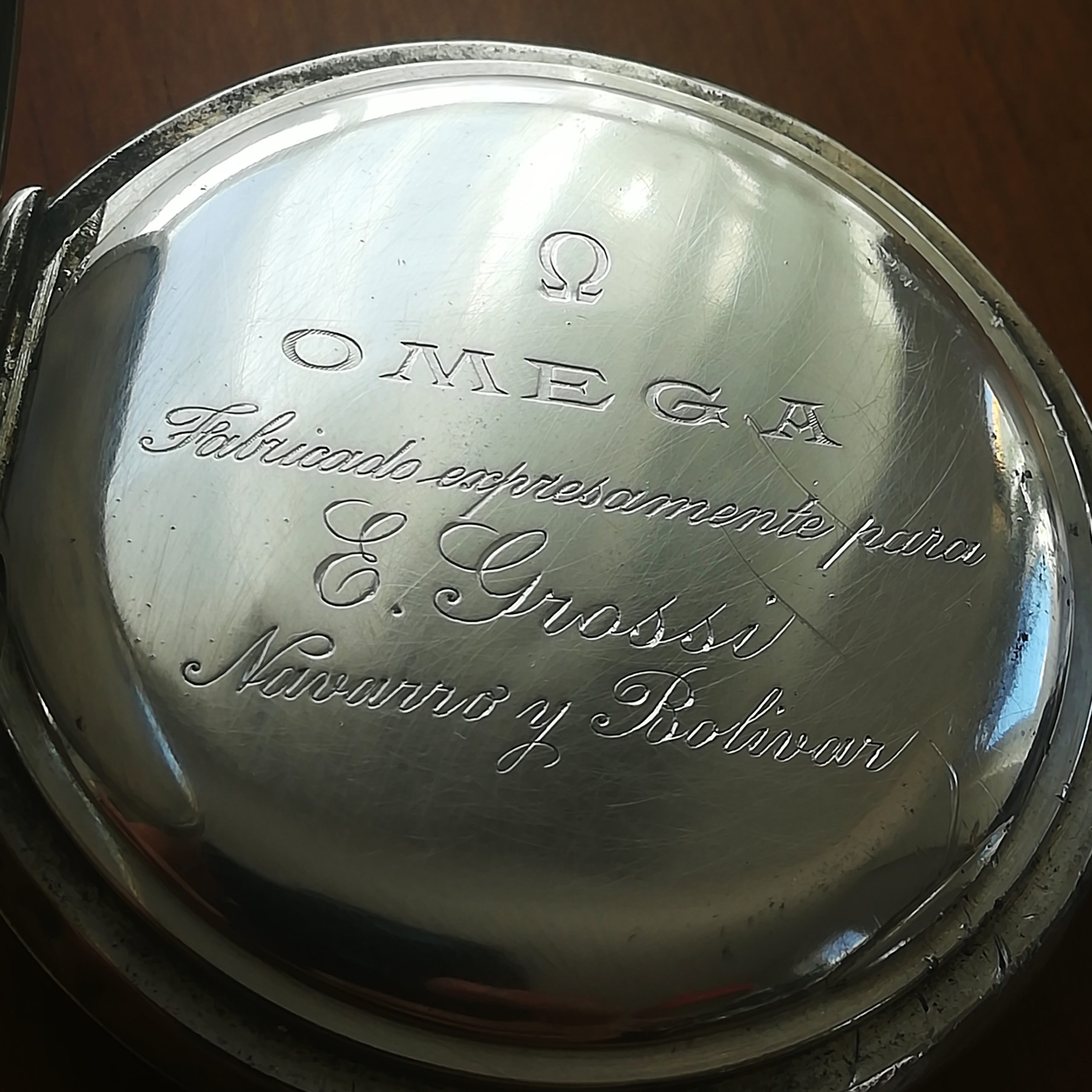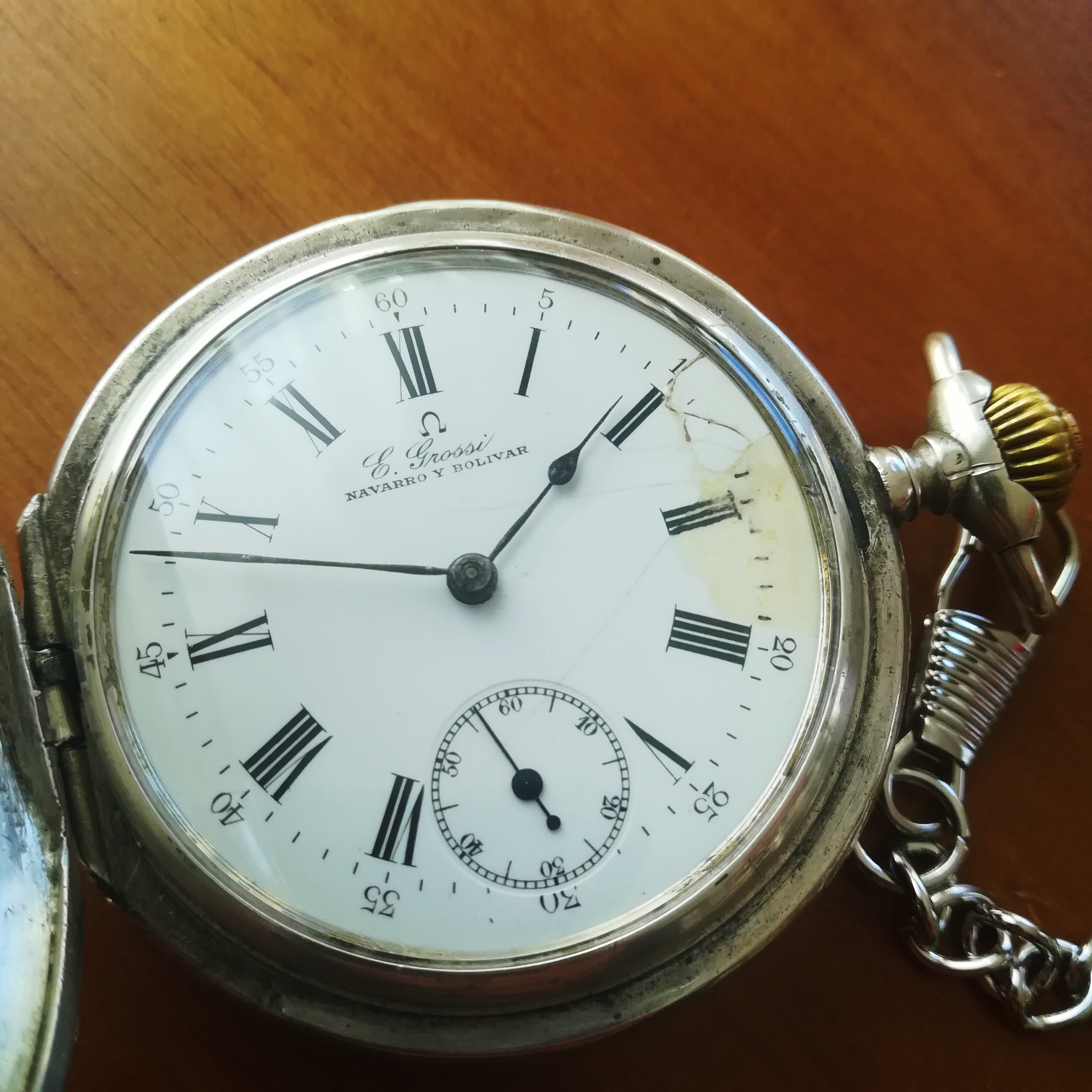 The engraved silver case has some scratches and wear as can be seen in the photos. The inner case is engraved for E. Grossi, a watch and jewerly store in Buenos Aires which is still in business! The enamel dial has some hairlines and a repair at III – please refer to the detailed photos. The watch also features a new metallic chain.