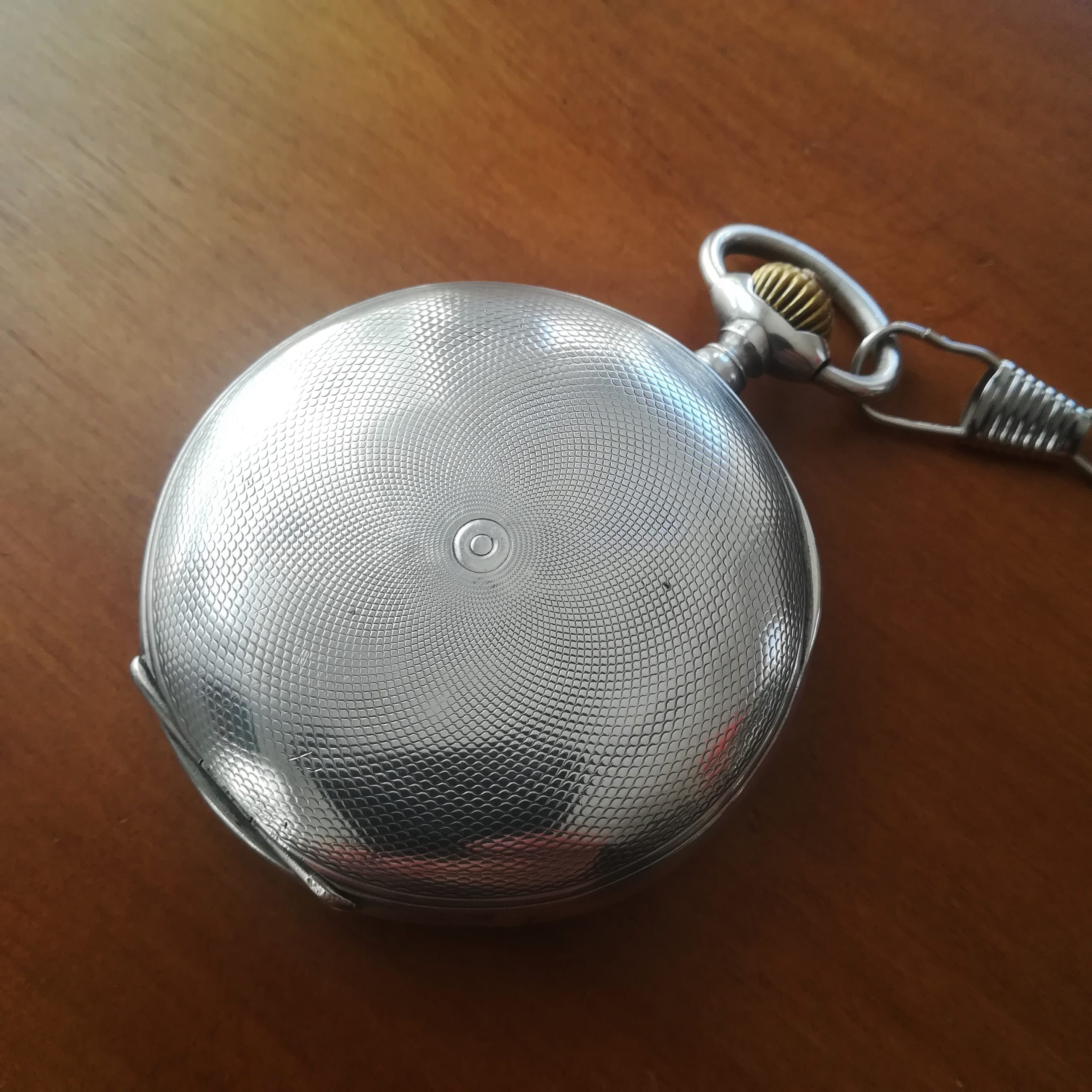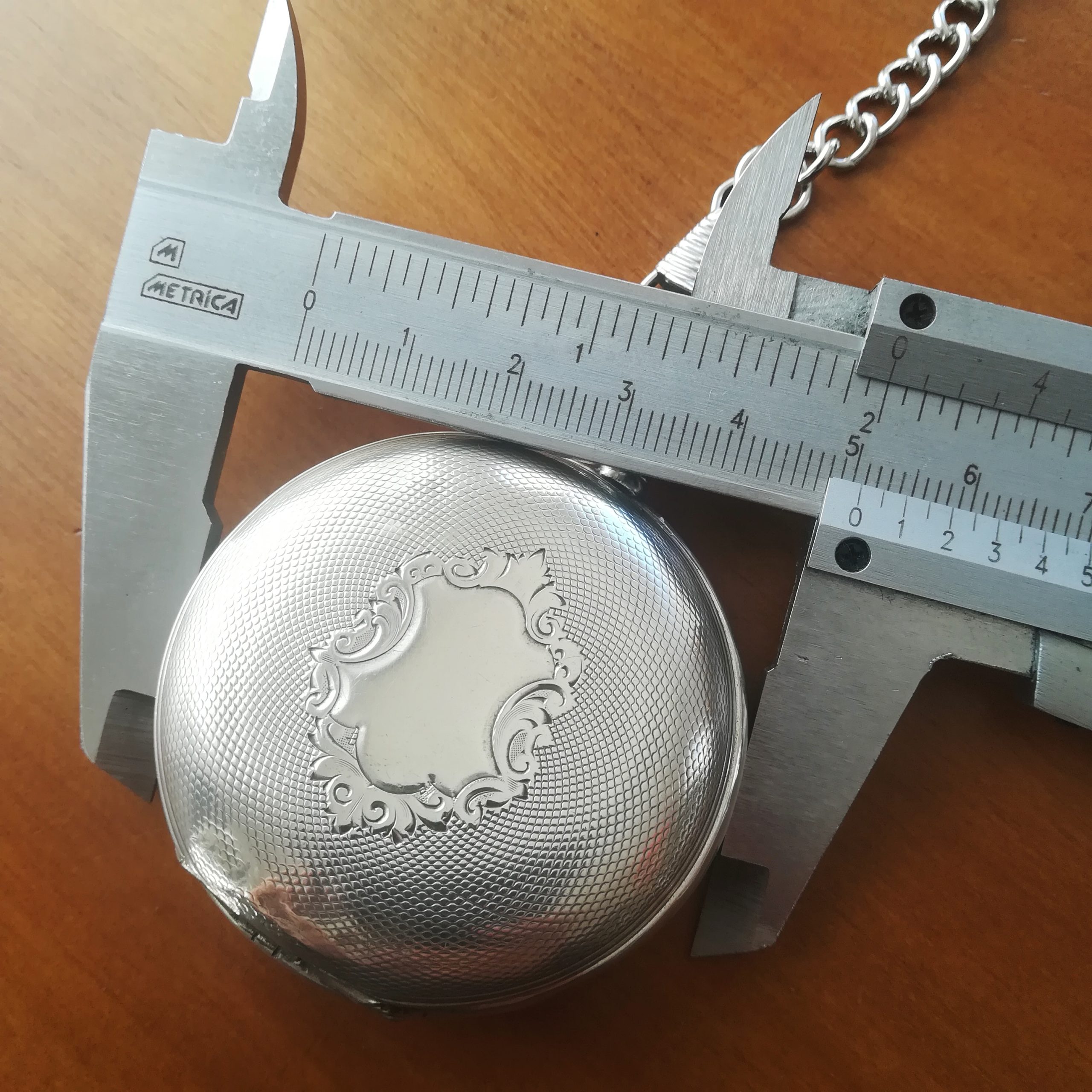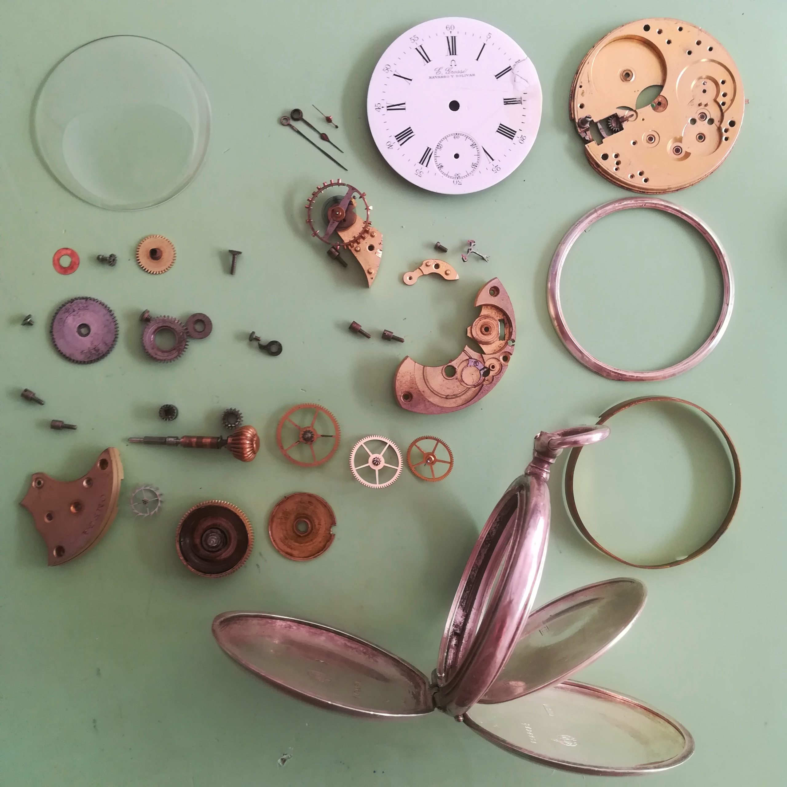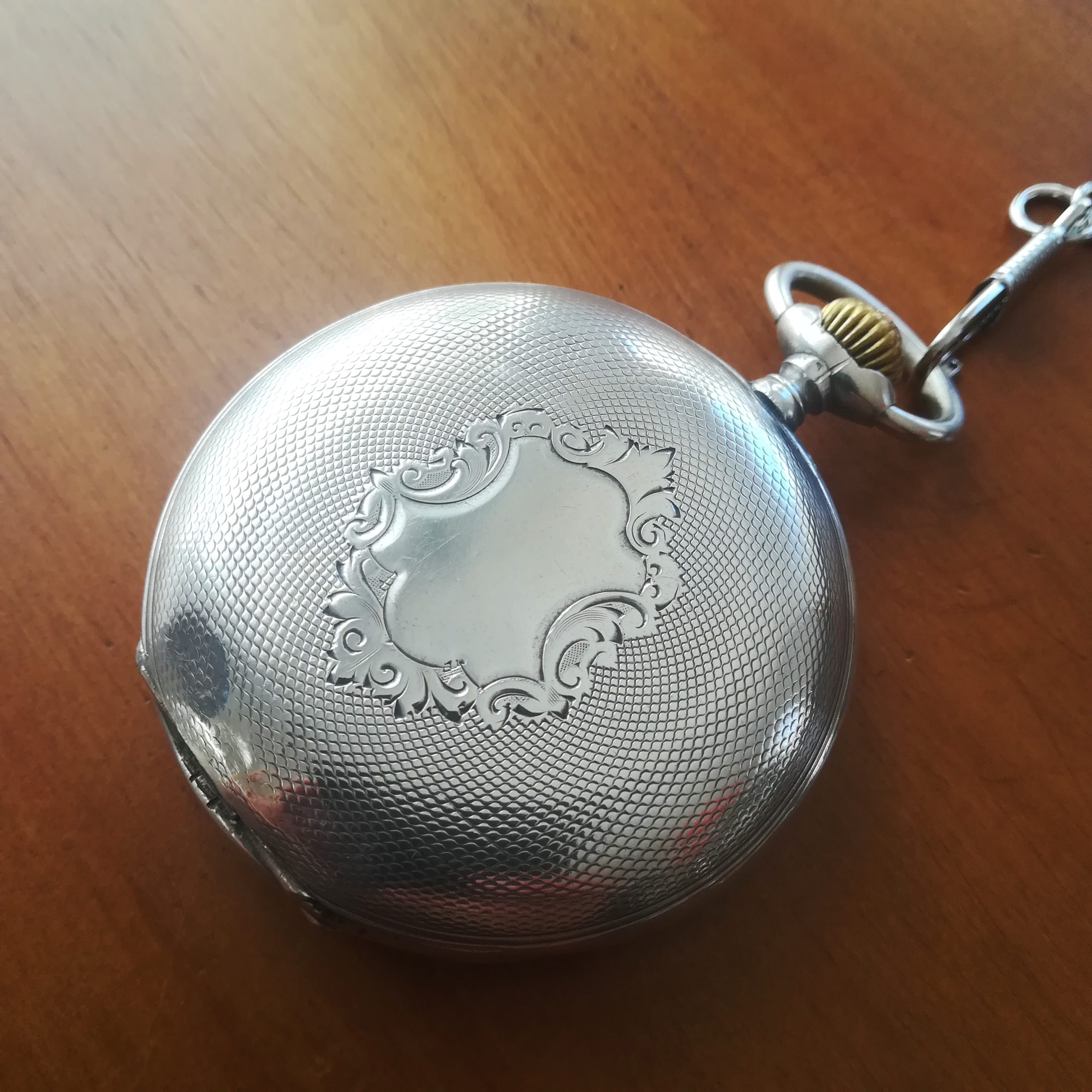 The engraved silver case has some scratches and wear as can be seen in the photos. The inner case is engraved for E. Grossi, a watch and jewerly store in Buenos Aires which is still in business! The enamel dial has some hairlines and a repair at III – please refer to the detailed photos. The watch also features a new metallic chain.