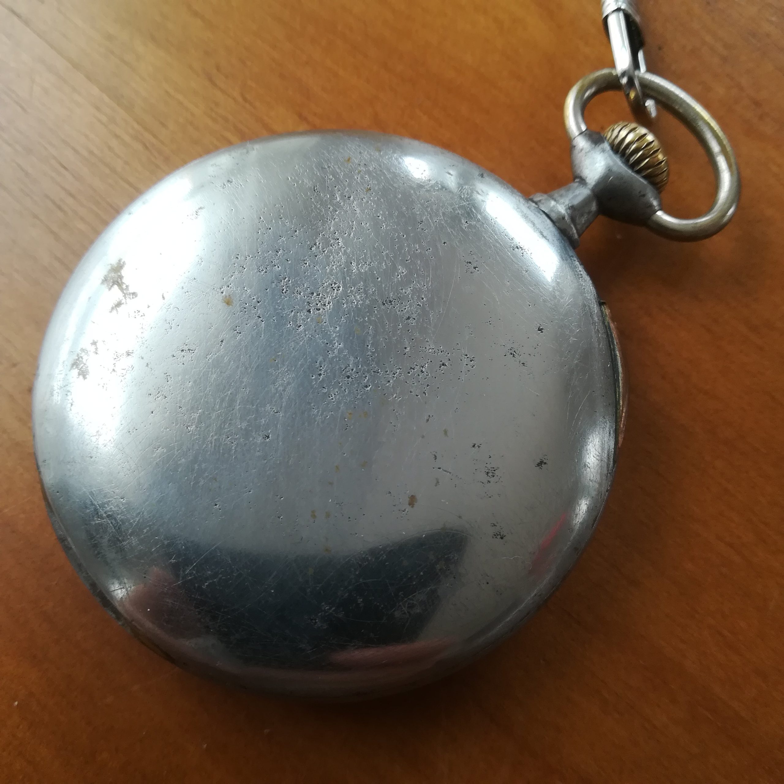The case is metal, with some scratches and dents as can be seen in the photos. The inner part is blued steel. The enamel dial has some hairlines – please refer to the photos. The watch also features a new metallic chain.