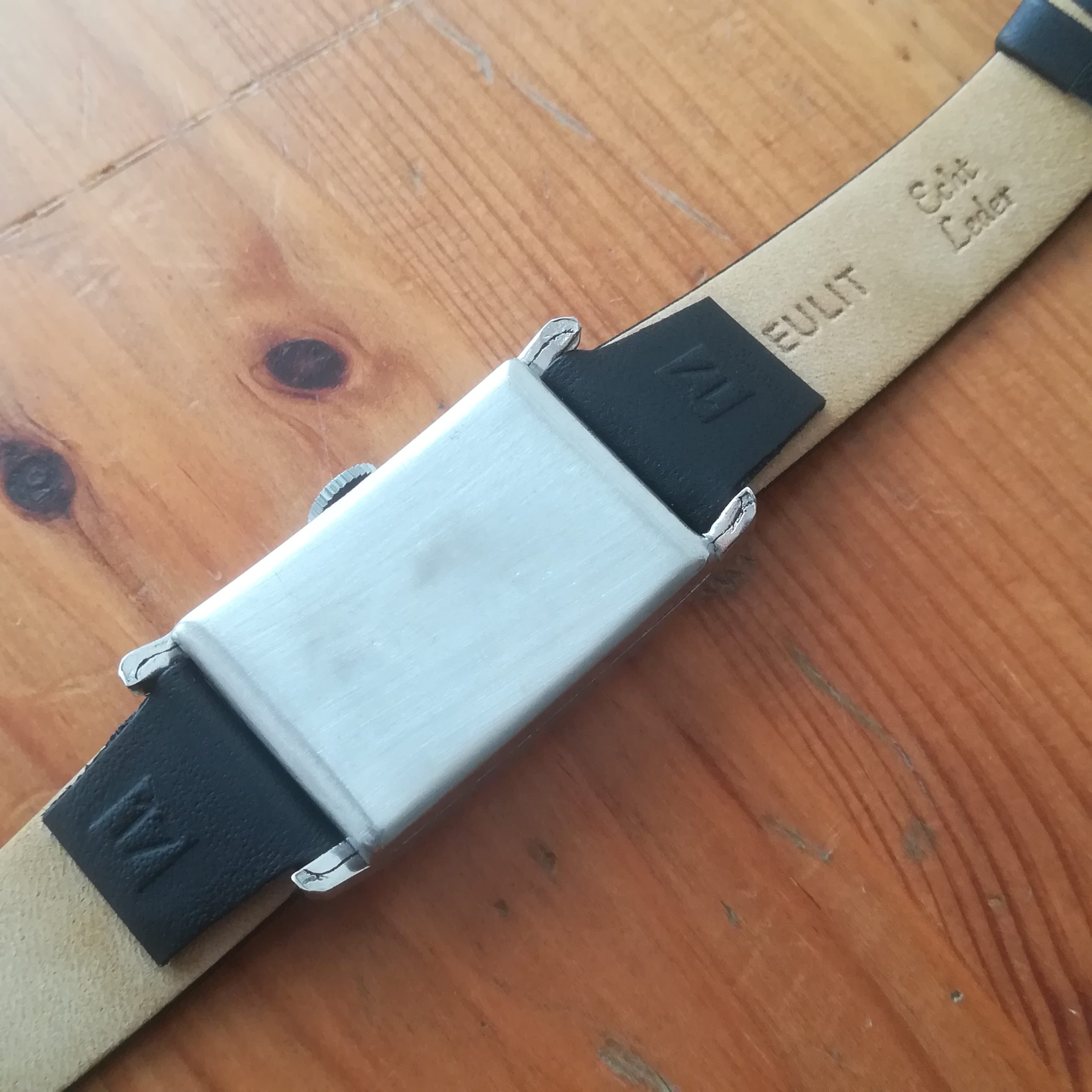 This piece has a steel case and the unrestored original dial shows some signs of its age – please check the pictures. The watch also features a new black leather strap for fixed lugs. It will fit wrists of up to 20 cm. Lug width is 17 mm. Water resistance has not been tested, therefore it must be treated as NON-waterproof.