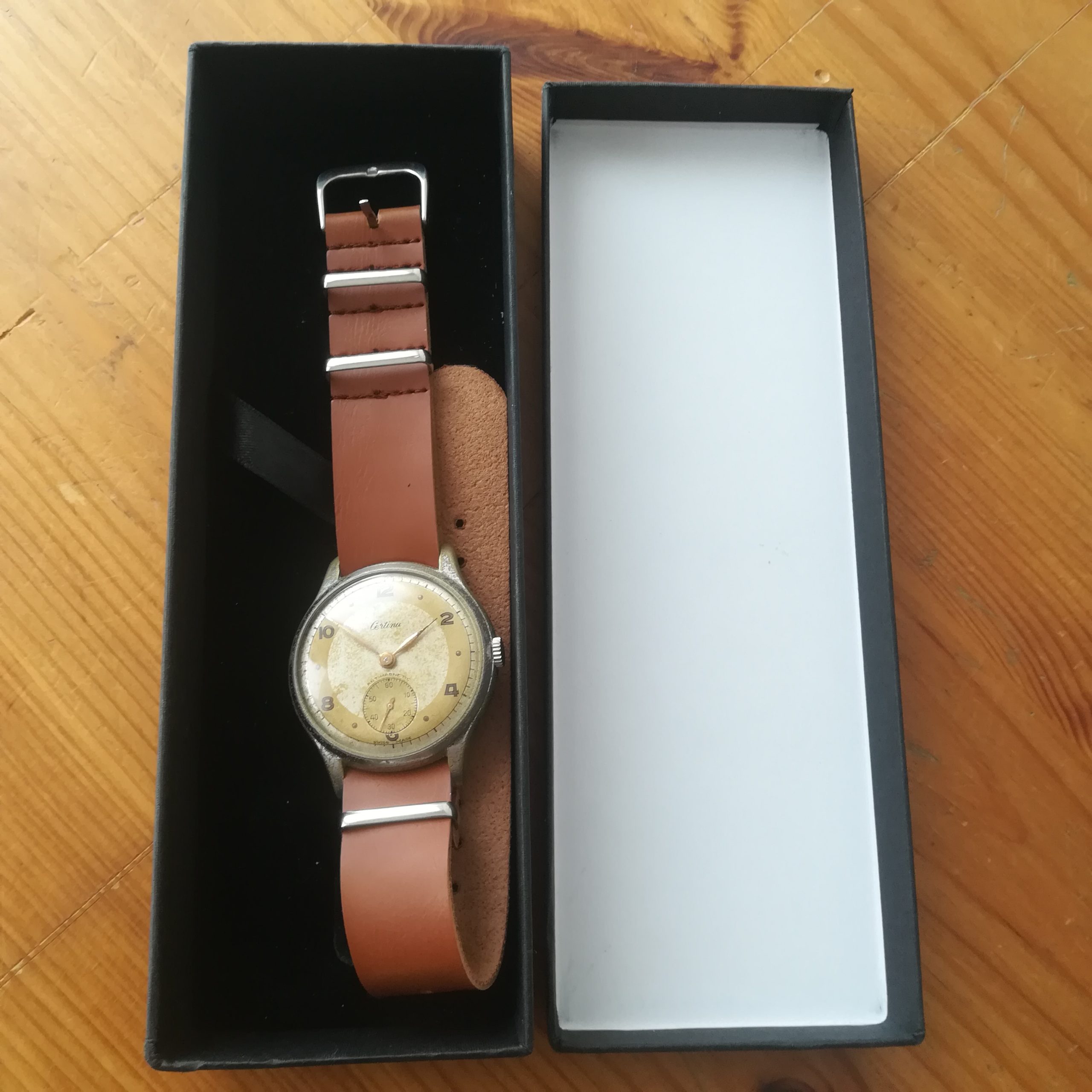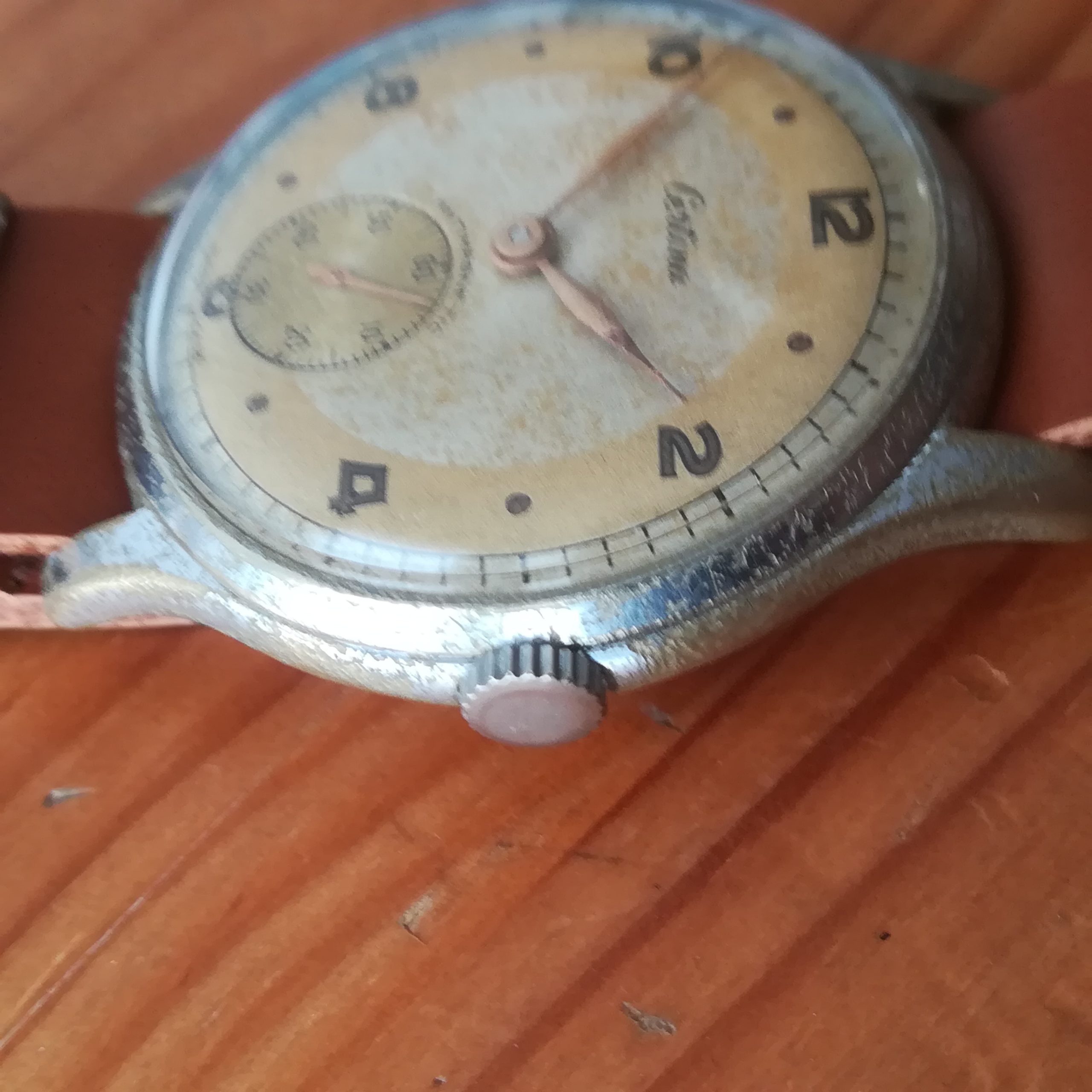 The chromed case is quite worn – please check the photos. The bitone dial shows a nice patina. The watch also features a new NATO-style brown faux leather strap. It will fit wrists of up to 24 cm. Lug width is 18 mm.