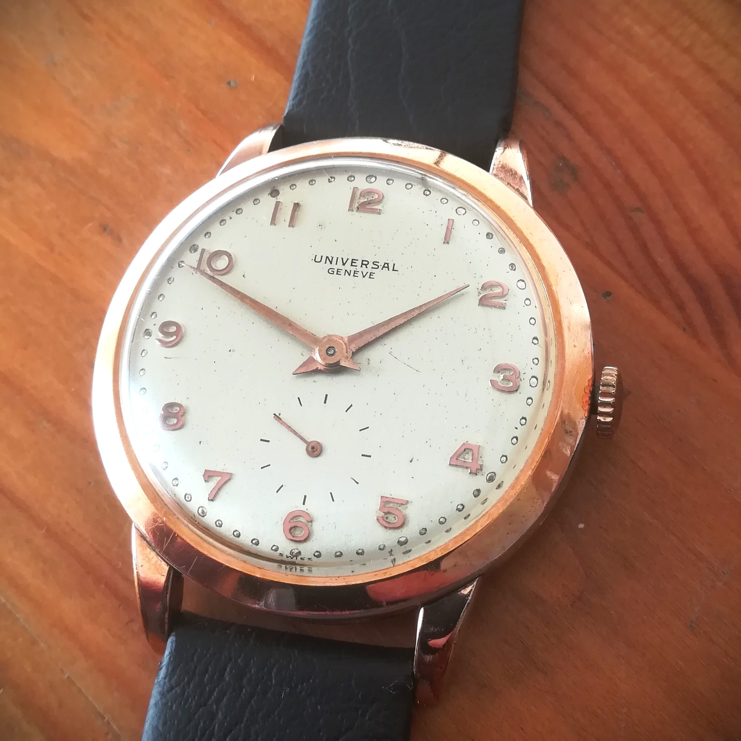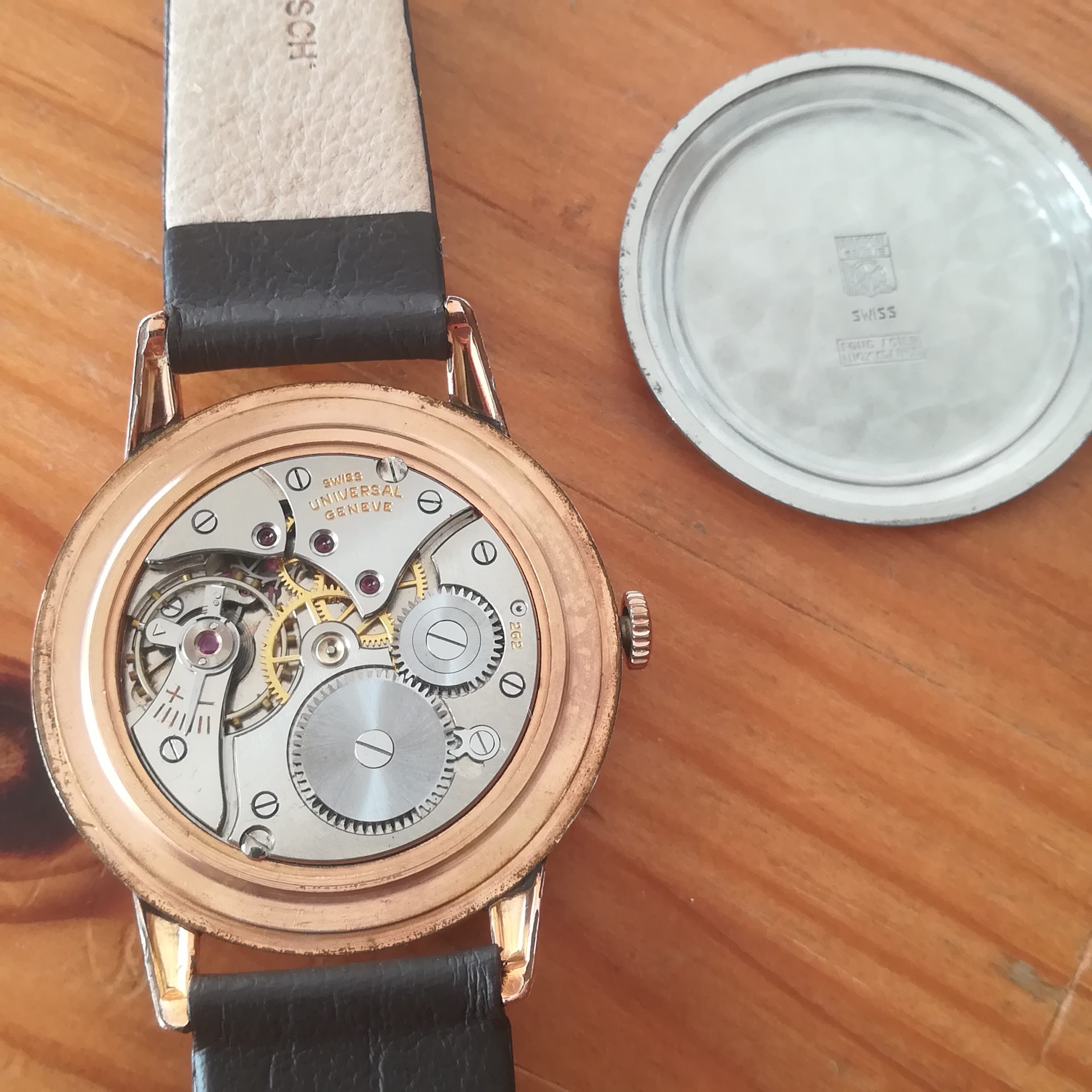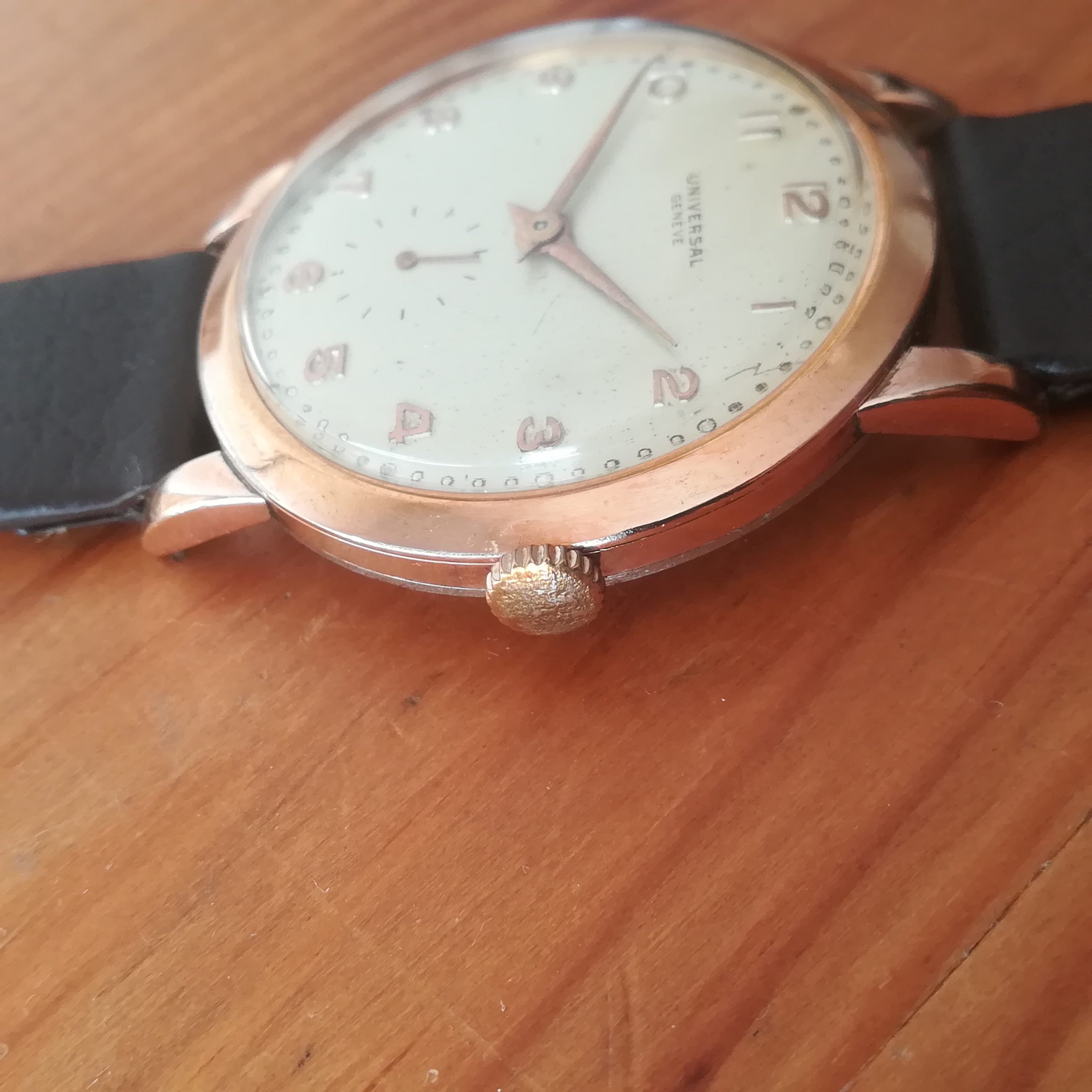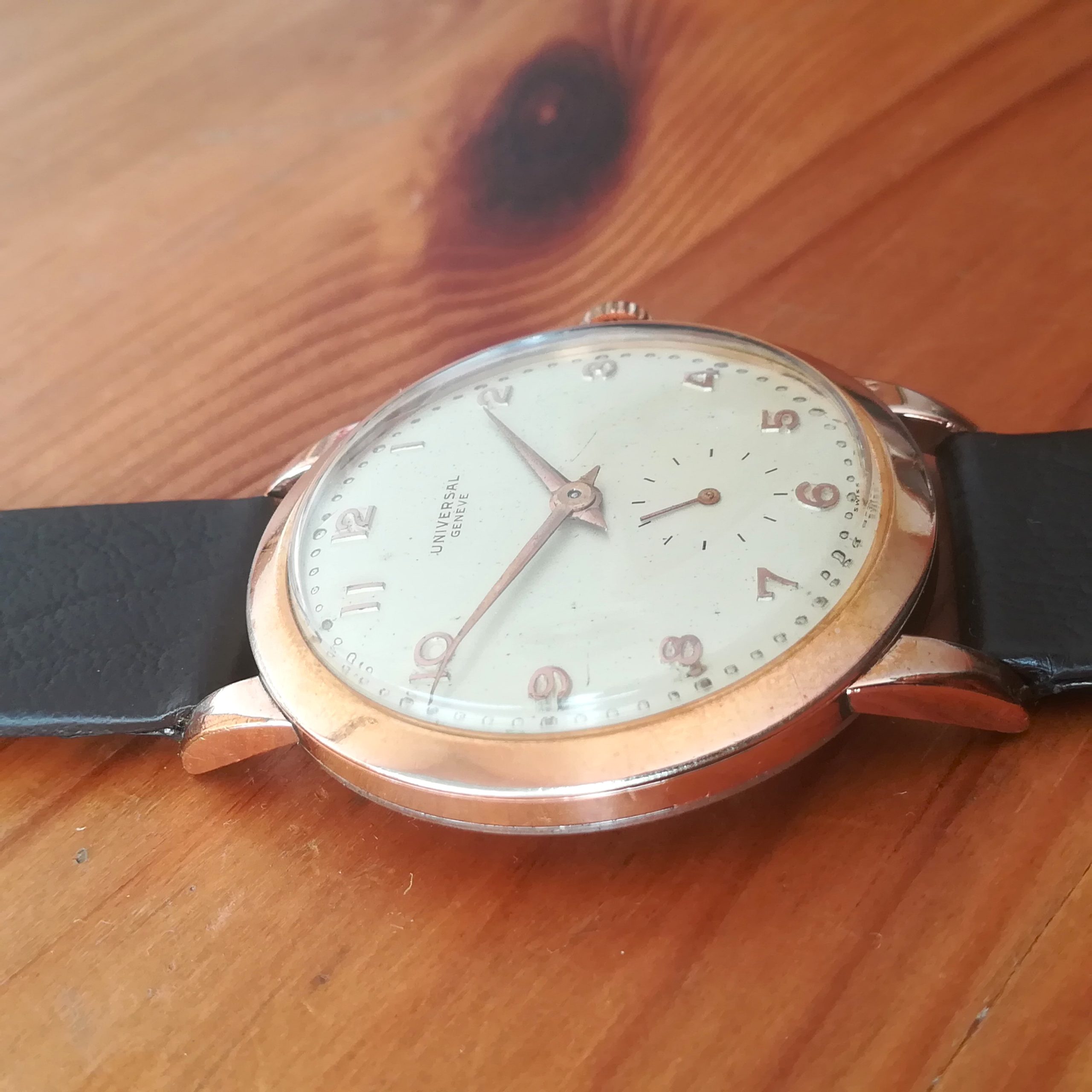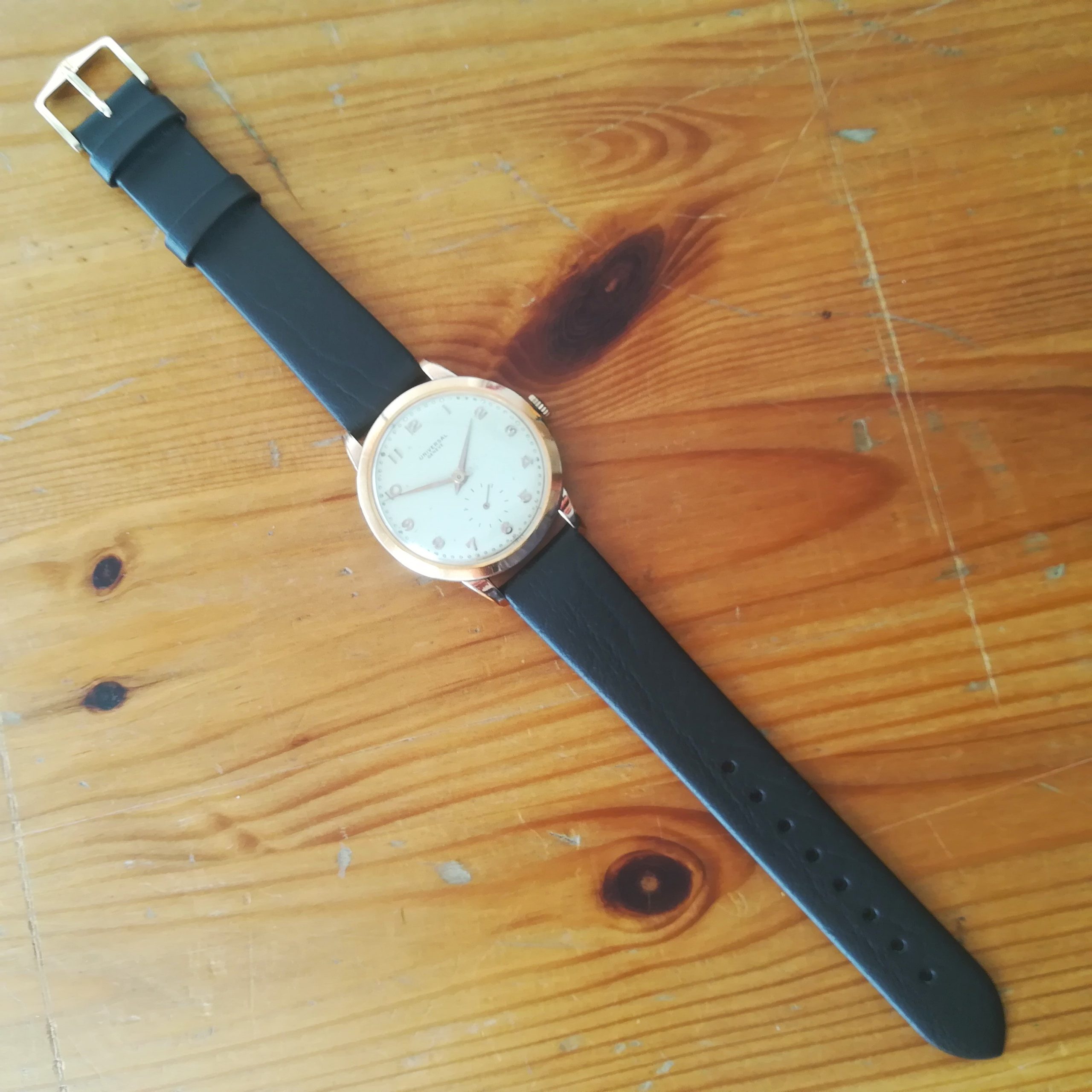 UNIVERSAL GENEVE vintage watch, with in-house 262 movement, Swiss made in 1950 (according to its serial number), 37 mm across excluding the crown, hand-wound (mechanical, no battery!), working fine and serviced.