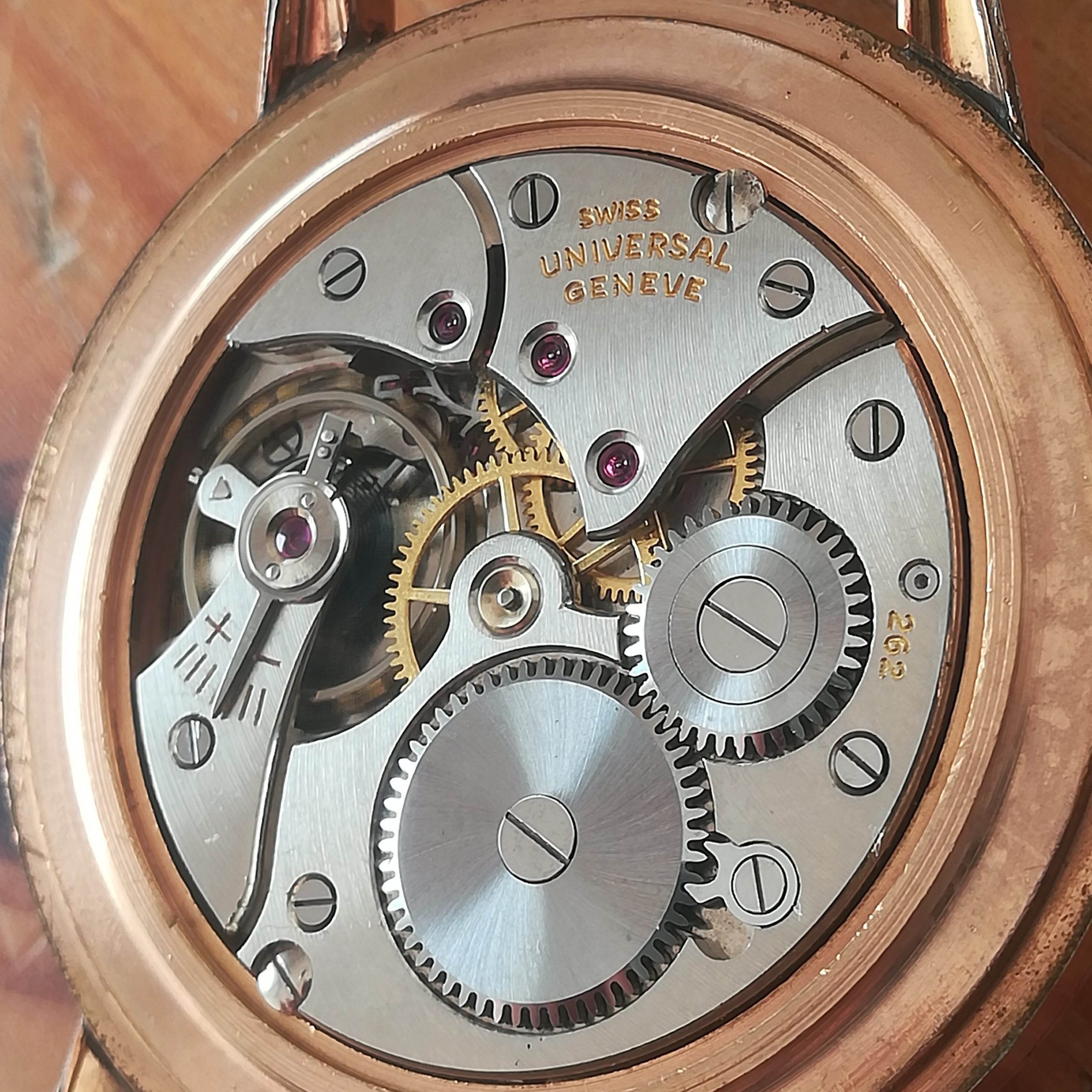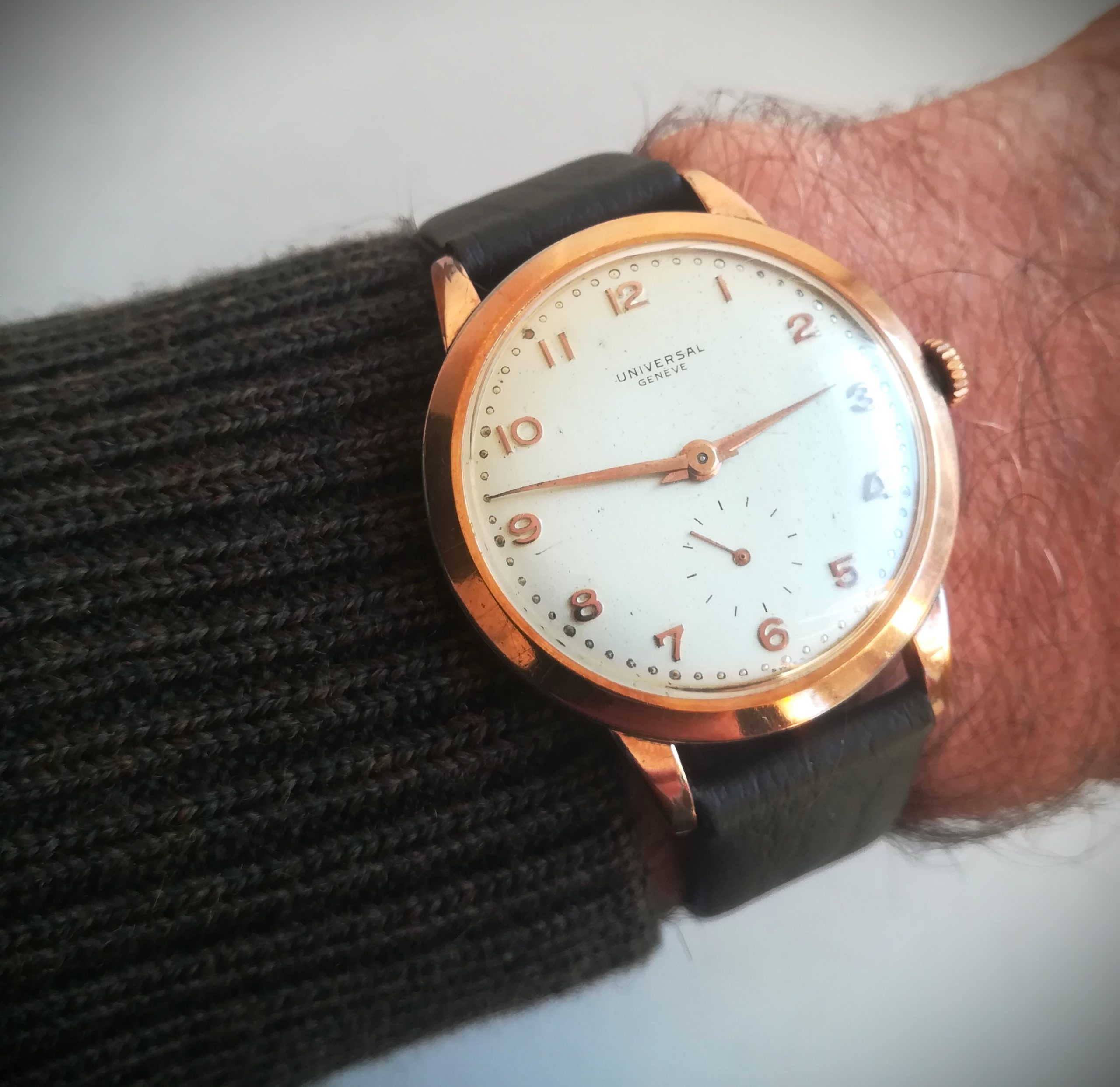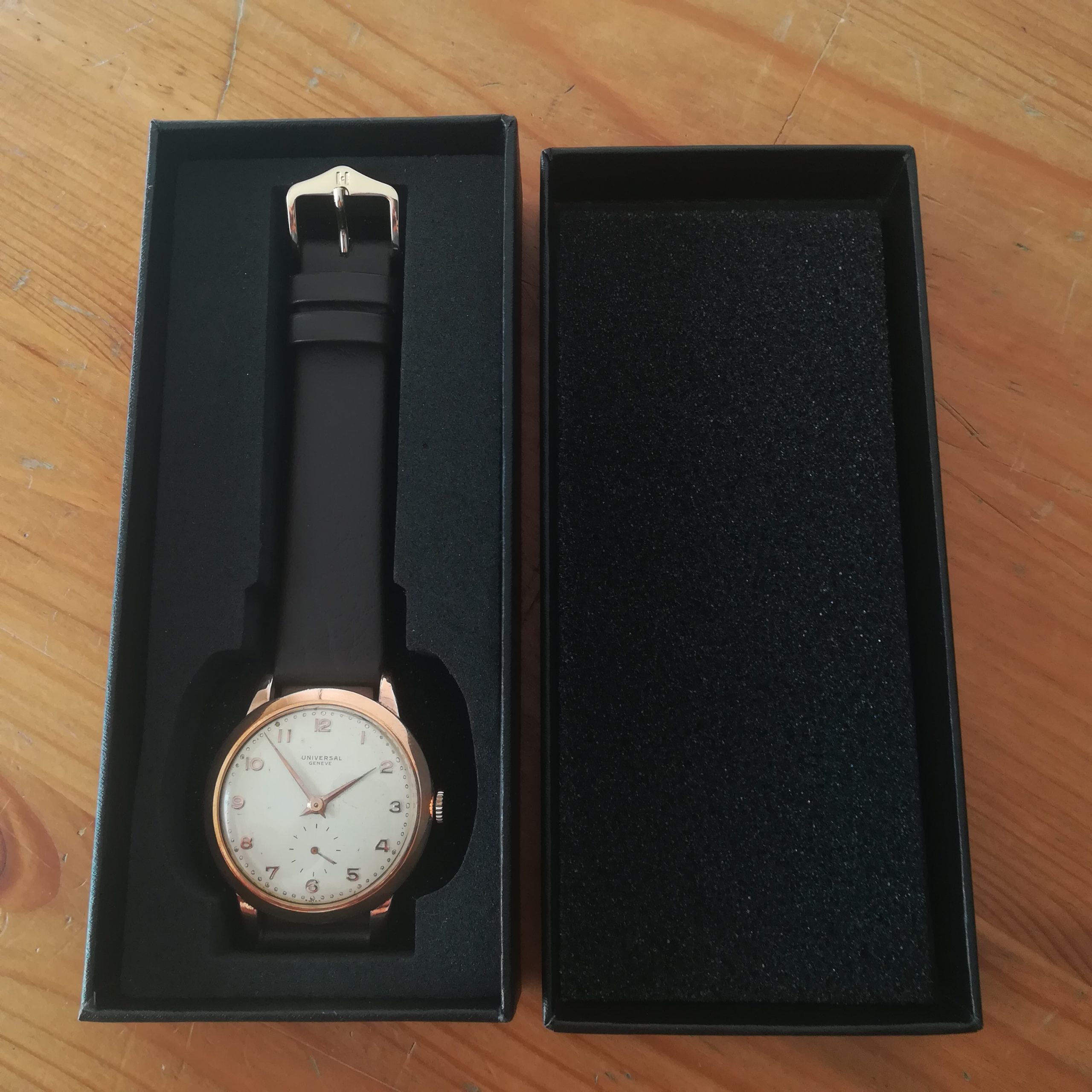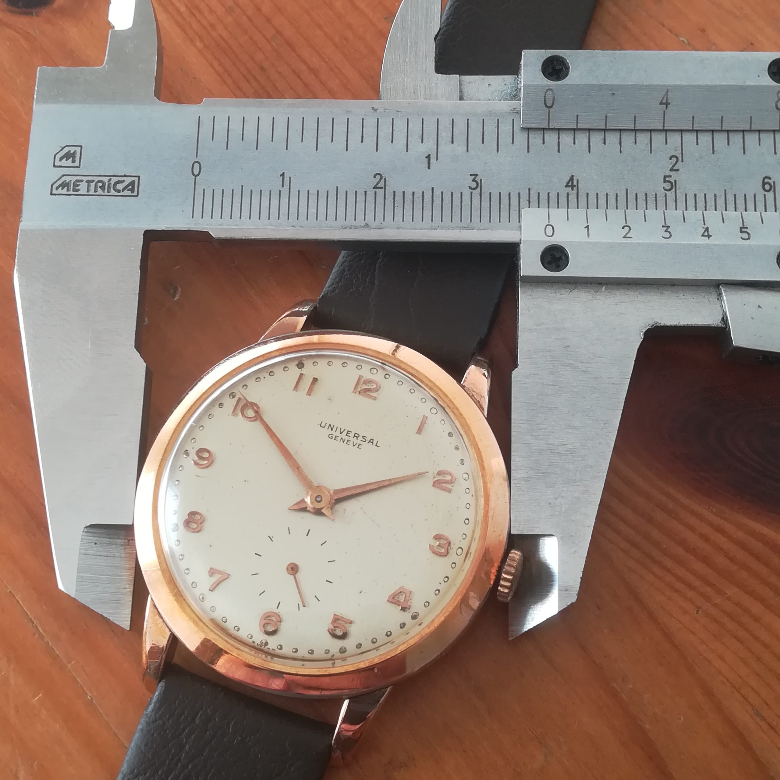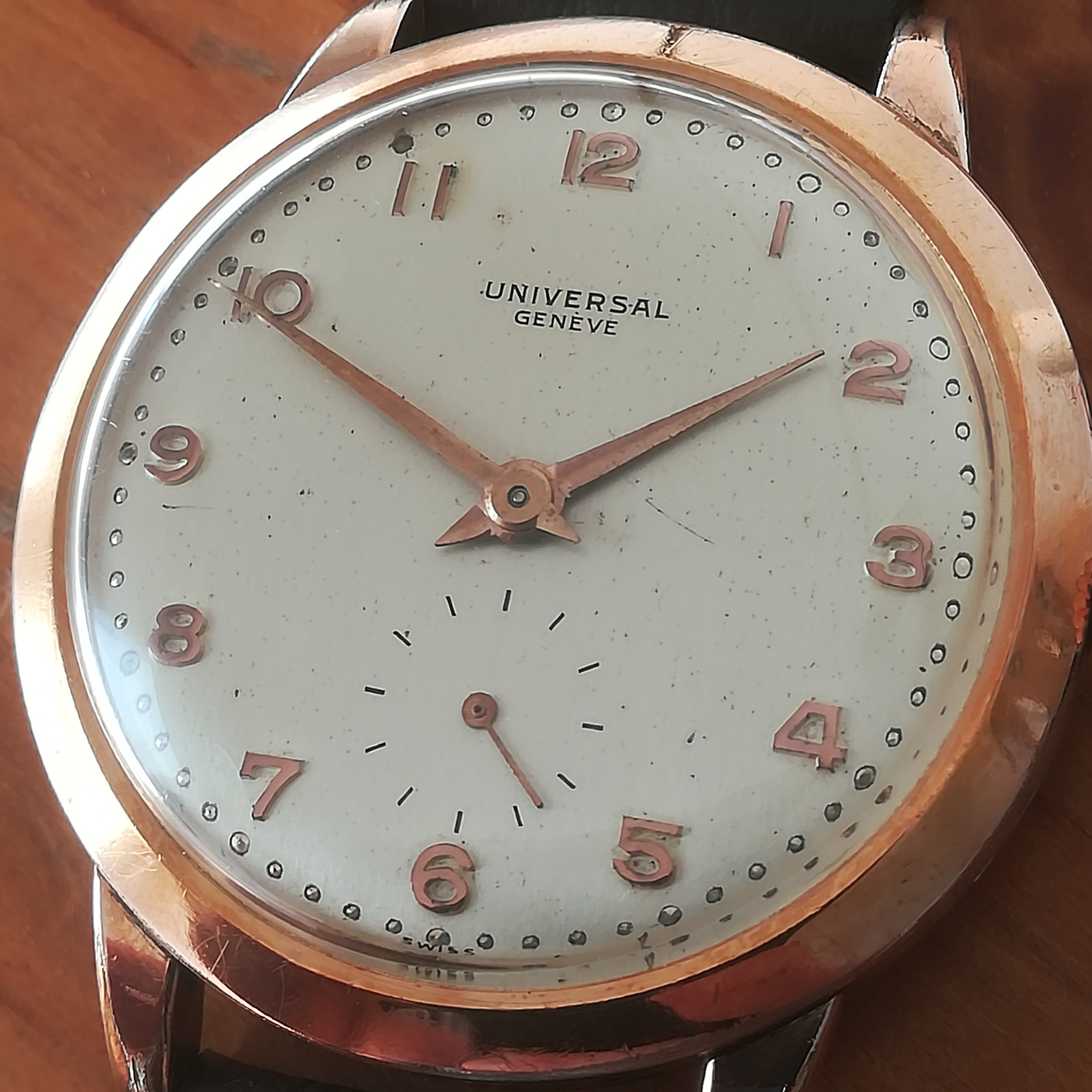 UNIVERSAL GENEVE vintage watch, with in-house 262 movement, Swiss made in 1950 (according to its serial number), 37 mm across excluding the crown, hand-wound (mechanical, no battery!), working fine and serviced.