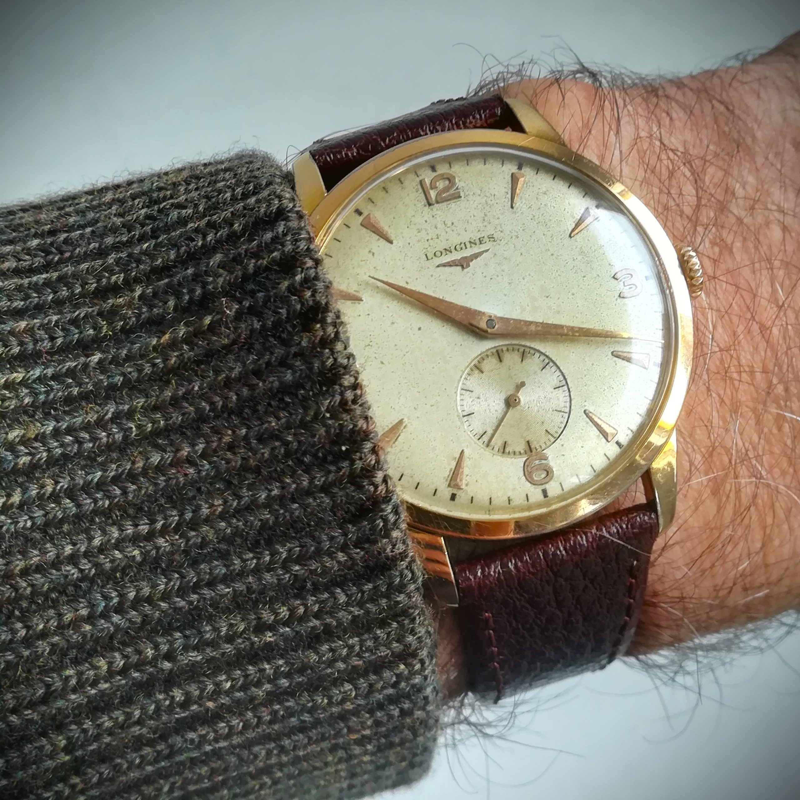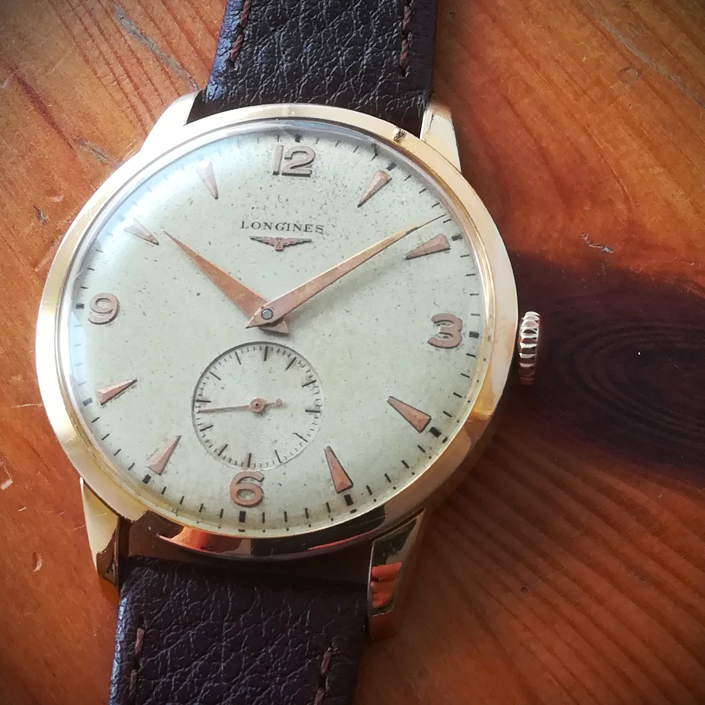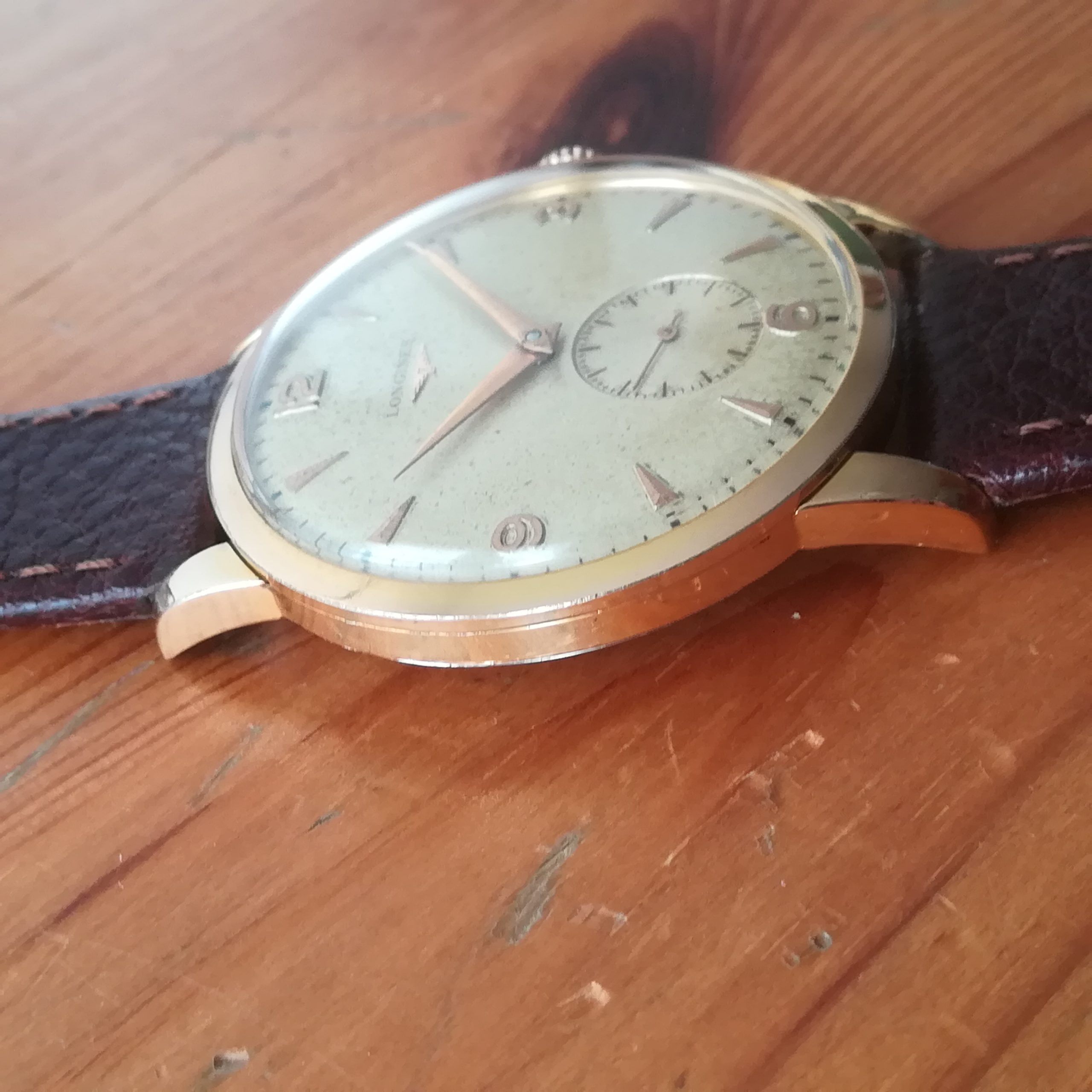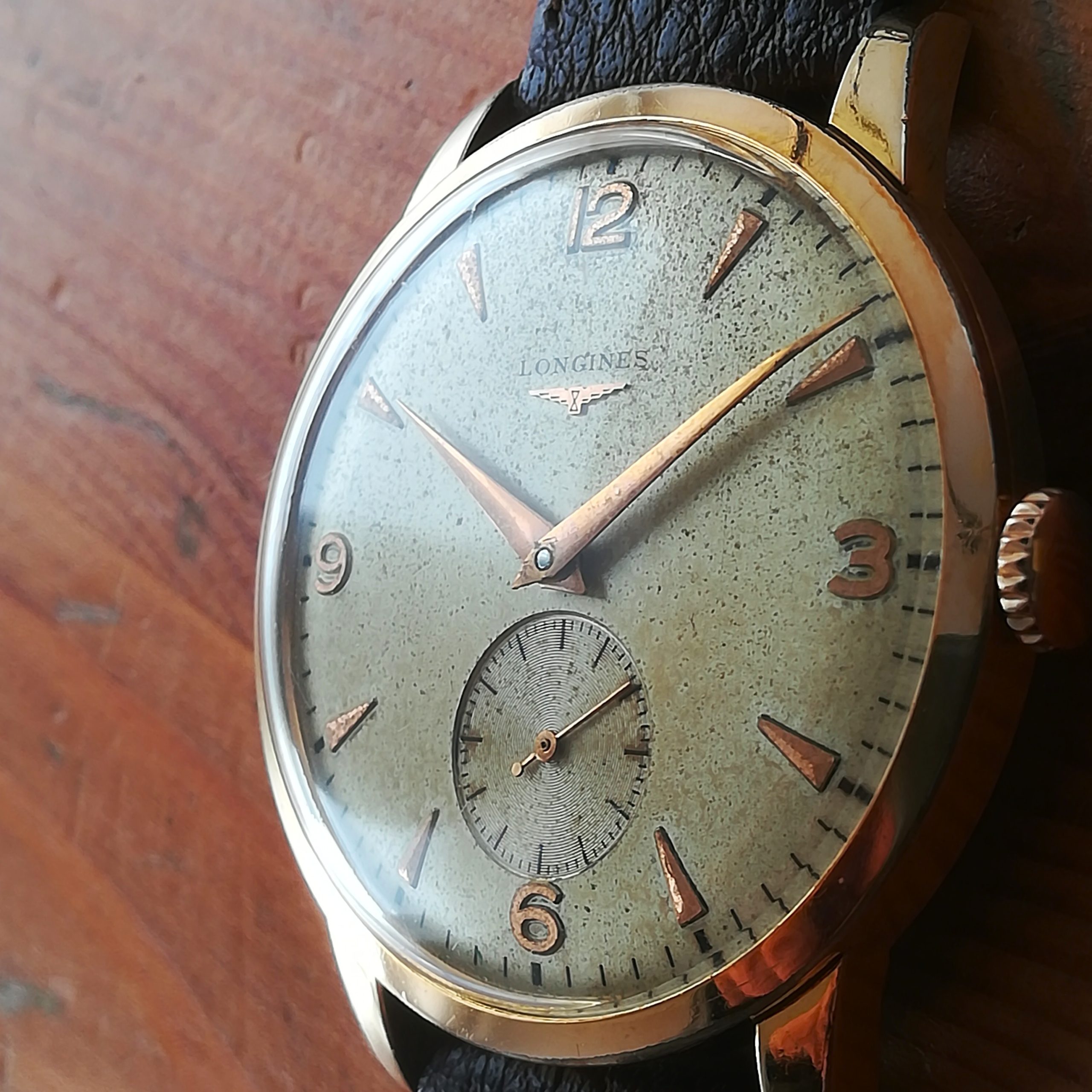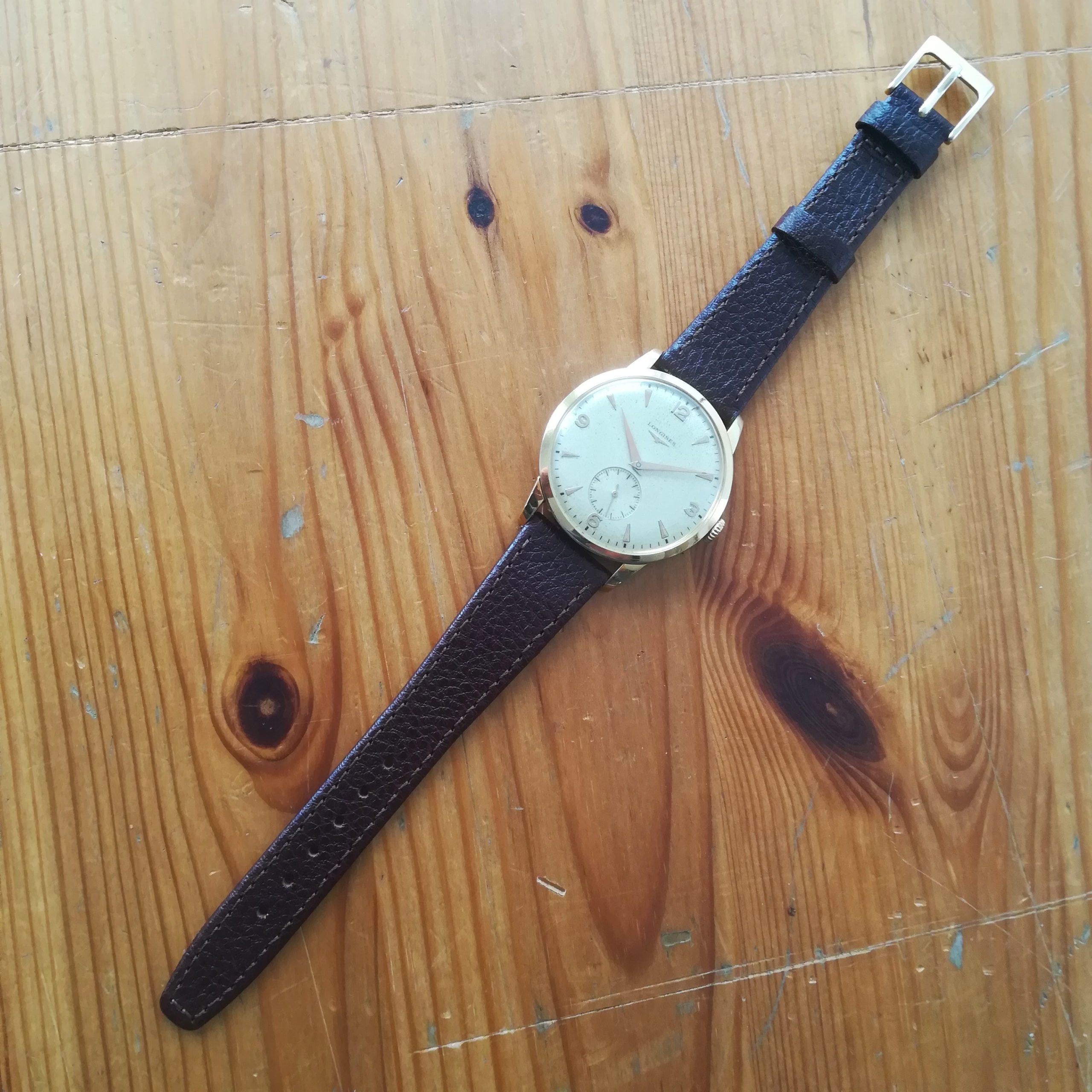 LONGINES vintage watch, with in-house 12.68z movement, Swiss made in 1952 (according to its serial number and the Longines registers), case of 37.5 mm across excluding the crown (Jumbo size), hand-wound (mechanical, no battery!), working fine and serviced. Ref. 6210-2 / 73.