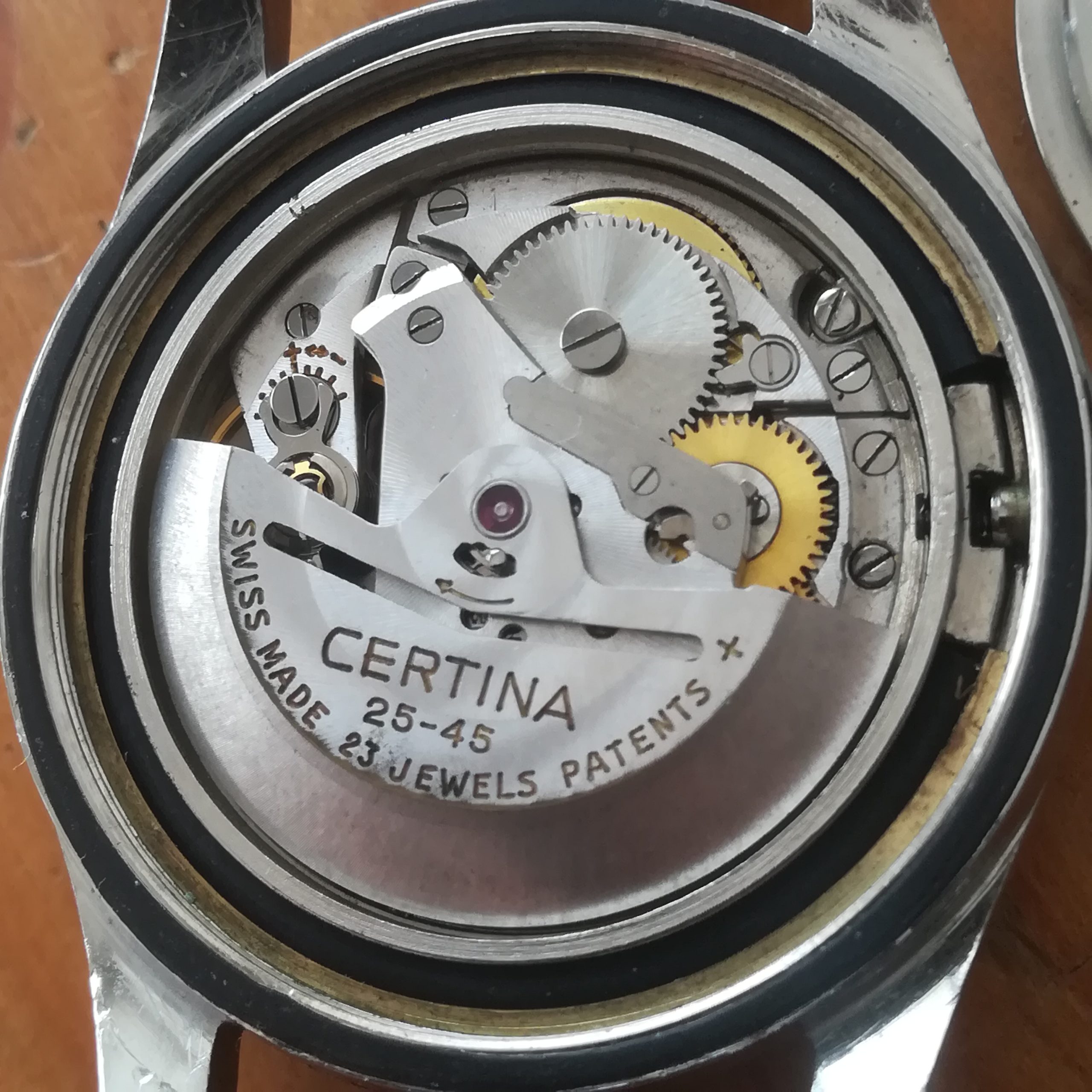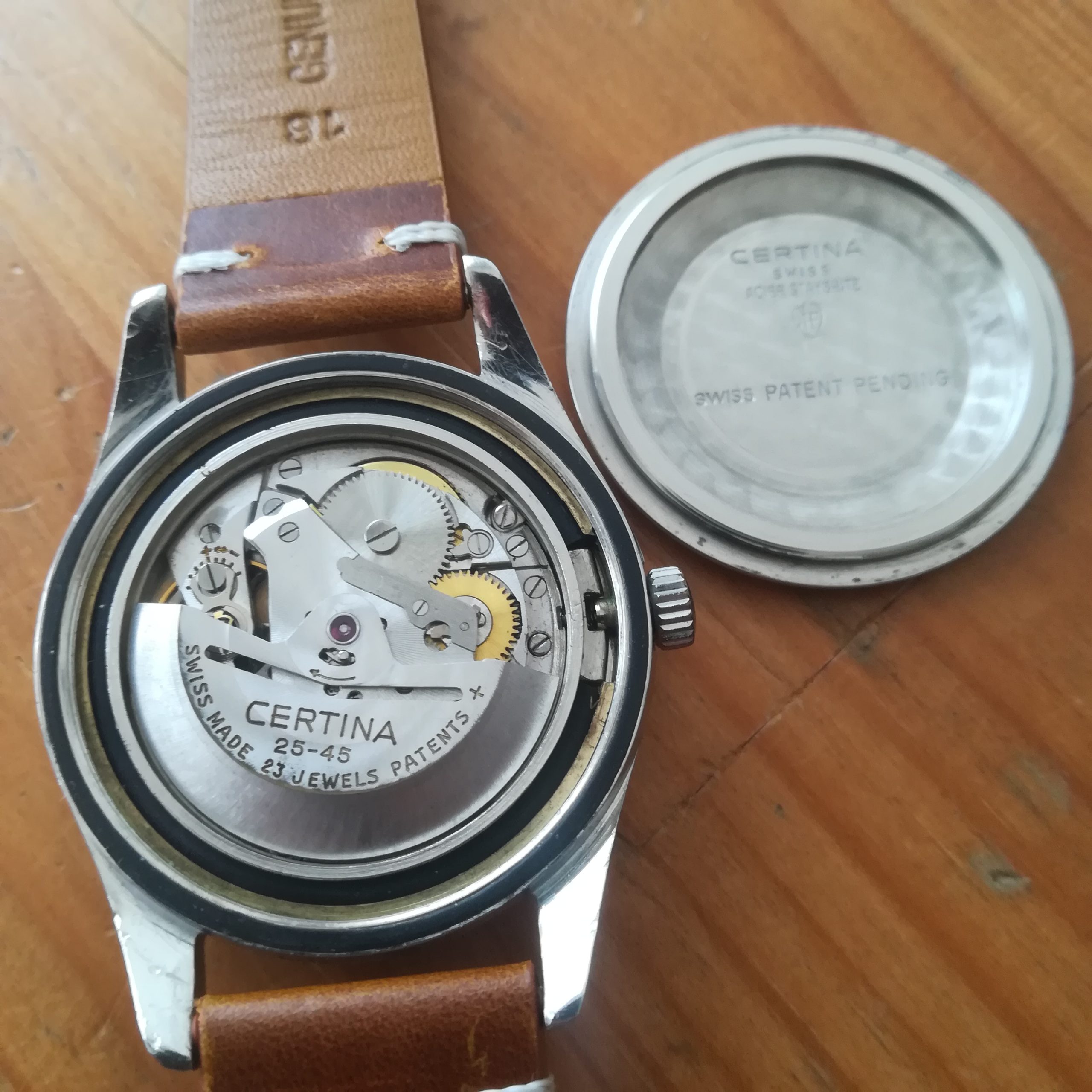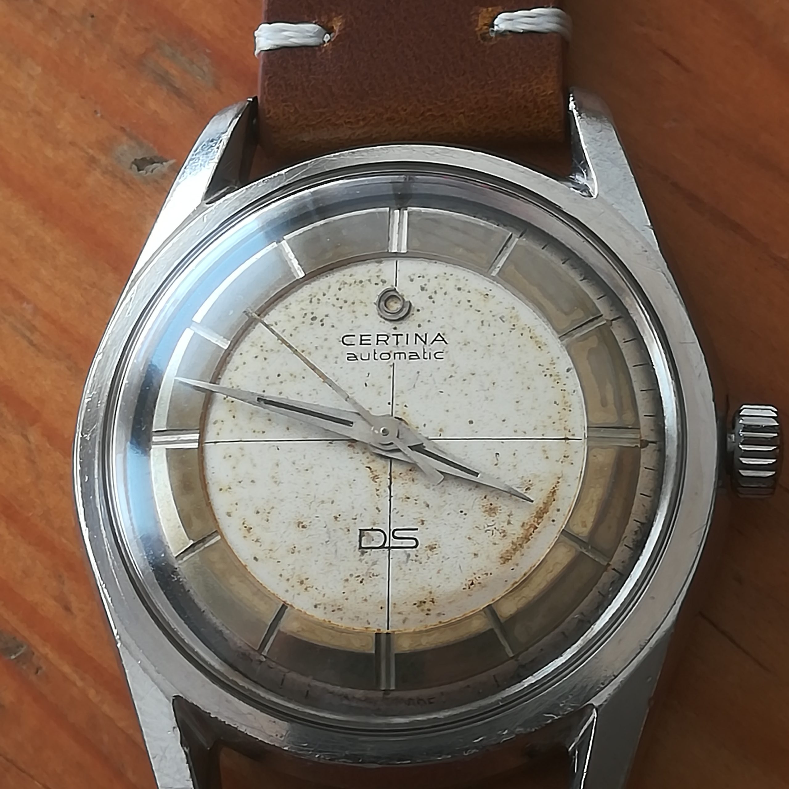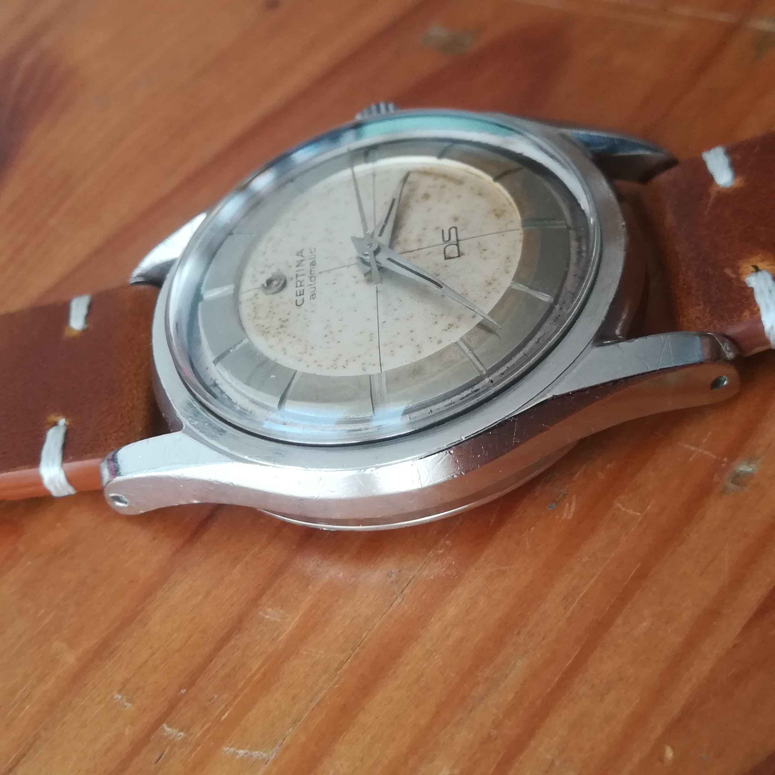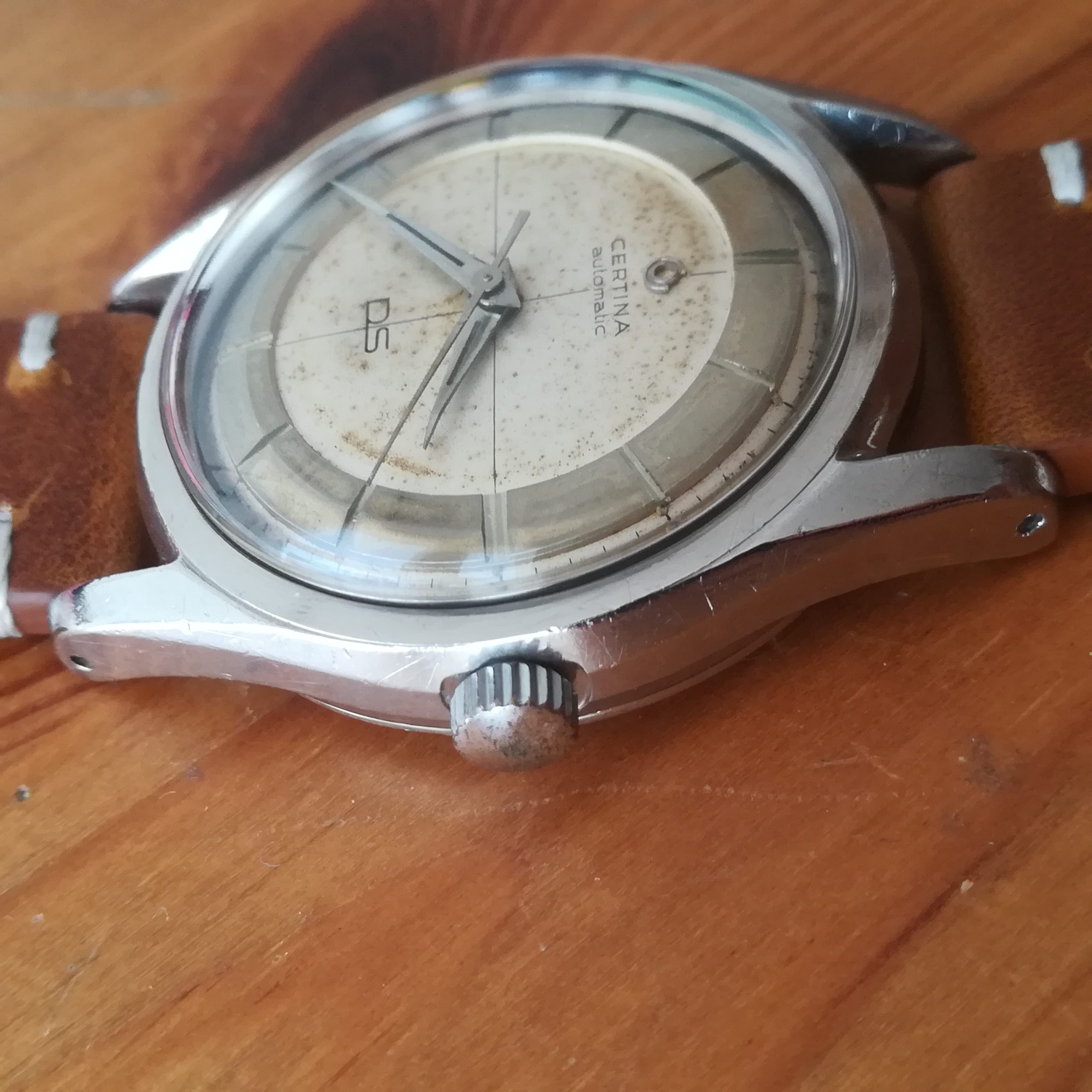 CERTINA DS vintage automatic watch, with in-house 25-45 movement, Swiss made in 1959, case of 36 mm excluding the crown, automatic (self-winding with the user’s movements) and hand-wound (mechanical, no battery!), working fine and serviced. Ref. 5601 012.