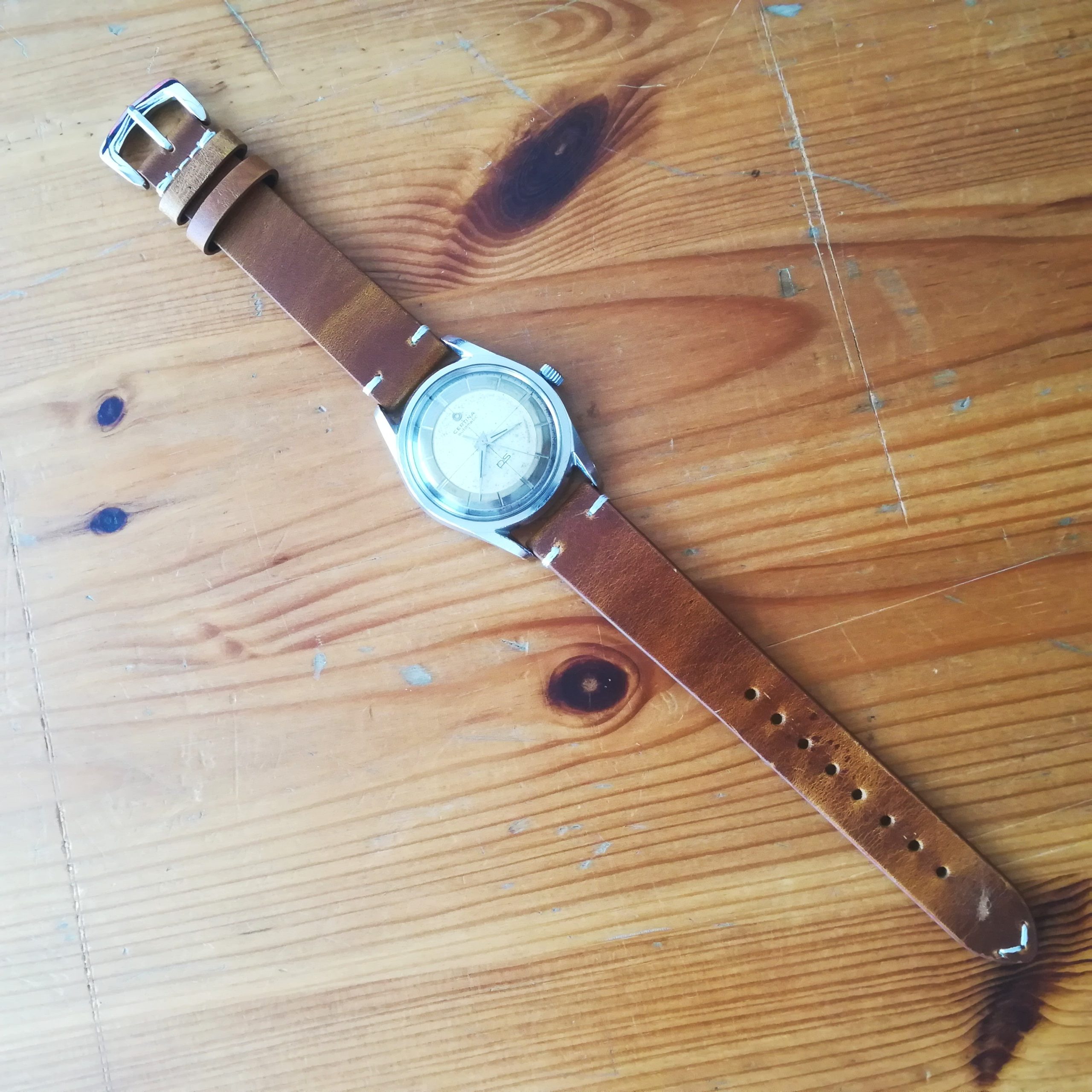 This piece has a steel case with some wear and scratches, and the dial has a uniform patina – please check the pictures. The watch also features a new brown leather strap. It will fit wrists of up to 21 cm. The glass is original (polished) and the crown may be a later replacement.