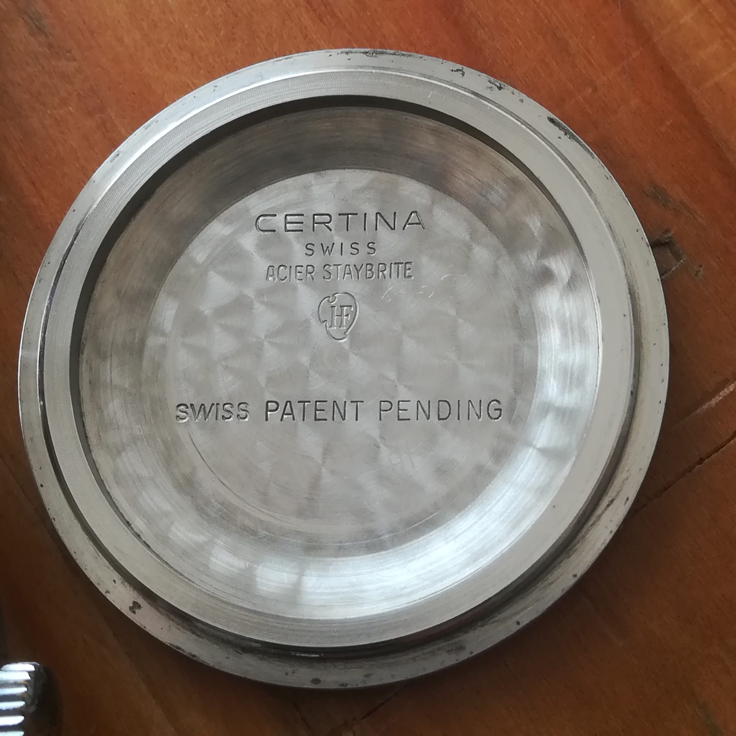 The very first units (as this piece) had dauphine hands and a flat case back without the turtle logo, and the patent application instead of the patent number engraved on the inside of the case back. Until May 1960 when the patent was granted, ‘Patent Pending’ was marked inside the caseback.