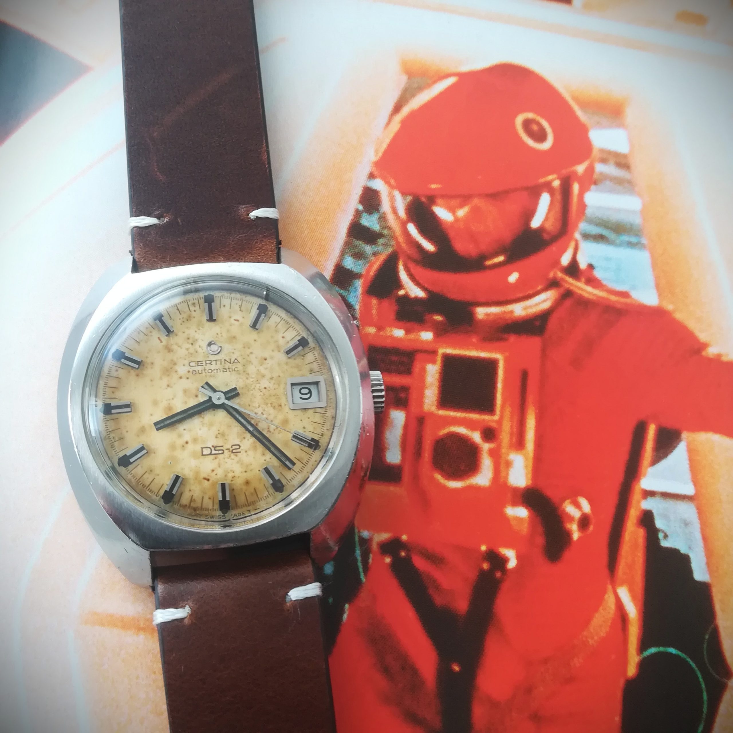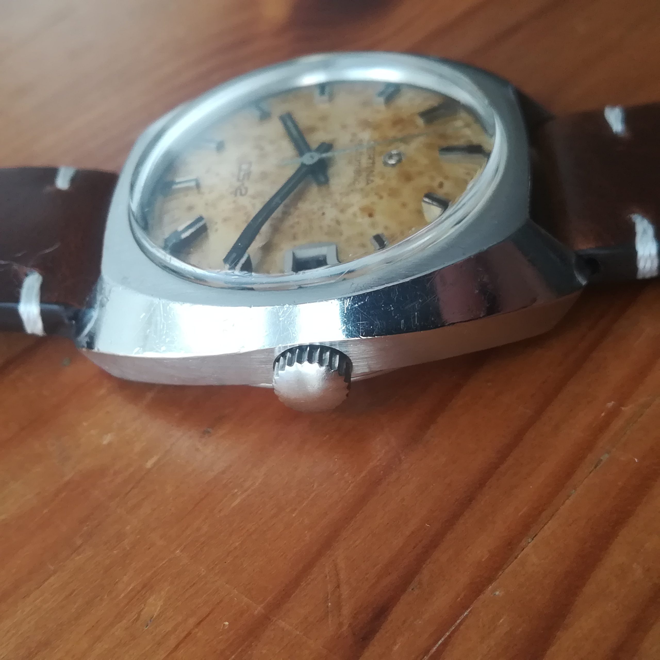 The case is stainless steel, with scratches as can be seen in the photos. The dial shows a heavy nice patina that gives this piece a genuine vintage look – please refer to the photos.