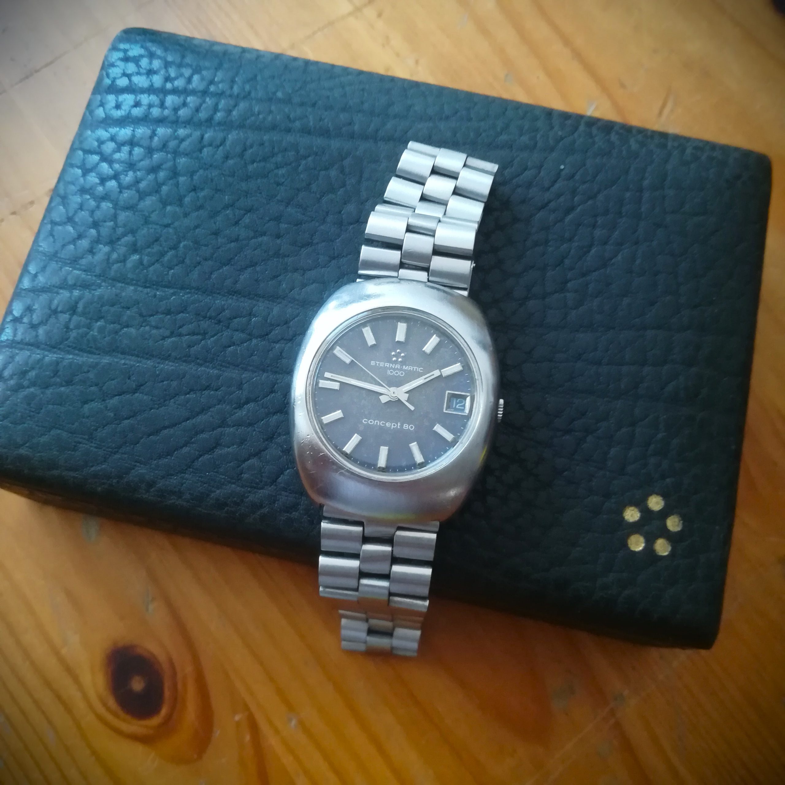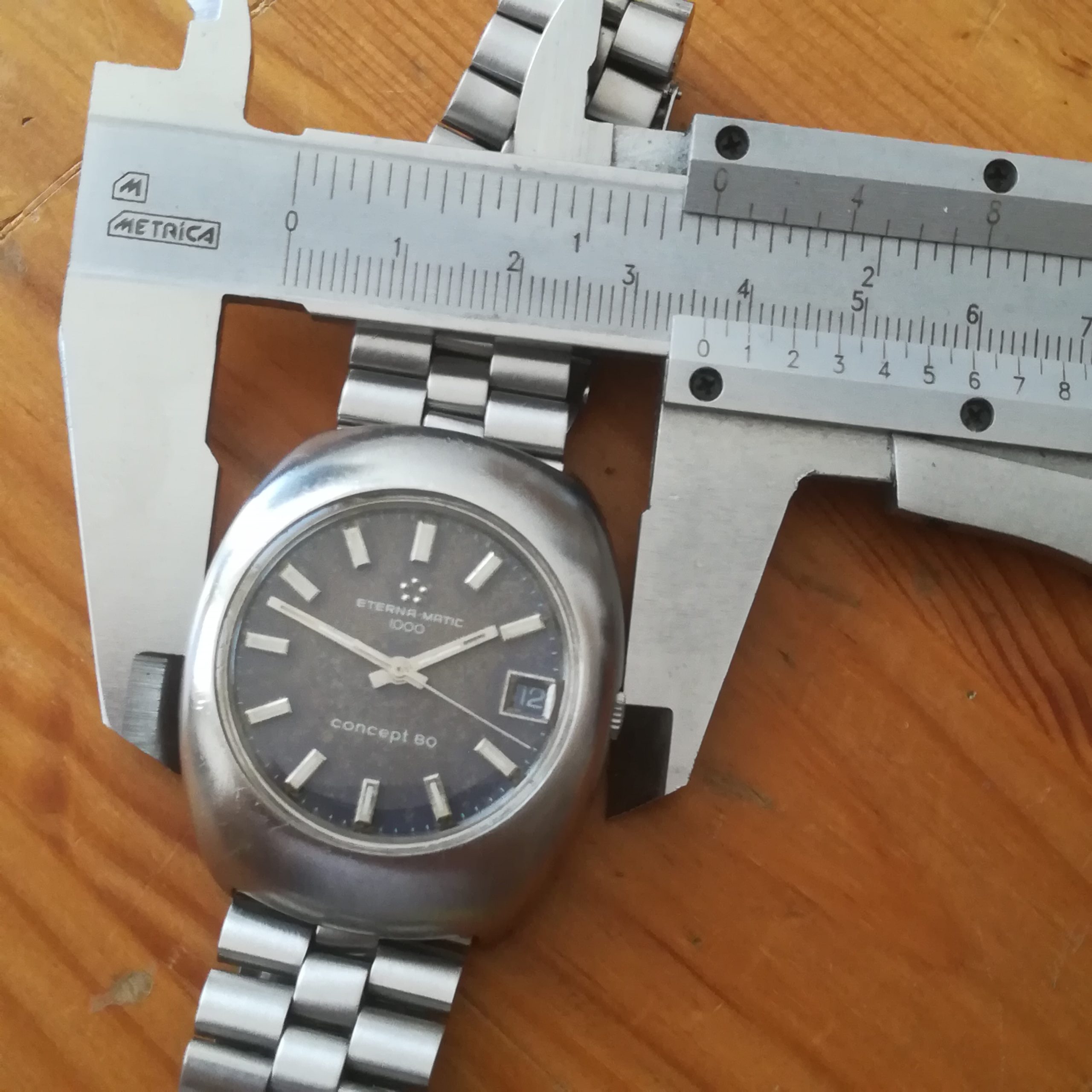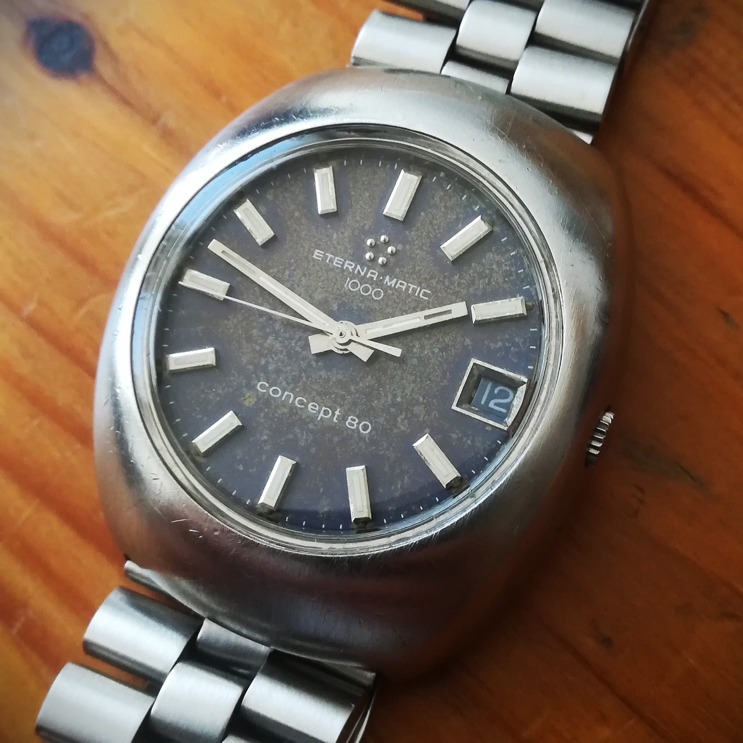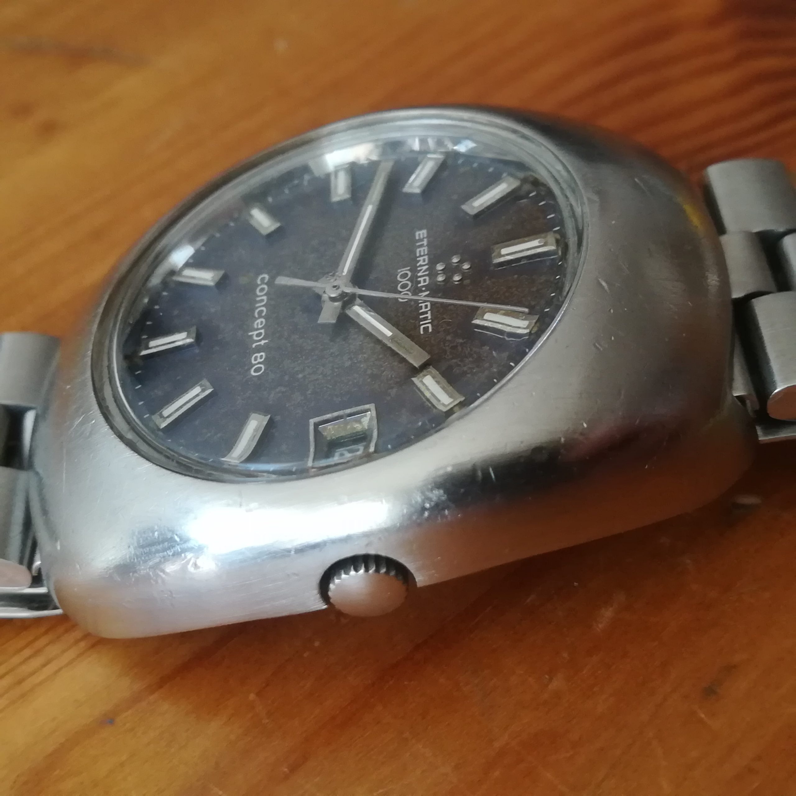Eterna-Matic 1000 Concept 80 automatic vintage watch, Swiss Made in 1970 (according to its serial number) with in-house 1488K movement with date indication, case of 36 mm excluding the crown, automatic (self-winding with the user’s movements) and hand-wound (mechanical, no battery!), working fine and serviced.