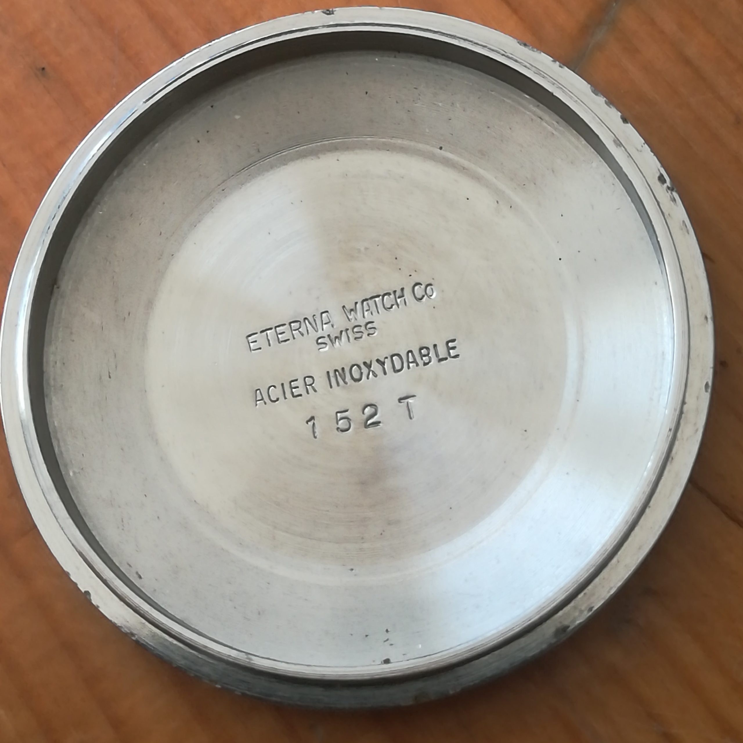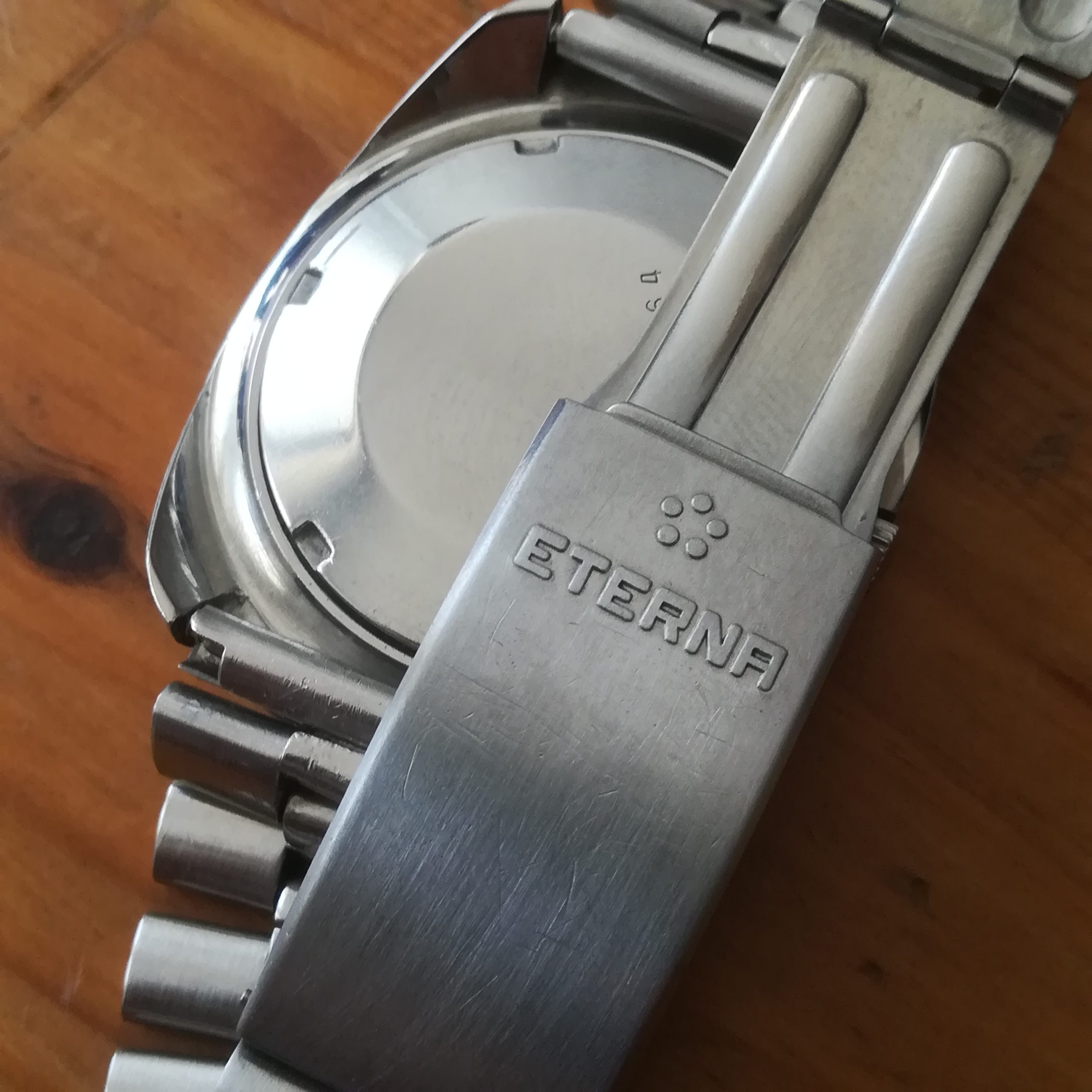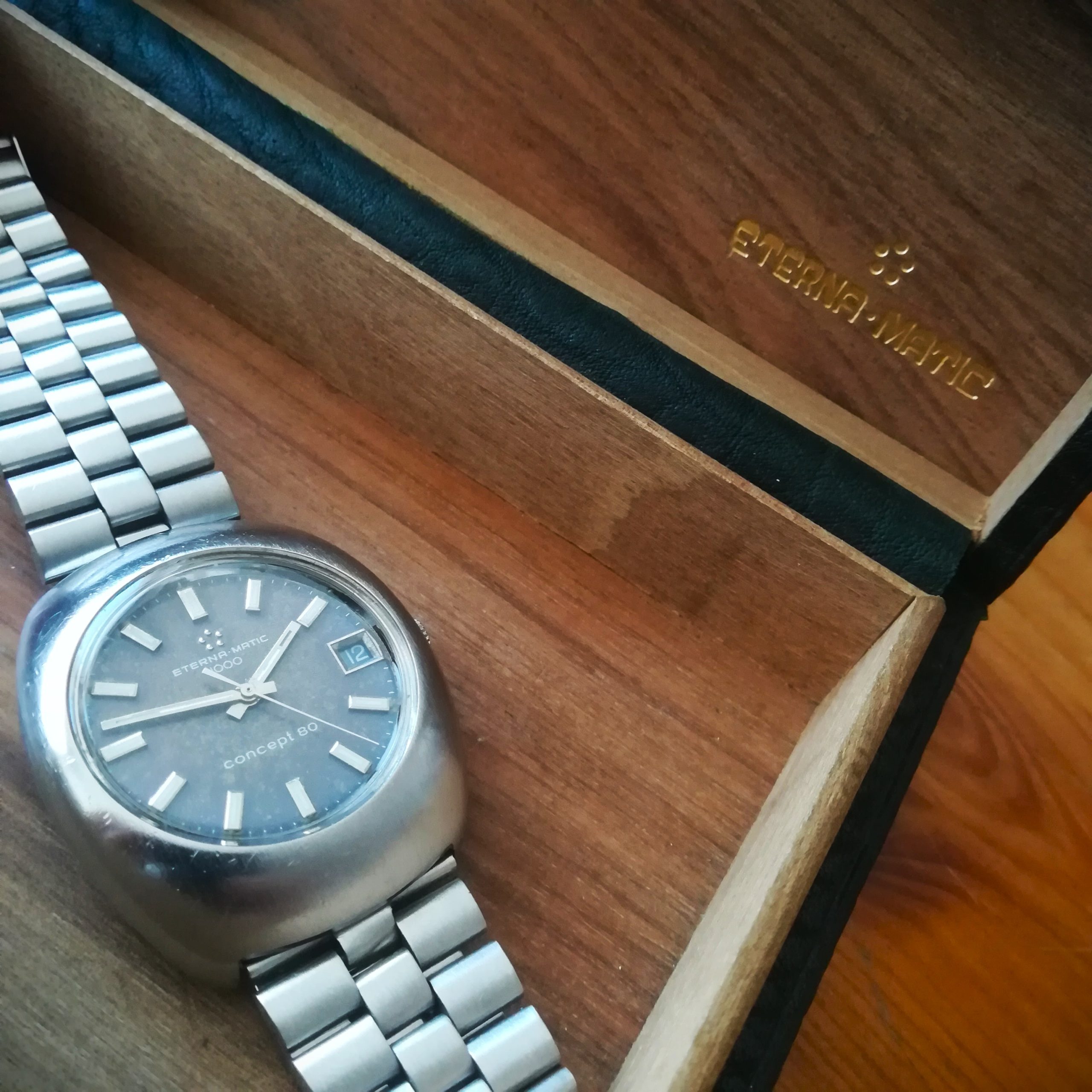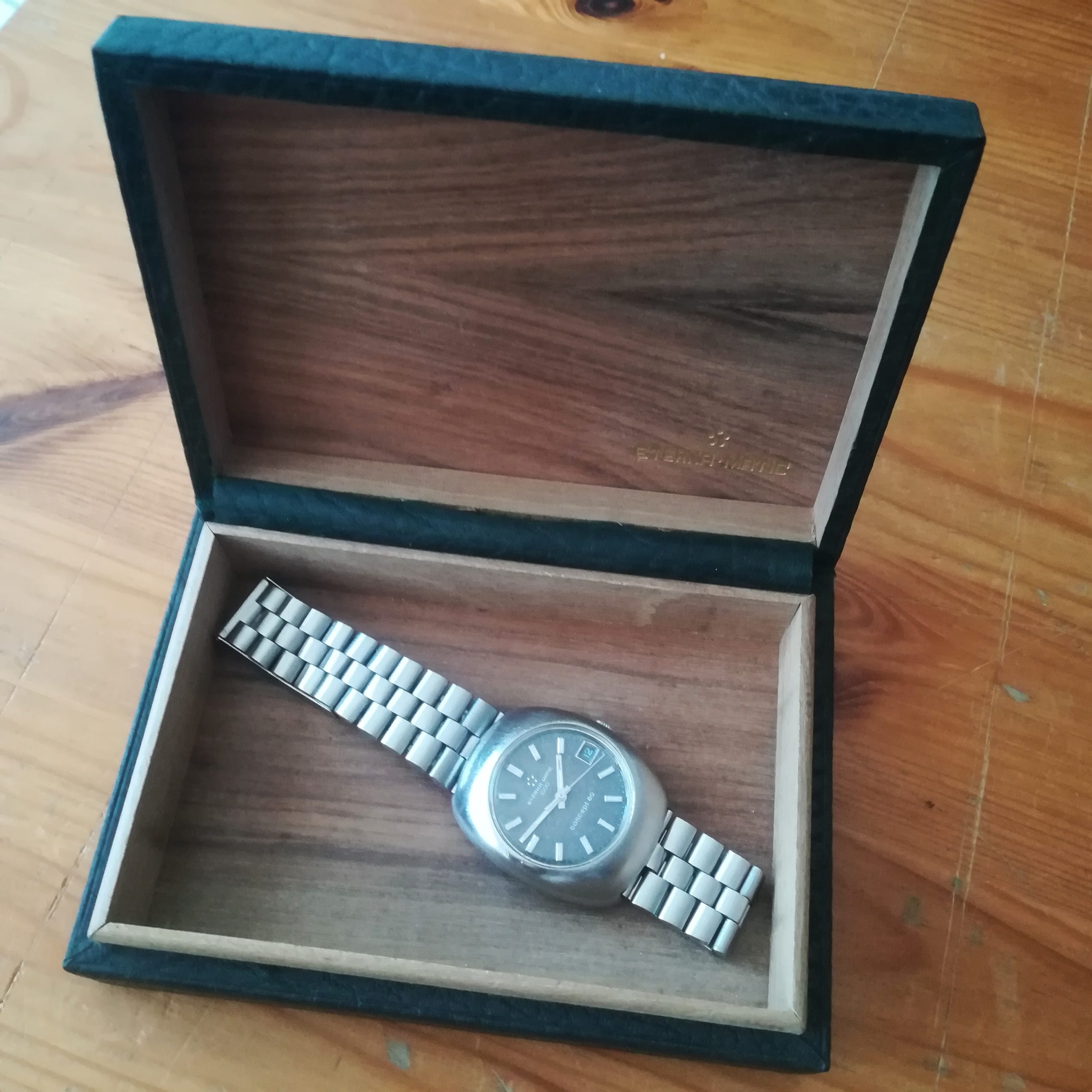 This all-original watch has a stainless steel case (with some scratches and dents as can be seen in the pictures), its signed stainless steel bracelet (for wrists of up to 20 cm) and even its original glass, engraved with the Eterna logo. Water resistance has not been tested, therefore it must be treated as NON-waterproof. The date can be quickset by repeated pulling of the crown. The watch will be delivered in its original dark green Eterna presentation box.