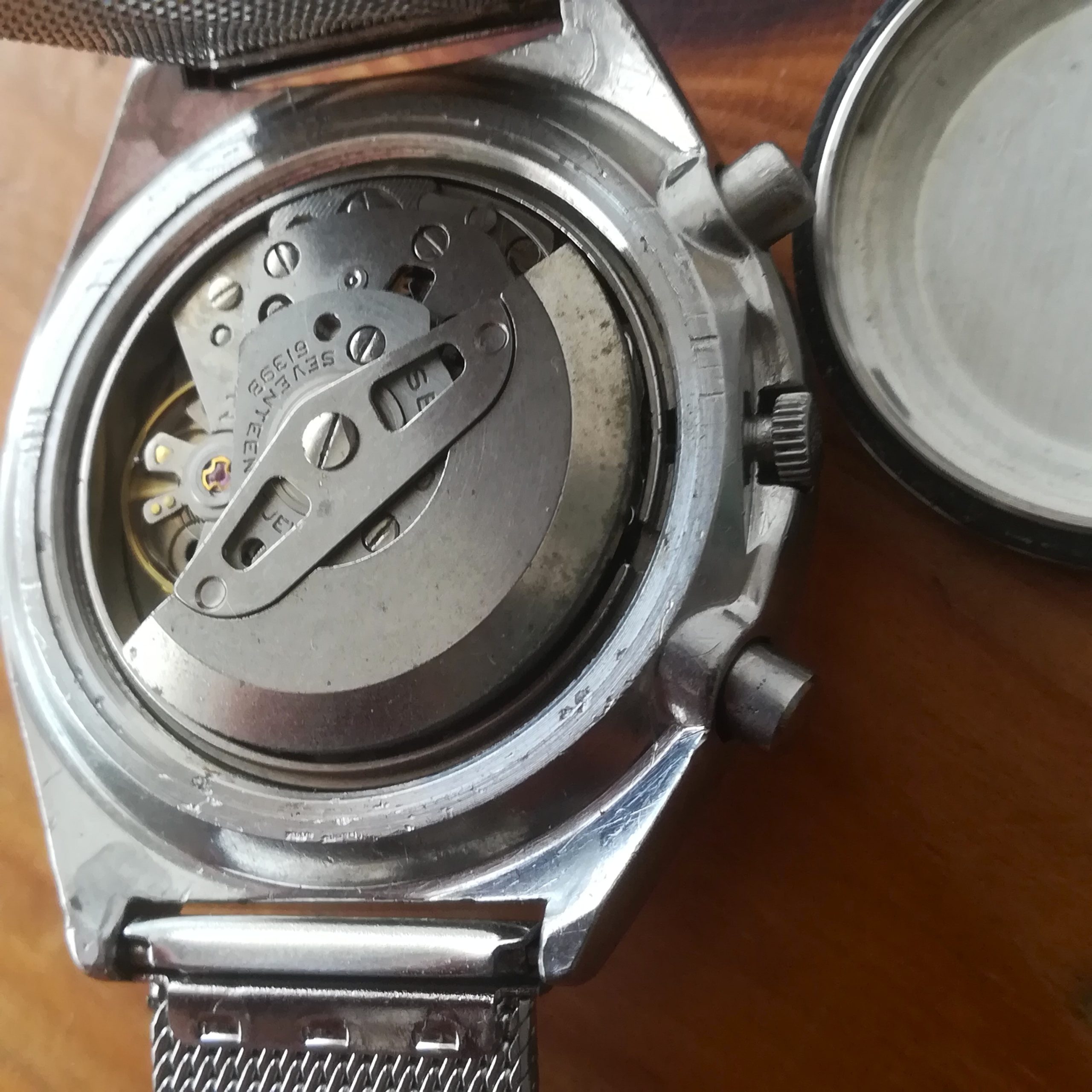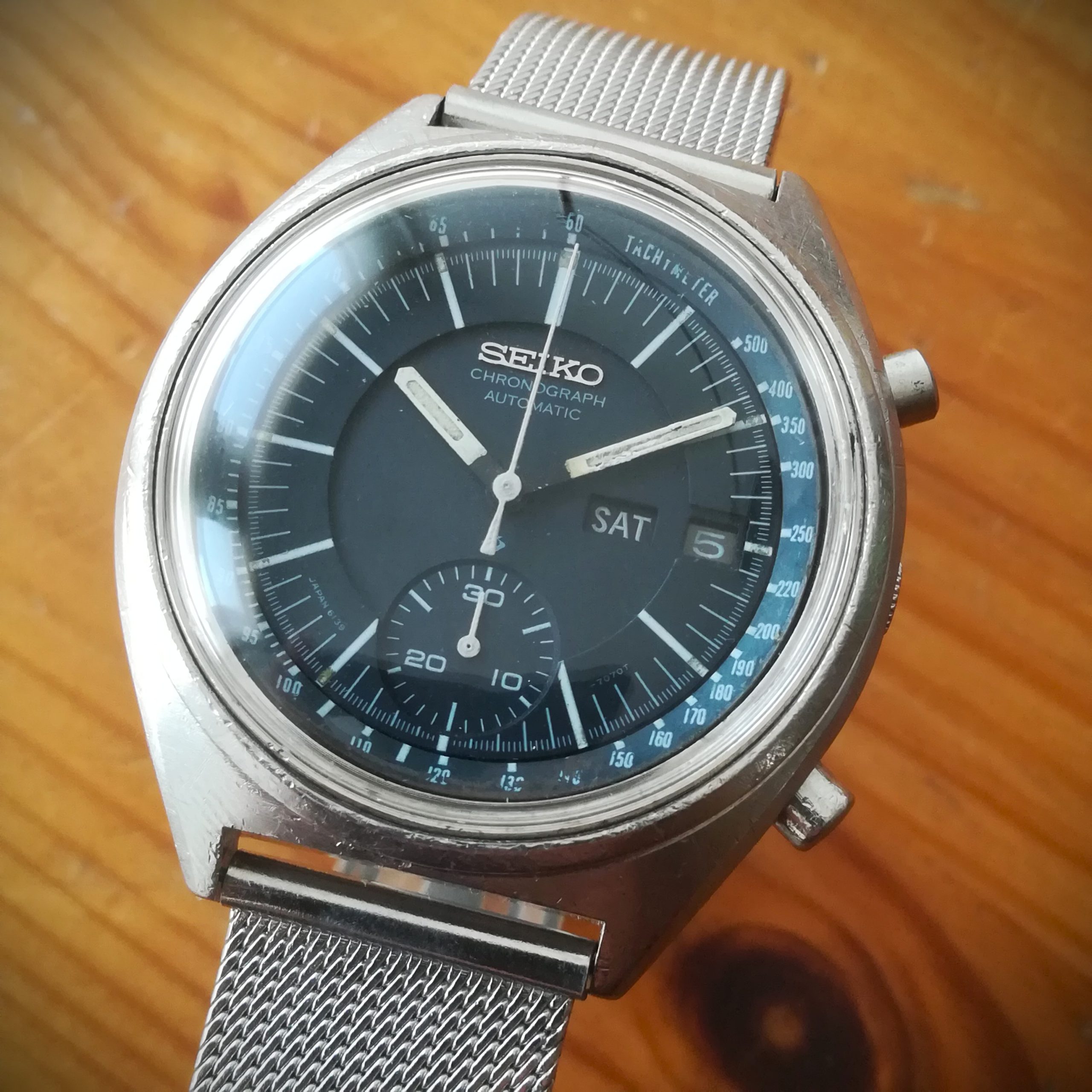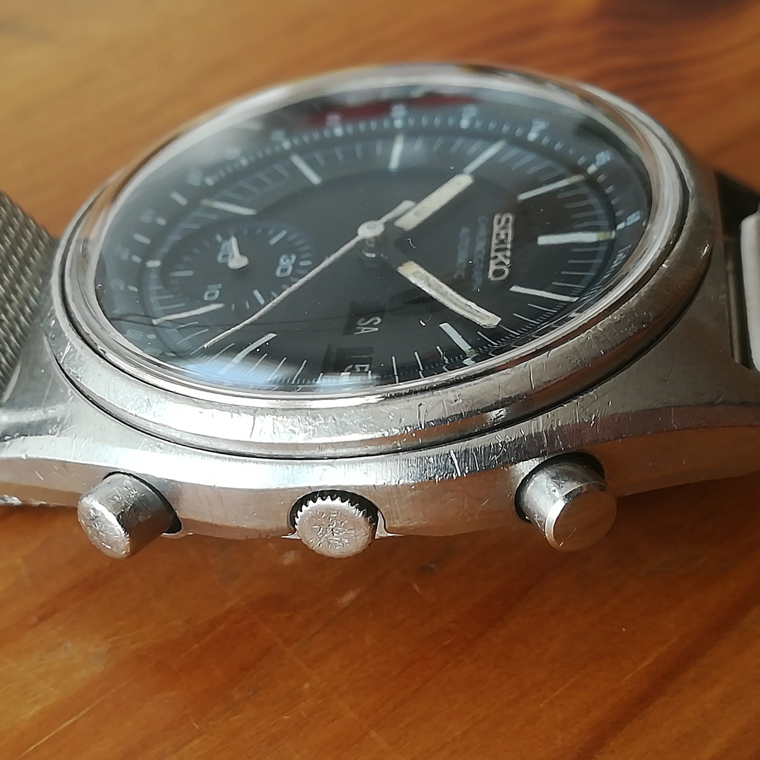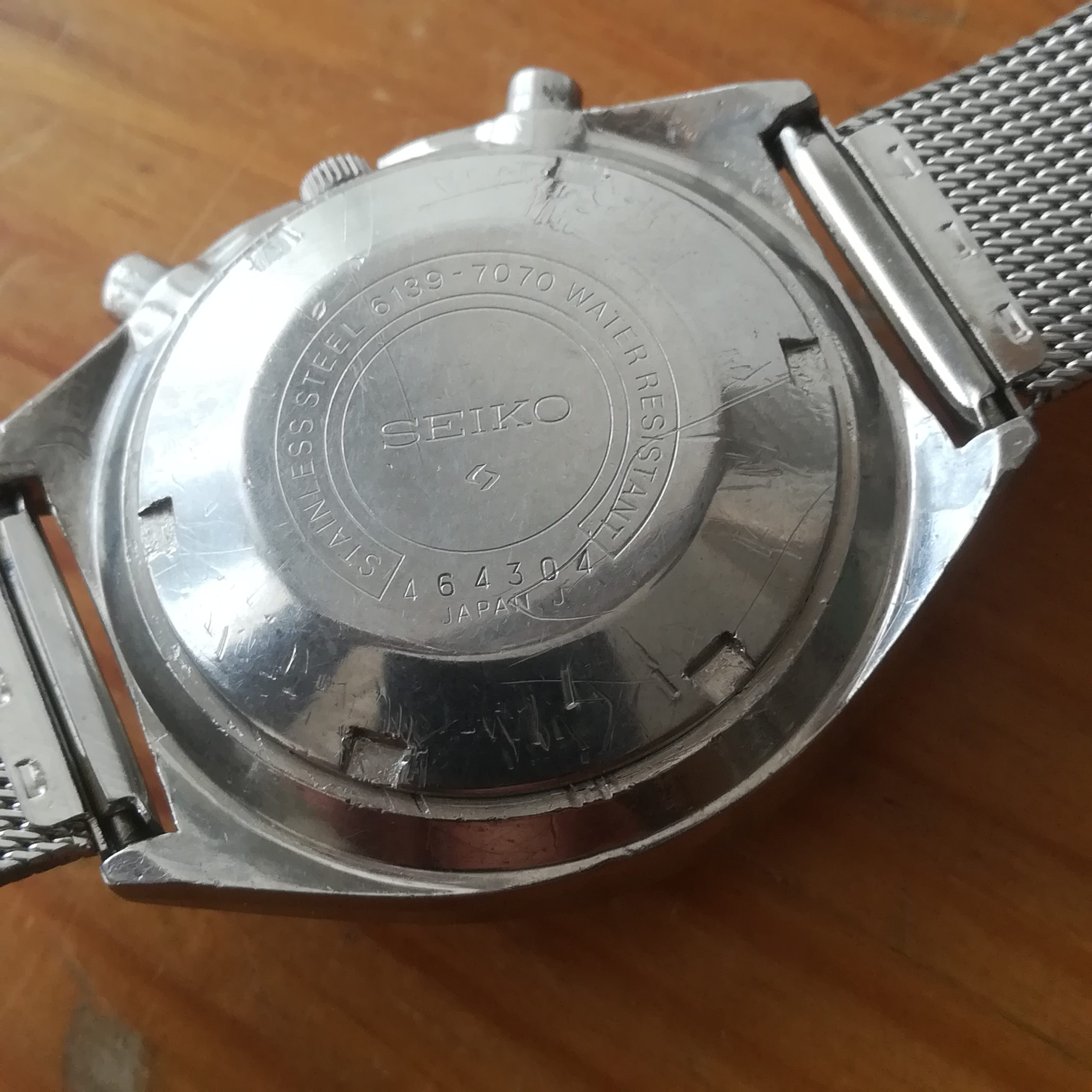 SEIKO automatic vintage watch, ref. 6139-7070 (known as “Baby Jumbo”) with in-house 6139B movement with EN/ES day and date feature and quickset, Japan made in 1974 (according to its serial number), case of 39.5 mm excluding the crown, automatic (self-winding with the user’s movement, mechanical, no battery!), working fine and serviced. All chrono functions work properly.