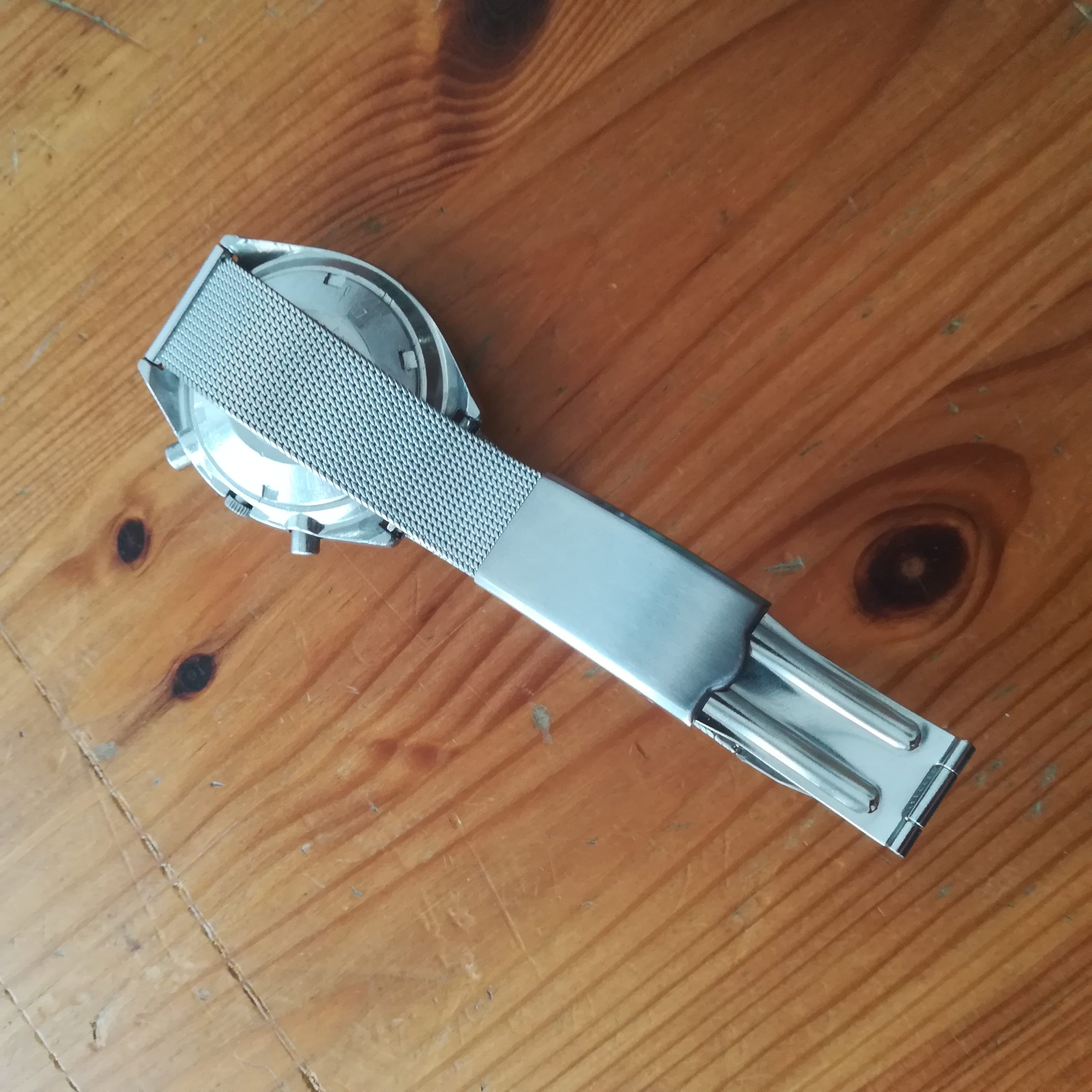 The stainless steel case has some scratches – please check the photos. The dial color is petrol-blue. The watch also features a new stainless steel bracelet, mesh-style. It will fit wrists of up to 21 cm. Water resistance has not been tested, therefore it must be treated as NON-waterproof.