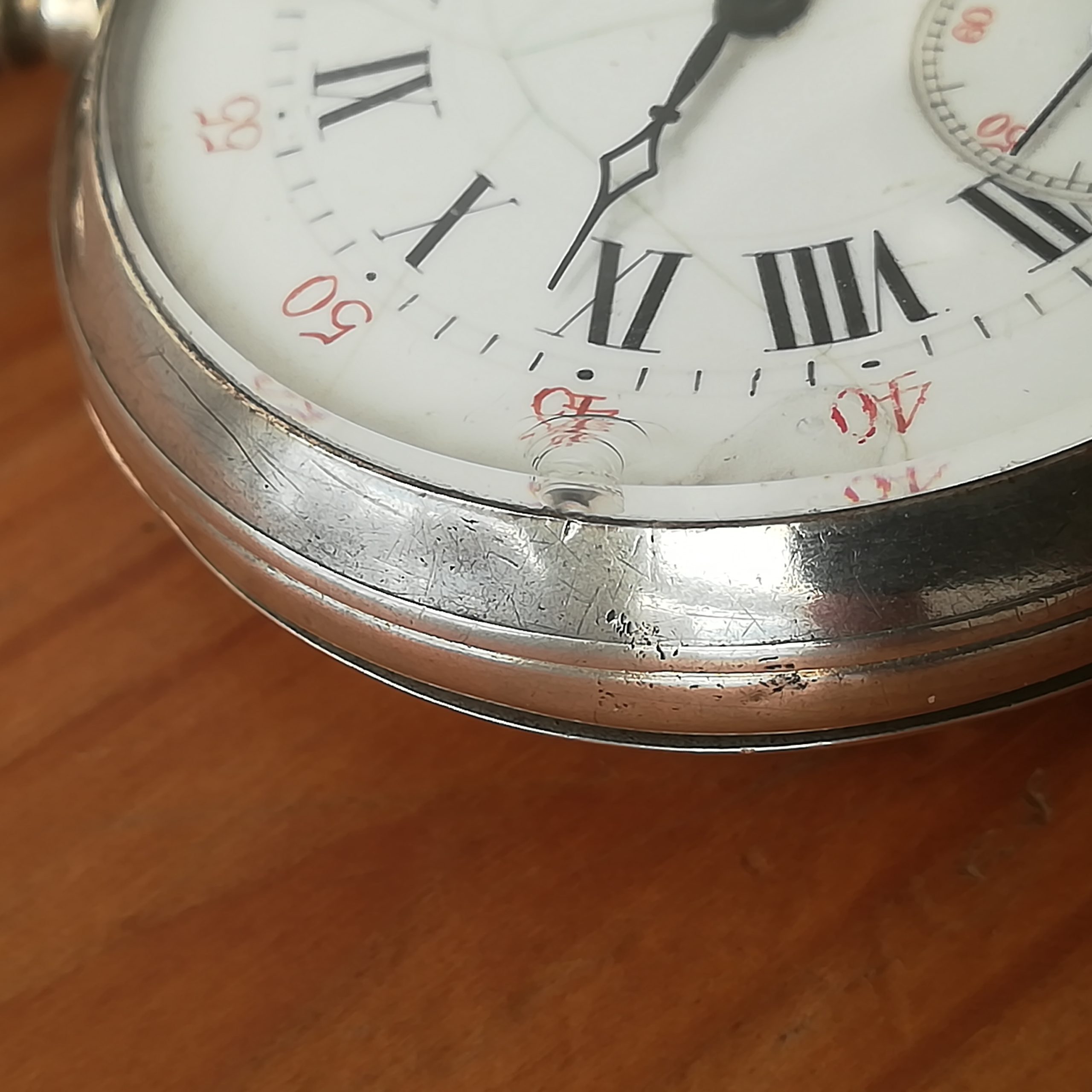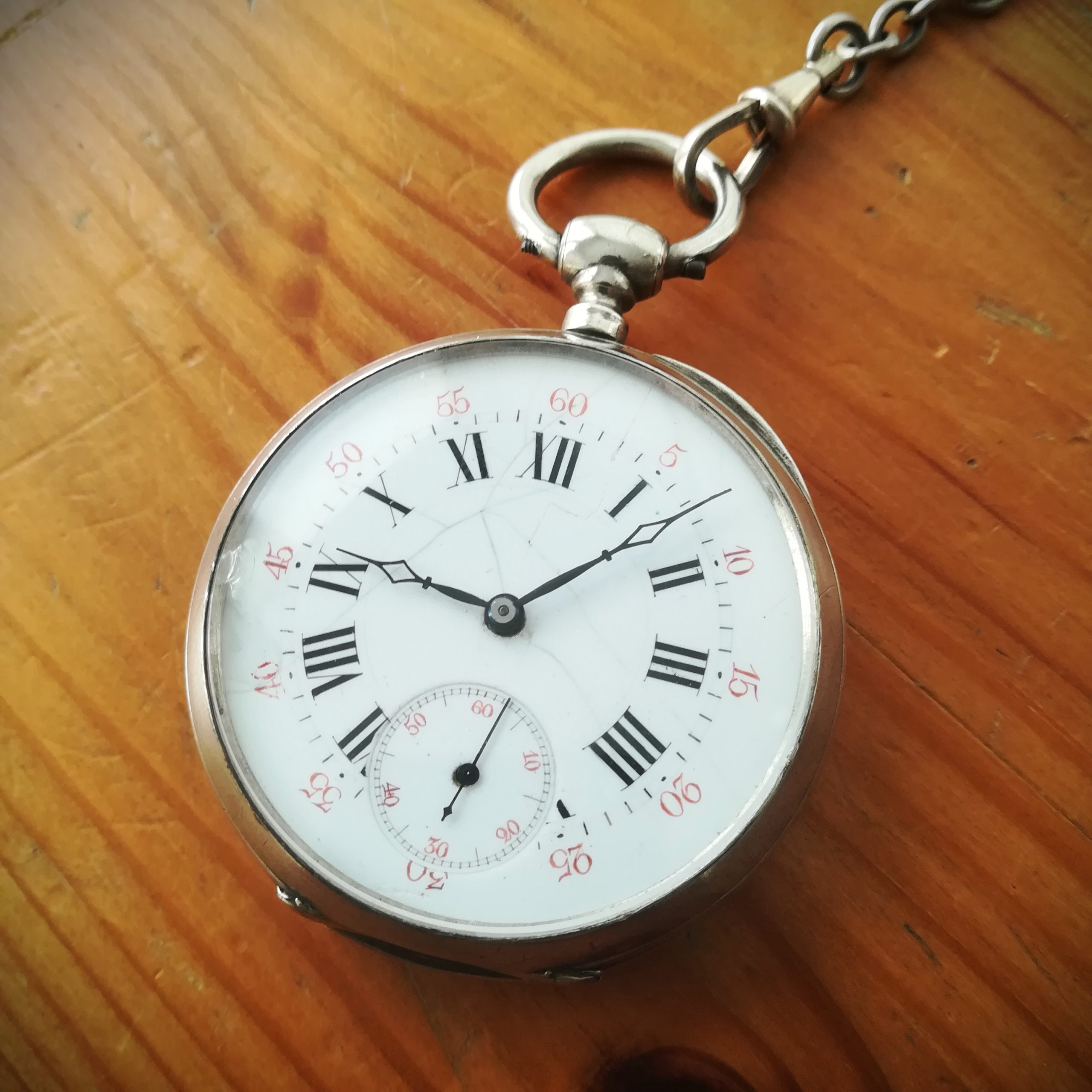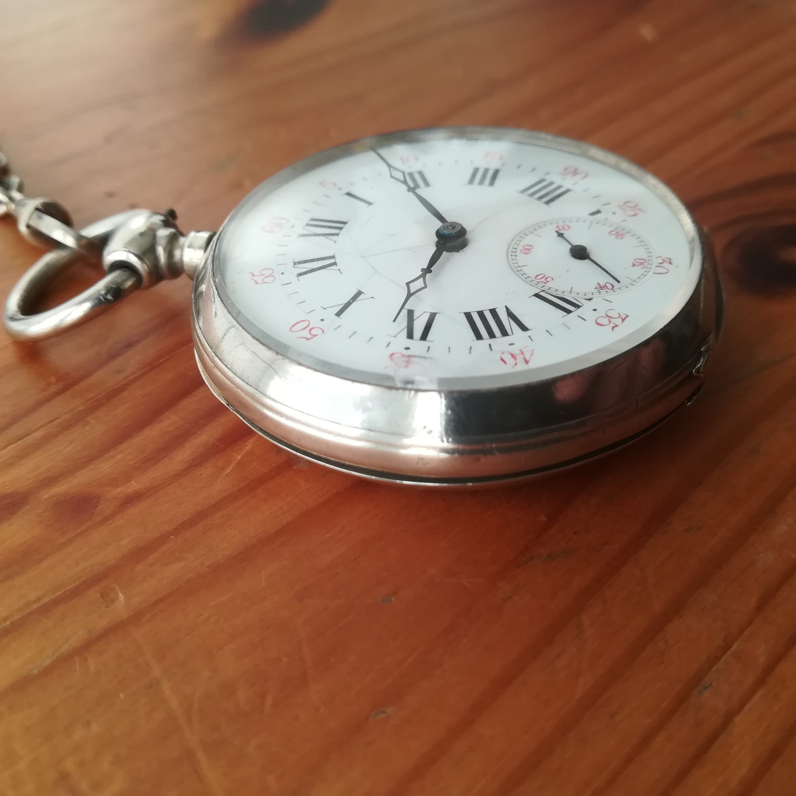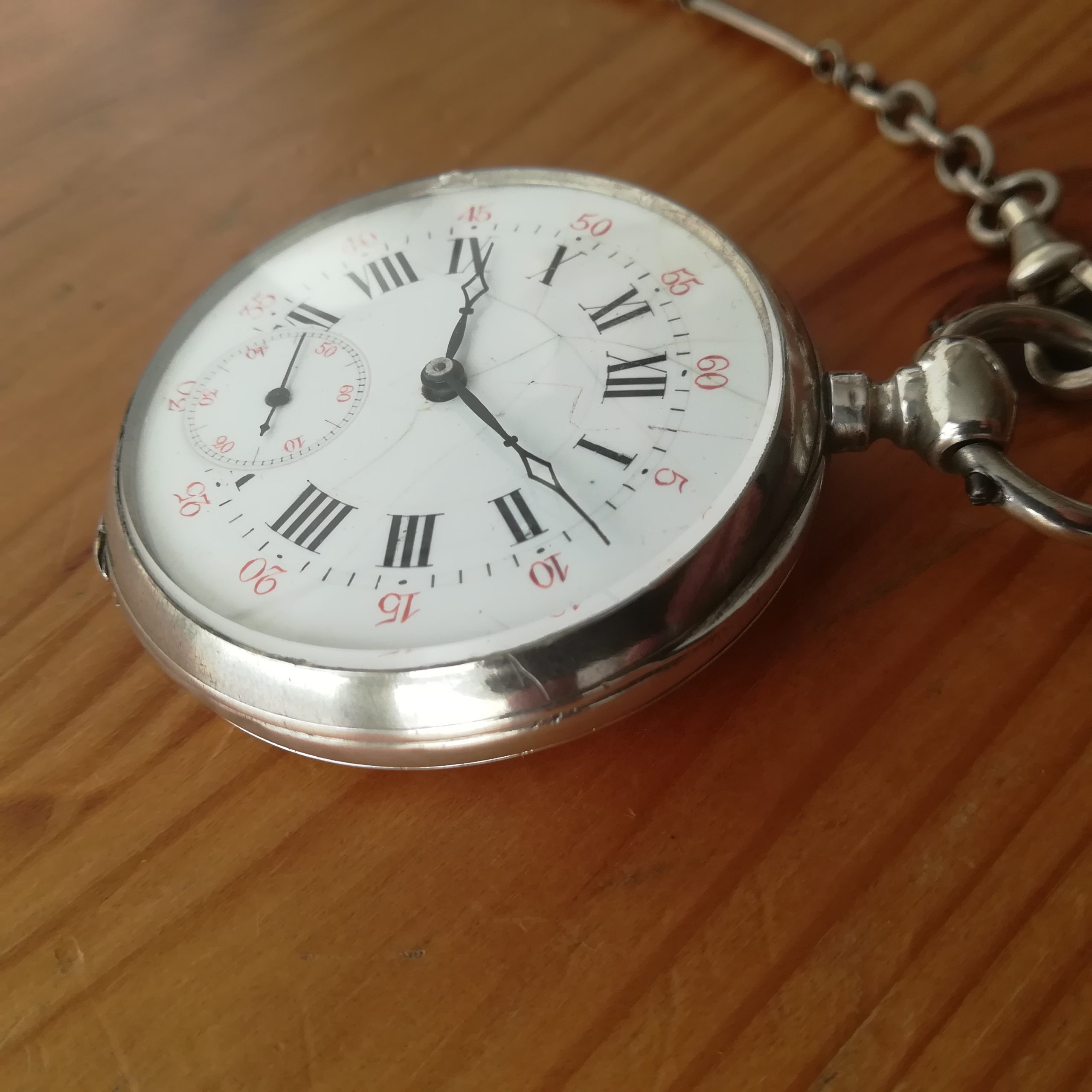 The silver case has some scratches as can be seen in the photos. The enamel dial has several hairlines and a repair at 8, and the glass has a tiny chip at 9 – please refer to the pictures. The watch also features a silver chain. Water resistance has not been tested, therefore it must be treated as NON-waterproof.