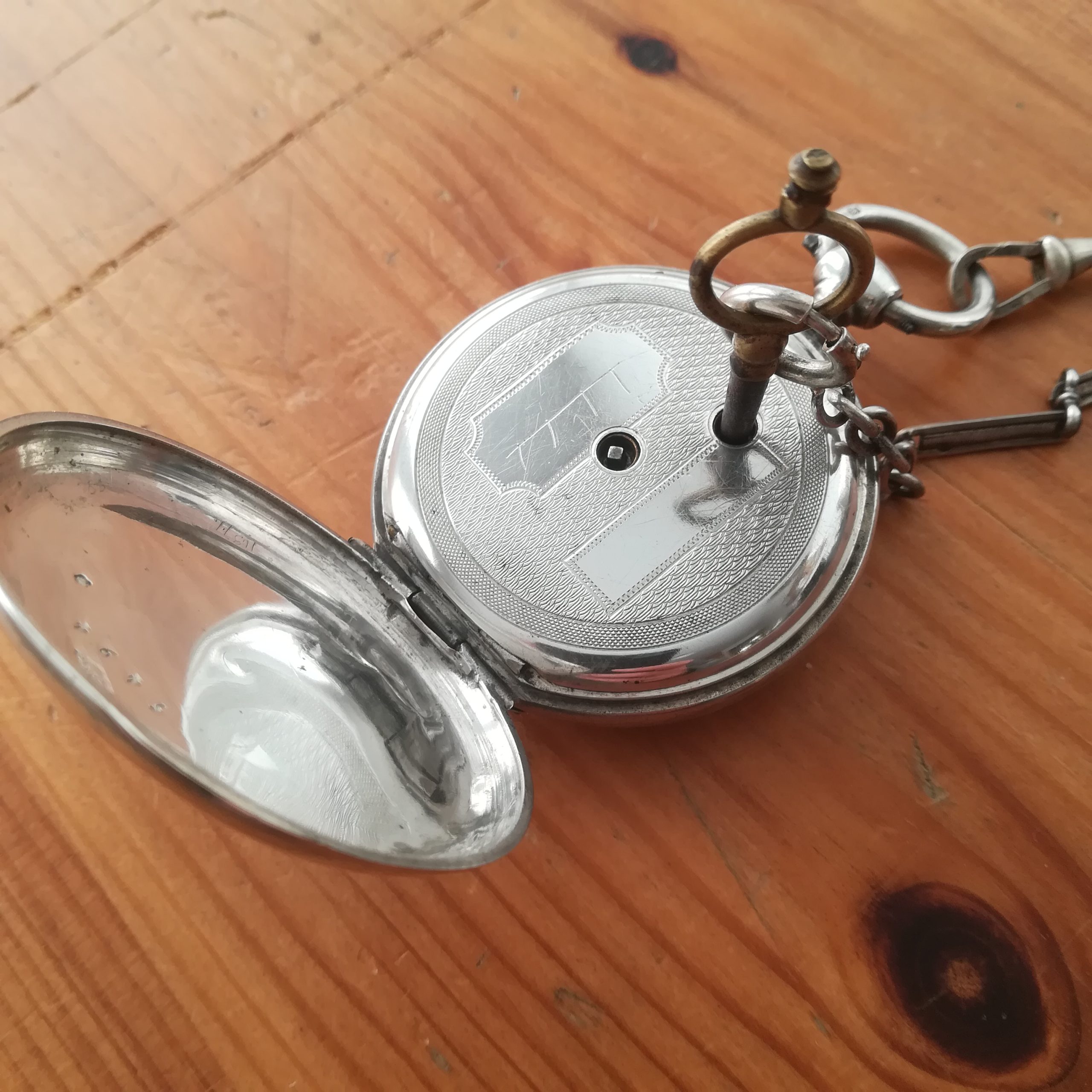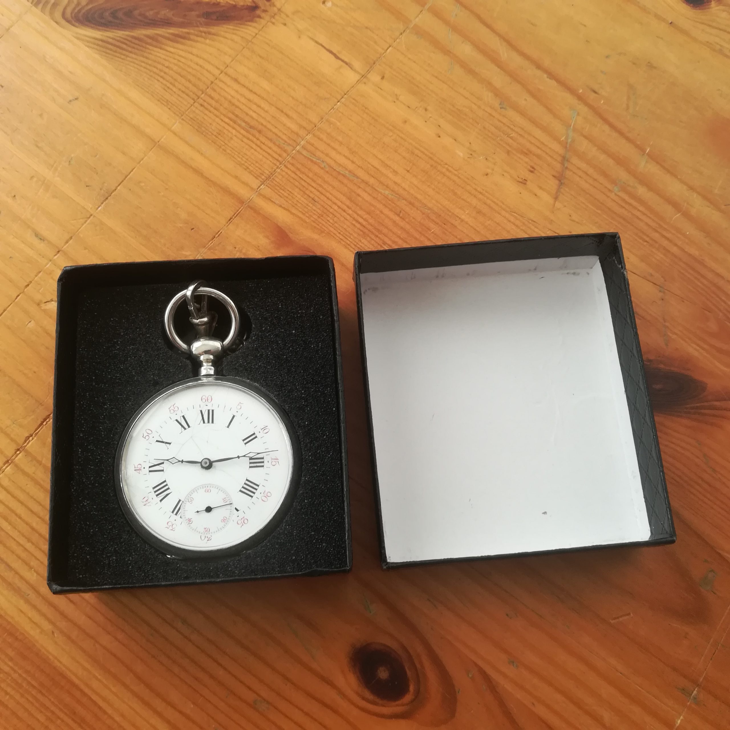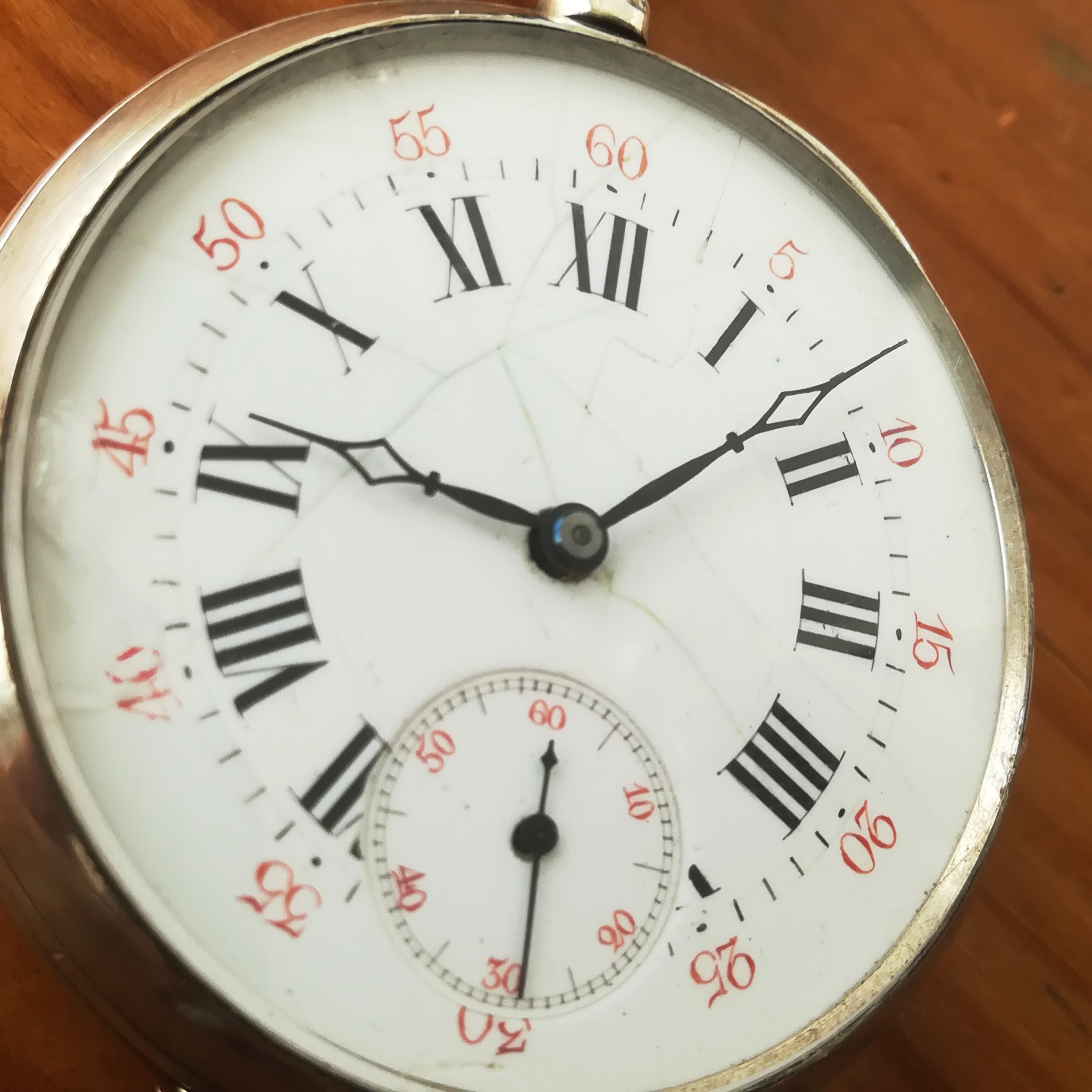 The silver case has some scratches as can be seen in the photos. The enamel dial has several hairlines and a repair at 8, and the glass has a tiny chip at 9 – please refer to the pictures. The watch also features a silver chain. Water resistance has not been tested, therefore it must be treated as NON-waterproof.
