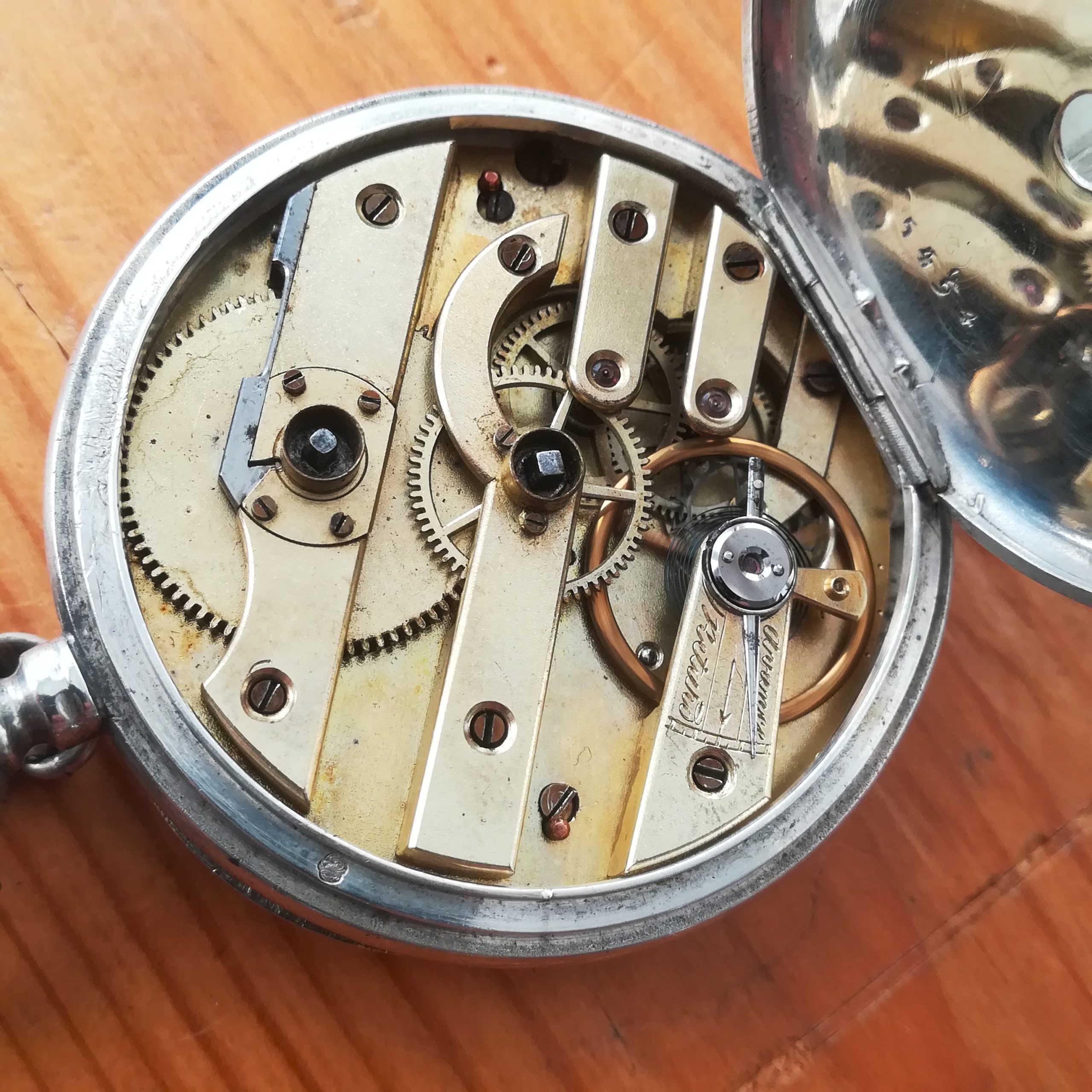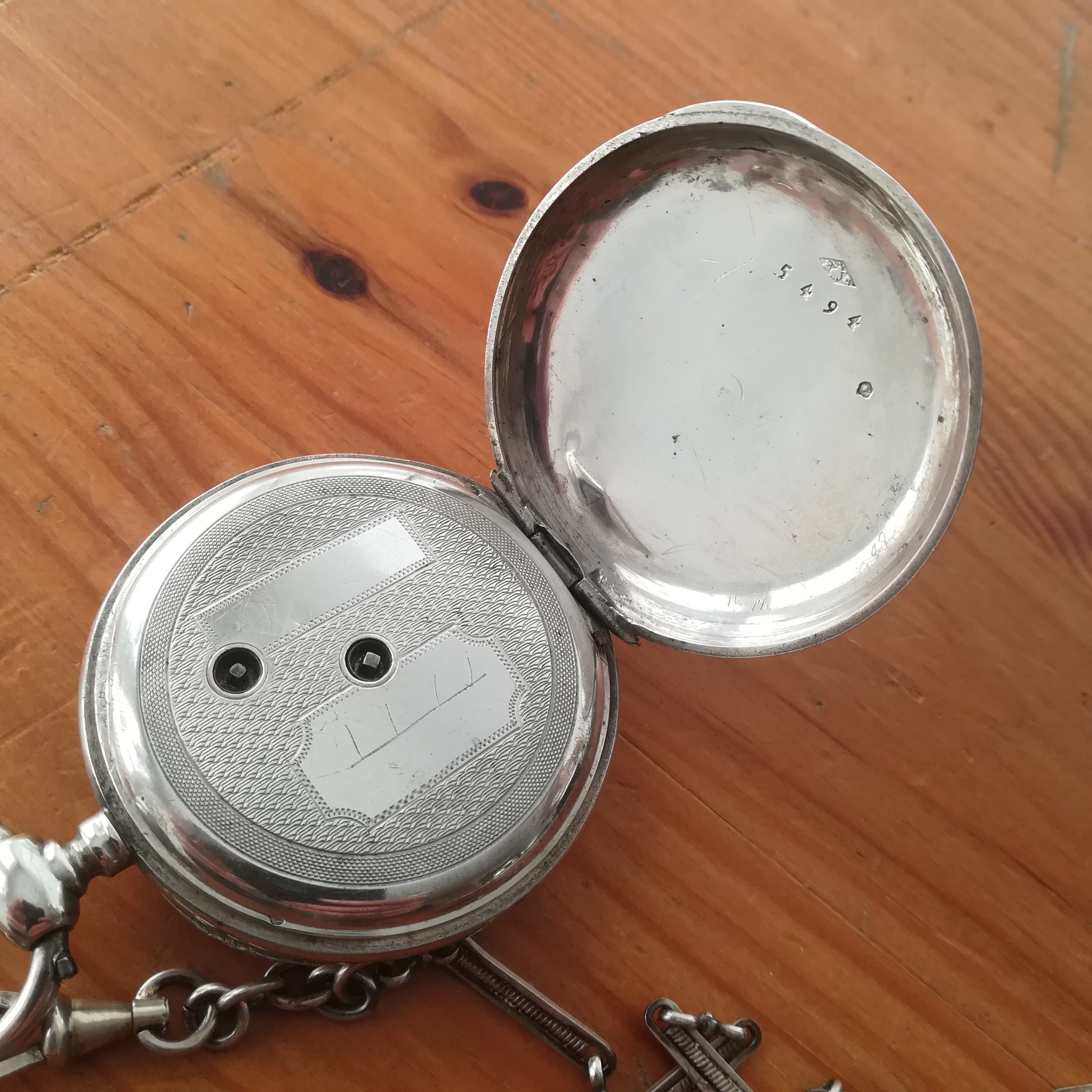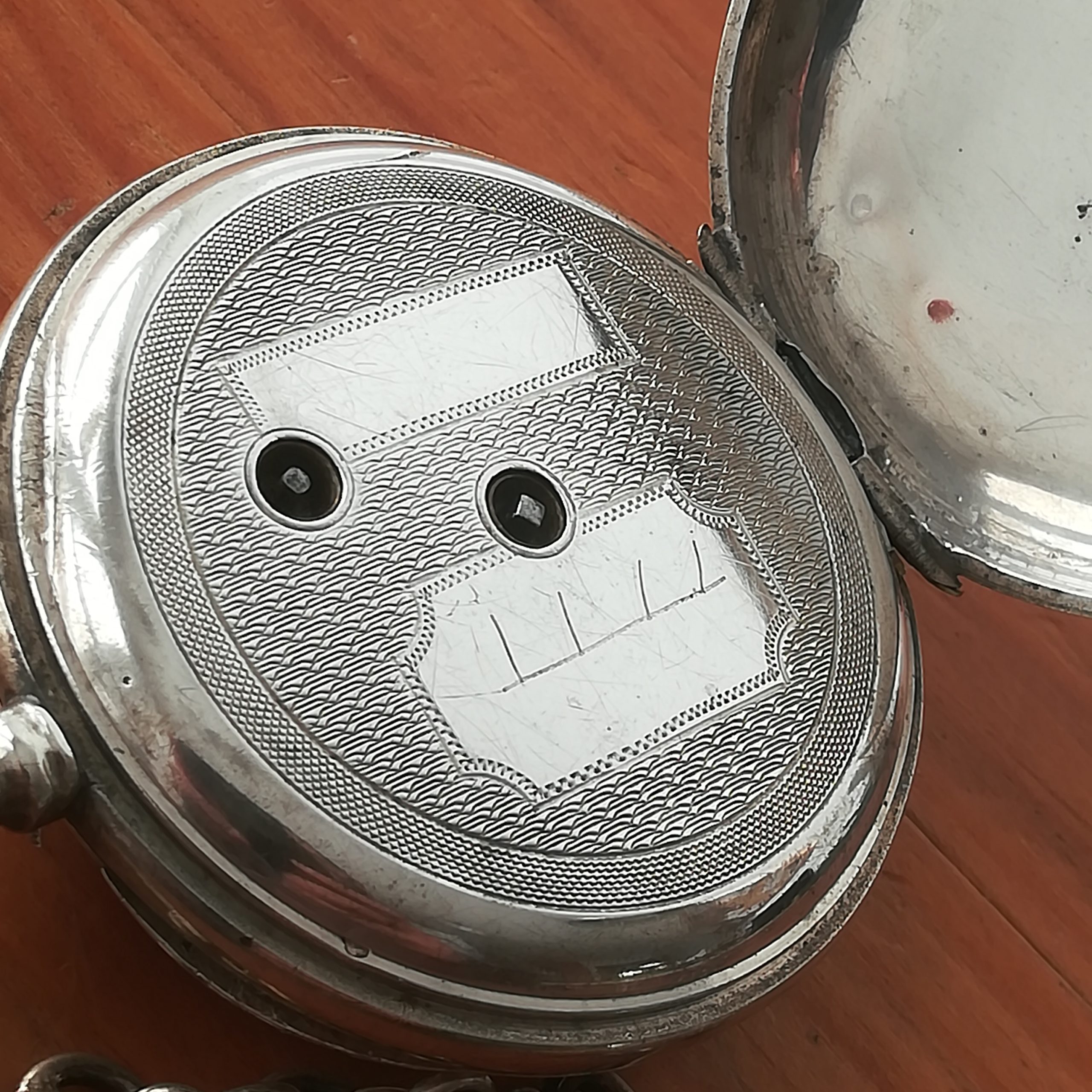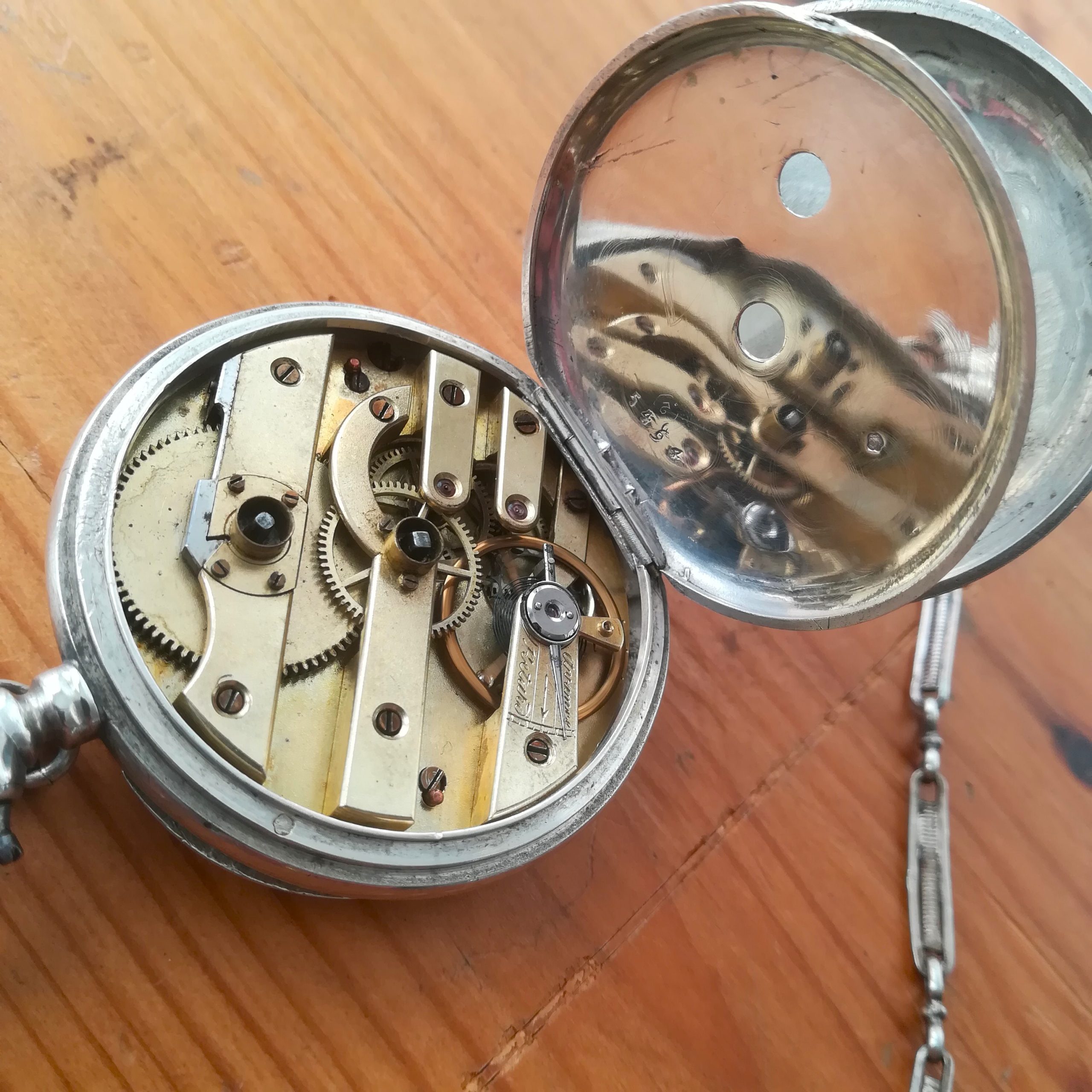 The silver case has some scratches as can be seen in the photos. The enamel dial has several hairlines and a repair at 8, and the glass has a tiny chip at 9 – please refer to the pictures. The watch also features a silver chain. Water resistance has not been tested, therefore it must be treated as NON-waterproof.