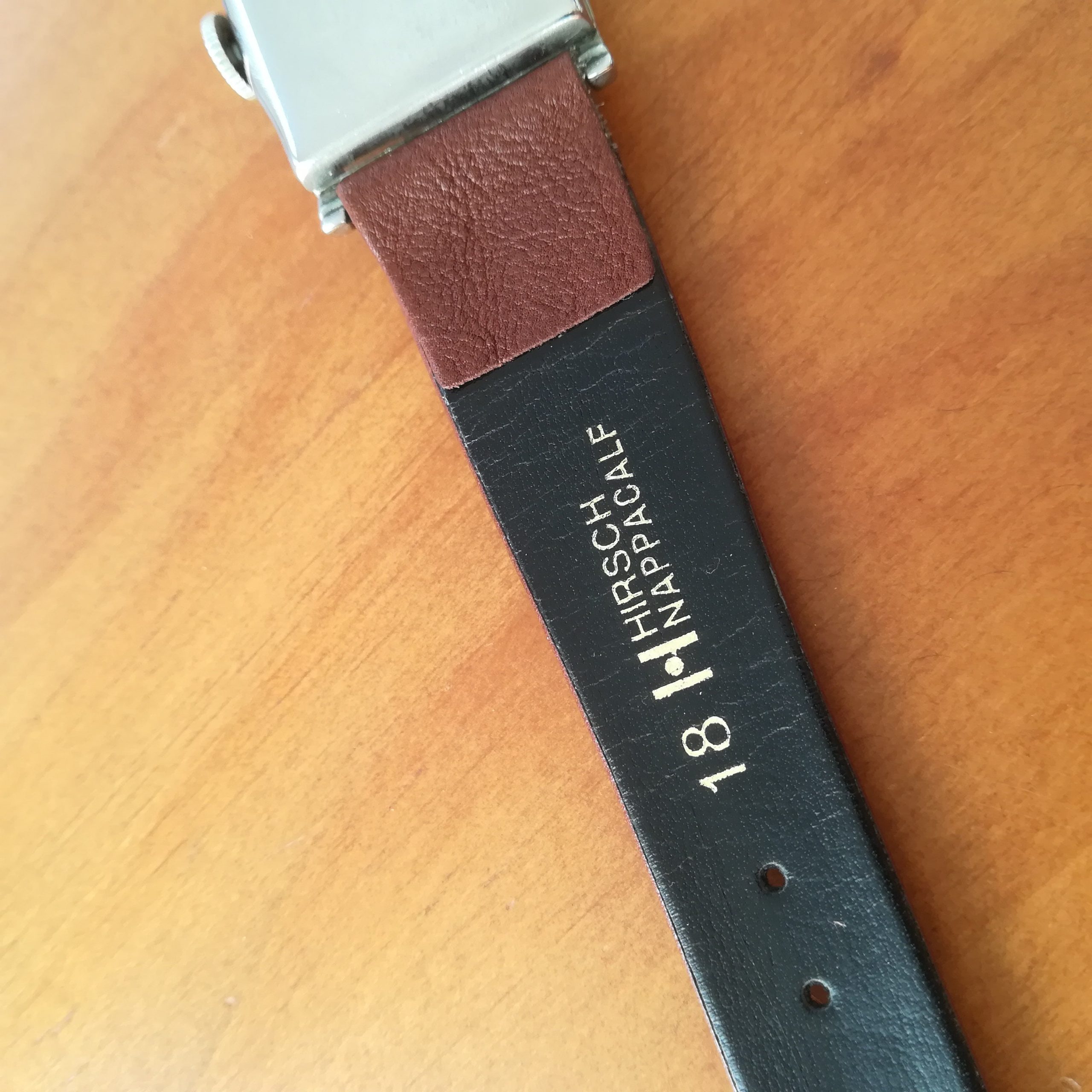The watch features a NOS Hirsch genuine brown leather strap for fixed lugs. It will fit wrists of up to 20 cm. Water resistance has not been tested, therefore it must be treated as NON-waterproof.
