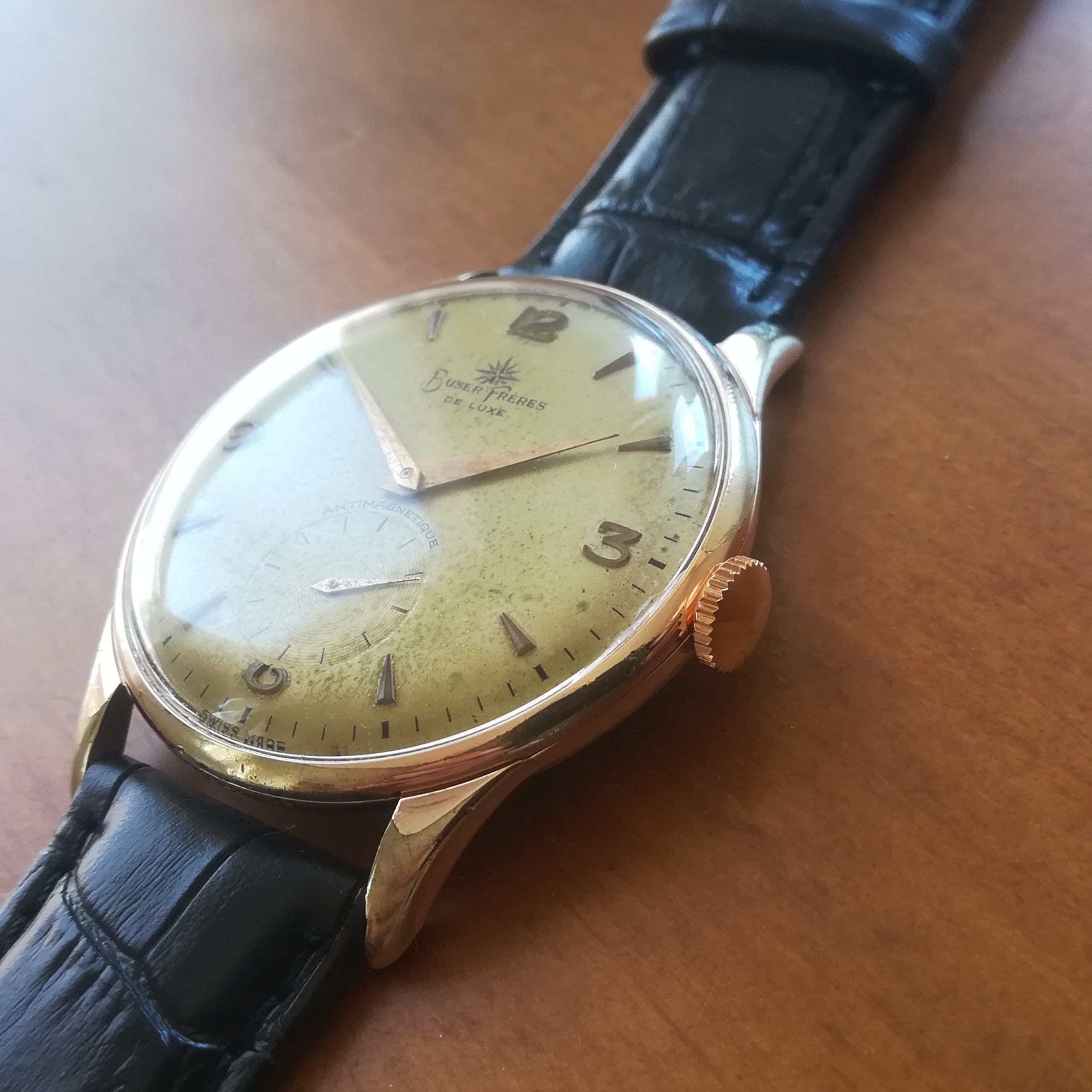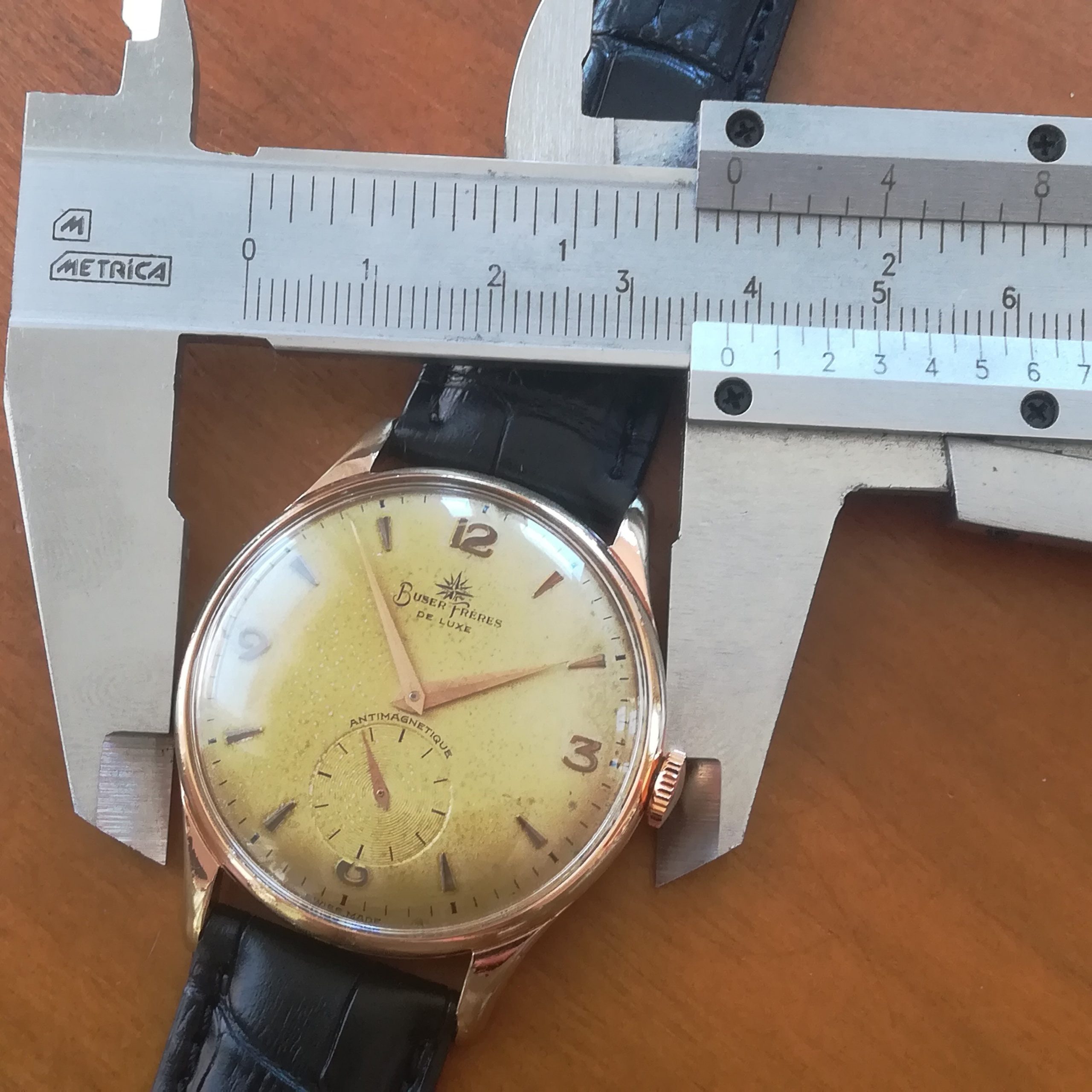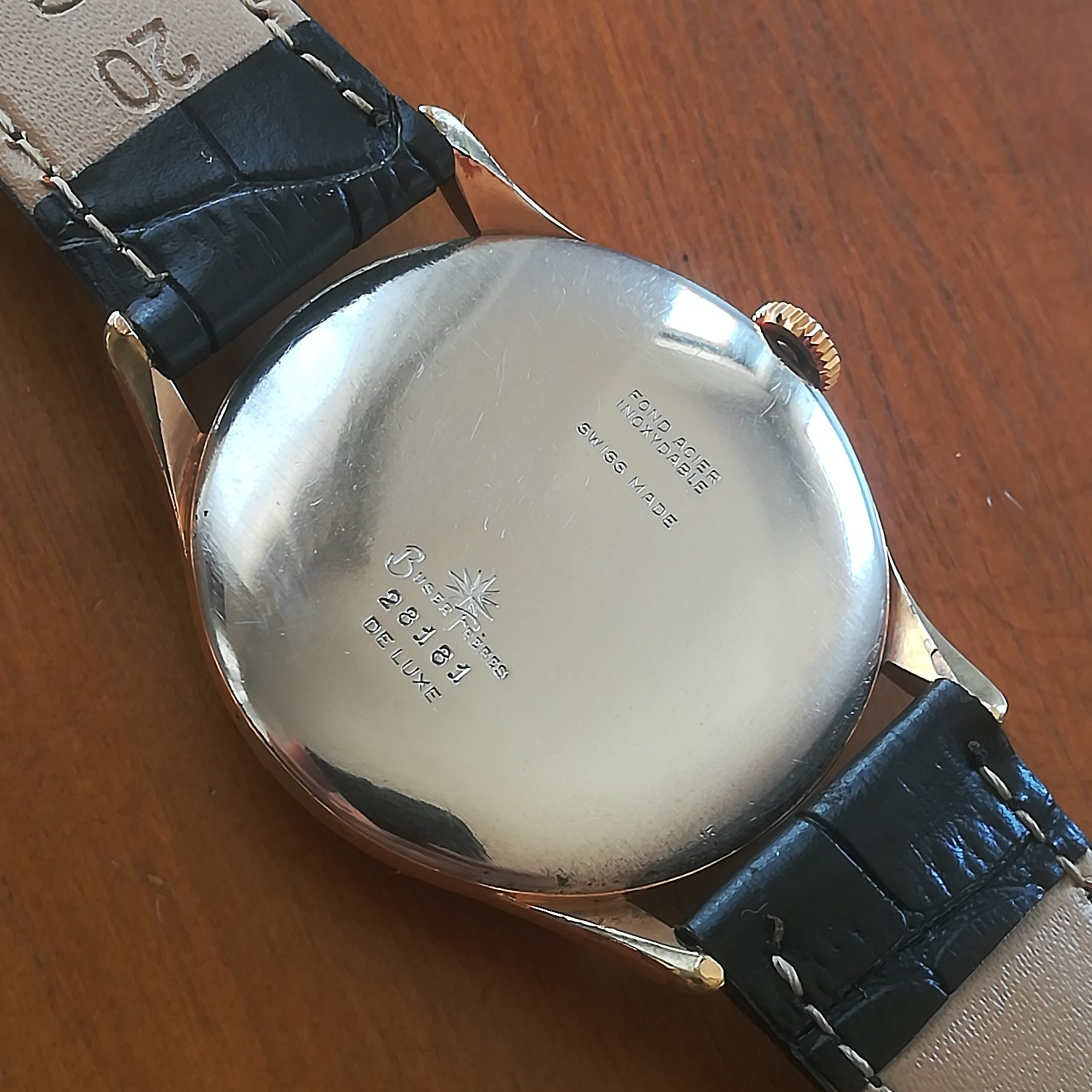 BUSER FRÈRES vintage watch, with in-house movement 180, Swiss made in the 50s, 37.5 mm across excluding the crown, hand-wound (mechanical, no battery!), working fine and serviced.