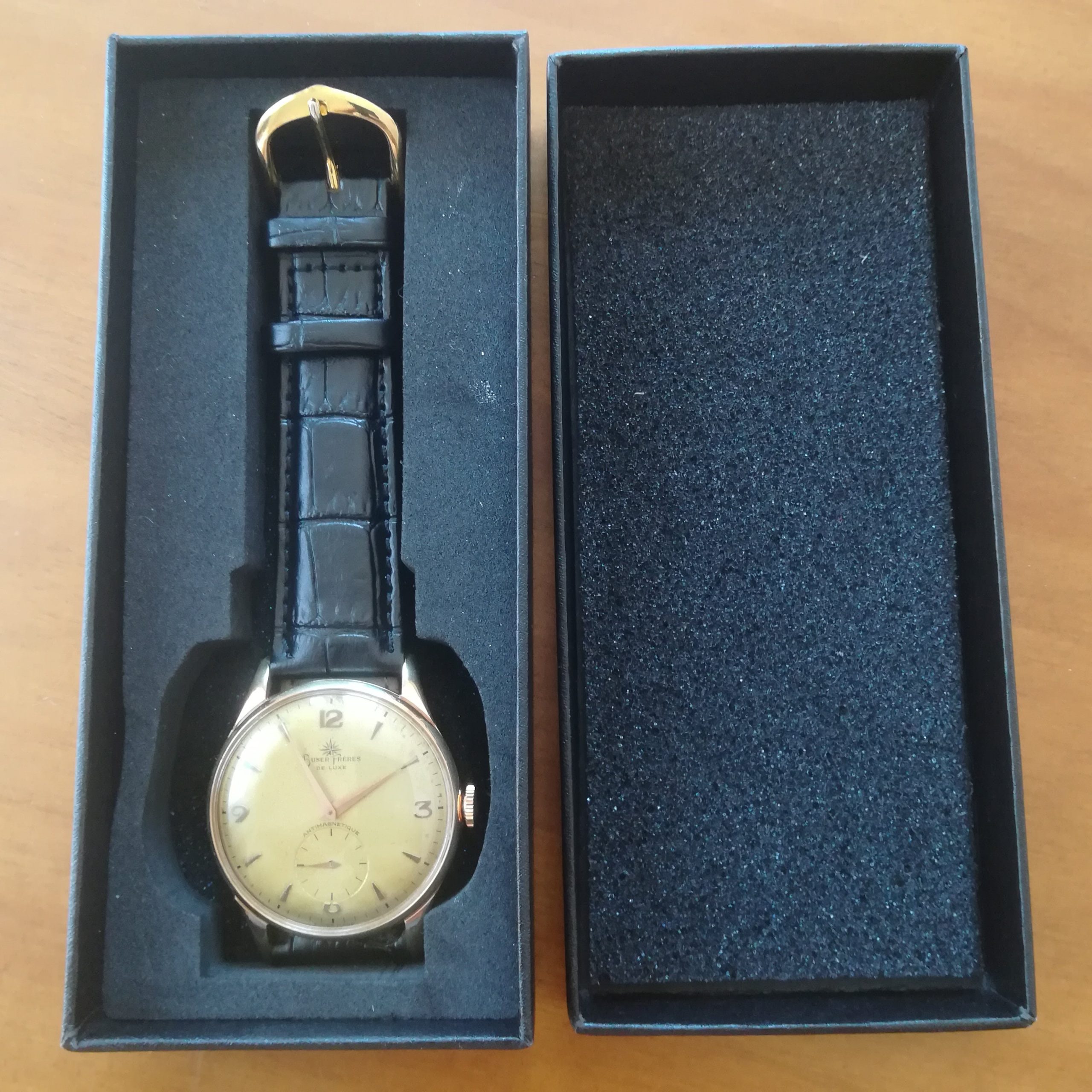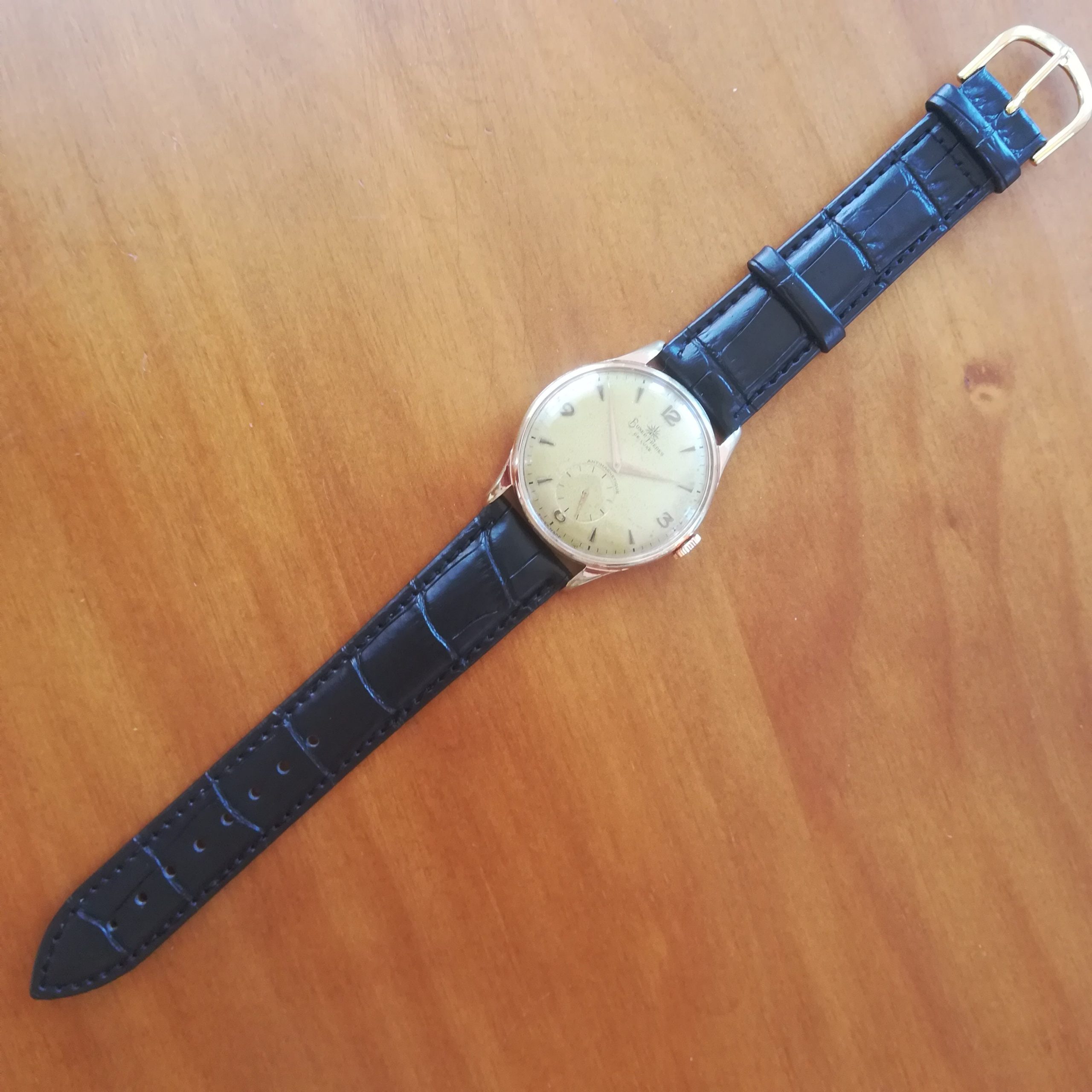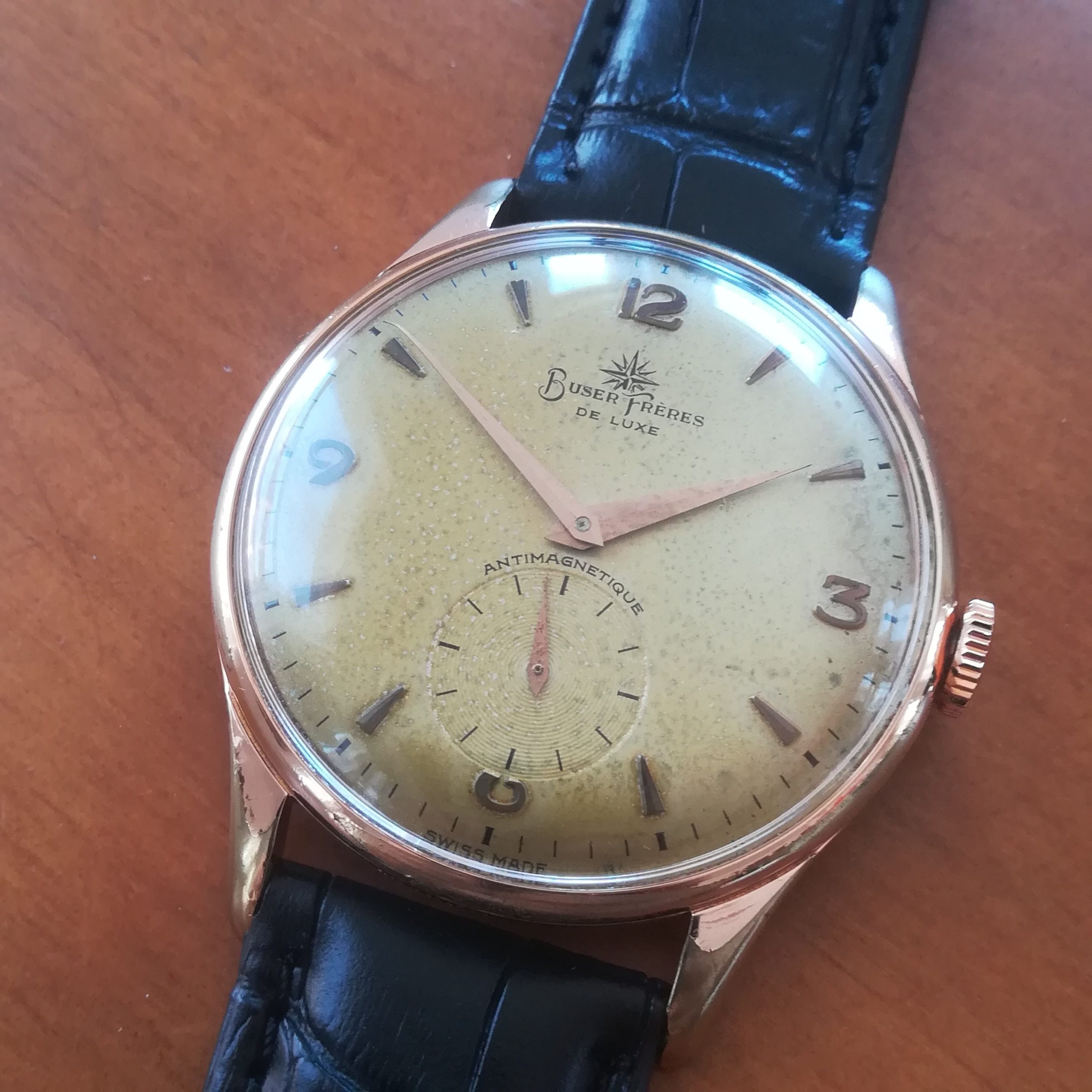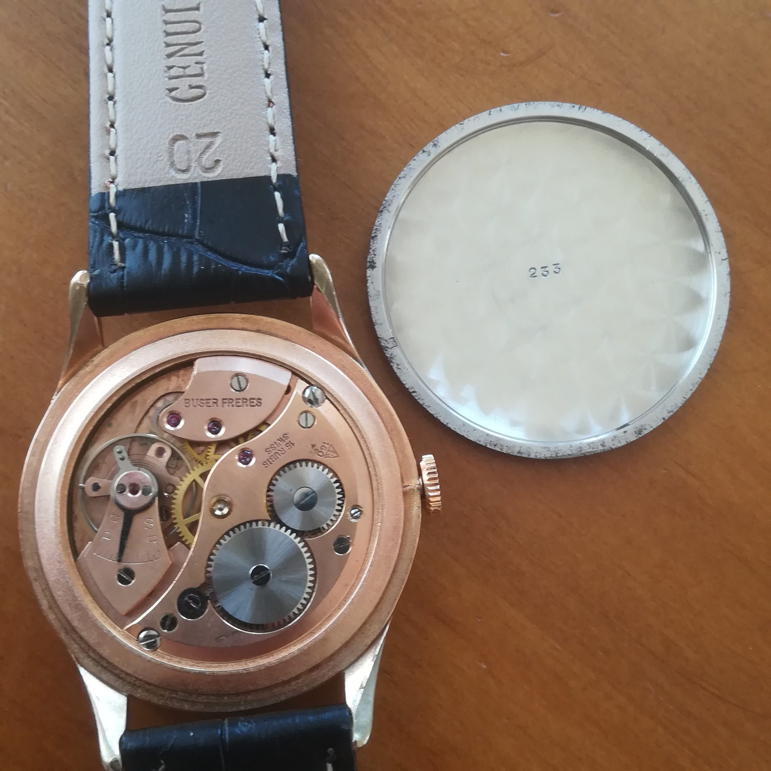 BUSER FRÈRES vintage watch, with in-house movement 180, Swiss made in the 50s, 37.5 mm across excluding the crown, hand-wound (mechanical, no battery!), working fine and serviced.
