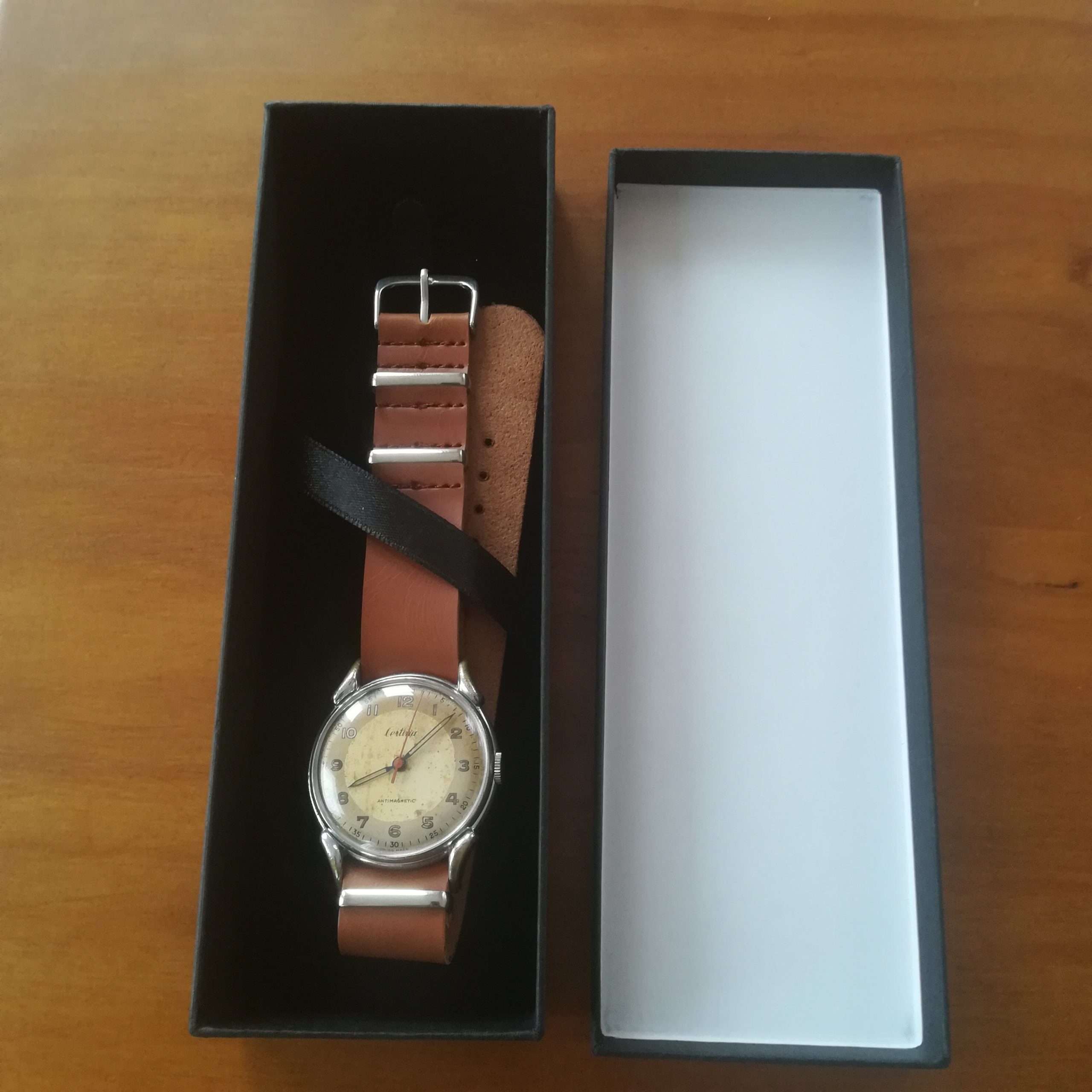 The chromed case is worn on some areas – please check the photos. The bitone dial shows a nice patina. The watch also features a new NATO-style brown faux leather strap. It will fit wrists of up to 24 cm. Lug width is 18 mm.