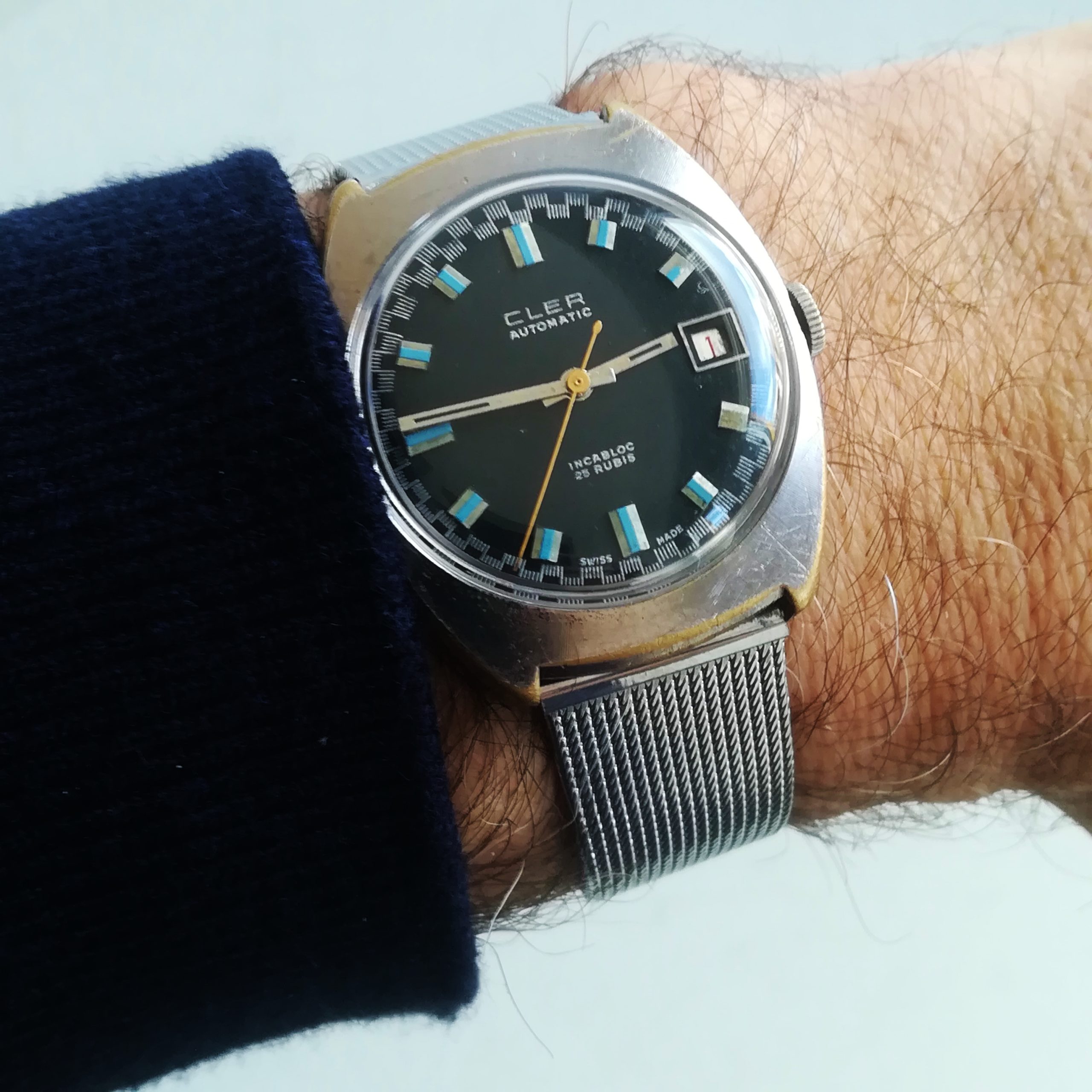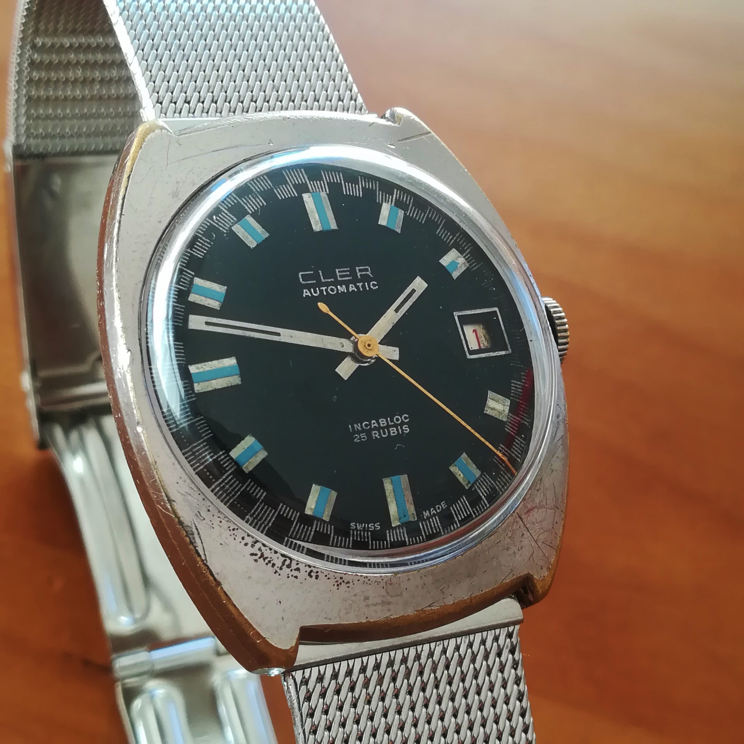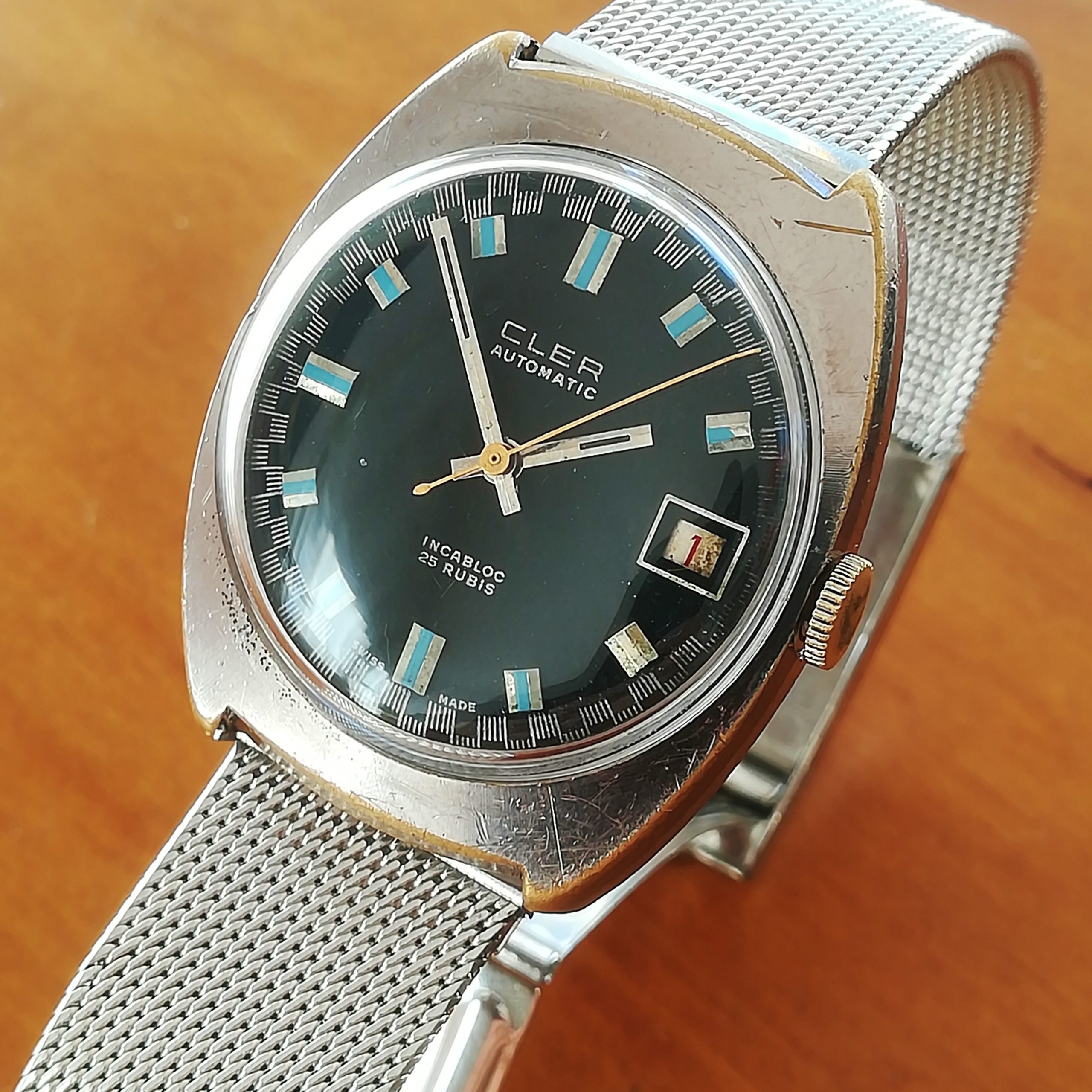 CLER automatic vintage watch, with ETA 2452 movement with date feature, Swis made in the 1970s, case of 34×38 mm, automatic (self-winding with the user’s movements) and hand-wound (mechanical, no battery!) , working fine and serviced.