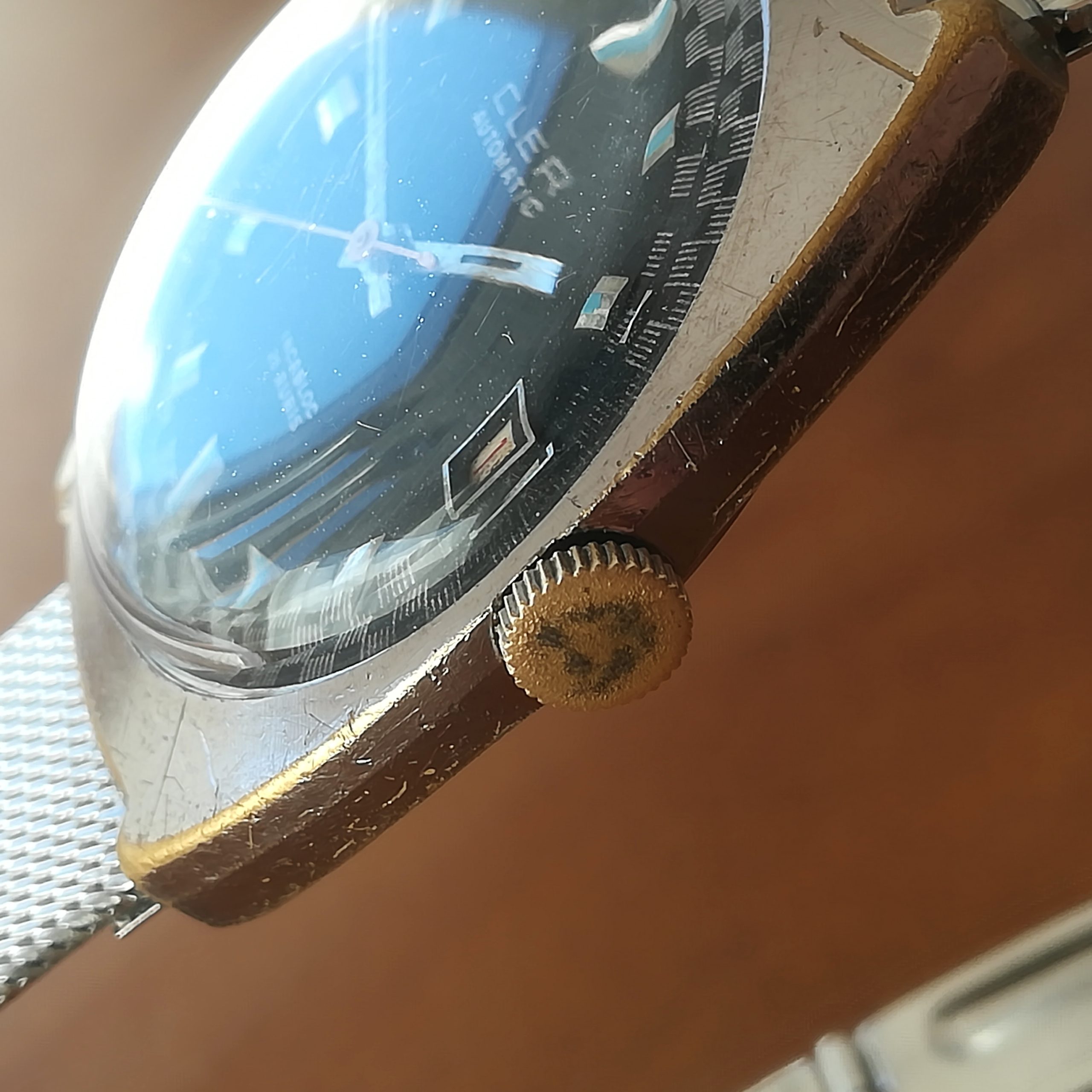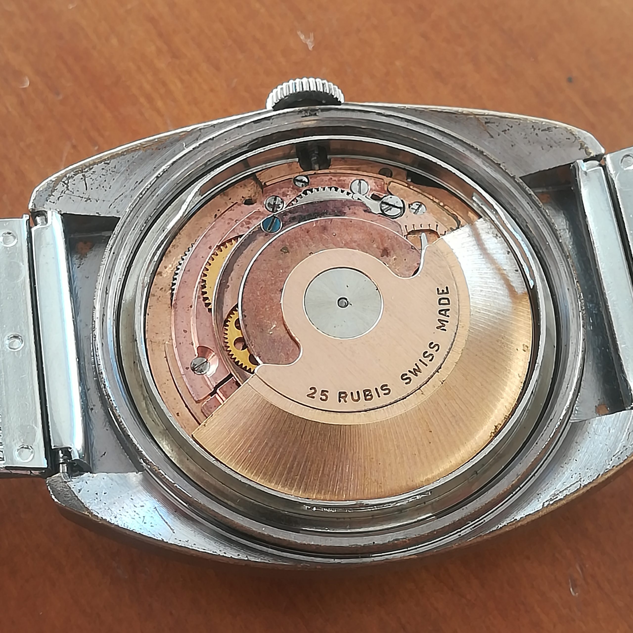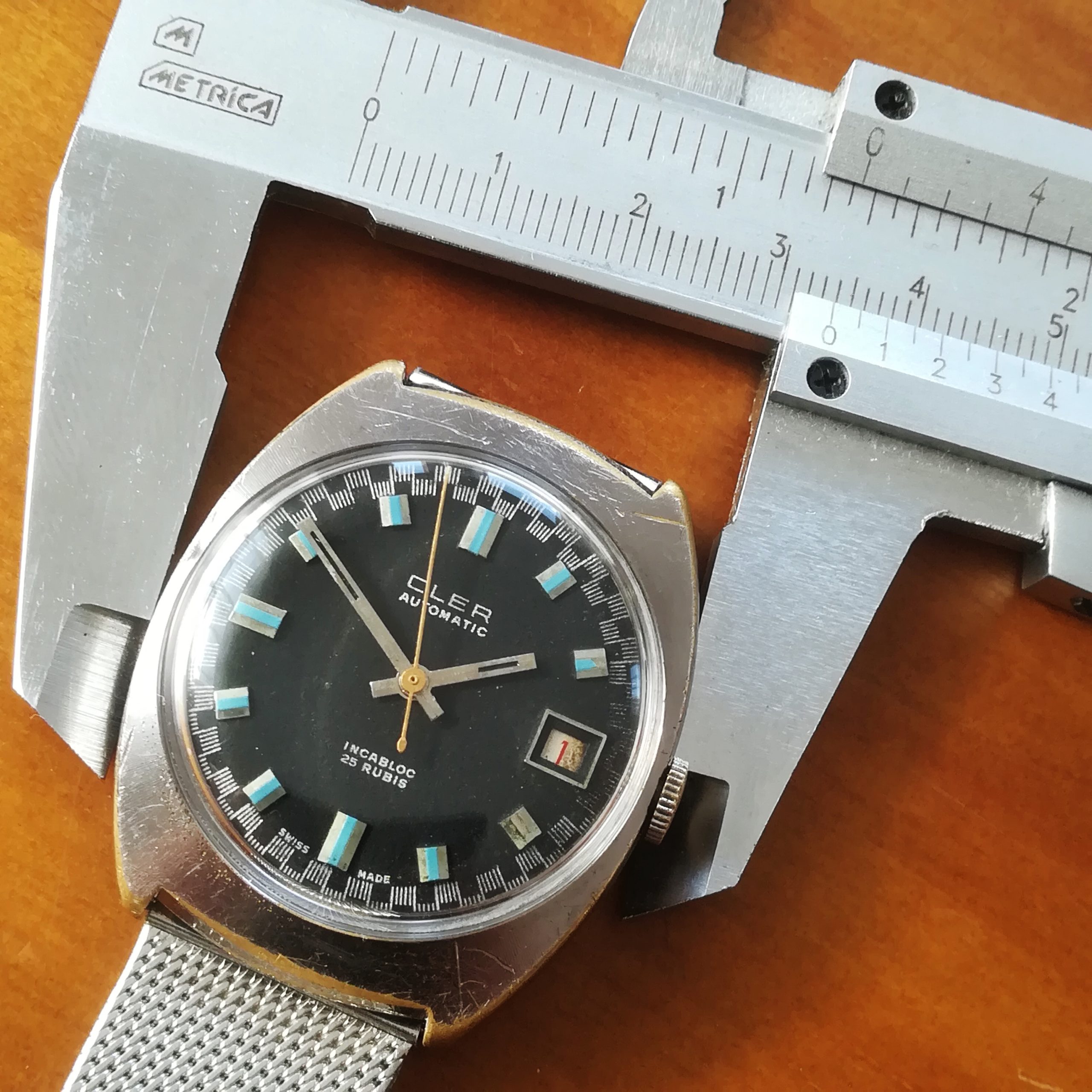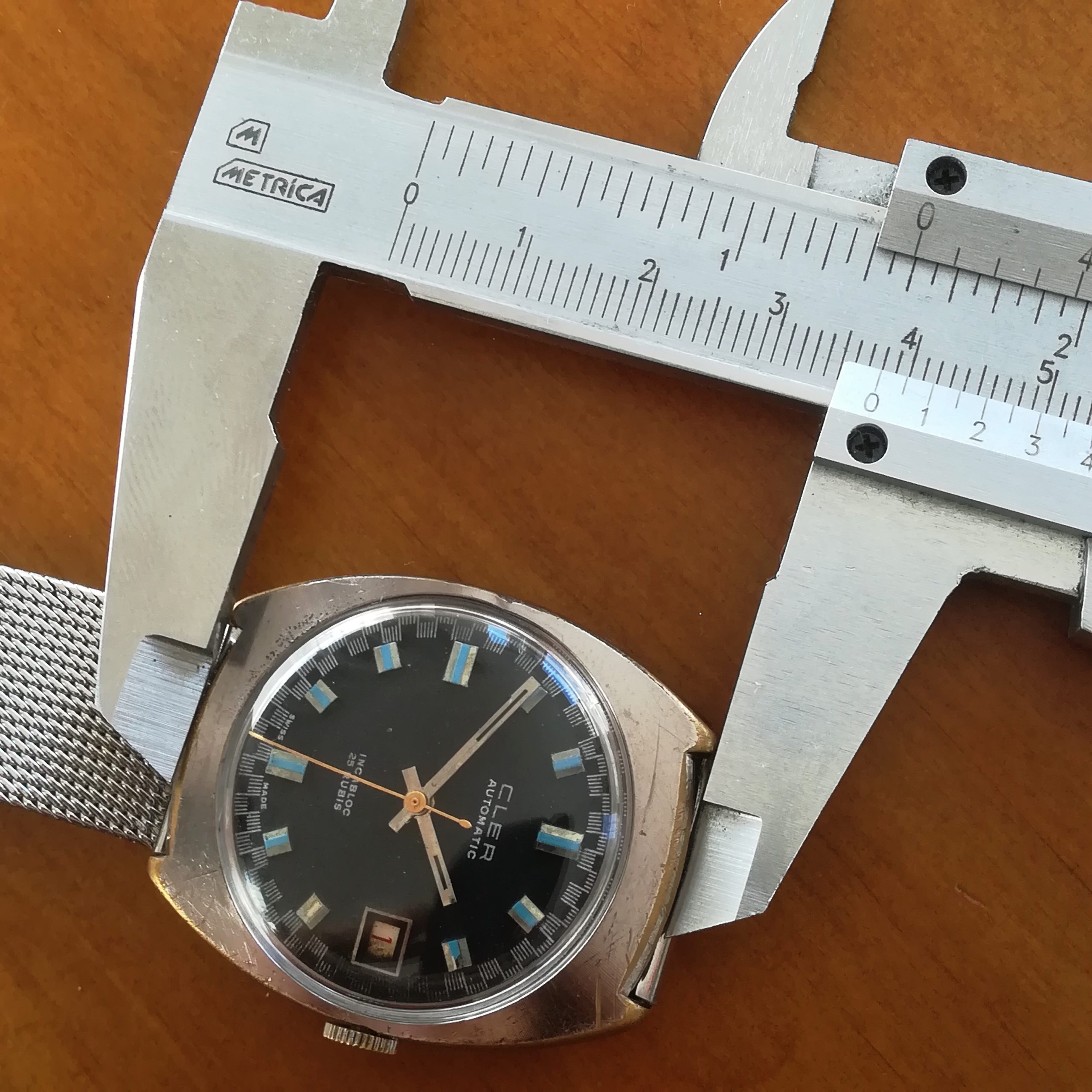 CLER automatic vintage watch, with ETA 2452 movement with date feature, Swis made in the 1970s, case of 34×38 mm, automatic (self-winding with the user’s movements) and hand-wound (mechanical, no battery!) , working fine and serviced.