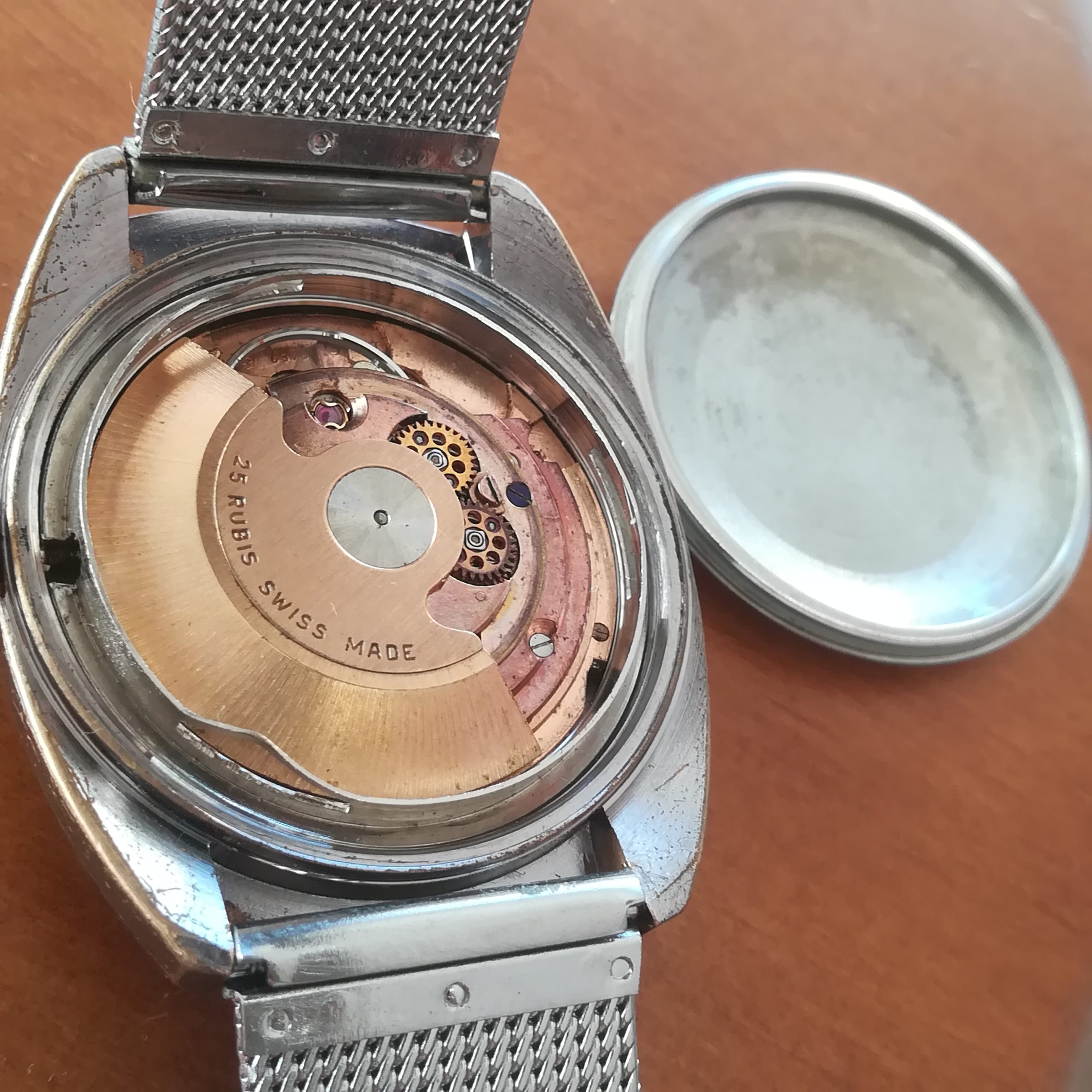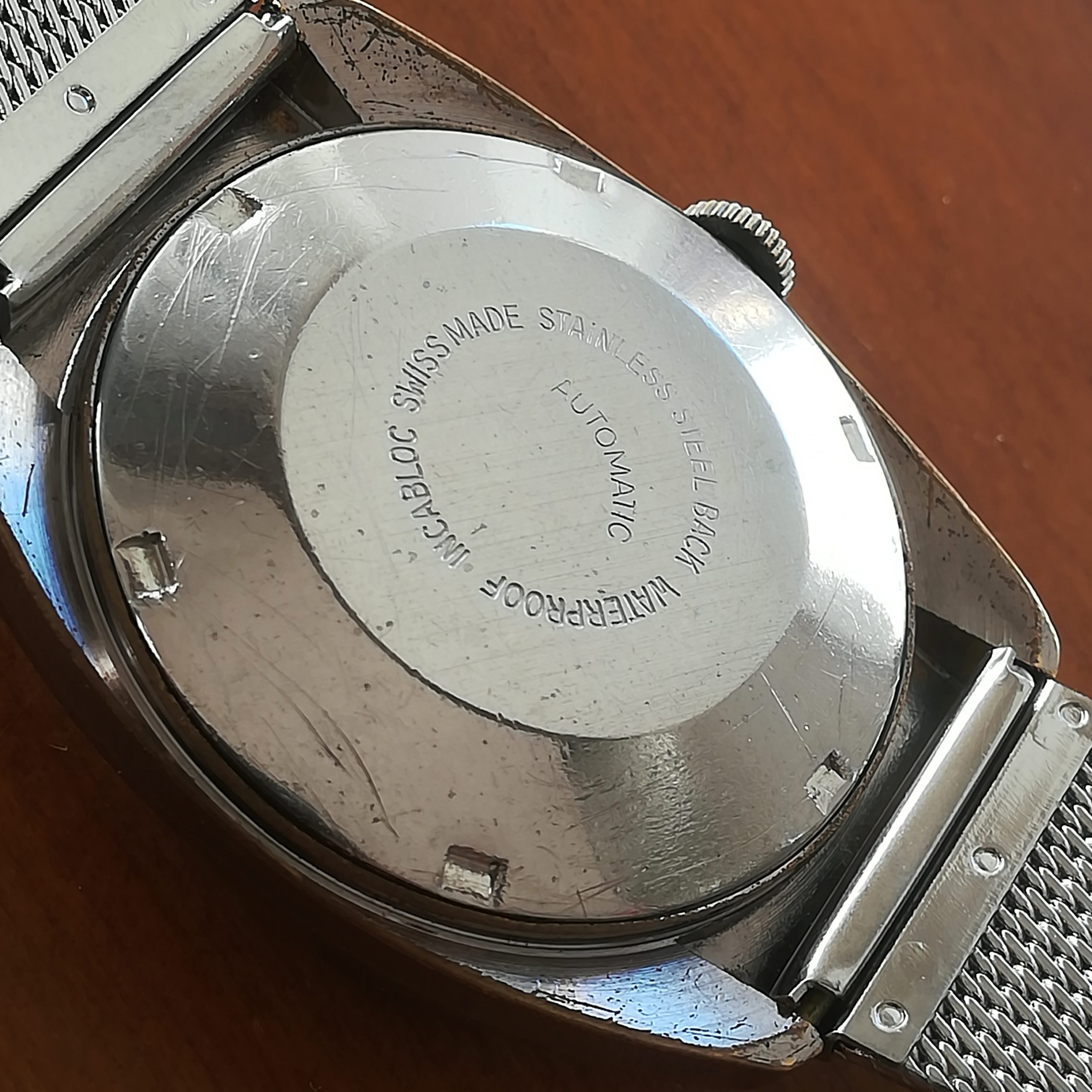 The case is chromed metal, with wear and scratches as can be seen in the photos. The watch also features a new mesh stainless steel bracelet. It will fit wrists of up to 20 cm.