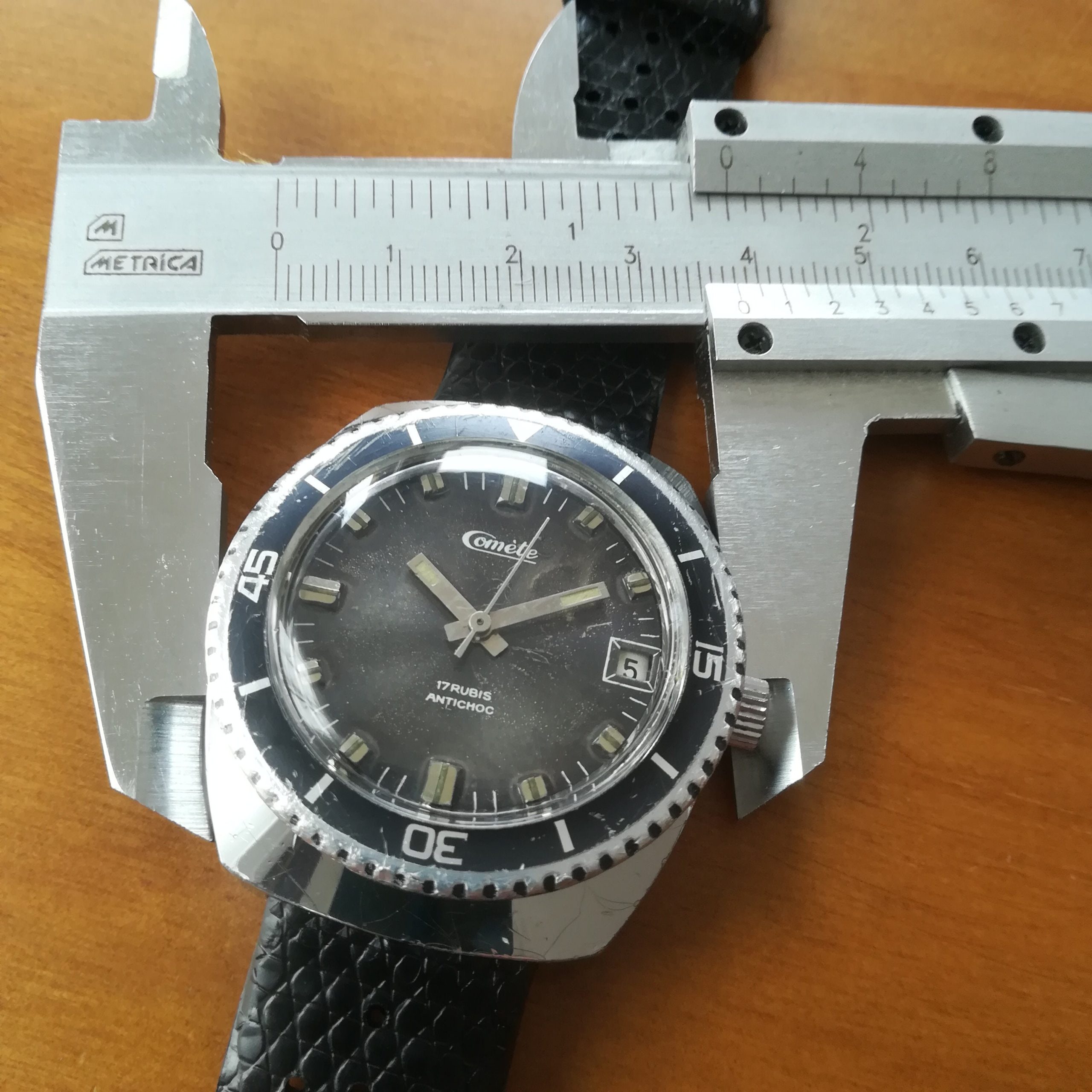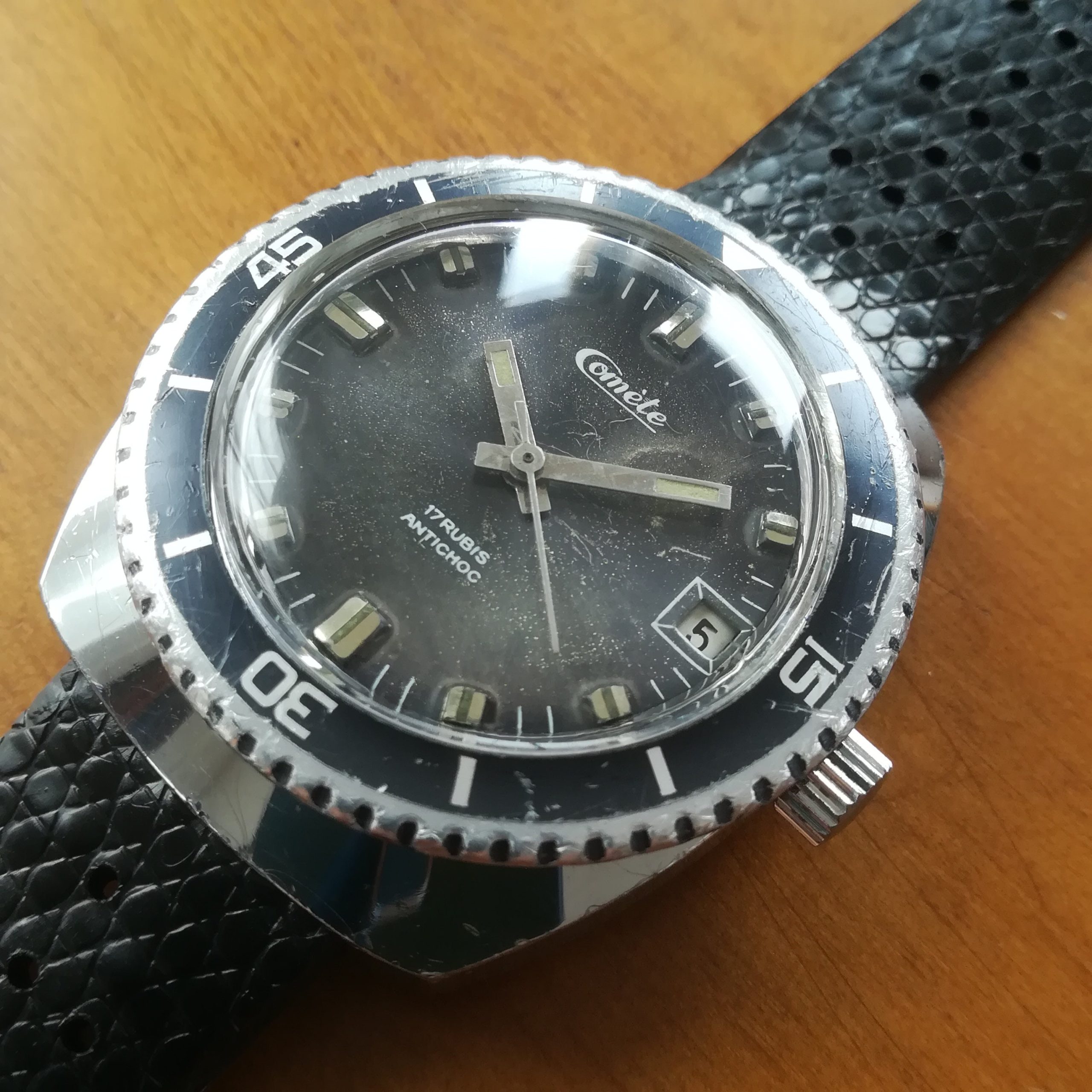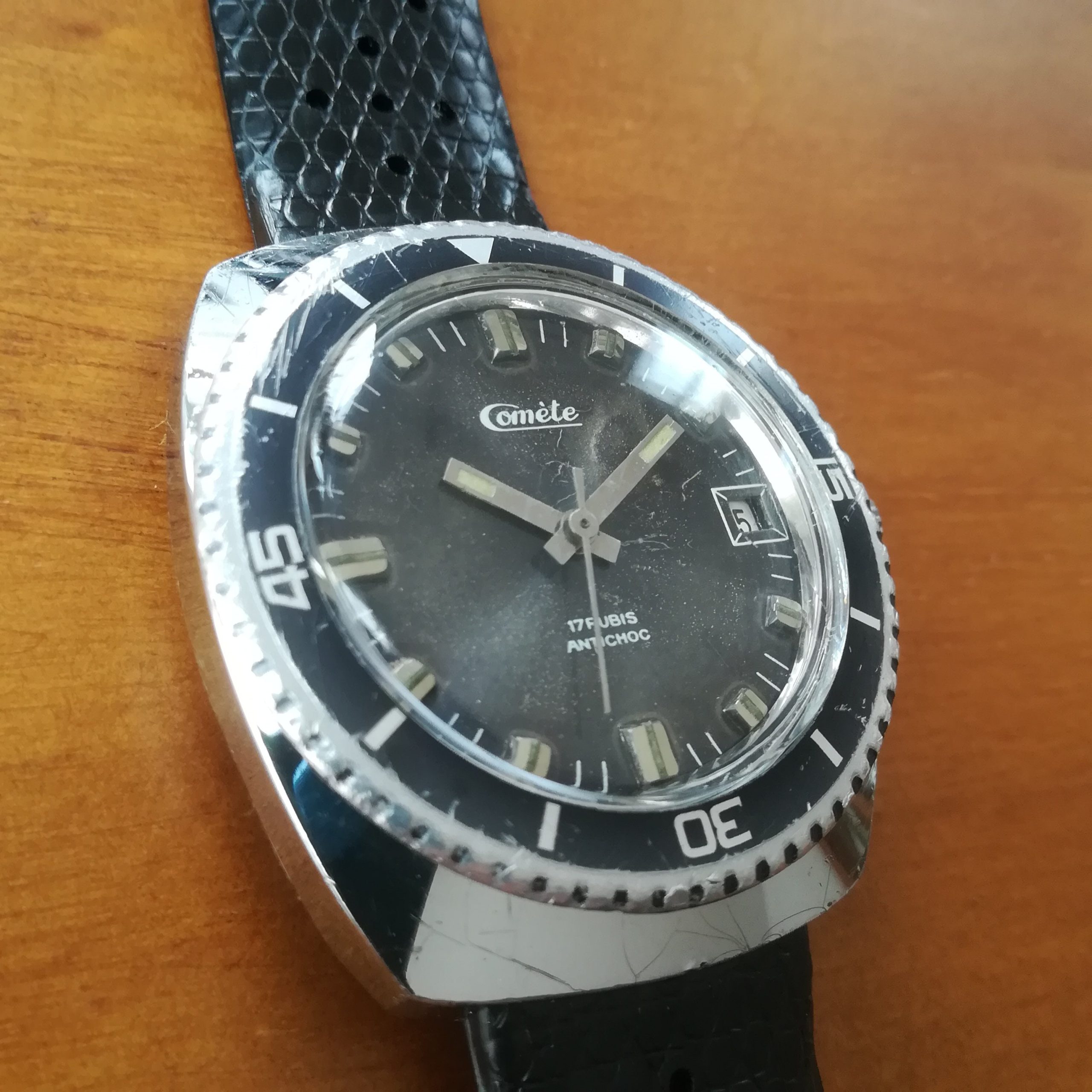 COMÈTE diver vintage watch, Jeambrun (JEJ) 27DC movement with date indication, Made in France in the 1970s, 38 mm across excluding the crown, hand-wound (mechanical, no battery!), working fine and serviced.