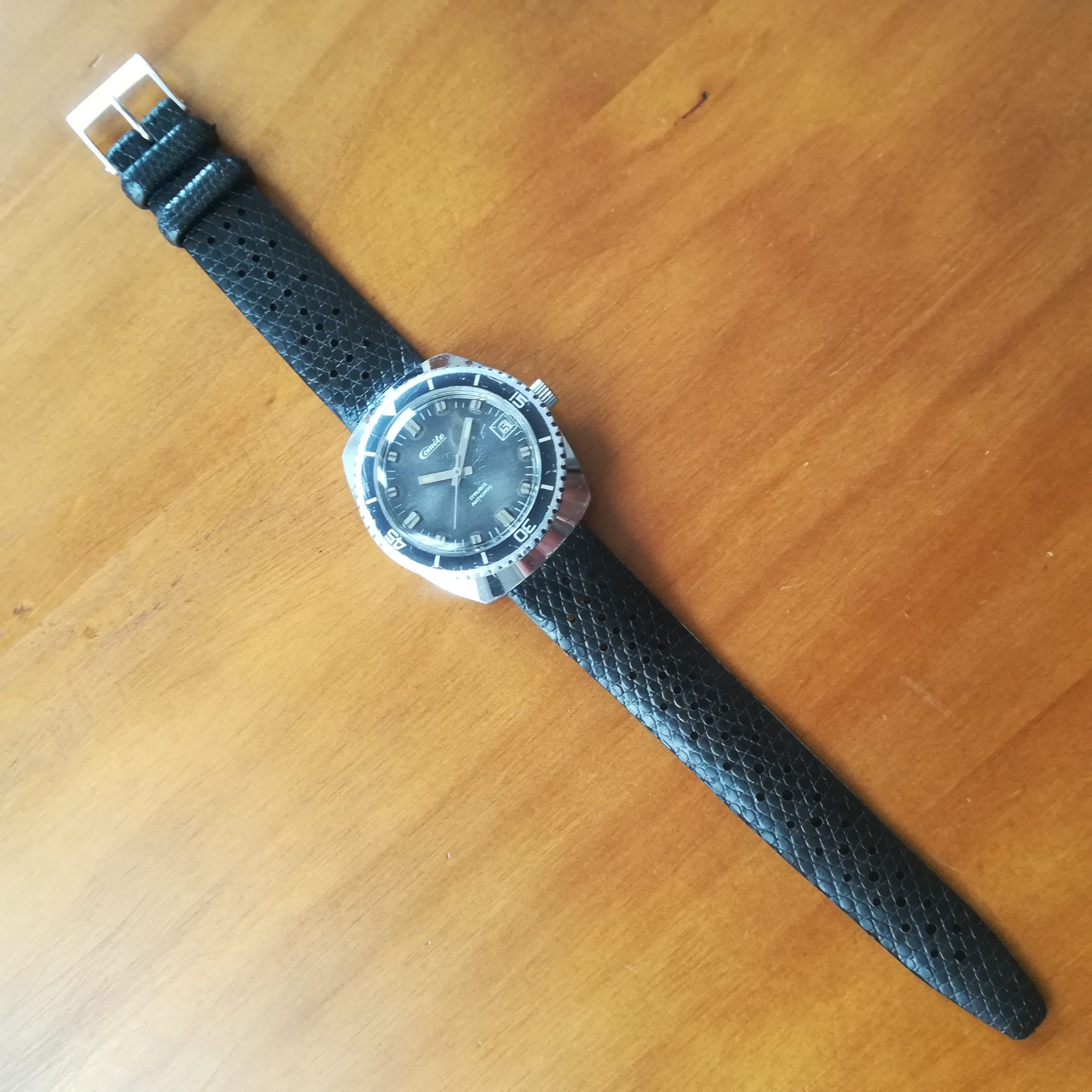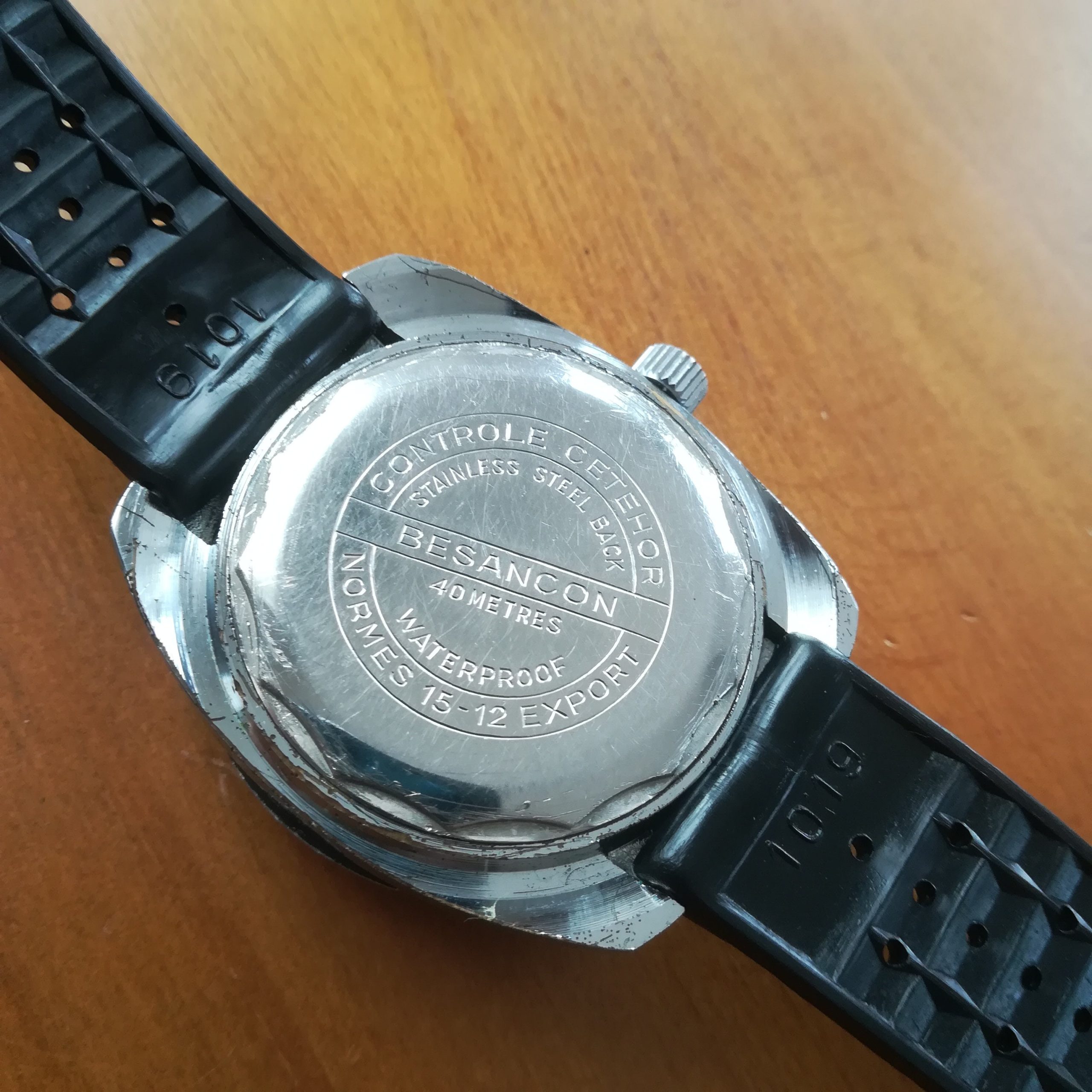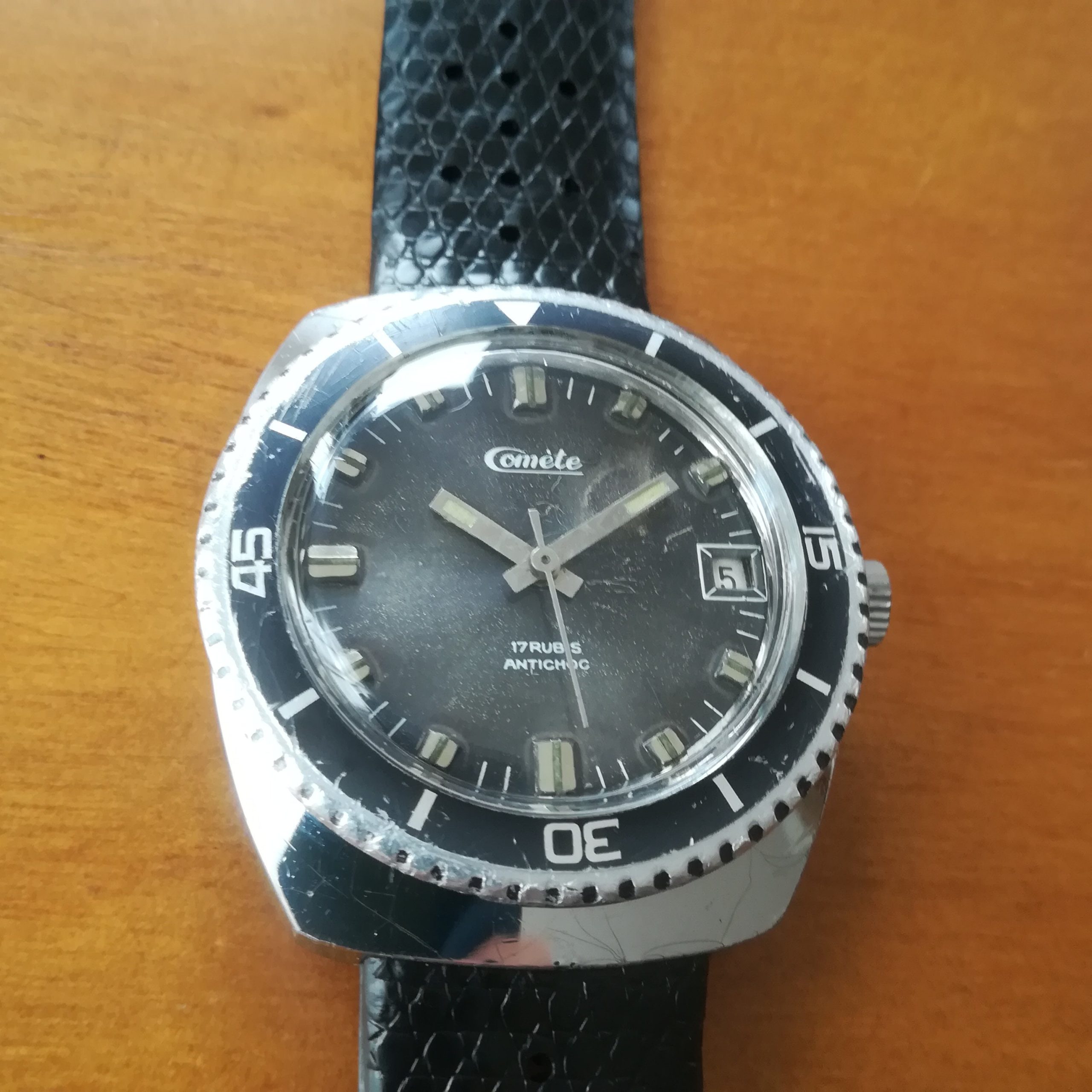 COMÈTE diver vintage watch, Jeambrun (JEJ) 27DC movement with date indication, Made in France in the 1970s, 38 mm across excluding the crown, hand-wound (mechanical, no battery!), working fine and serviced.