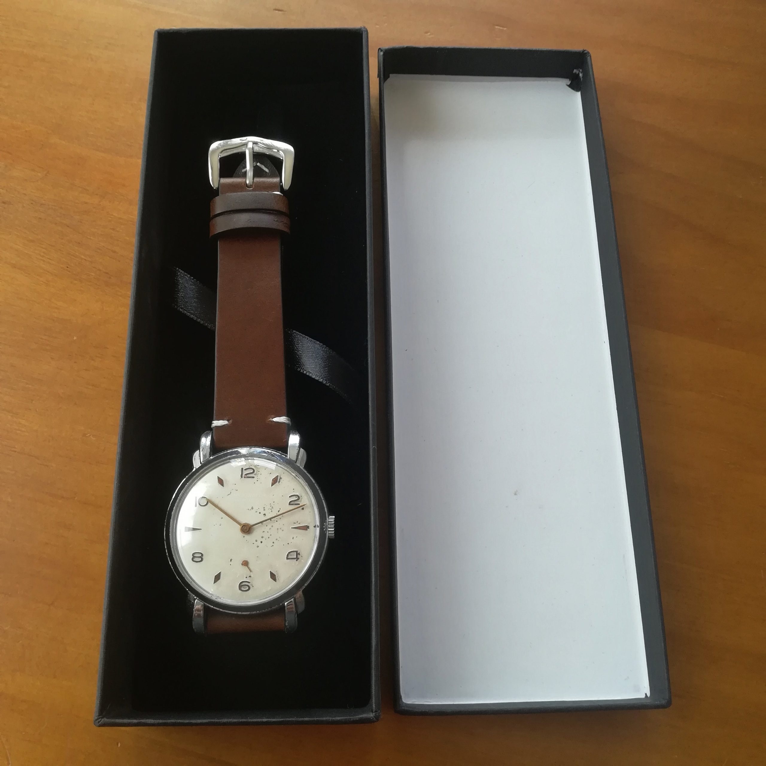 The case chrome plating is worn in some areas – please check the photos. The dial has dents and lost all the prints – again, please check the pictures. The watch features a new brown leather strap. It will fit wrists of up to 21 cm.