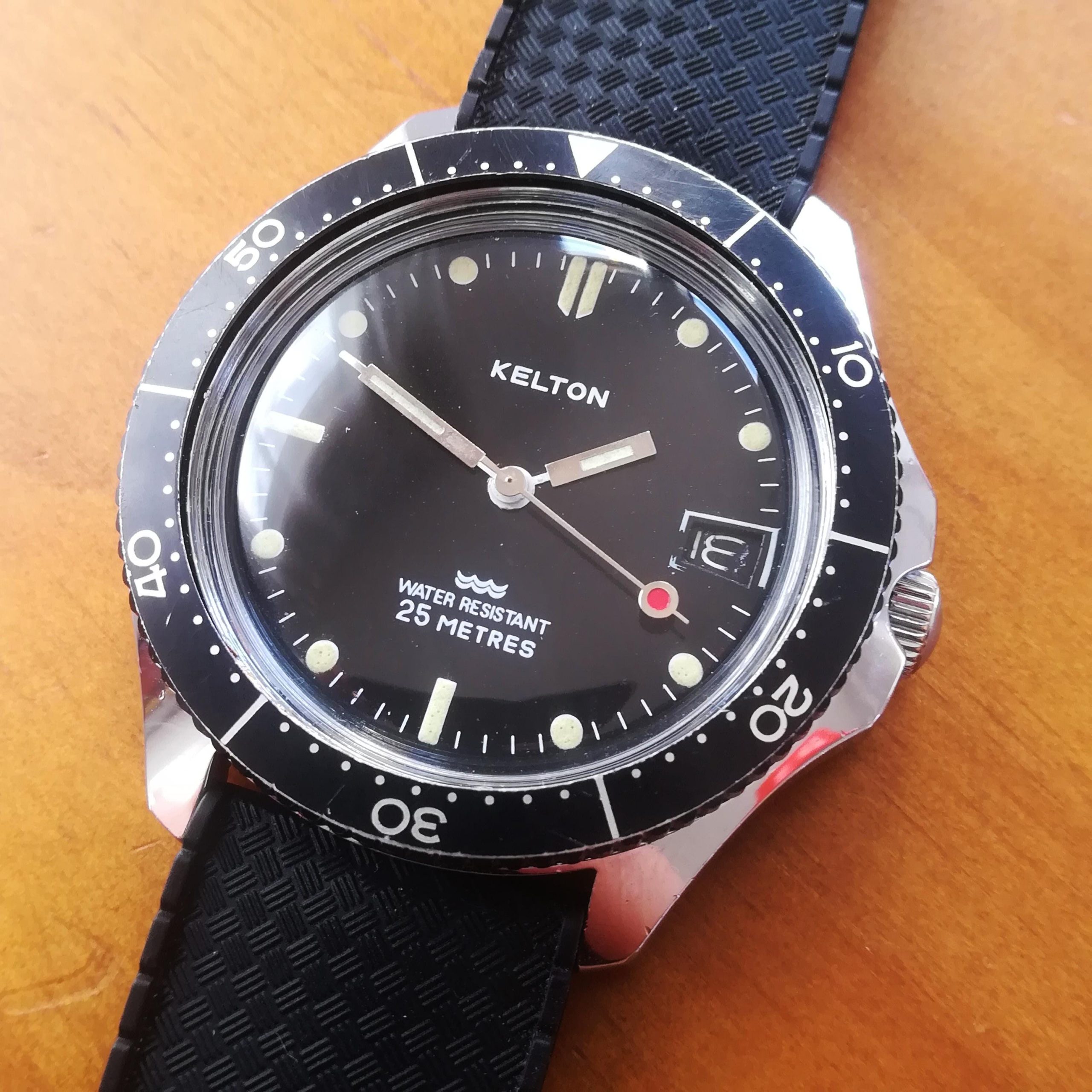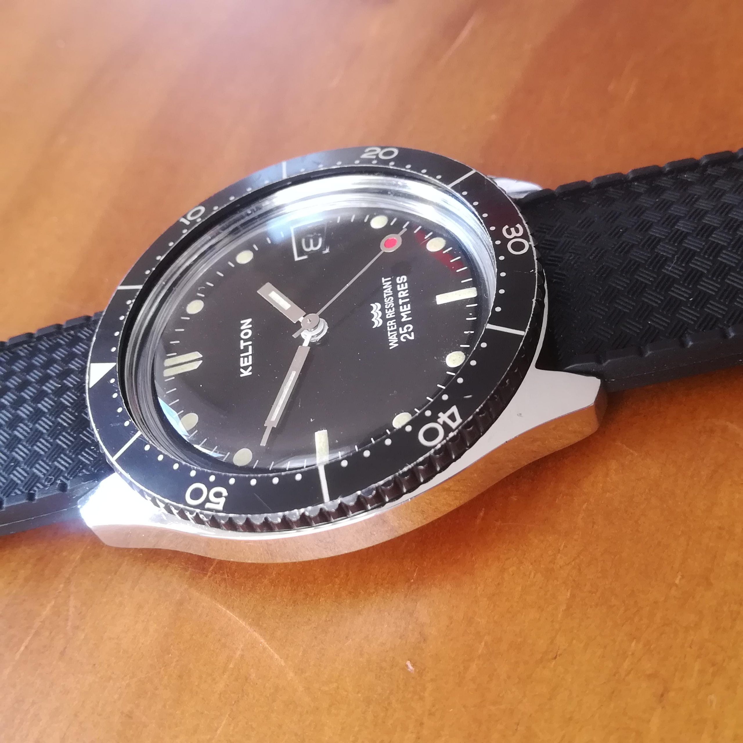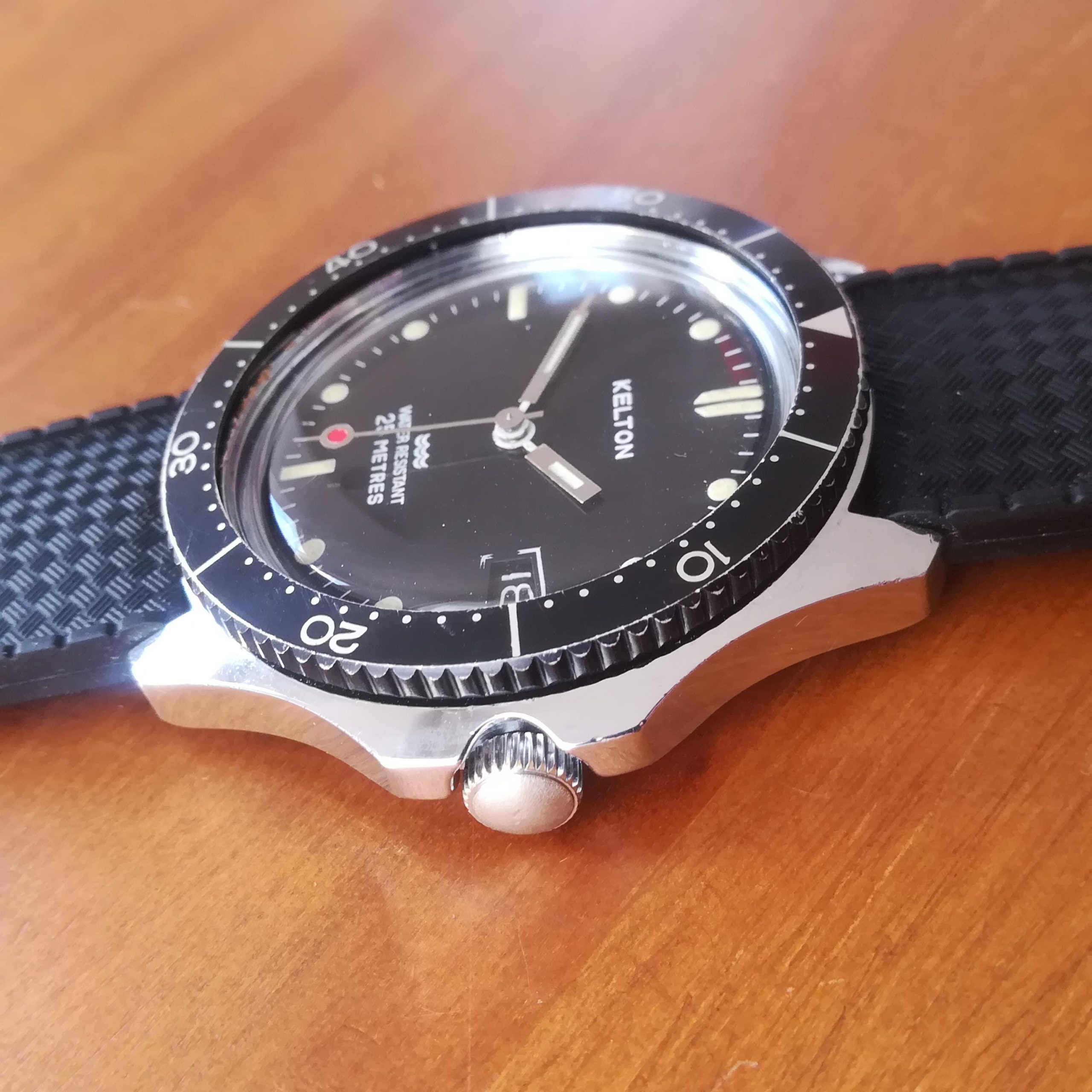 KELTON diver vintage watch, Timex M105 movement with date feature, made in France in the 1970s, case of 41 mm across excluding the crown, hand-wound (mechanical, no battery!), working and serviced.