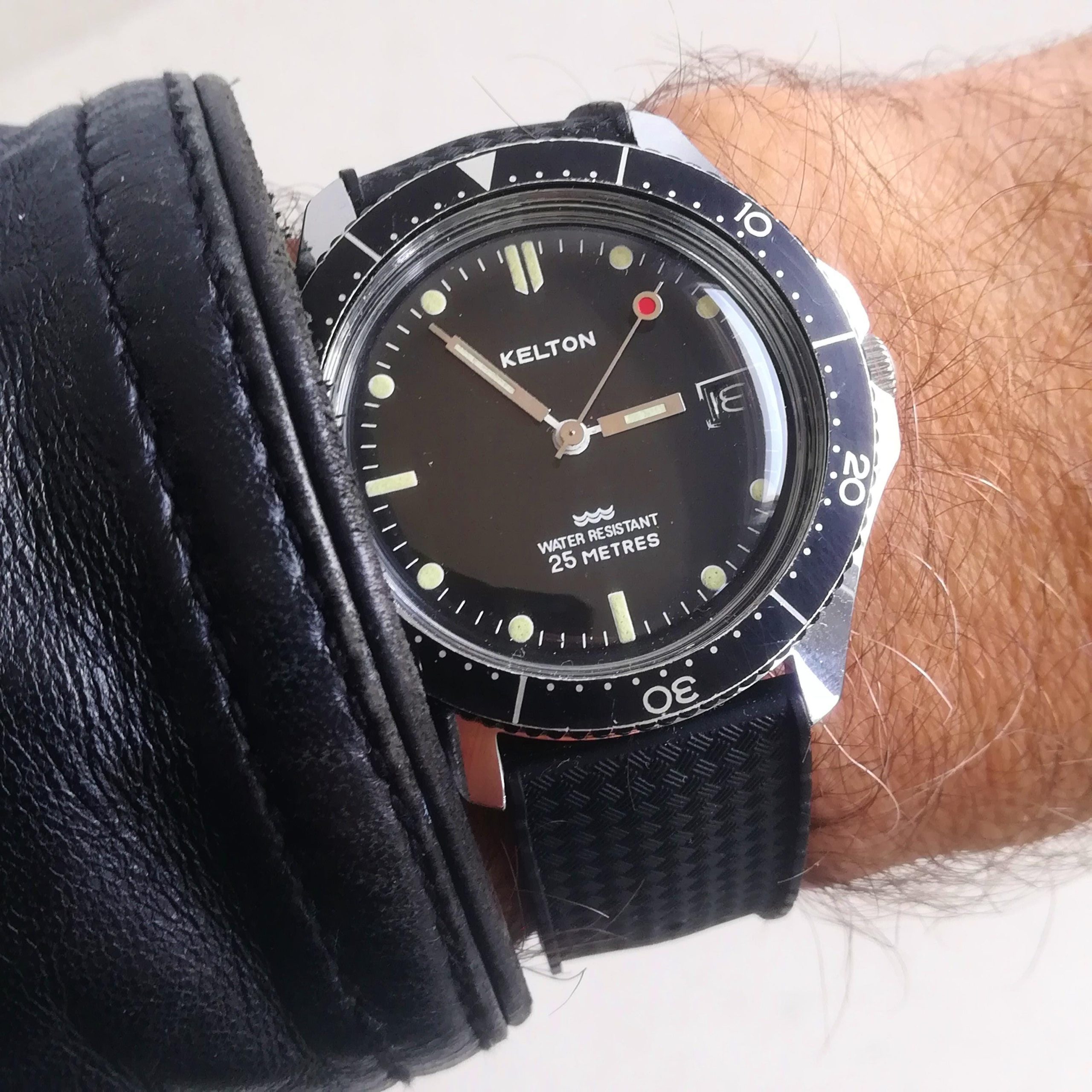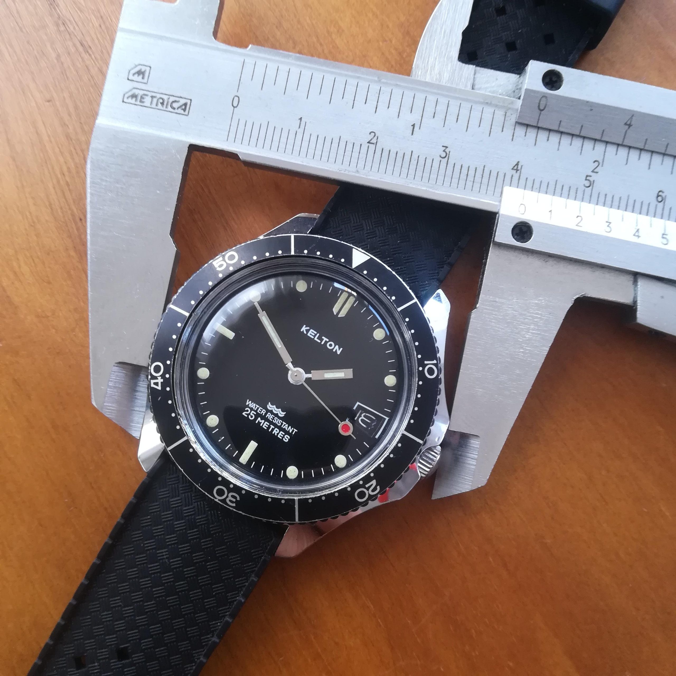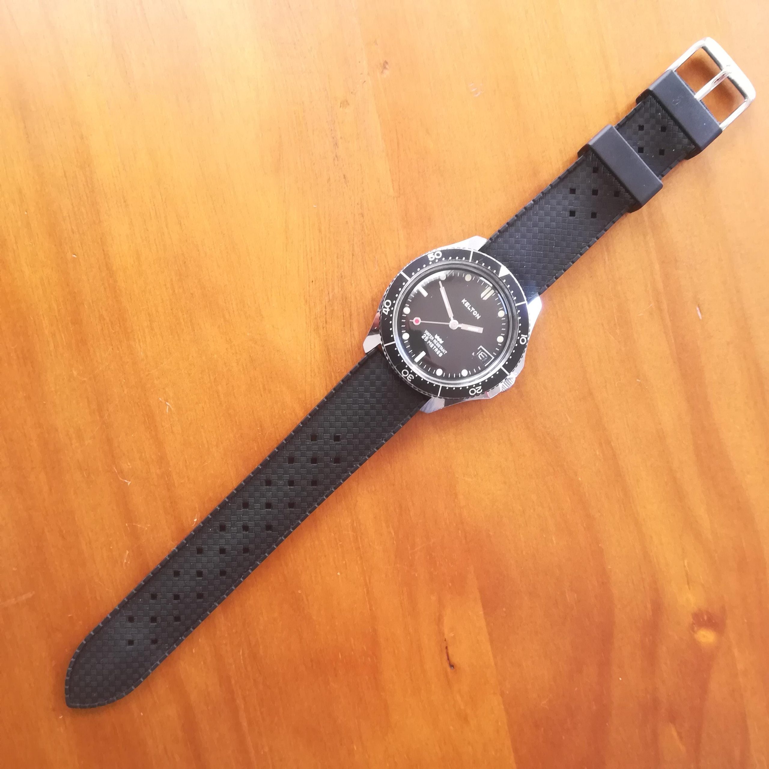 KELTON diver vintage watch, Timex M105 movement with date feature, made in France in the 1970s, case of 41 mm across excluding the crown, hand-wound (mechanical, no battery!), working and serviced.