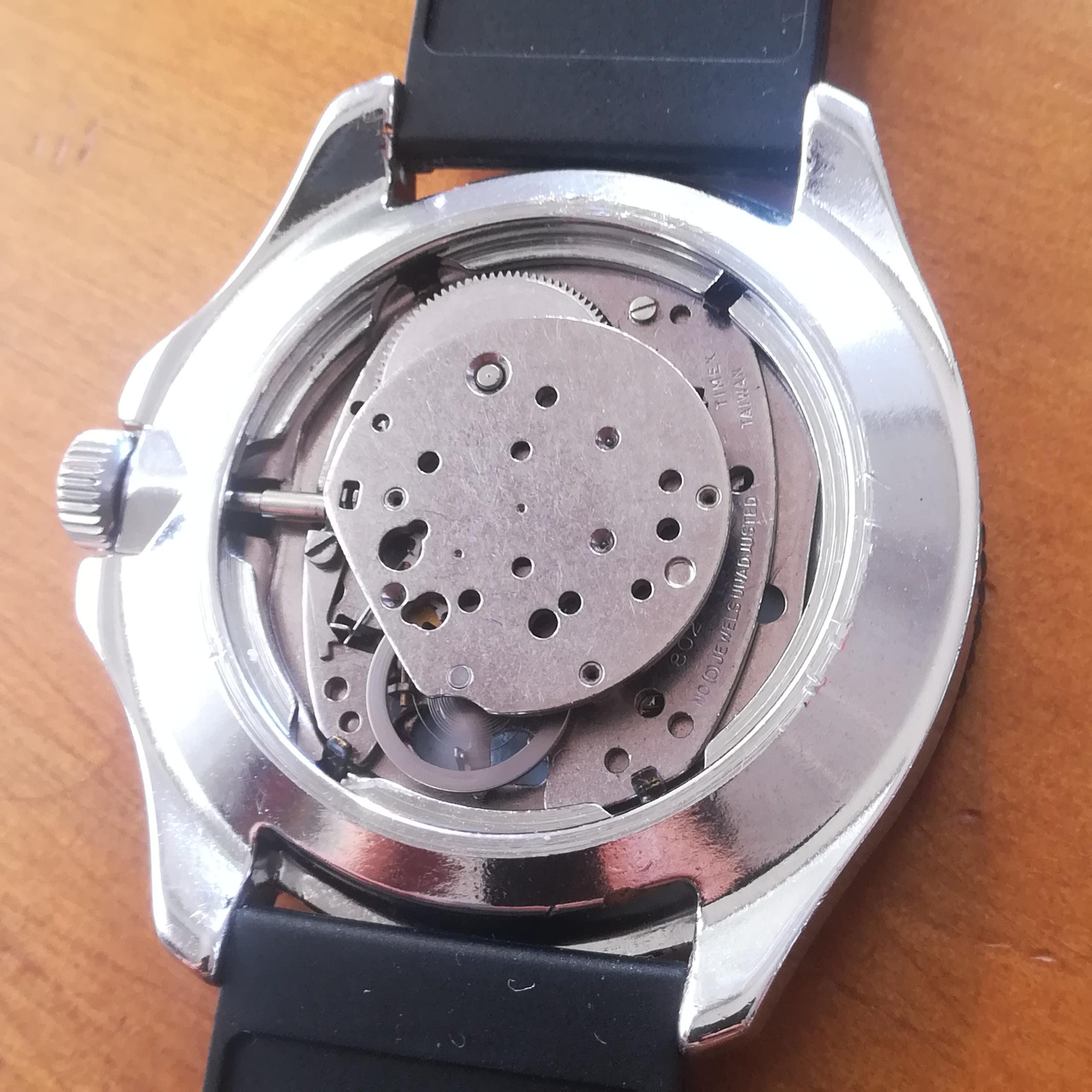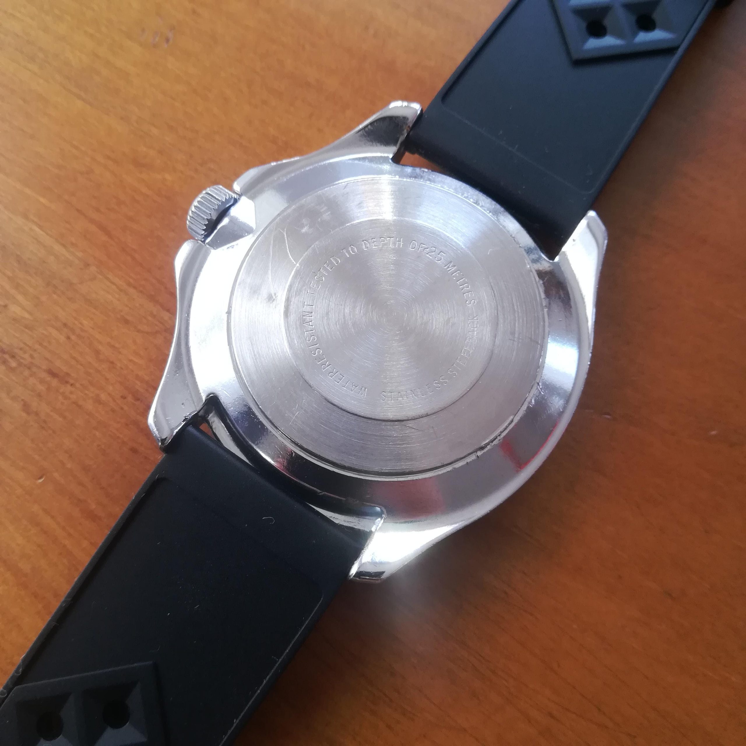 Chromed metal case. The bezel rotates properly in both directions. The watch also features a new black rubber diver strap. It will fit wrists of up to 21 cm. Lug width is 20 mm.