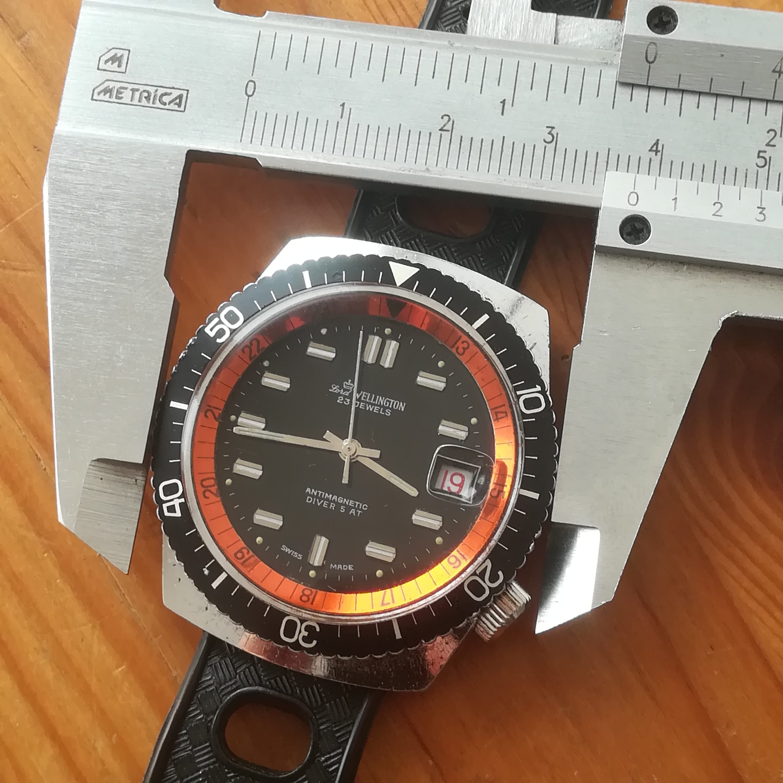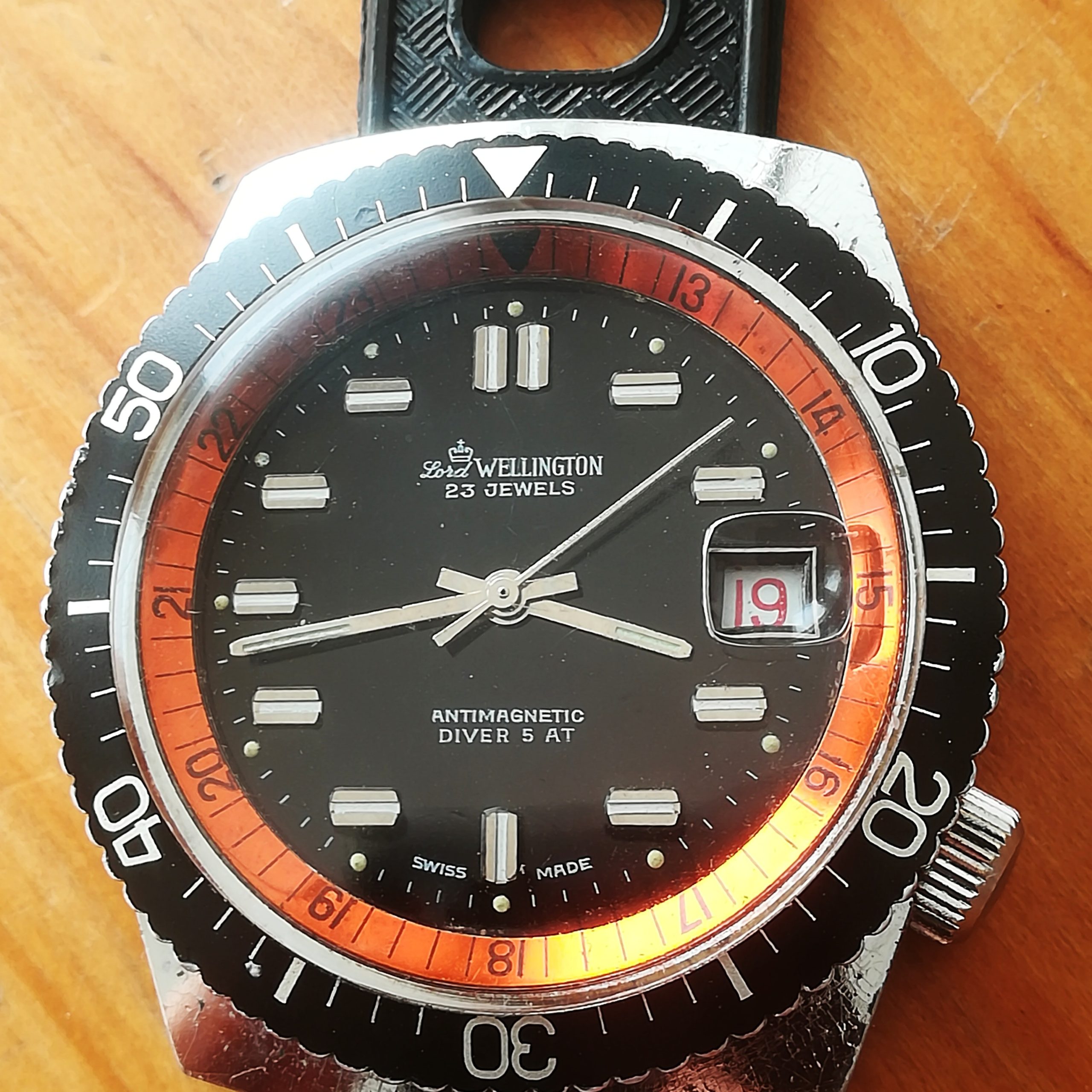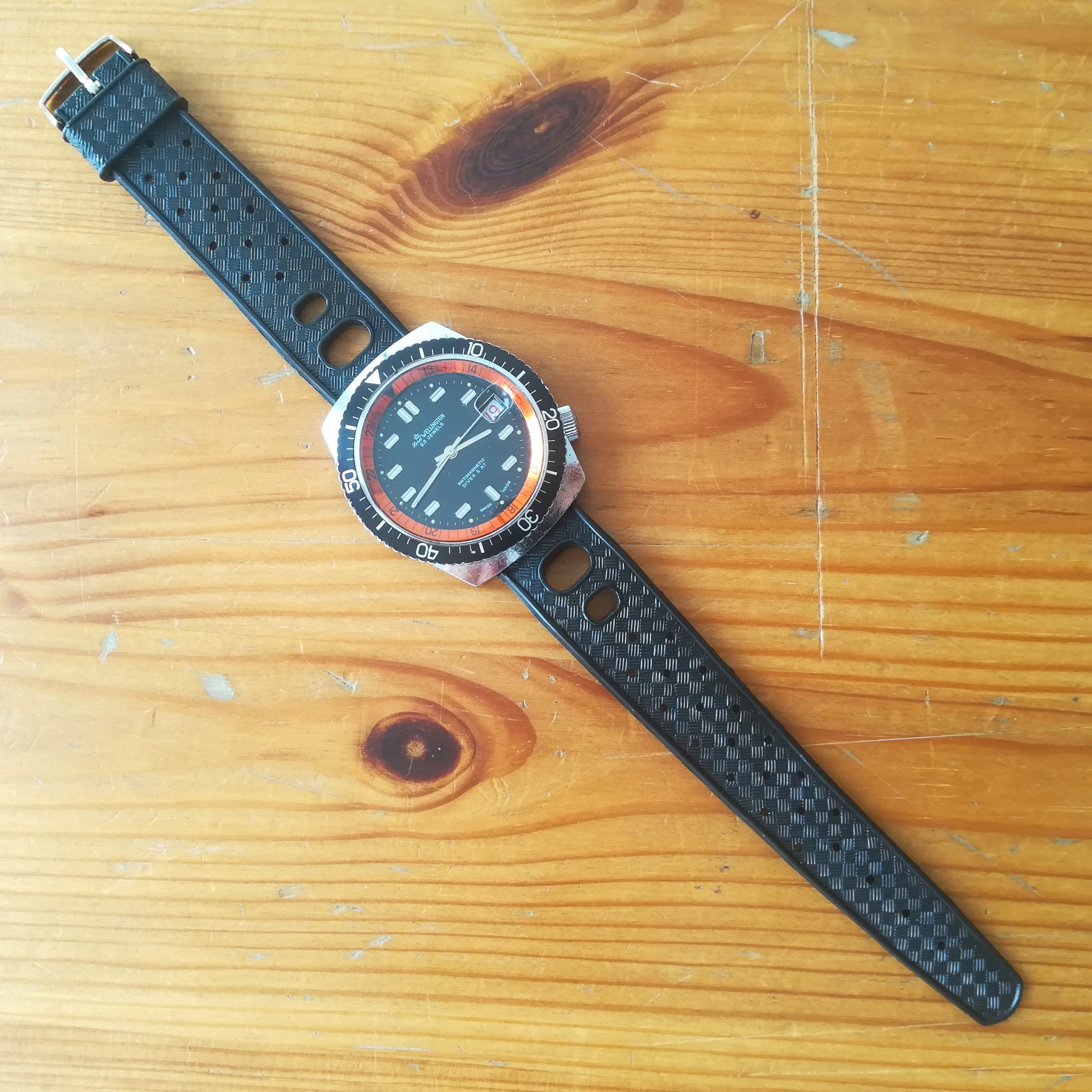 Lord Wellington diver vintage watch, EB 8021N movement with date indication, Made in France in the 1970s, 38 mm across excluding the crown, hand-wound (mechanical, no battery!), working fine and serviced.
