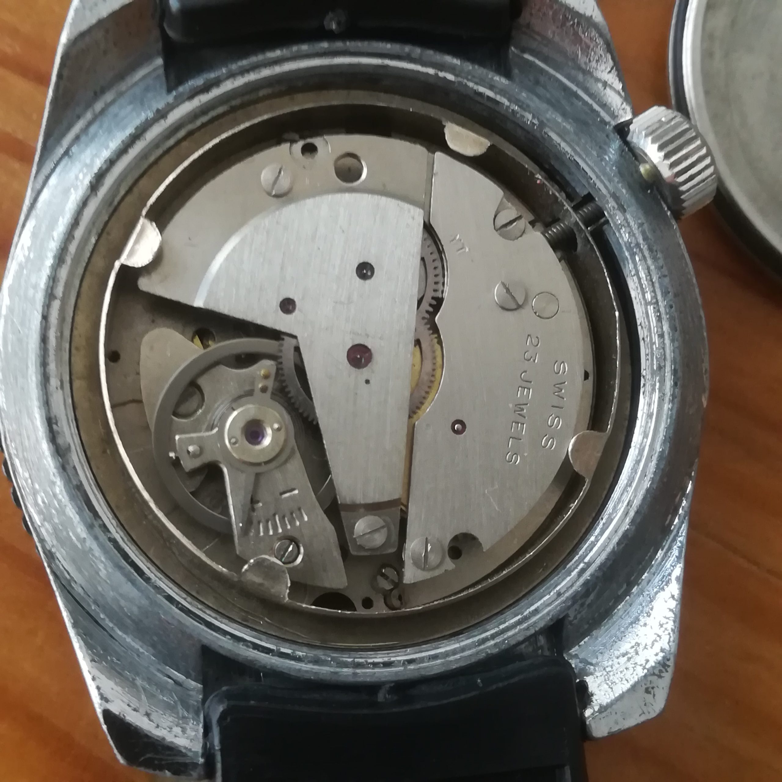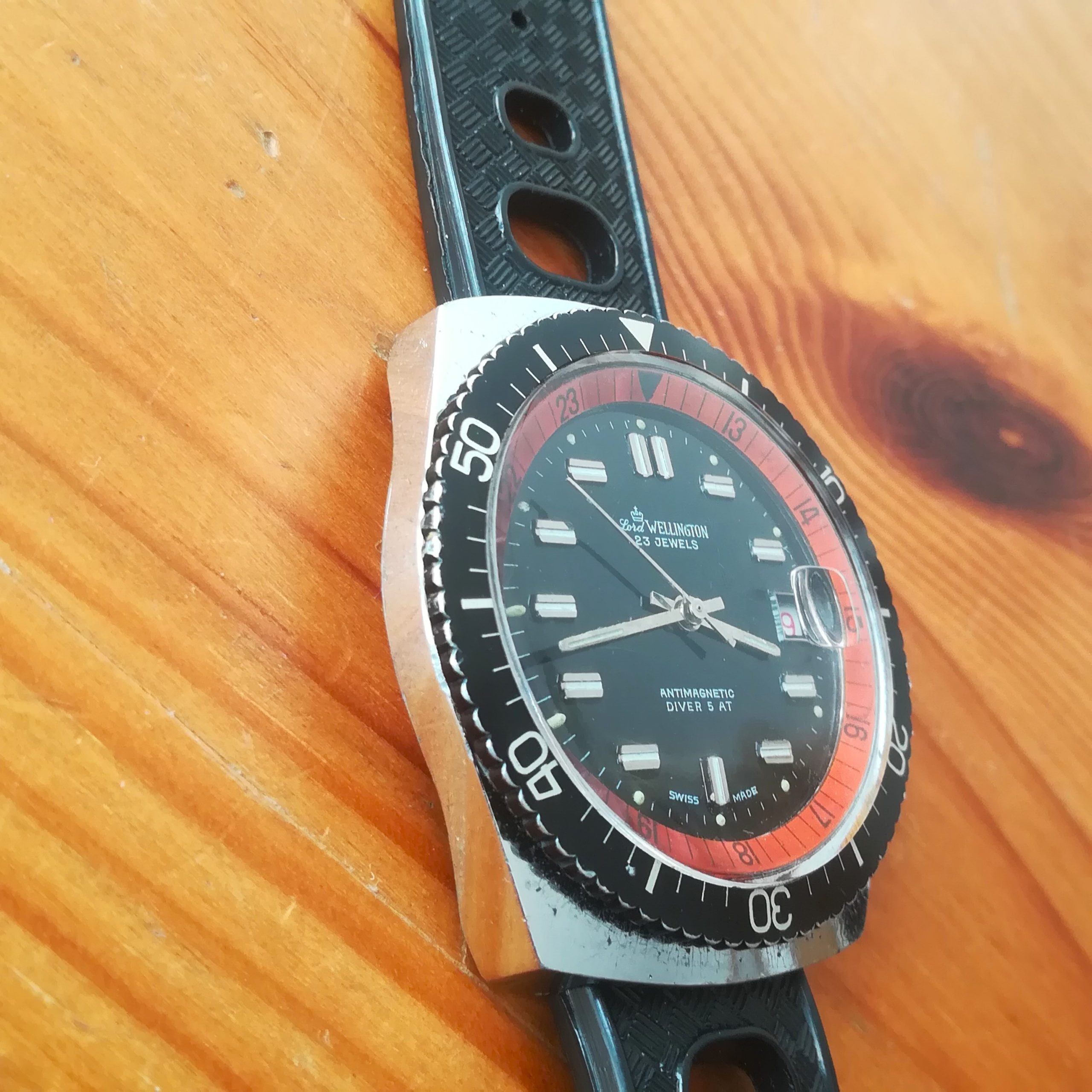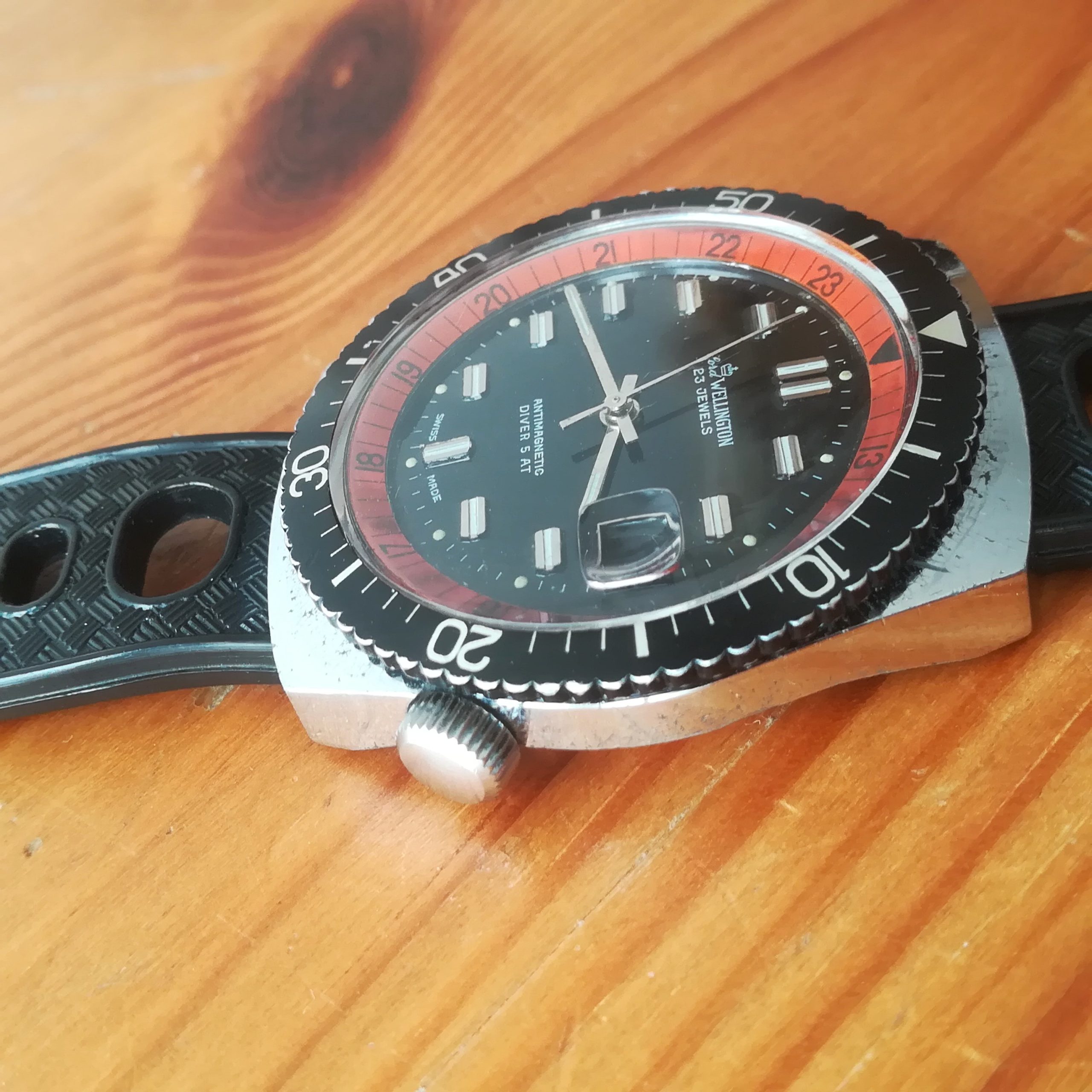 Lord Wellington diver vintage watch, EB 8021N movement with date indication, Made in France in the 1970s, 38 mm across excluding the crown, hand-wound (mechanical, no battery!), working fine and serviced.