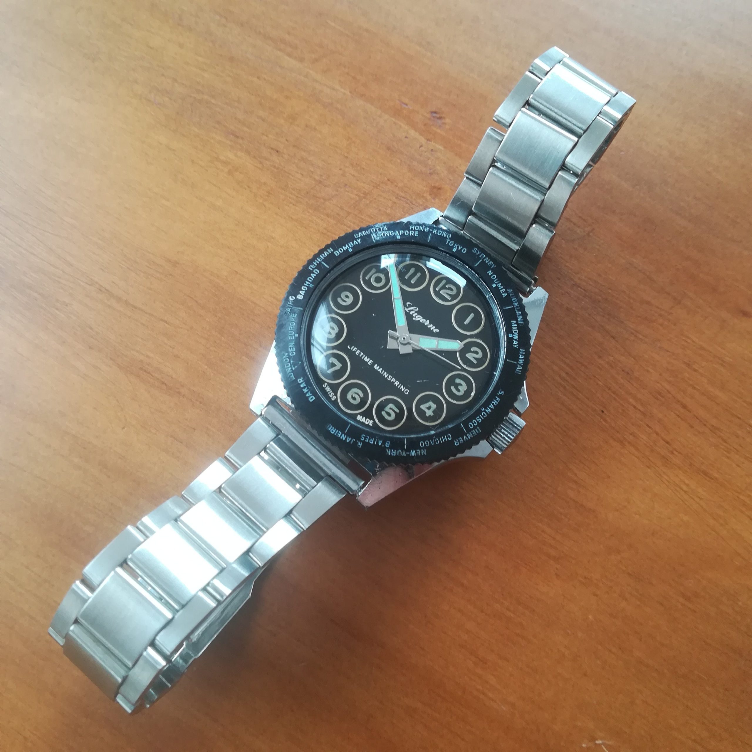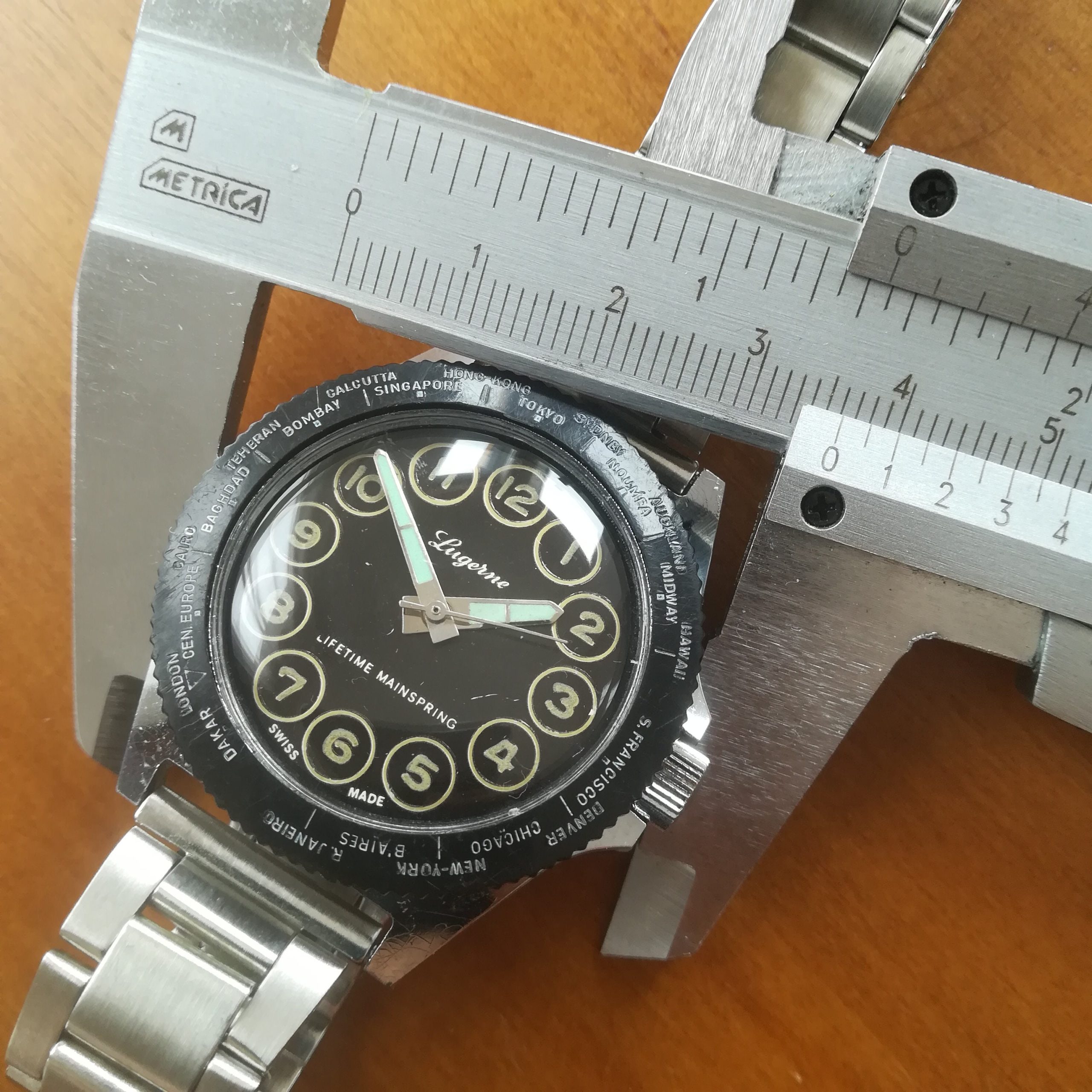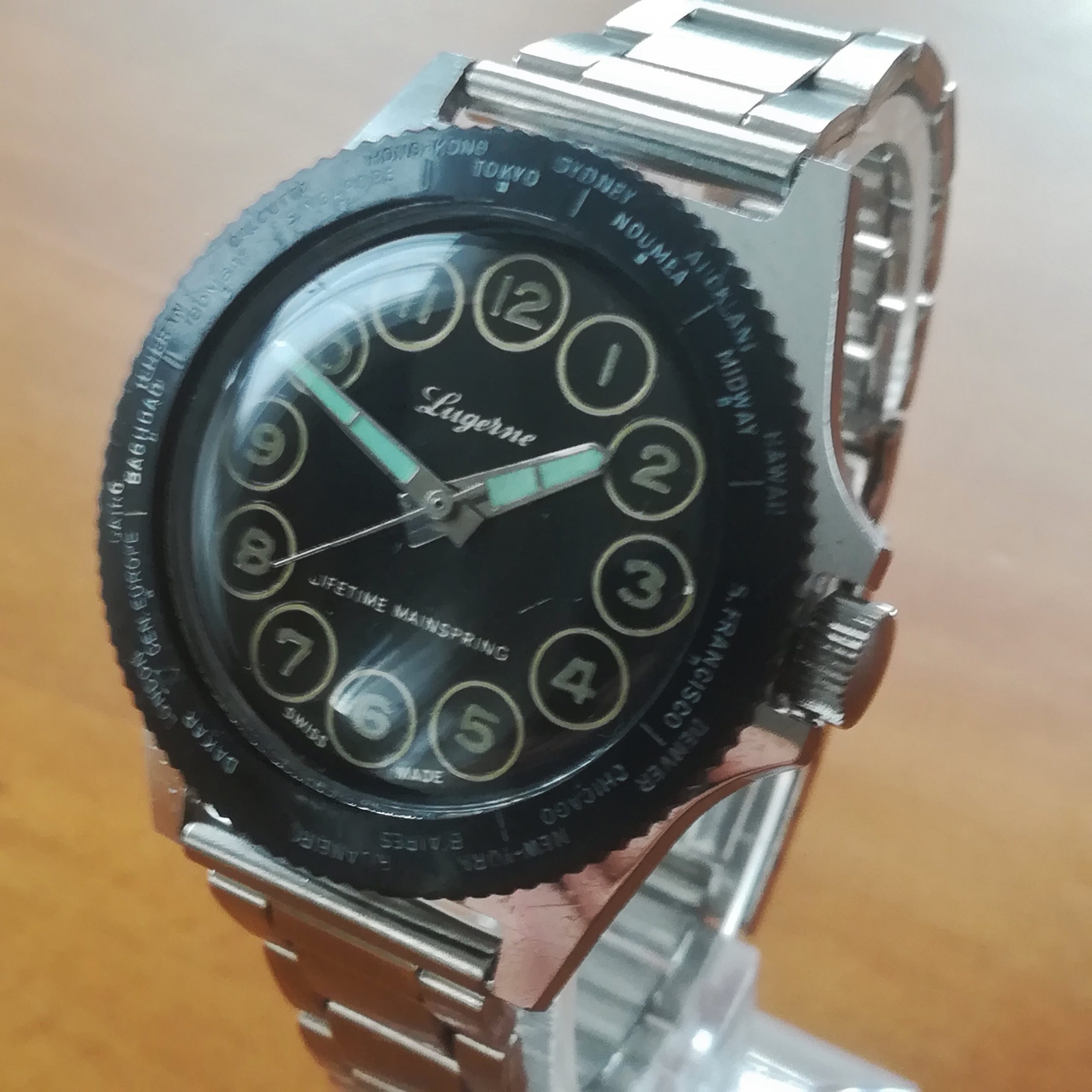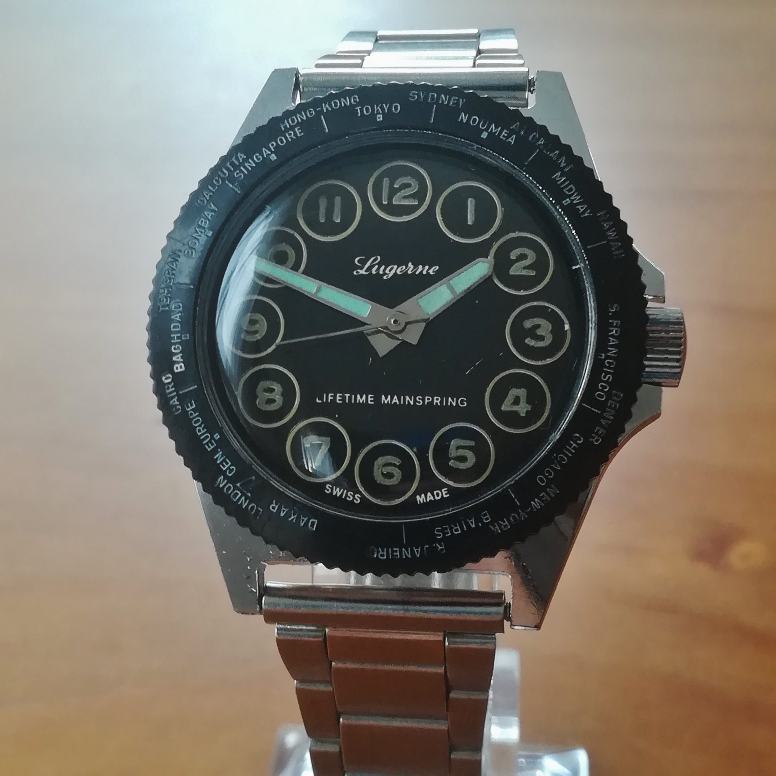LUGERNE world time vintage watch, Desa 320 movement, Swiss made in the 1970s, 36 mm across excluding the crown, hand-wound (mechanical, no battery!), working and serviced.