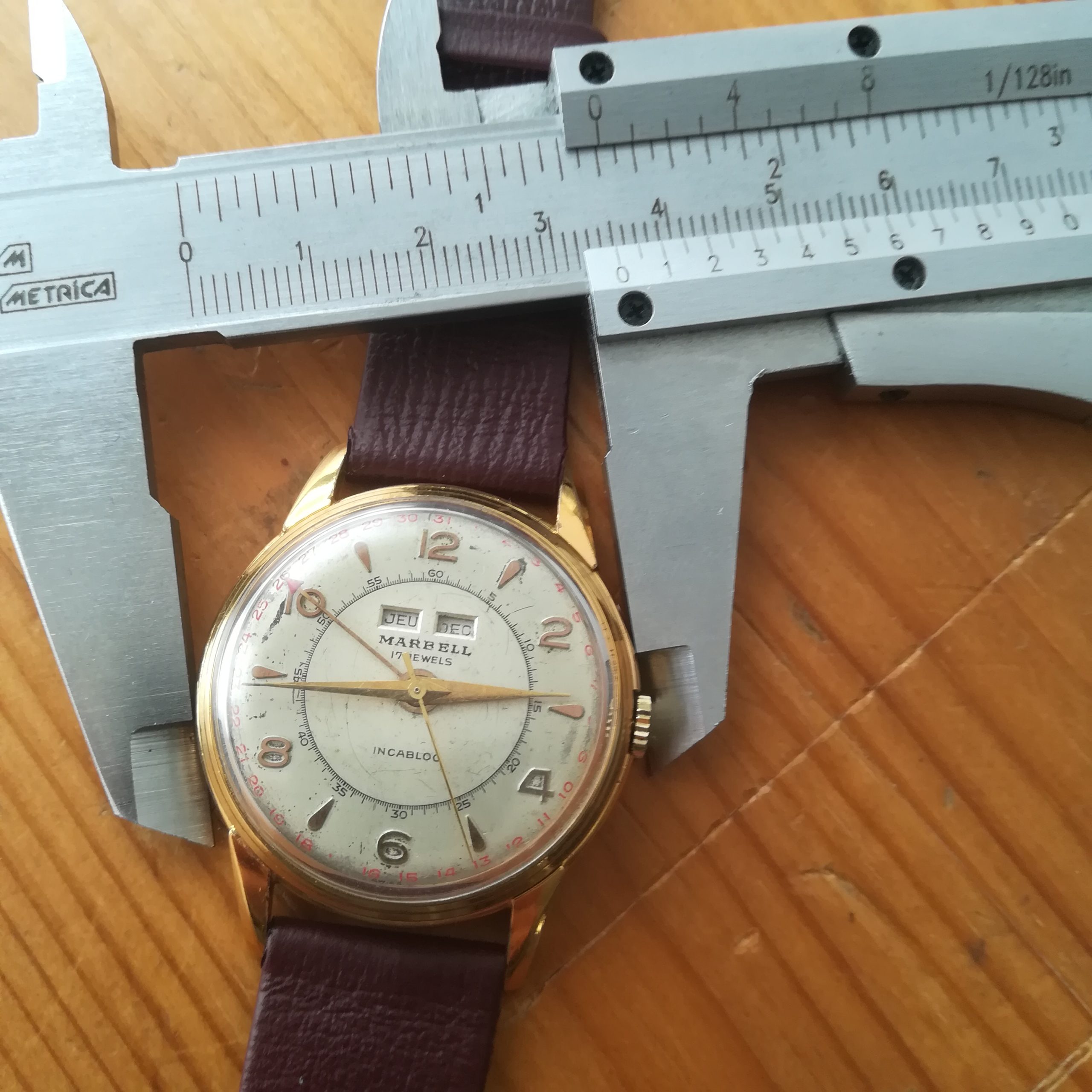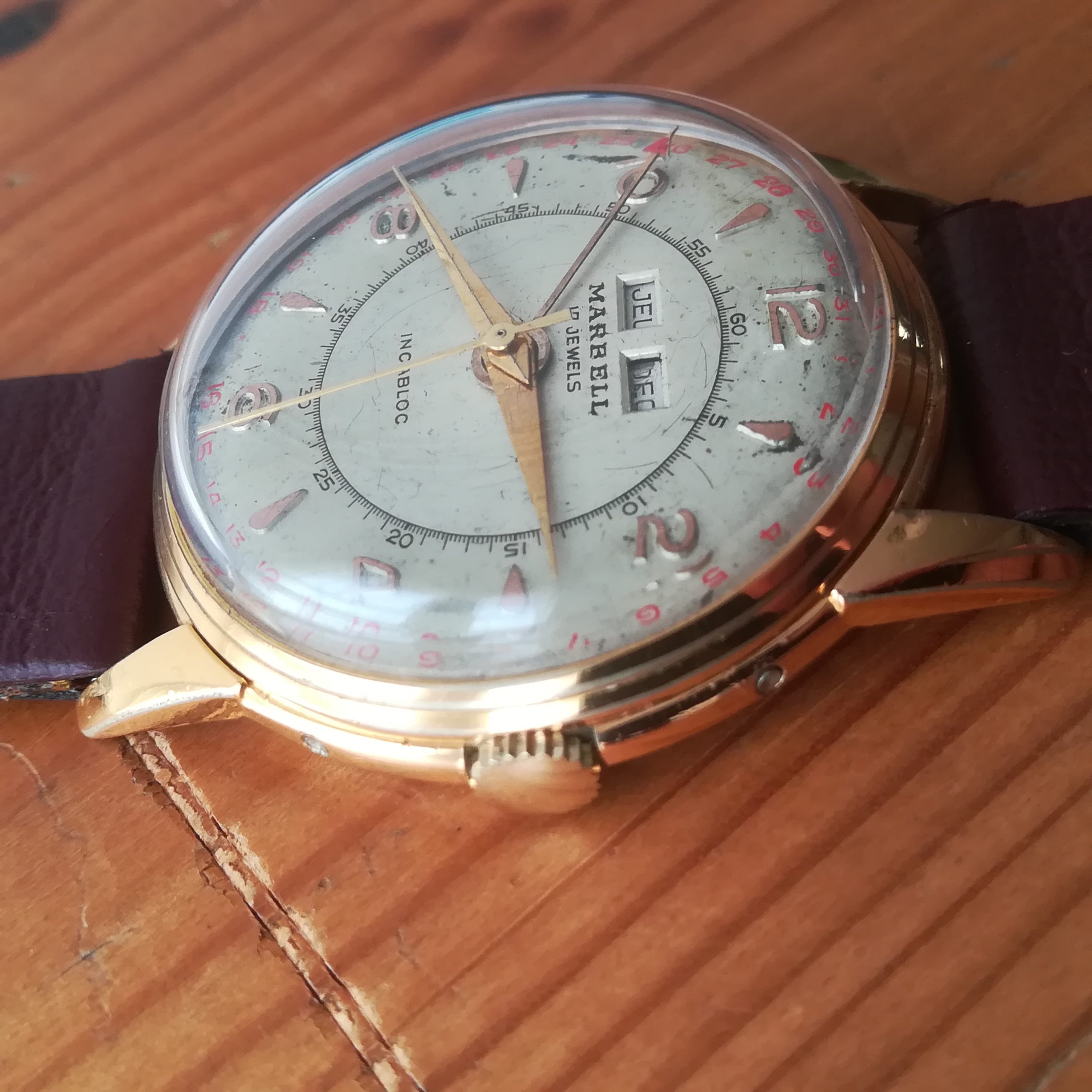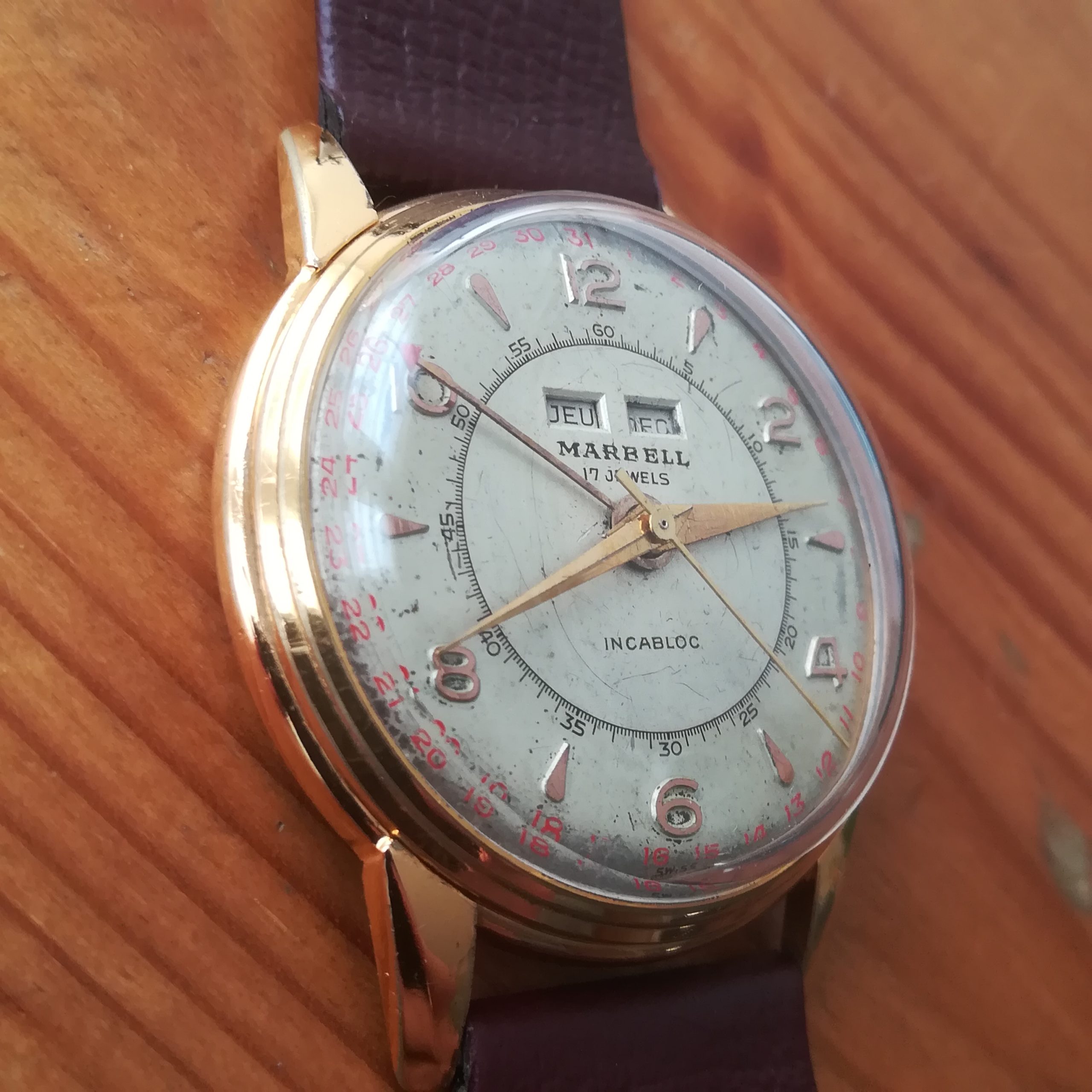 Very rare Marbell triple date vintage watch, with AS 1380 movement, Swiss made in the 50s, 35.5 mm across excluding the crown, hand-wound (mechanical, no battery!), working fine and serviced.