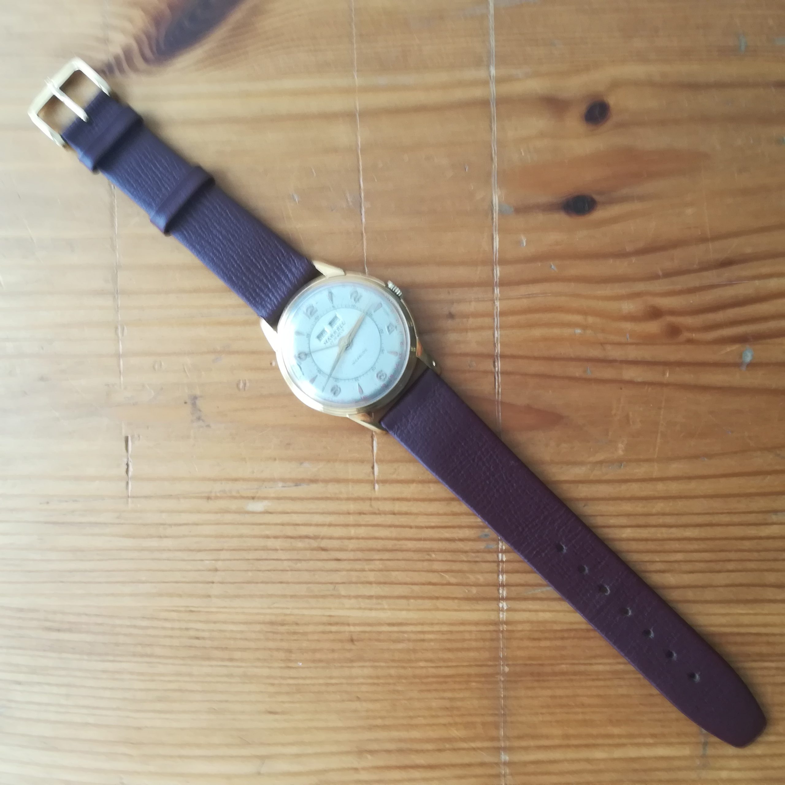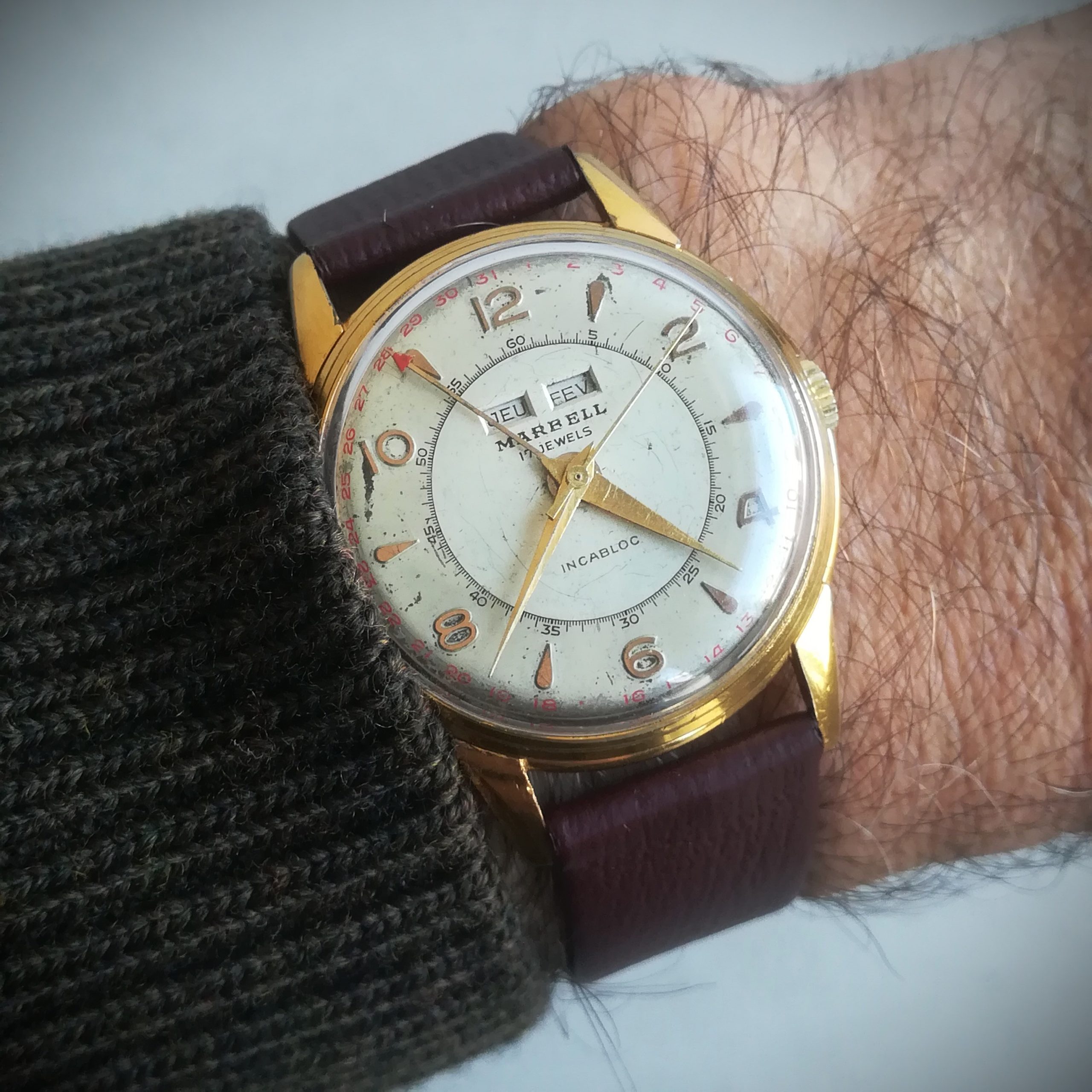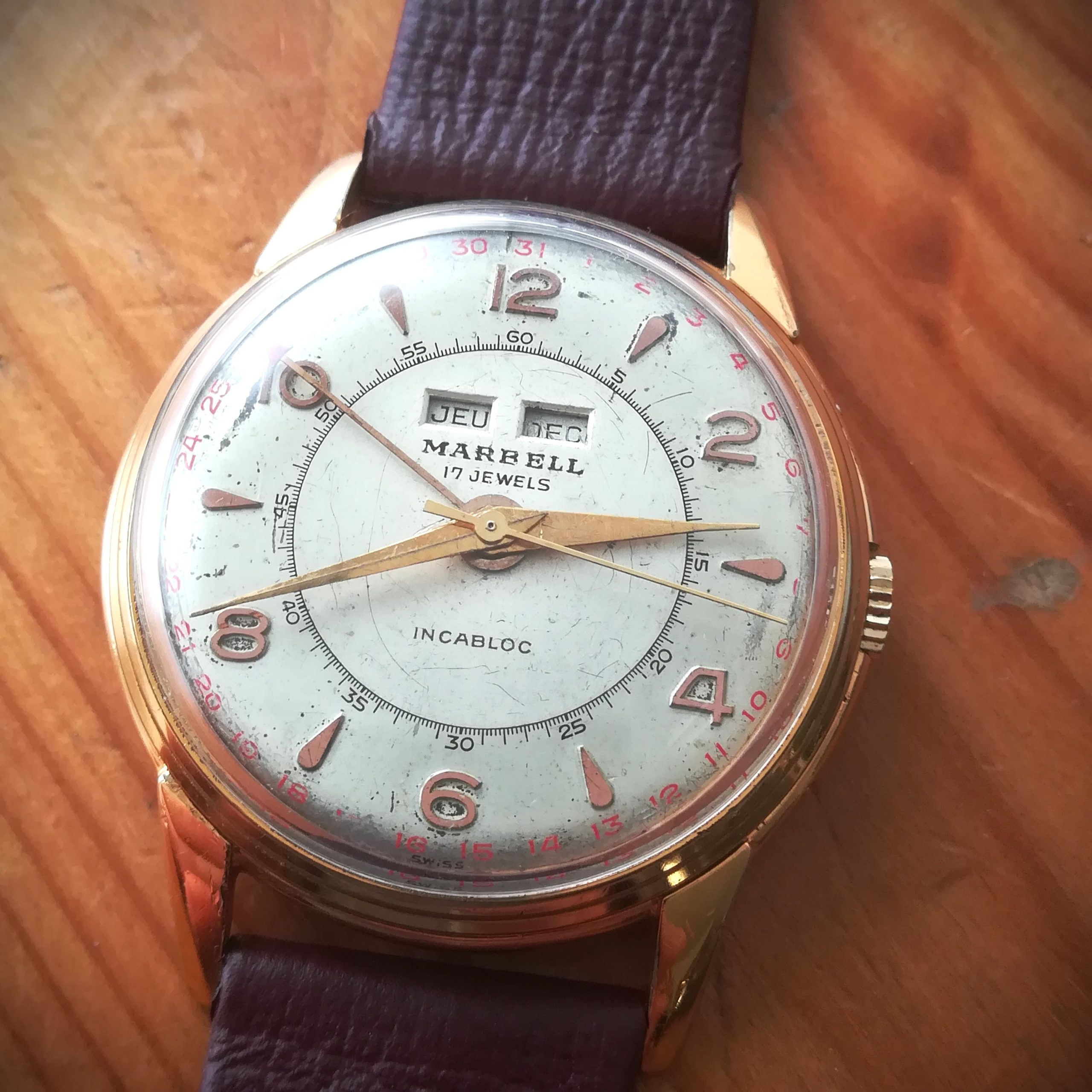 Very rare Marbell triple date vintage watch, with AS 1380 movement, Swiss made in the 50s, 35.5 mm across excluding the crown, hand-wound (mechanical, no battery!), working fine and serviced.