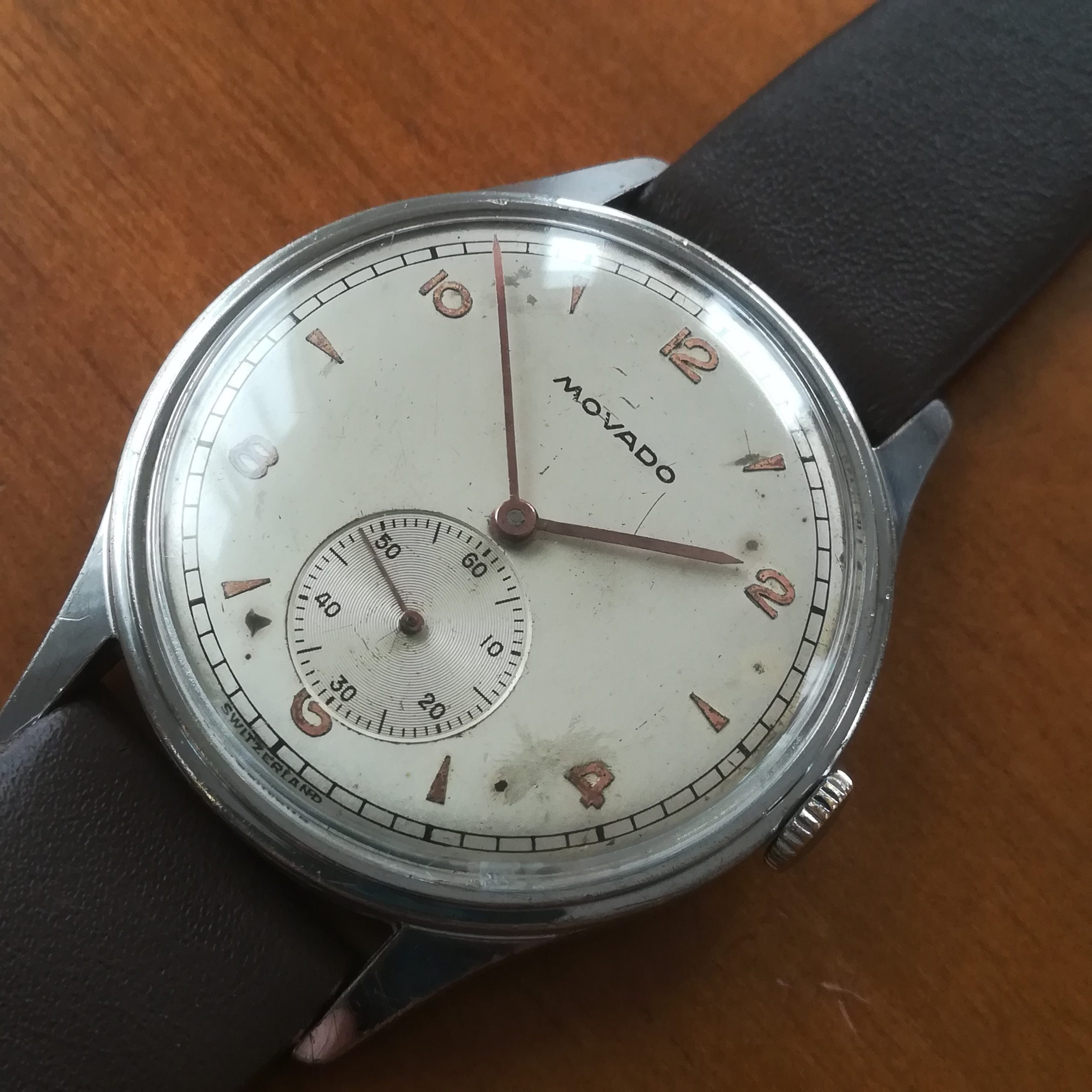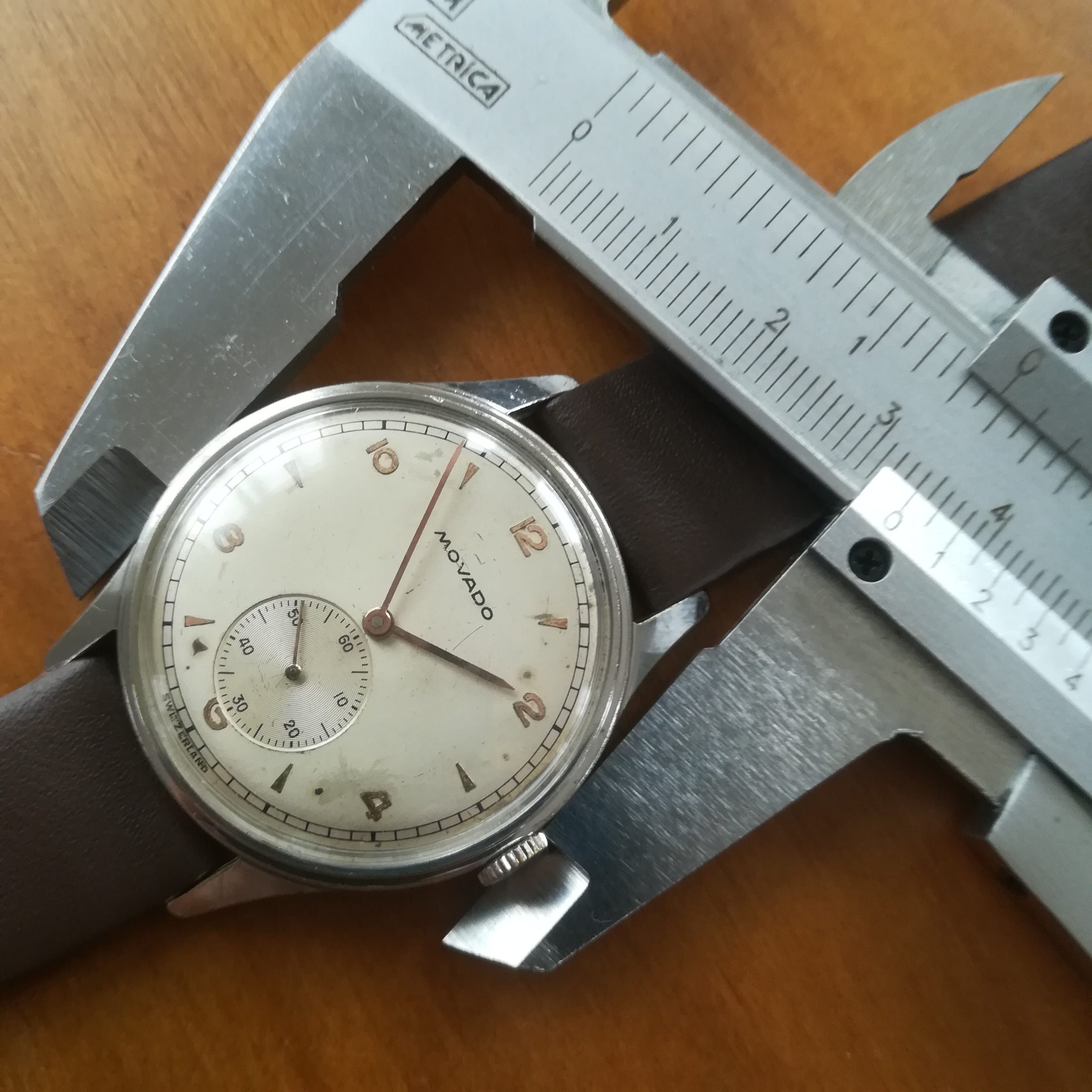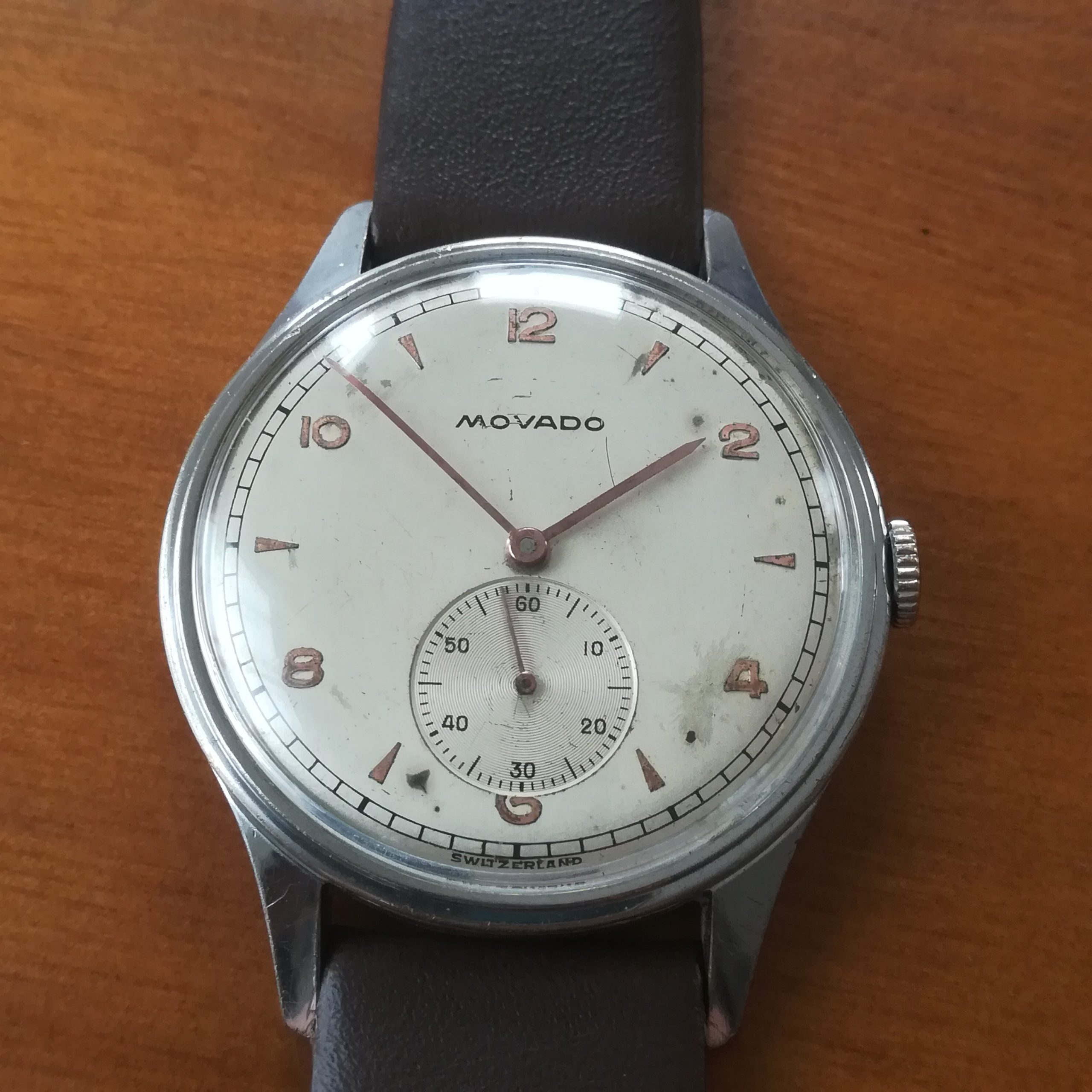 Very rare MOVADO vintage watch, with in-house 75 movement, Swiss made in the 45s, 34.2 mm across excluding the crown, hand-wound (mechanical, no battery!), working fine and fully serviced.
