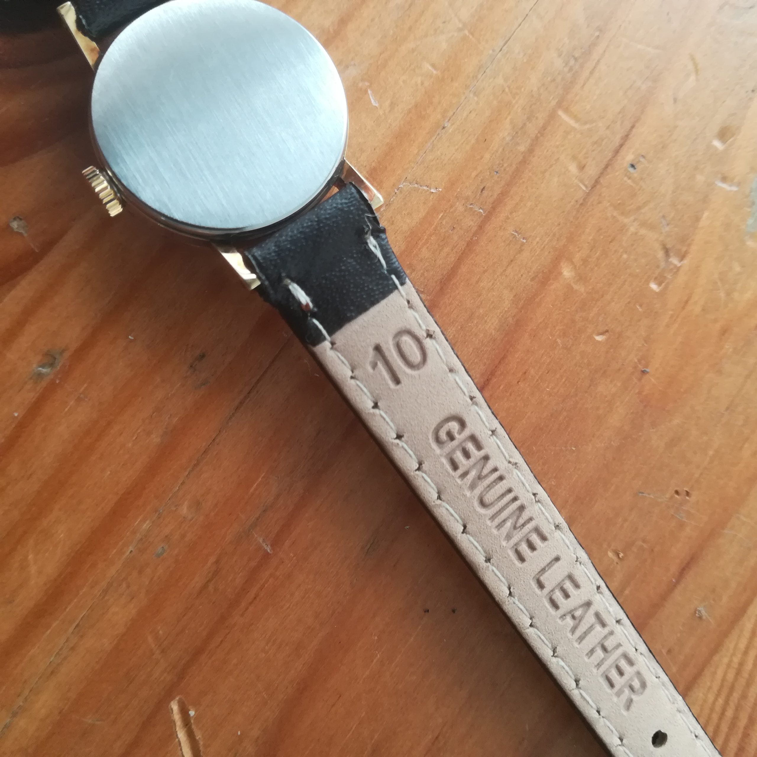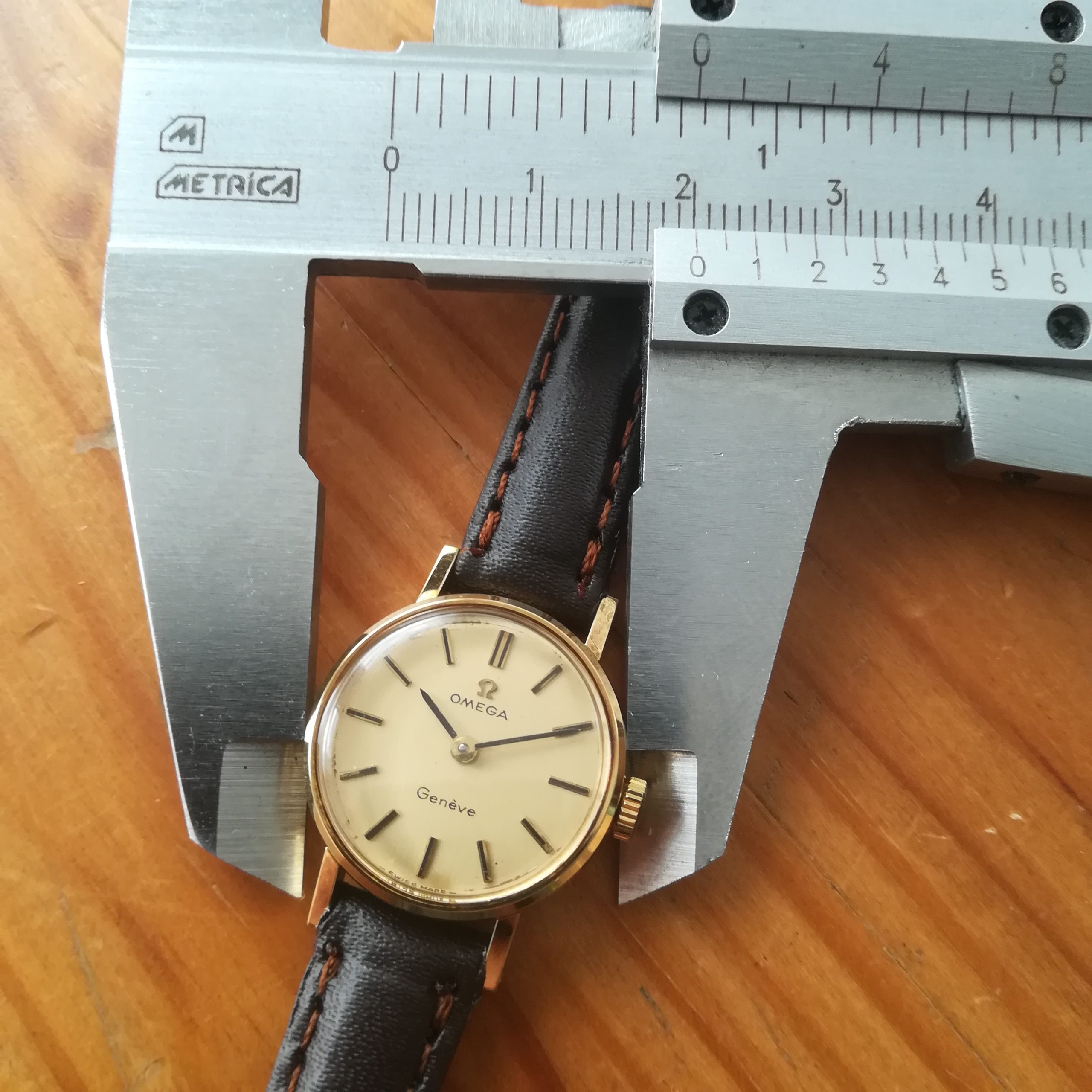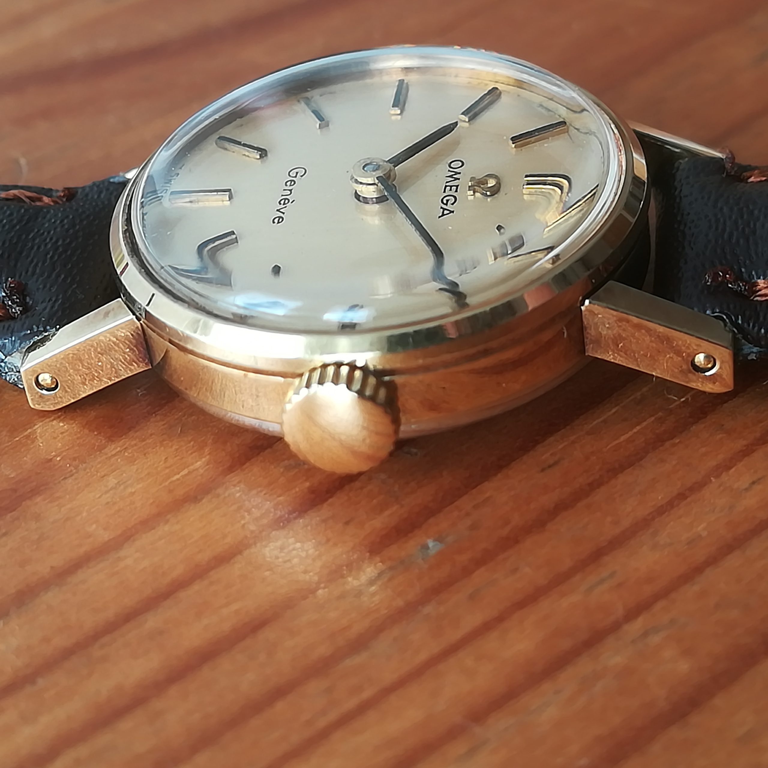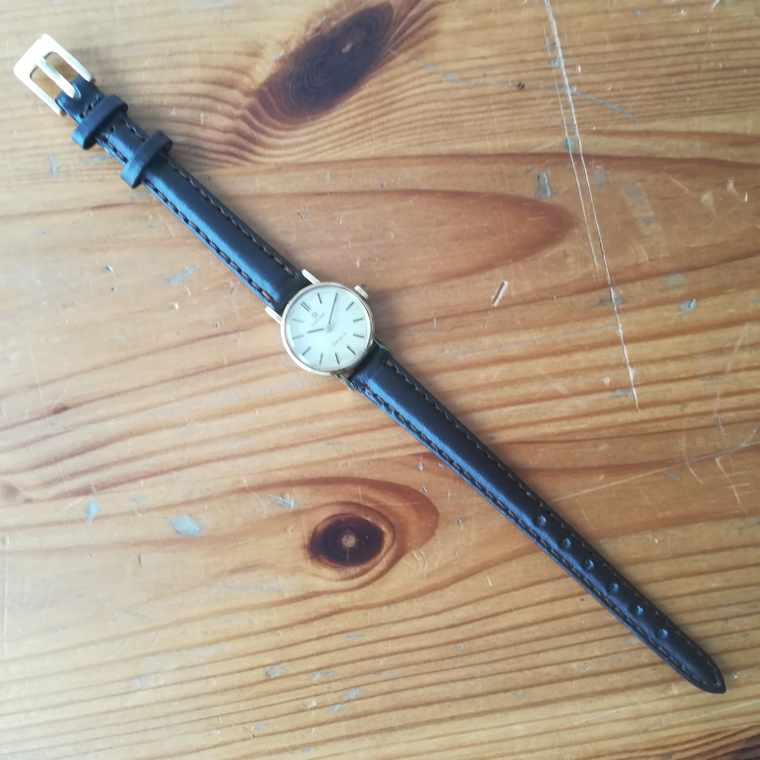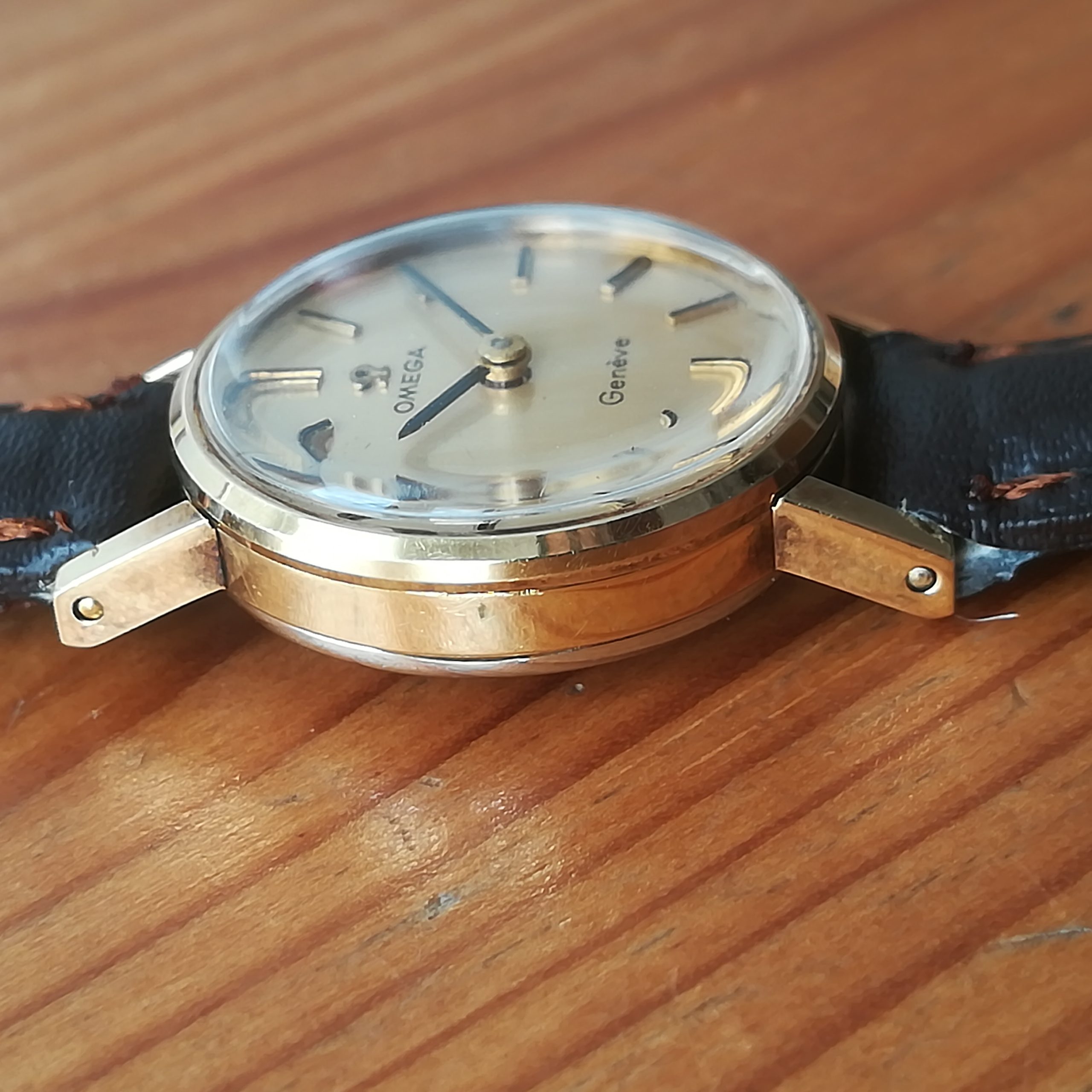 Gold-plated case, original Omega-signed glass and new brown leather strap. It will fit wrists of up to 18 cm. Lug width is 10 mm. Water resistance has not been tested, therefore it must be treated as NON-waterproof.