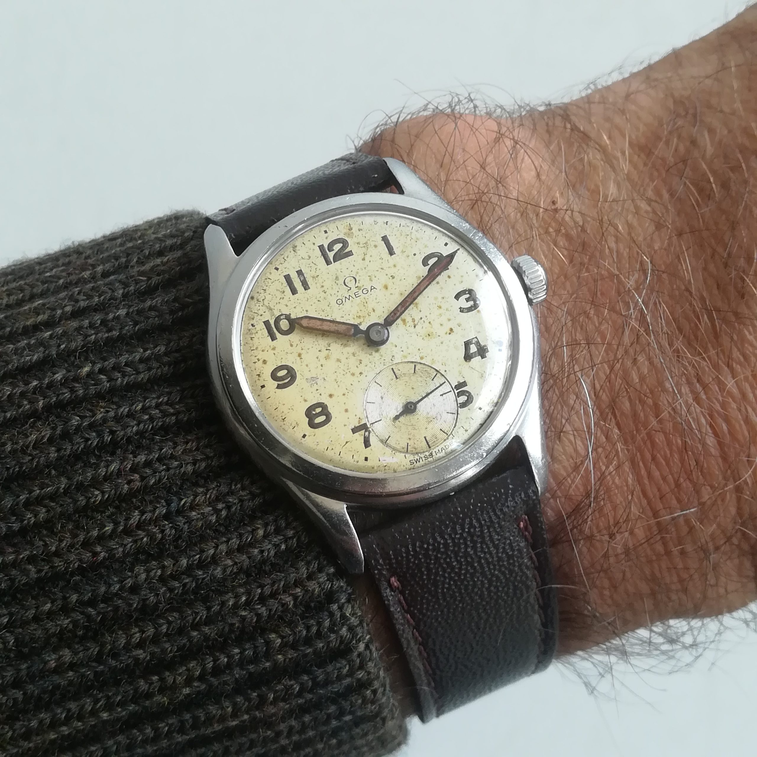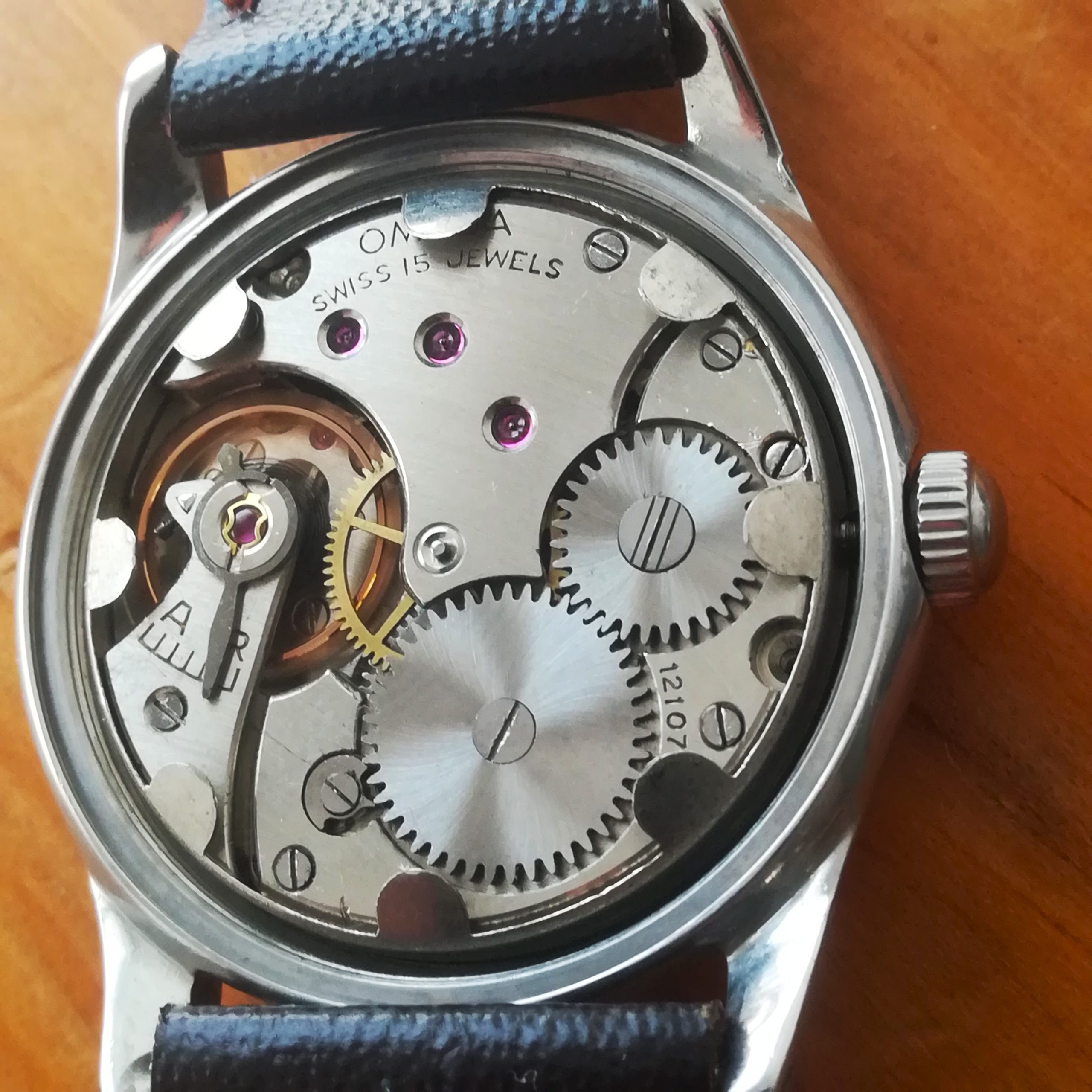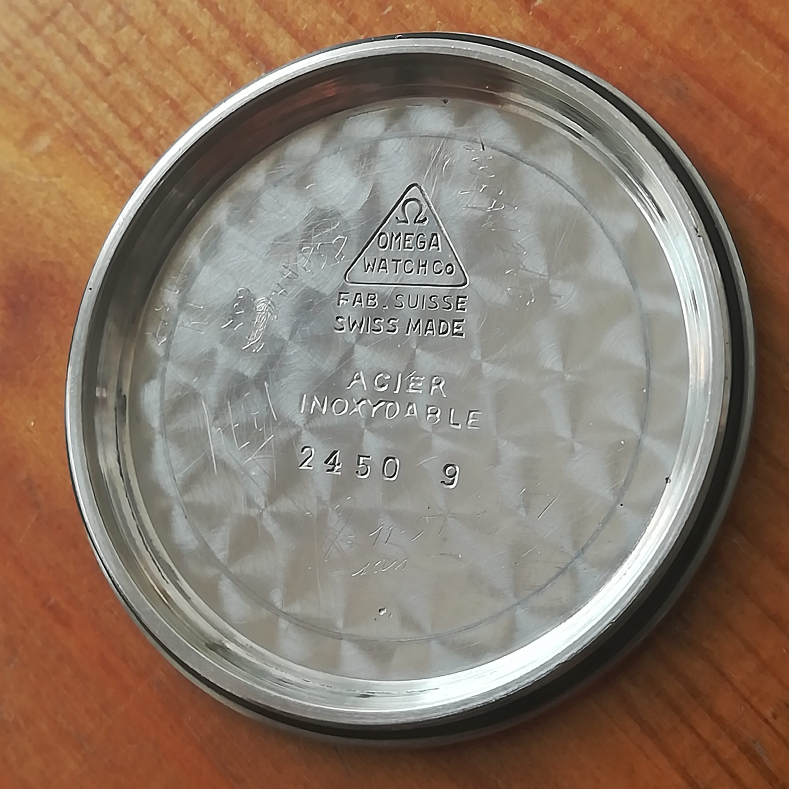 OMEGA vintage watch, Swiss Made with in-house 26.5 T3 PC T1 movement, 32.5 mm across excluding the crown, hand-wound (mechanical, no battery!), working fine and serviced. Its serial number dates it to 1950. Ref. 2450 9.