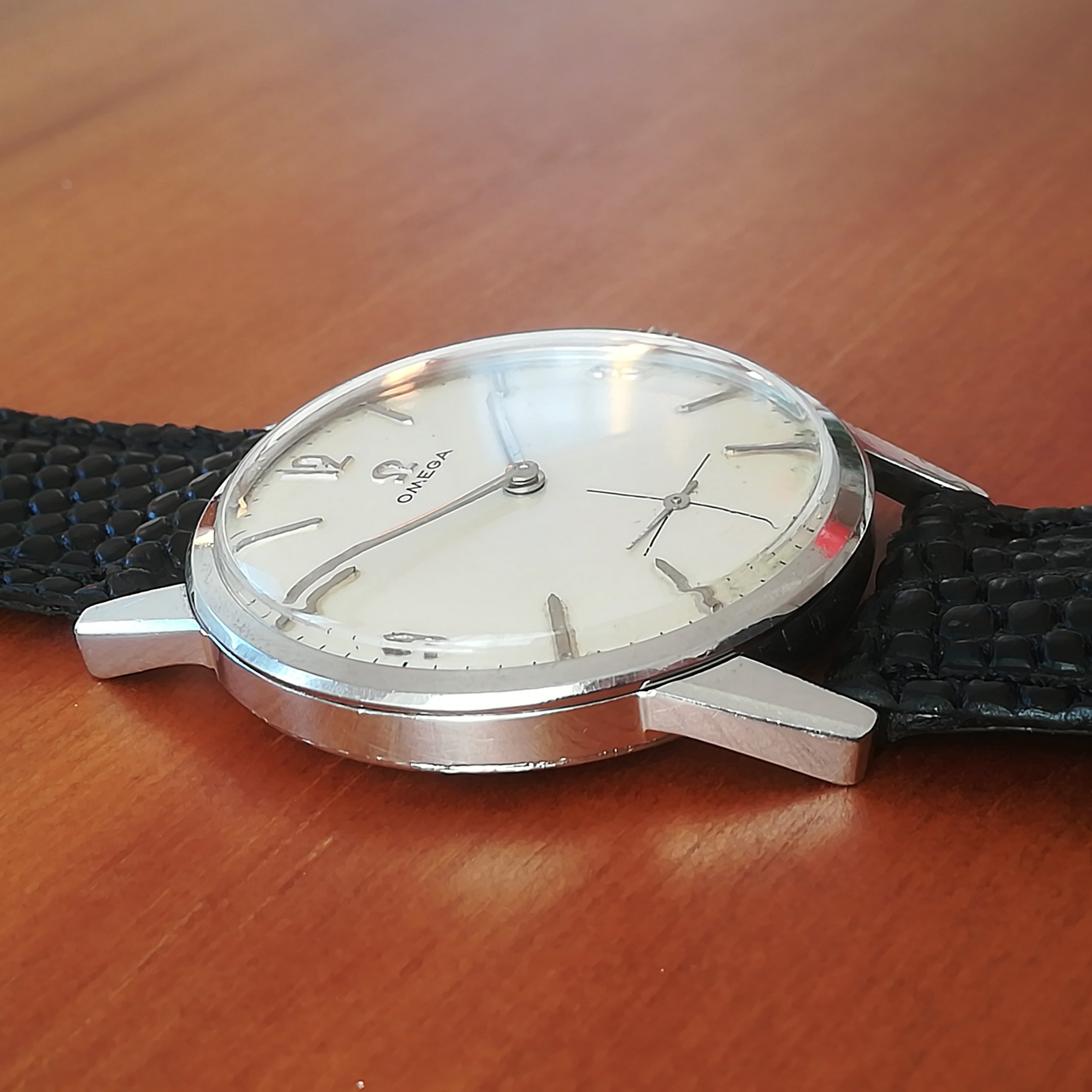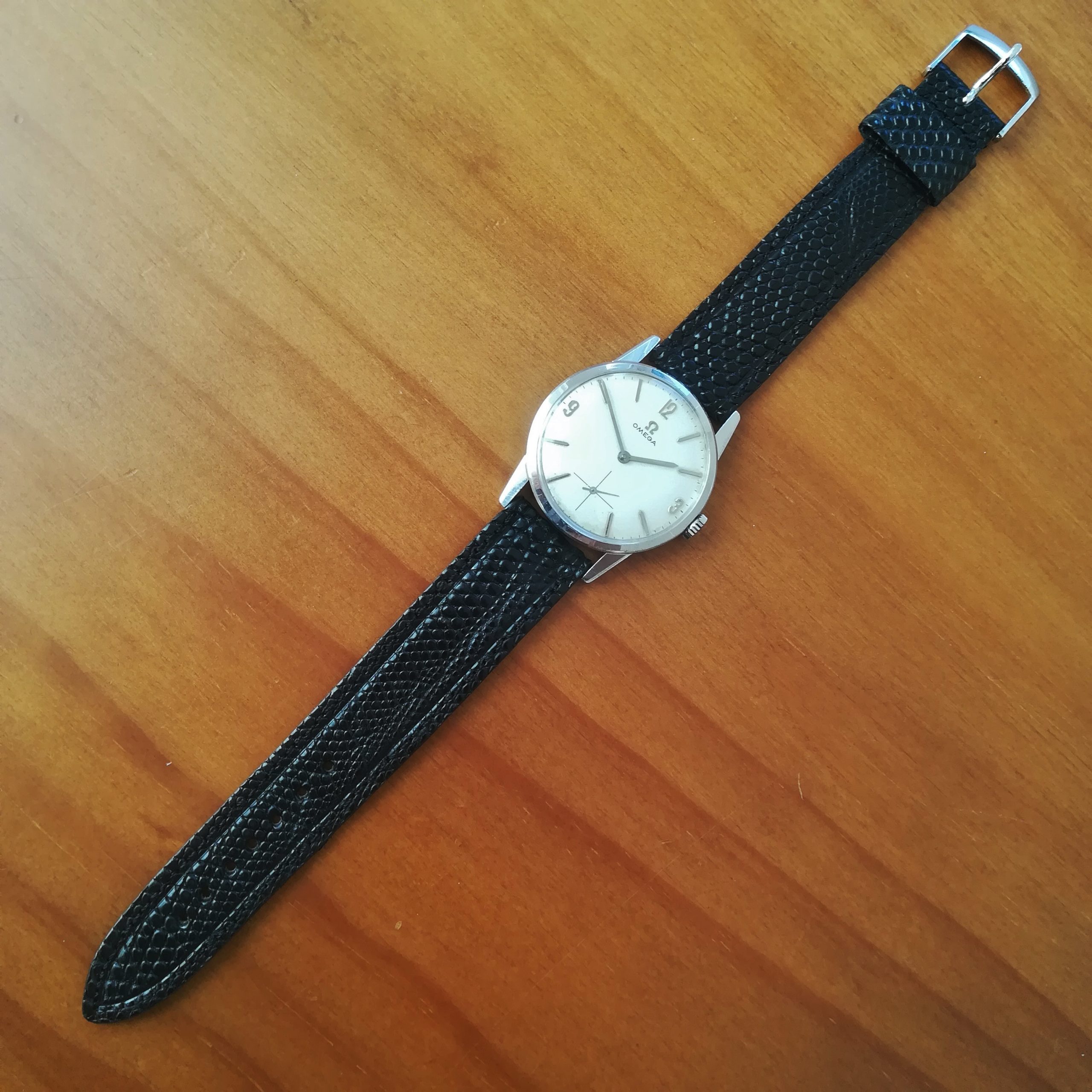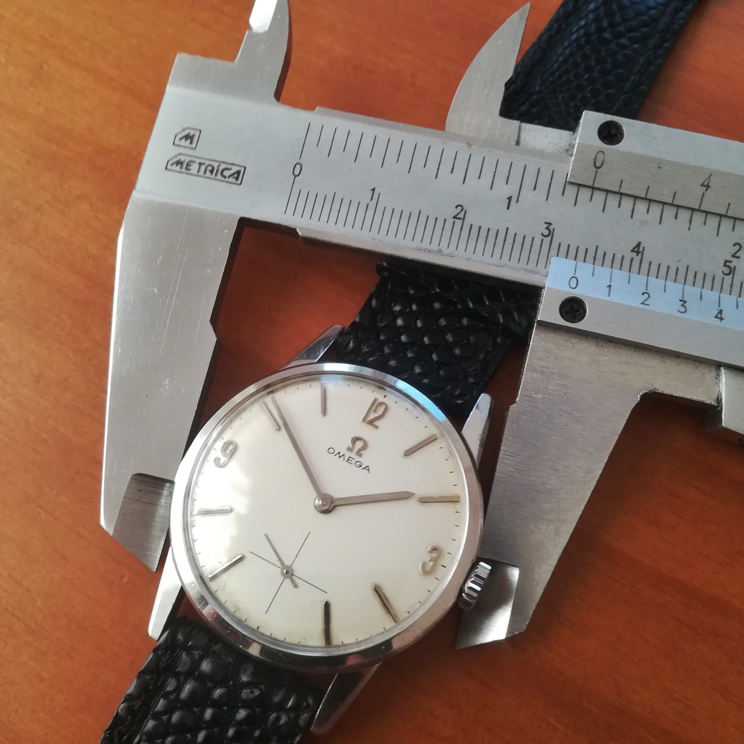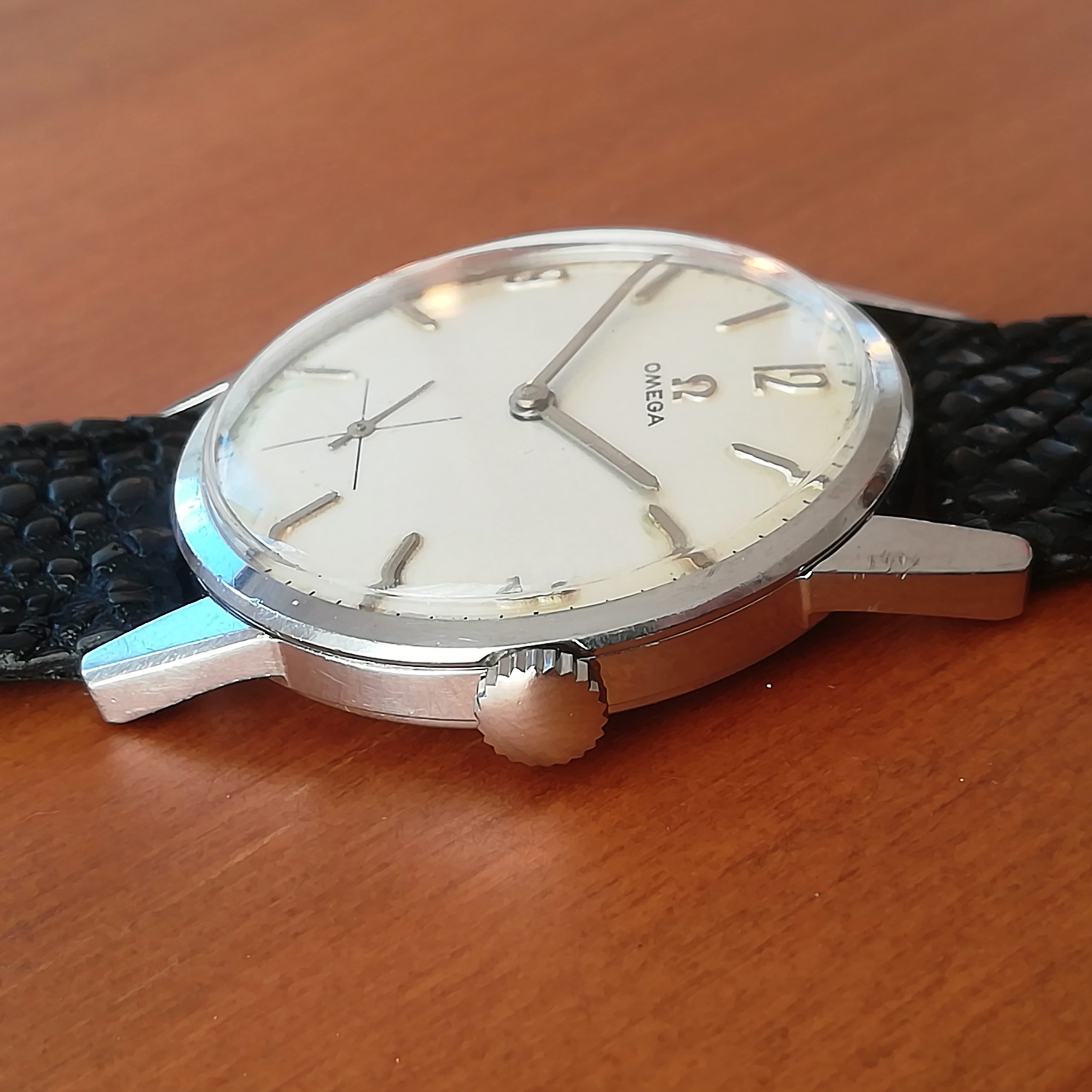 OMEGA vintage watch, Swiss Made with in-house 269 movement, 33.5 mm across excluding the crown, hand-wound (mechanical, no battery!), working fine and serviced. Its serial number dates it to 1963. Ref. 121.001-63.