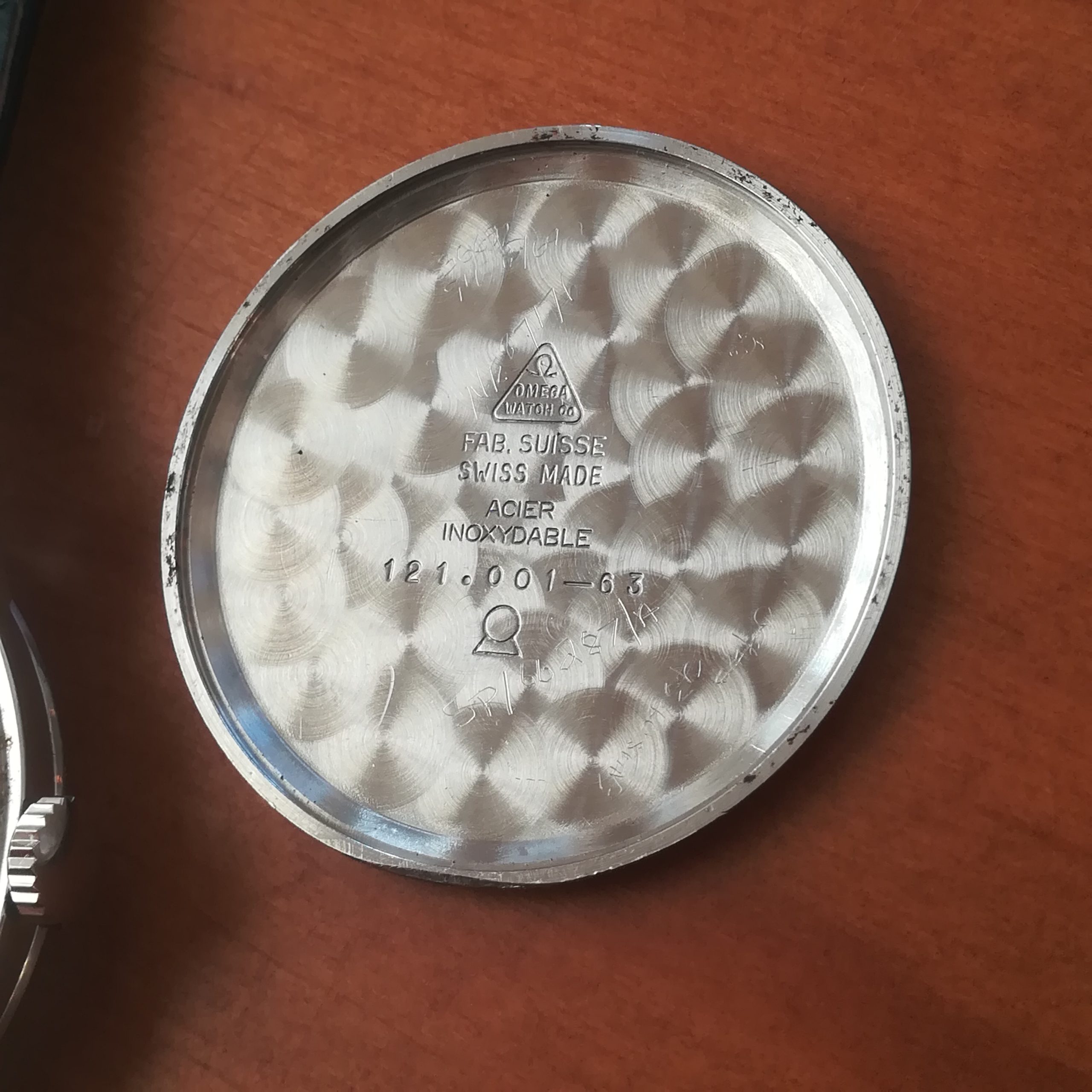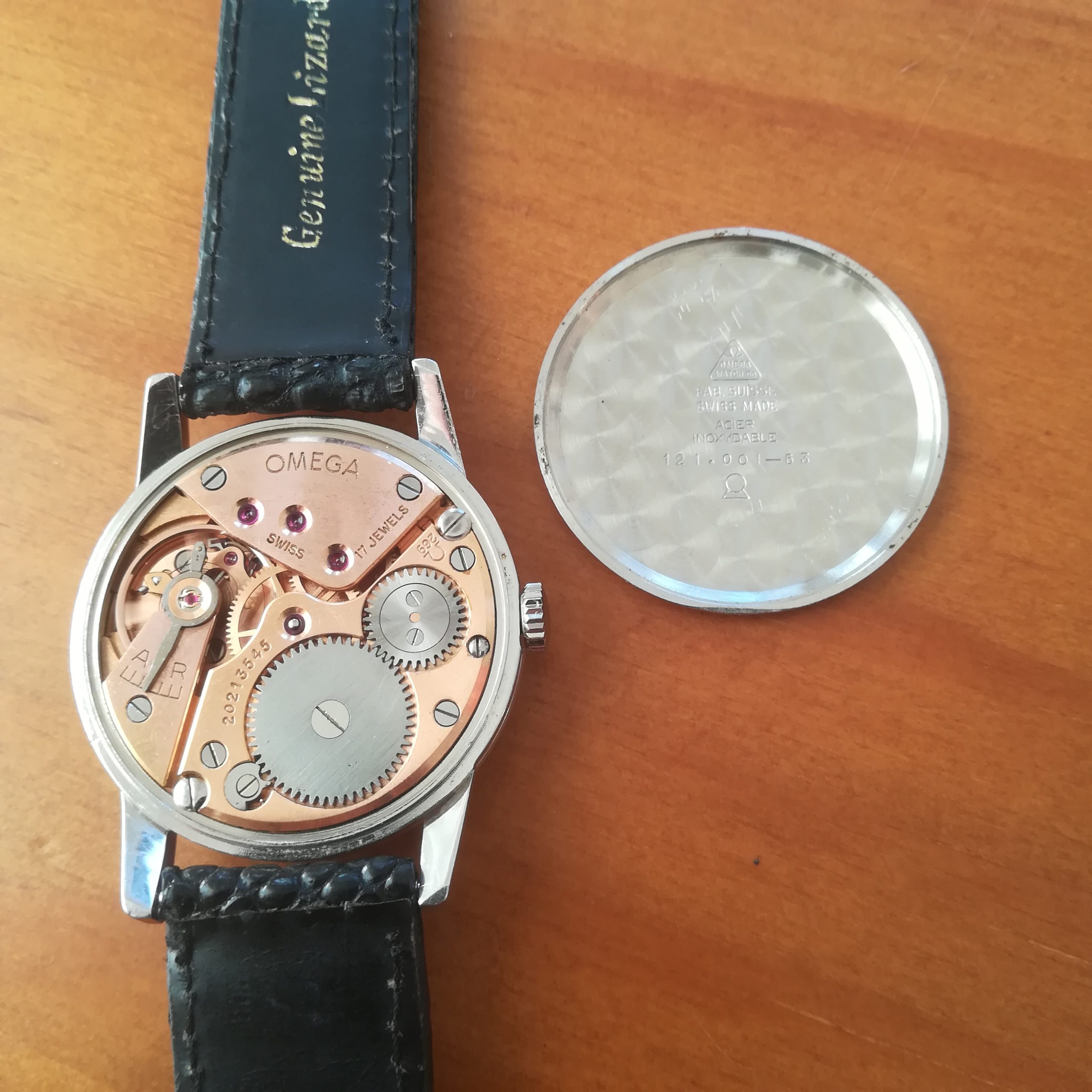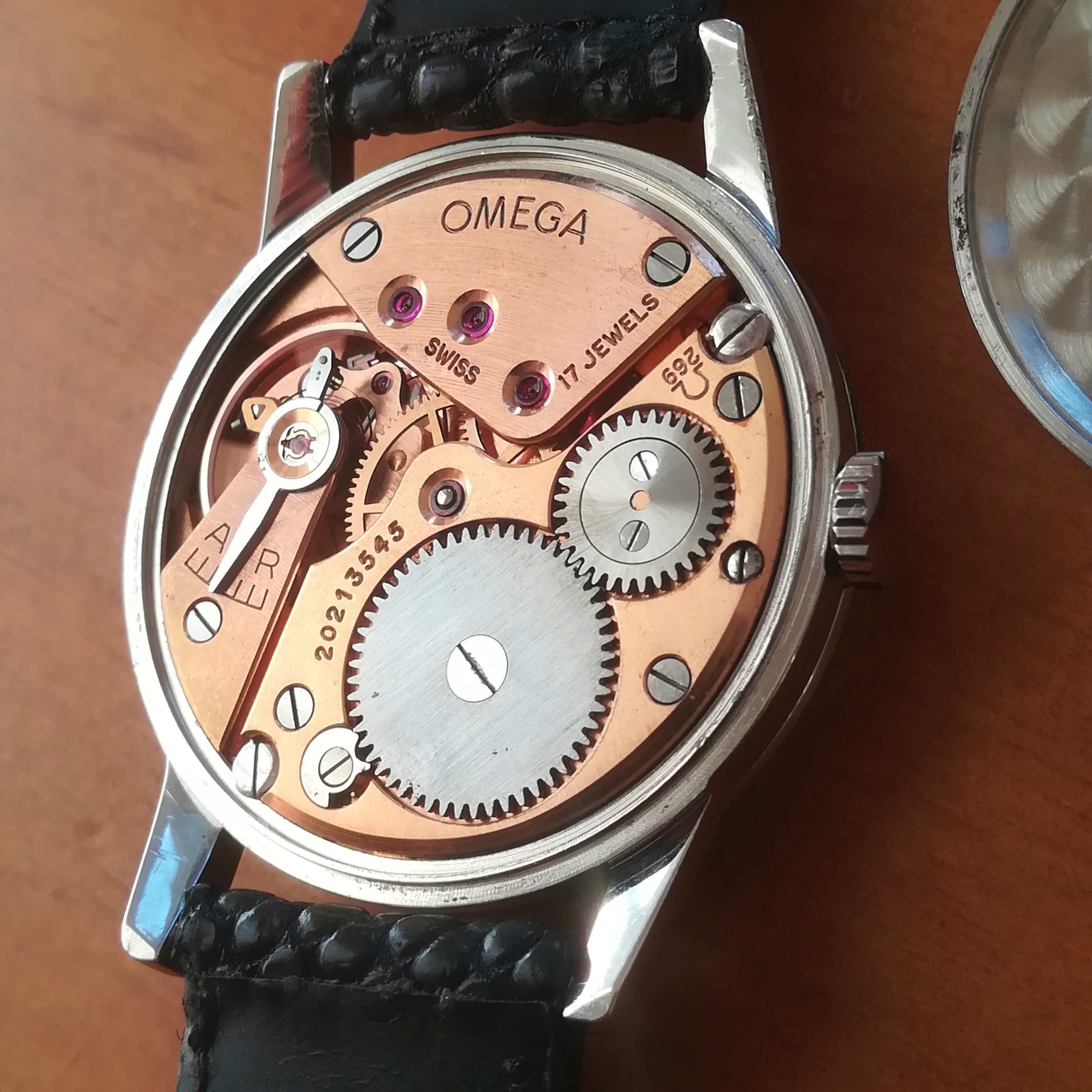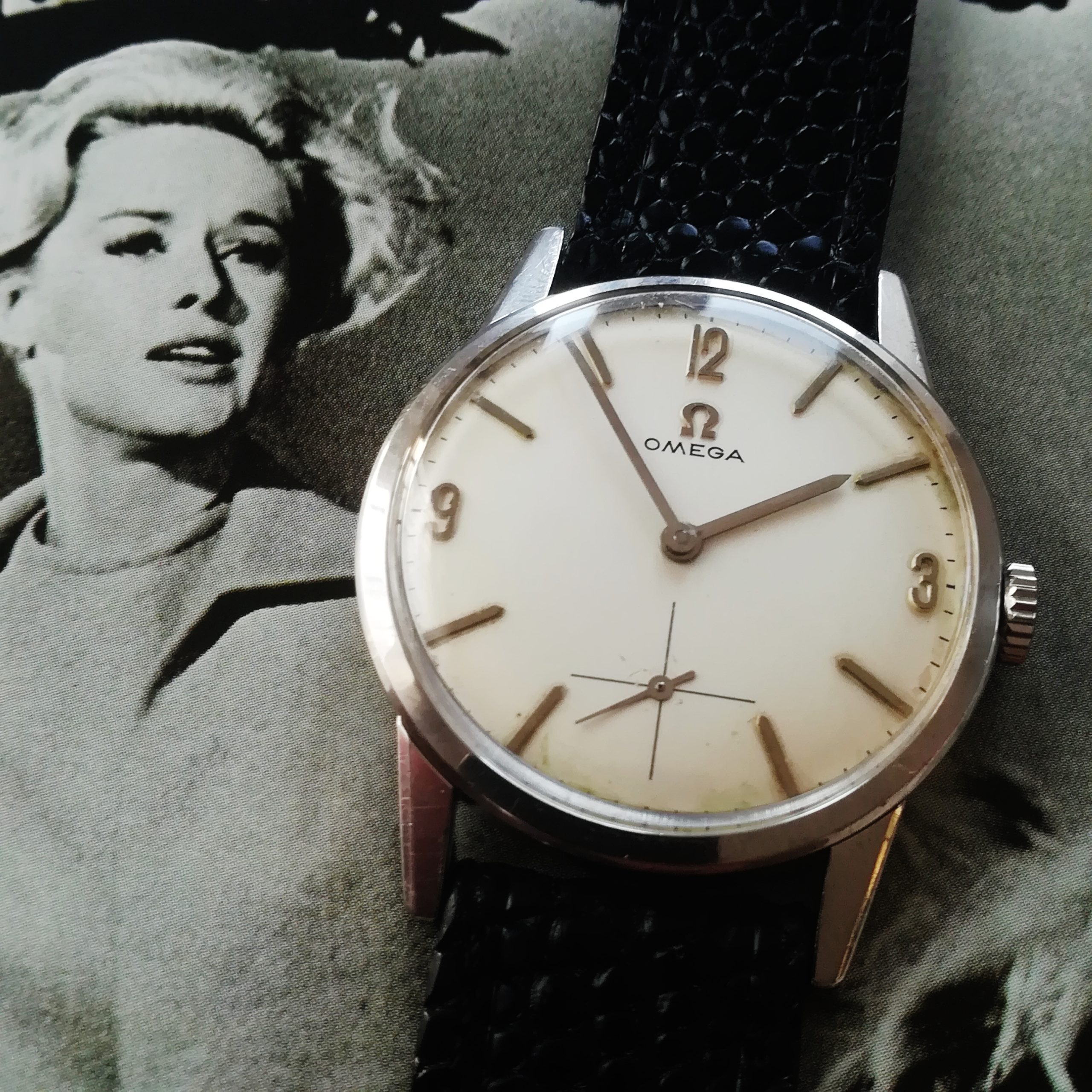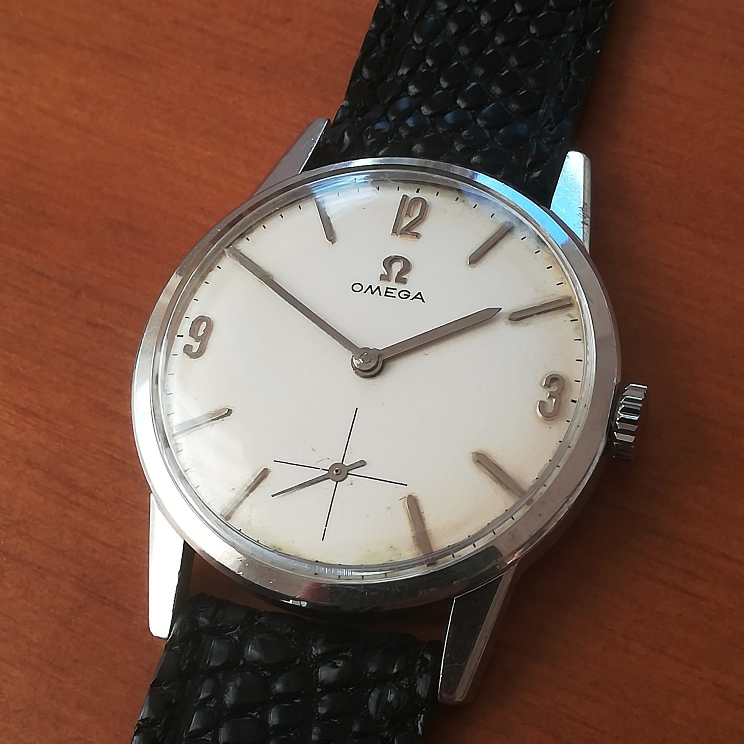 OMEGA vintage watch, Swiss Made with in-house 269 movement, 33.5 mm across excluding the crown, hand-wound (mechanical, no battery!), working fine and serviced. Its serial number dates it to 1963. Ref. 121.001-63.