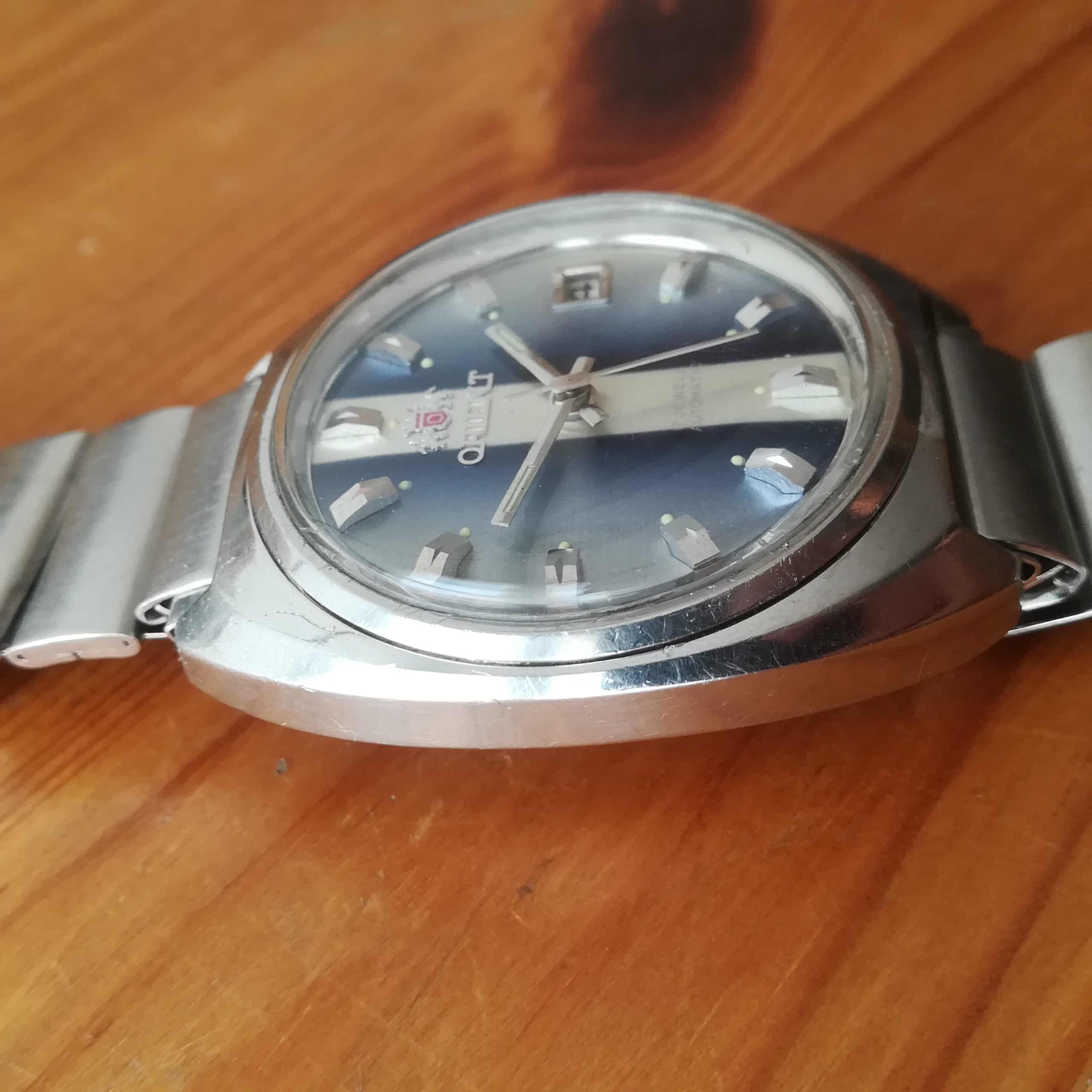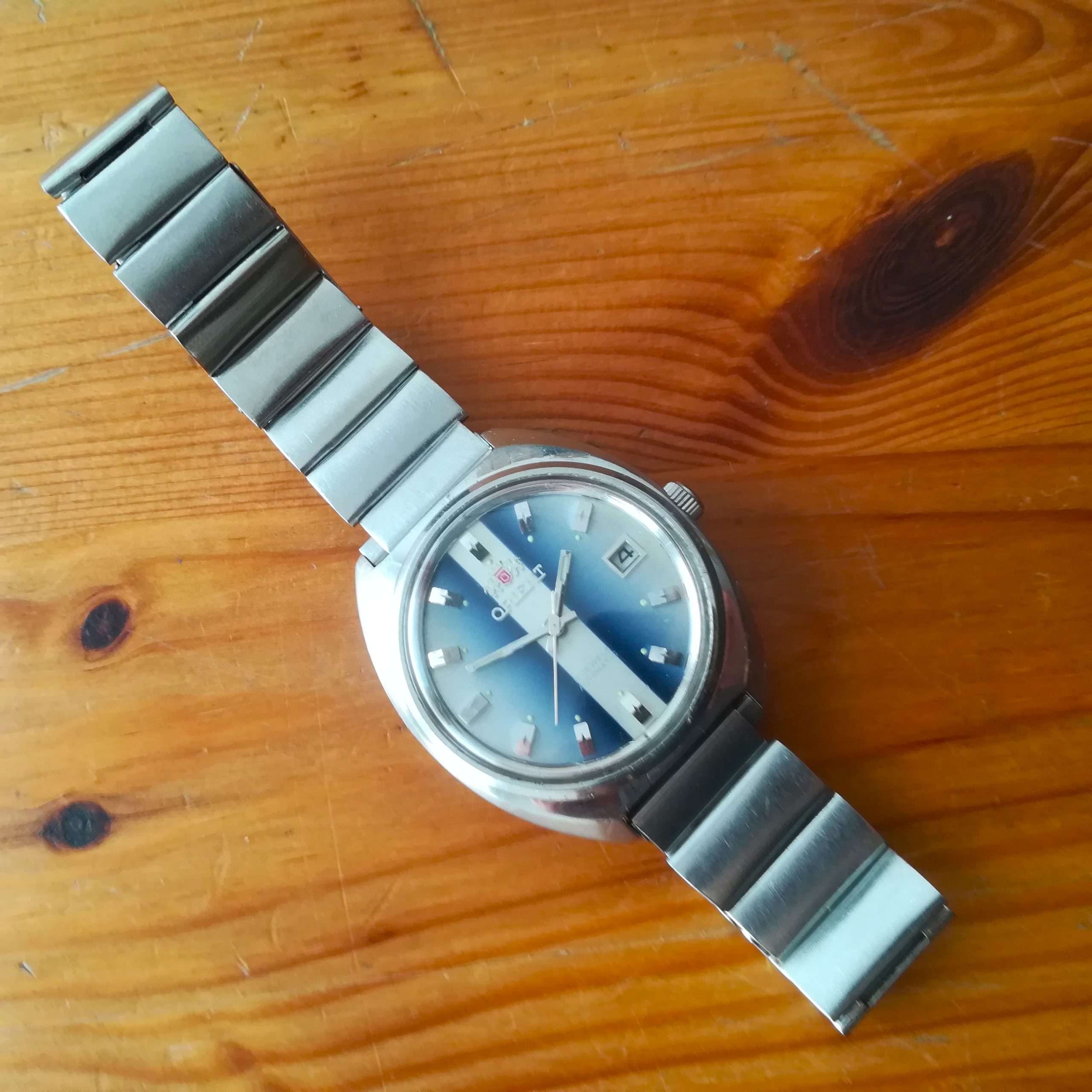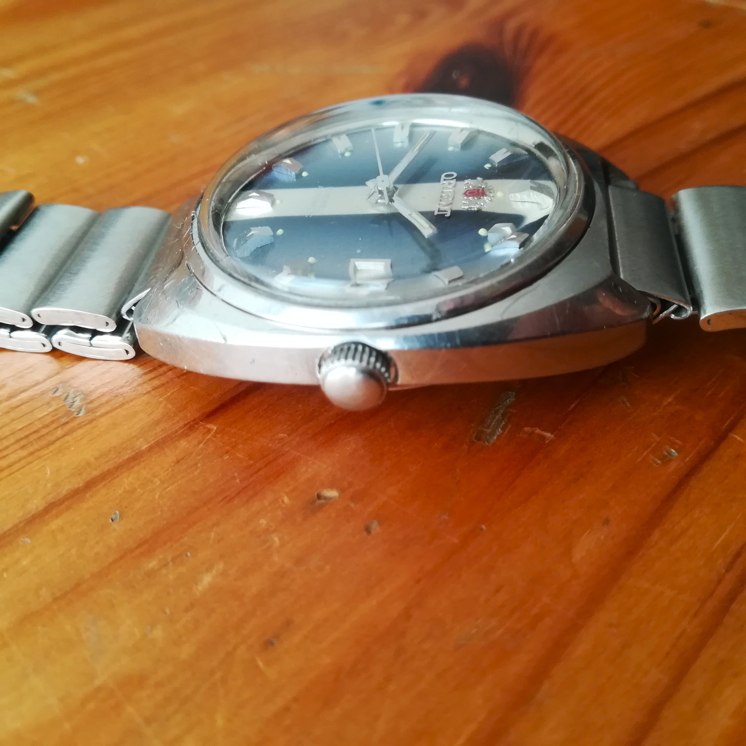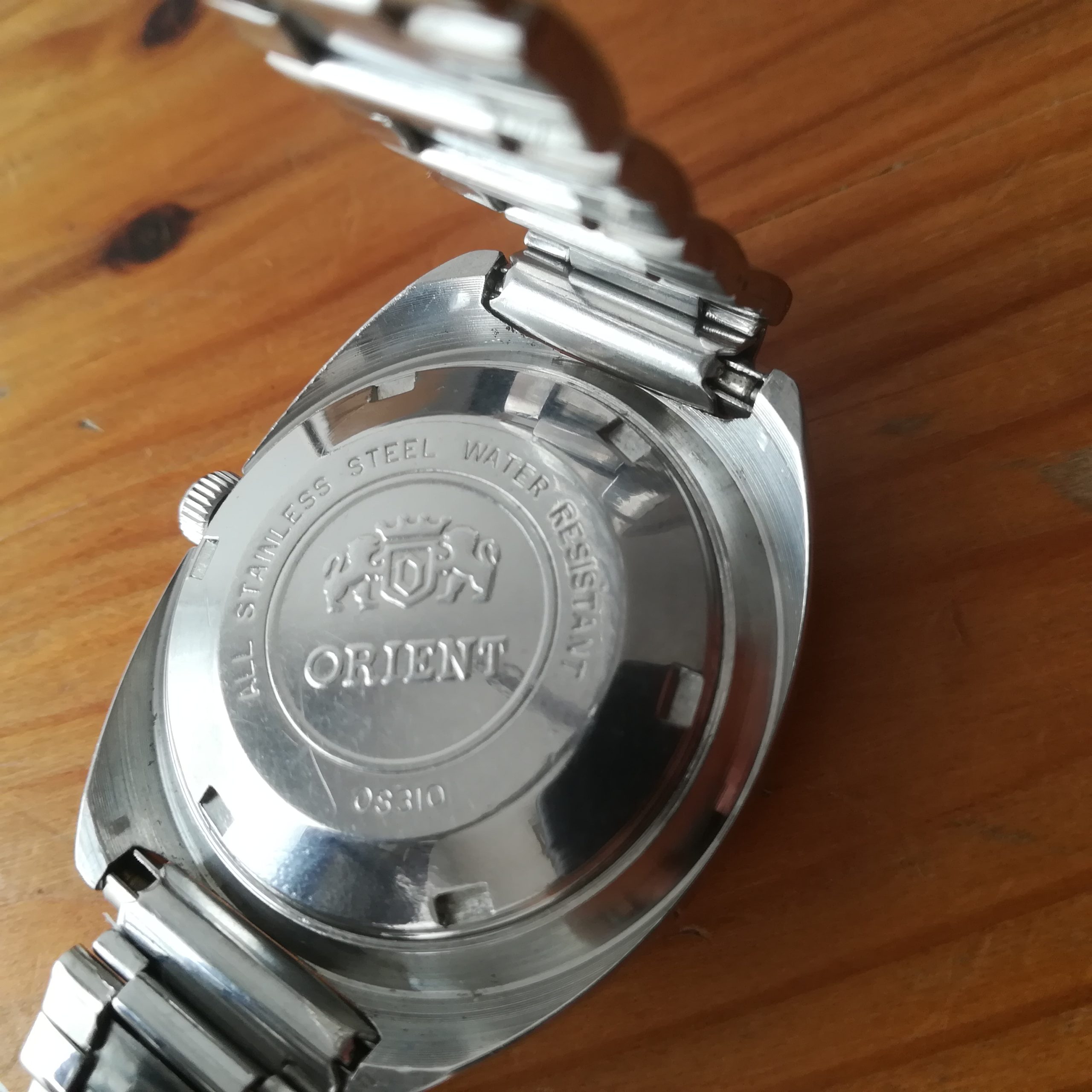 ORIENT vintage automatic watch, ref. OS310, with in-house 16720 movement, Japan made in the 1970s, case of 37 mm excluding the crown, automatic (self-winding with the user’s movements) and hand-wound (mechanical, no battery!) with date indication, working fine and serviced.