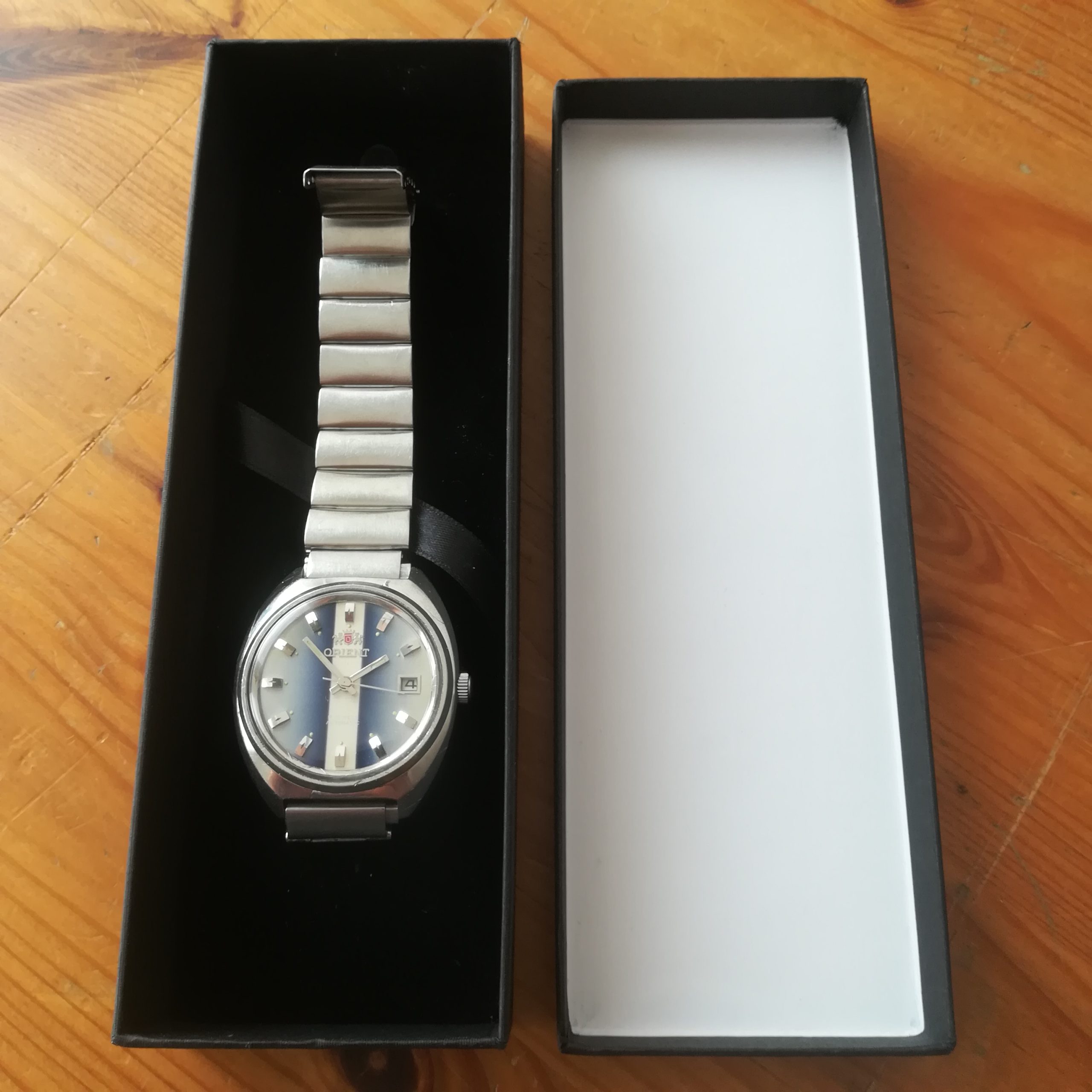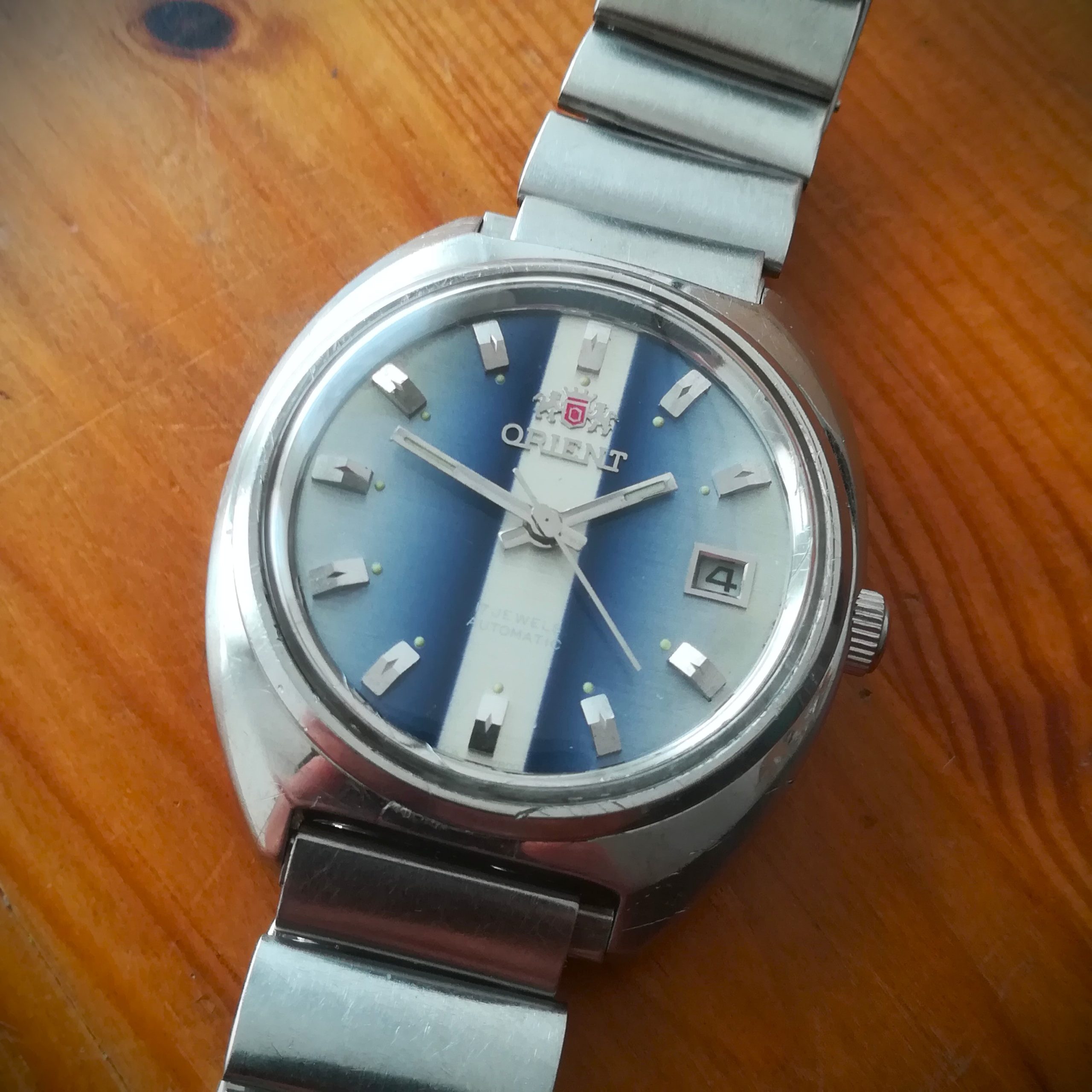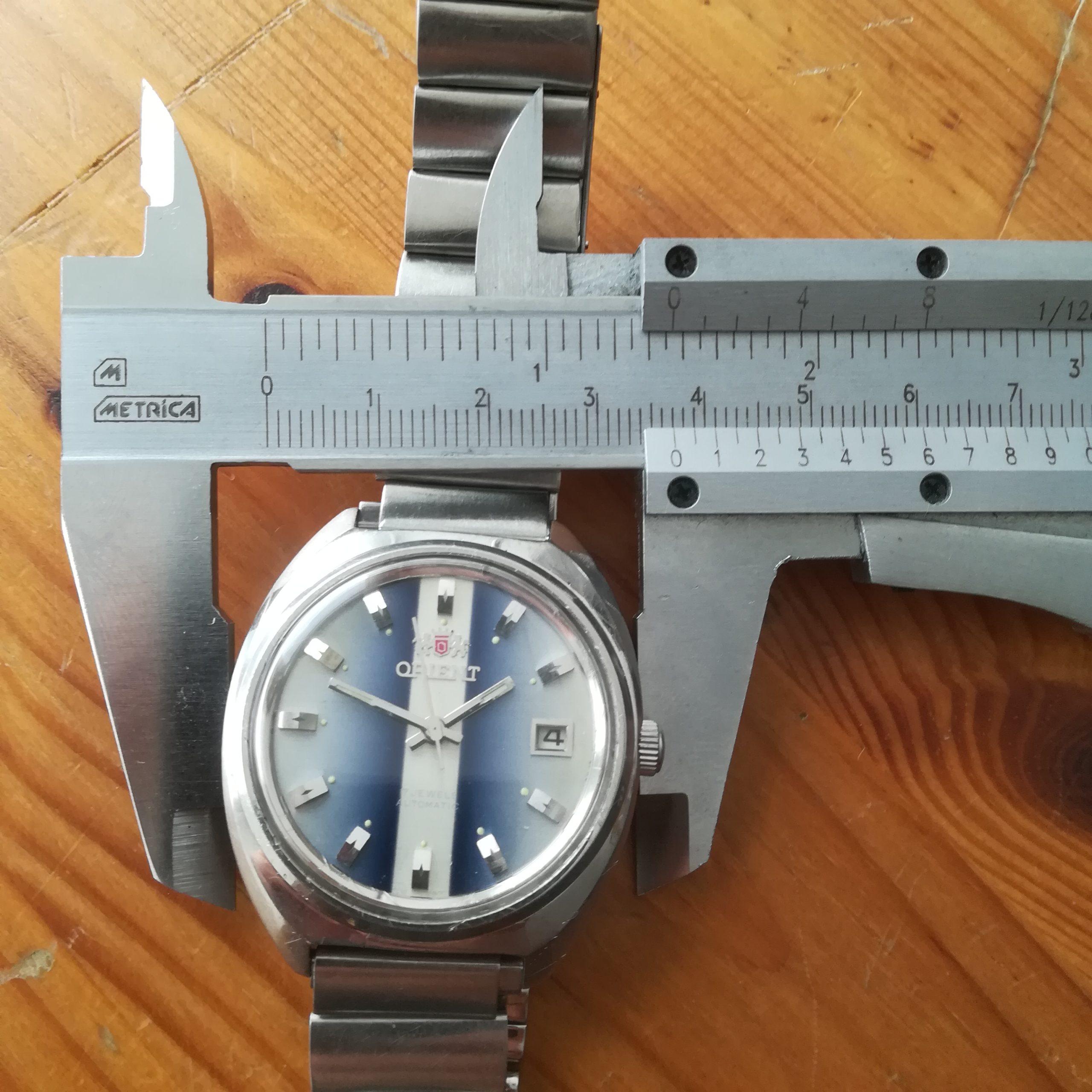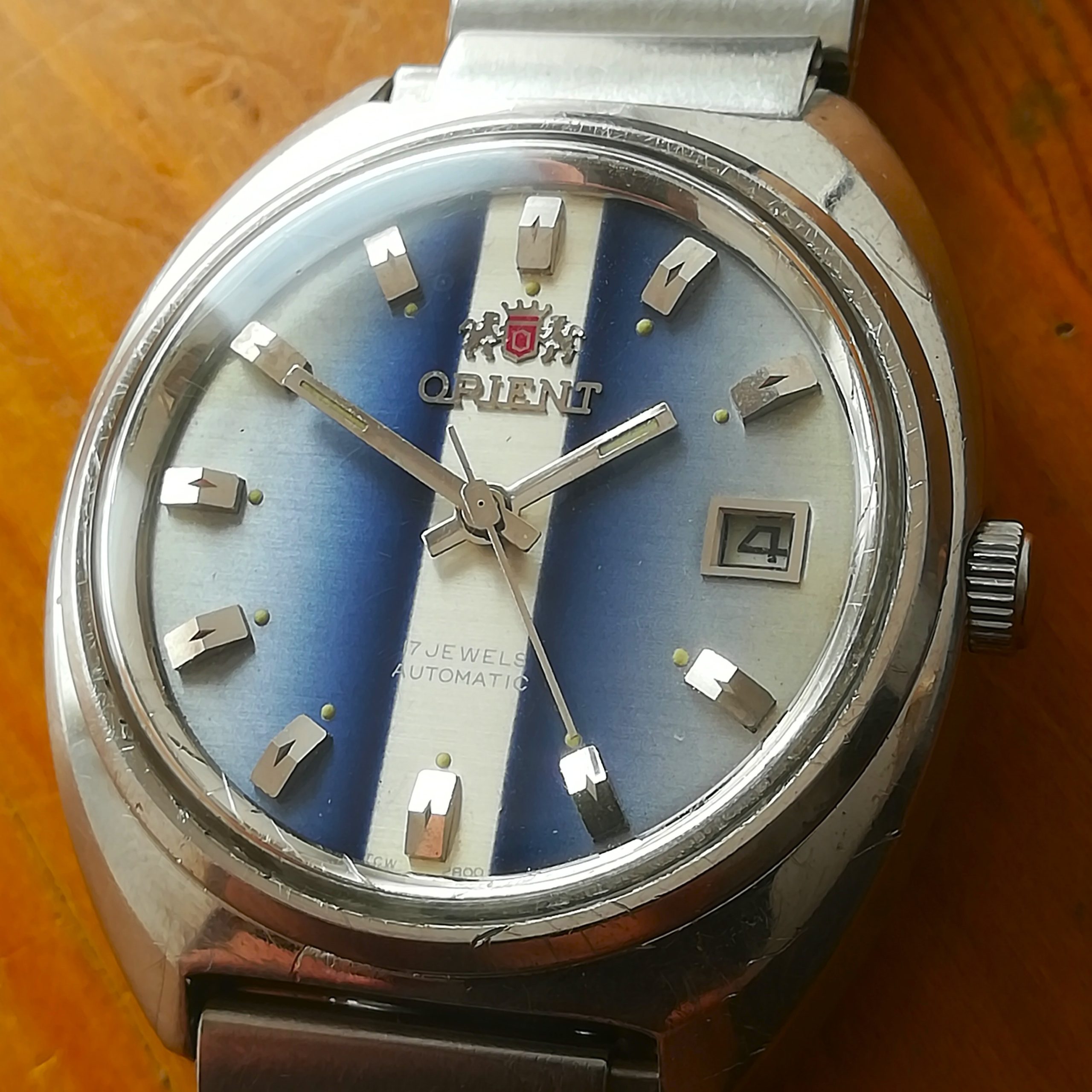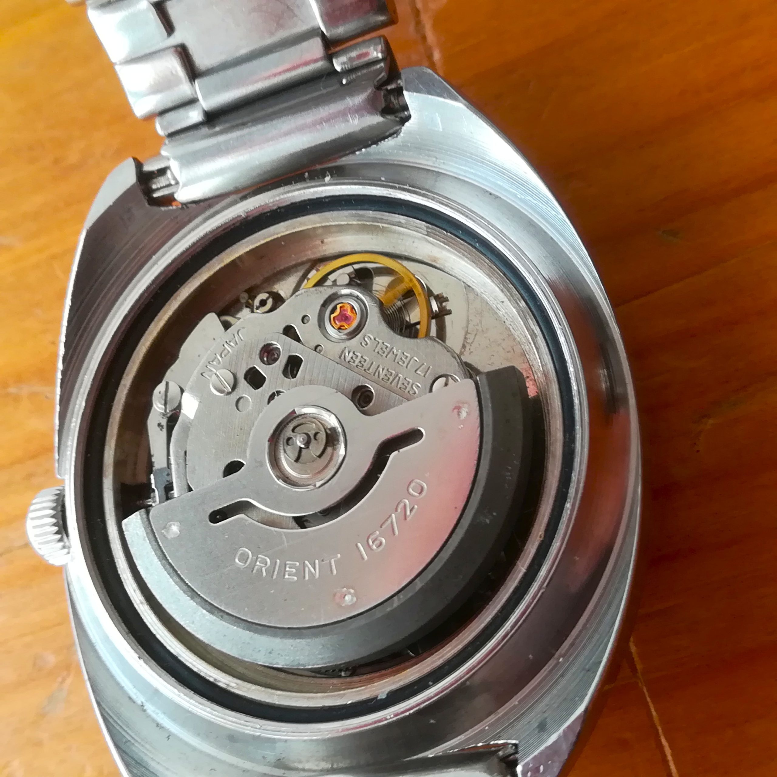 ORIENT vintage automatic watch, ref. OS310, with in-house 16720 movement, Japan made in the 1970s, case of 37 mm excluding the crown, automatic (self-winding with the user’s movements) and hand-wound (mechanical, no battery!) with date indication, working fine and serviced.