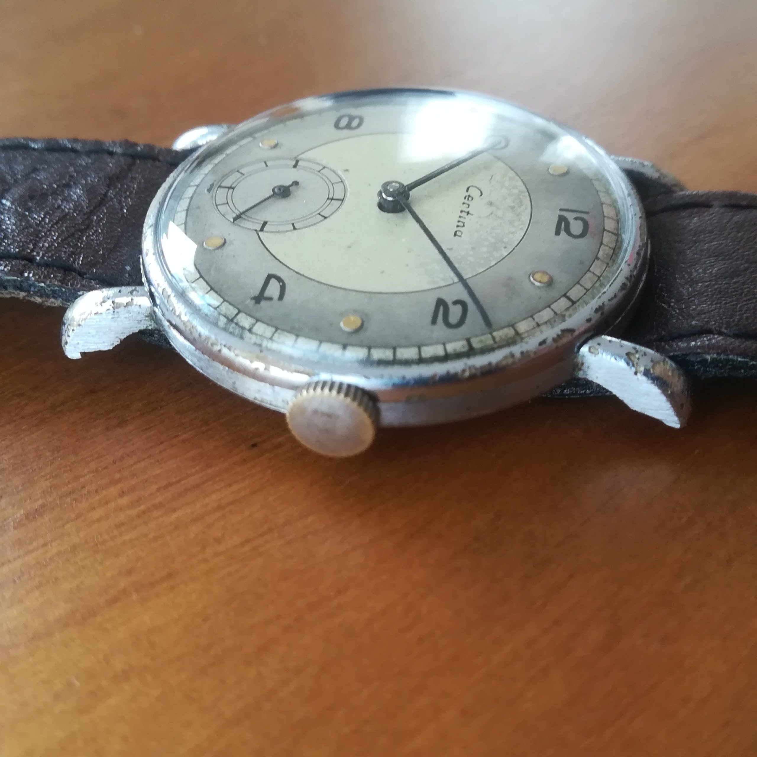 The gorgeous bi-tone dial is in a fair condition, displayng the very rare earliest Certina typeface. That’s why this is a true collector’s piece!