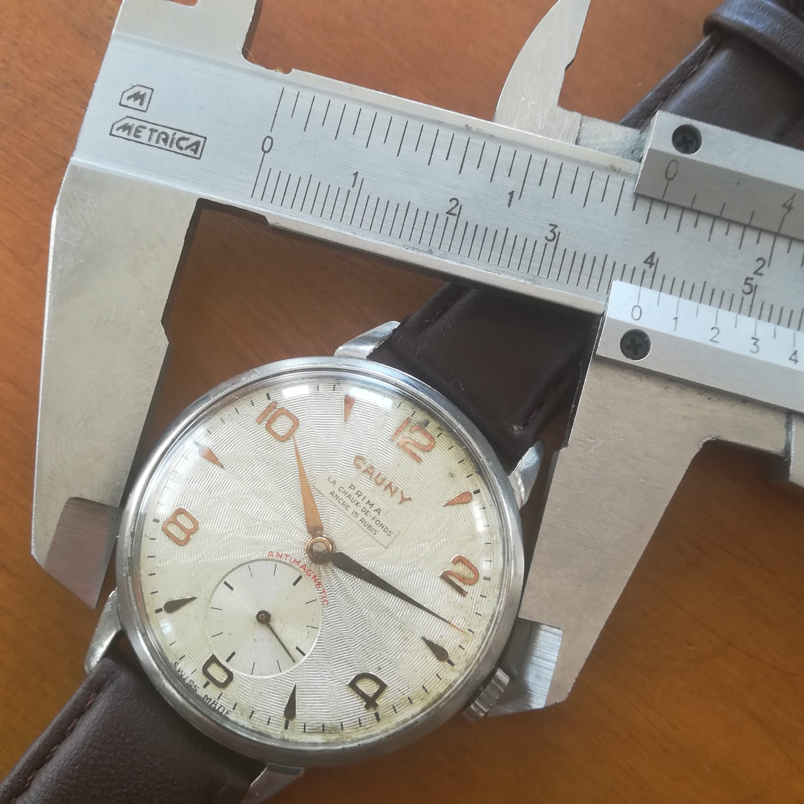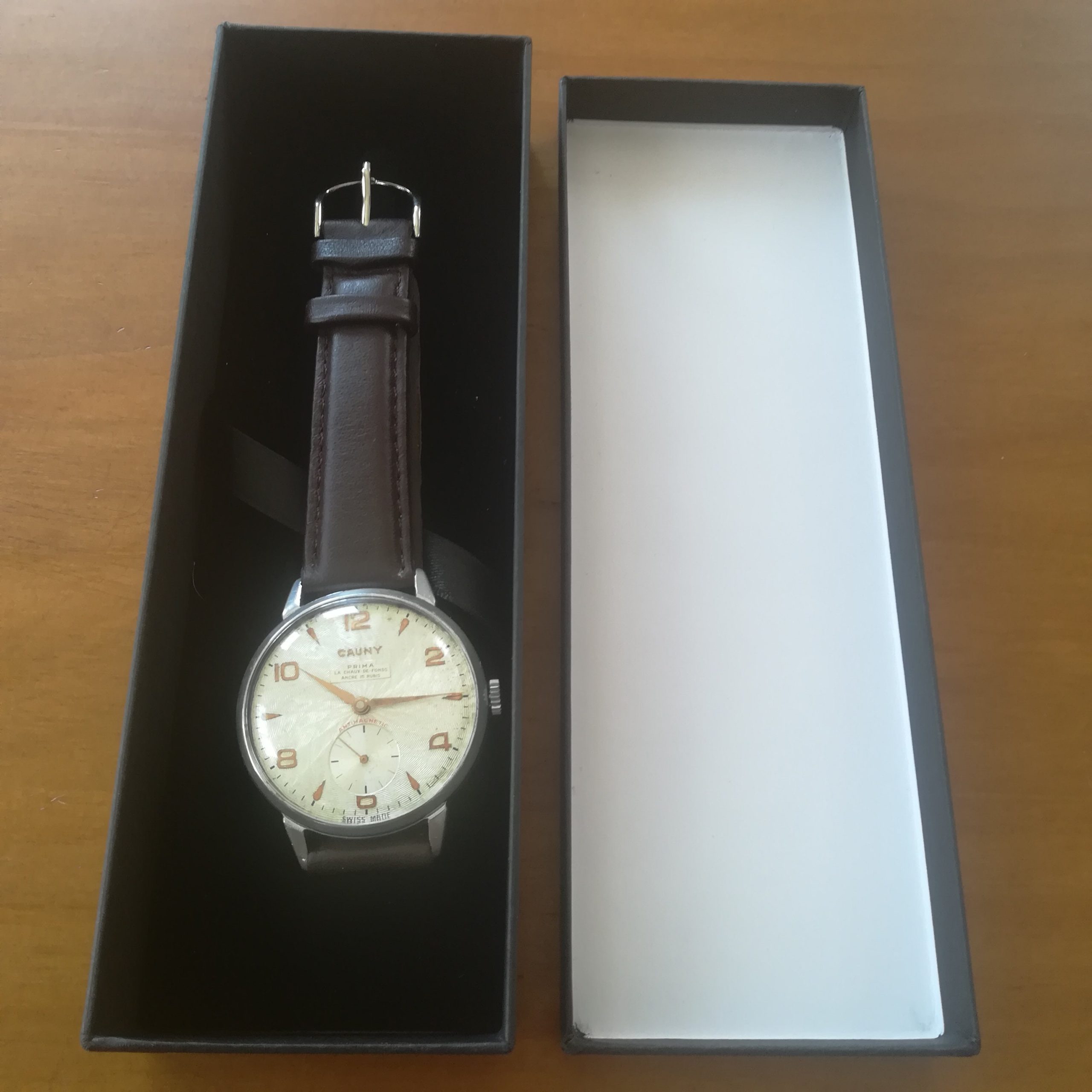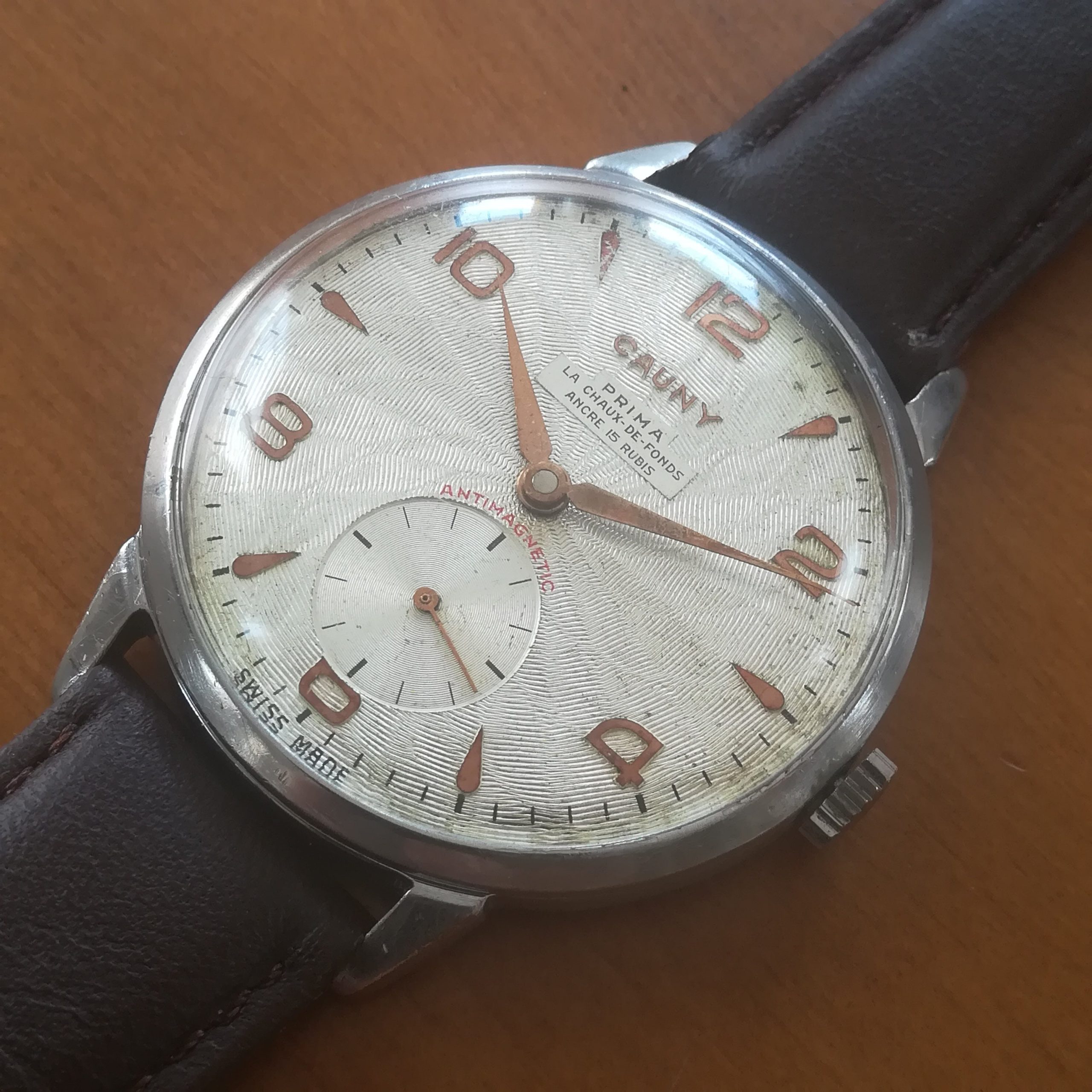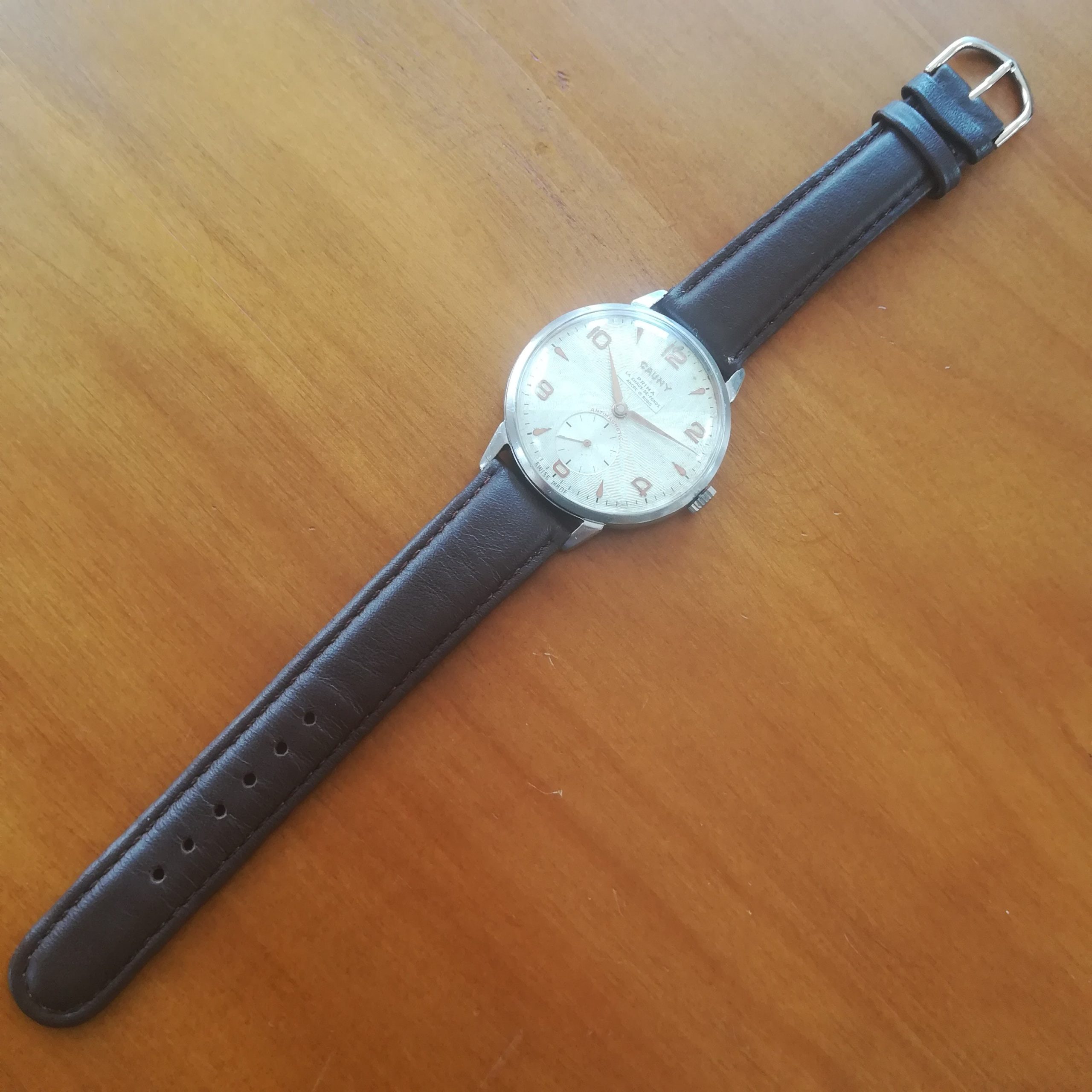 Very rare CAUNY Prima vintage watch, with Landeron 203 movement, Swiss made in the 50s, 39 mm across excluding the crown, hand-wound (mechanical, no battery!), working fine and serviced.