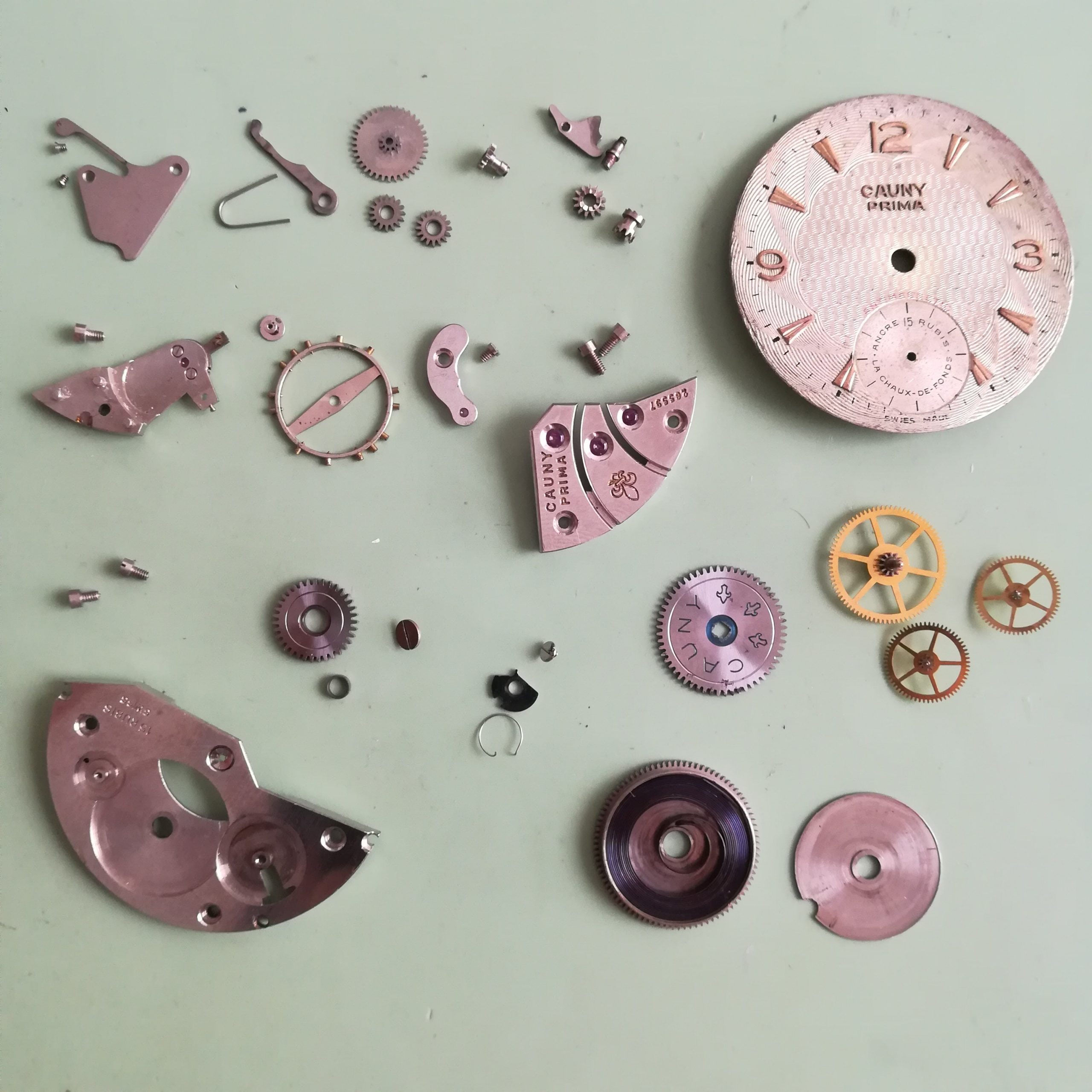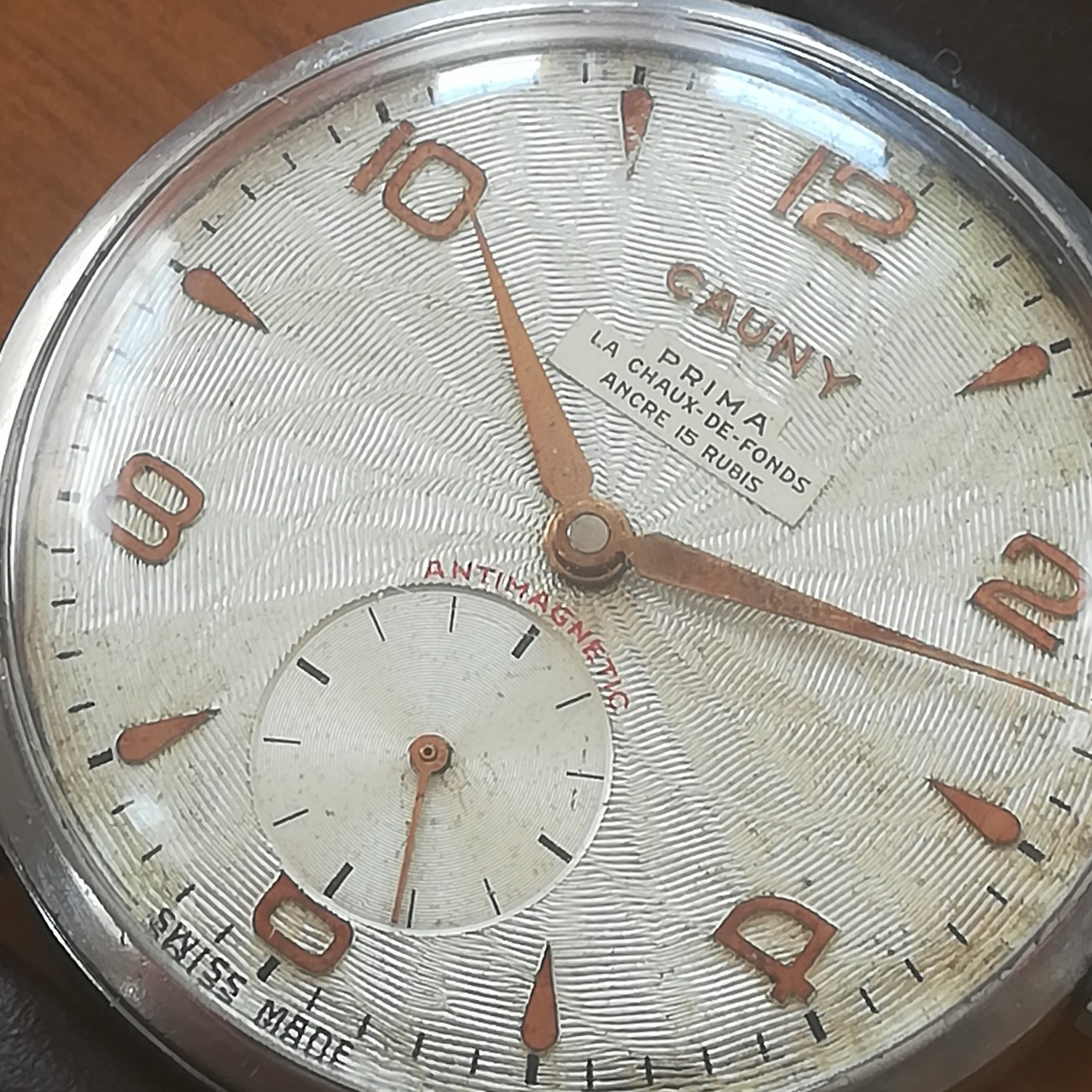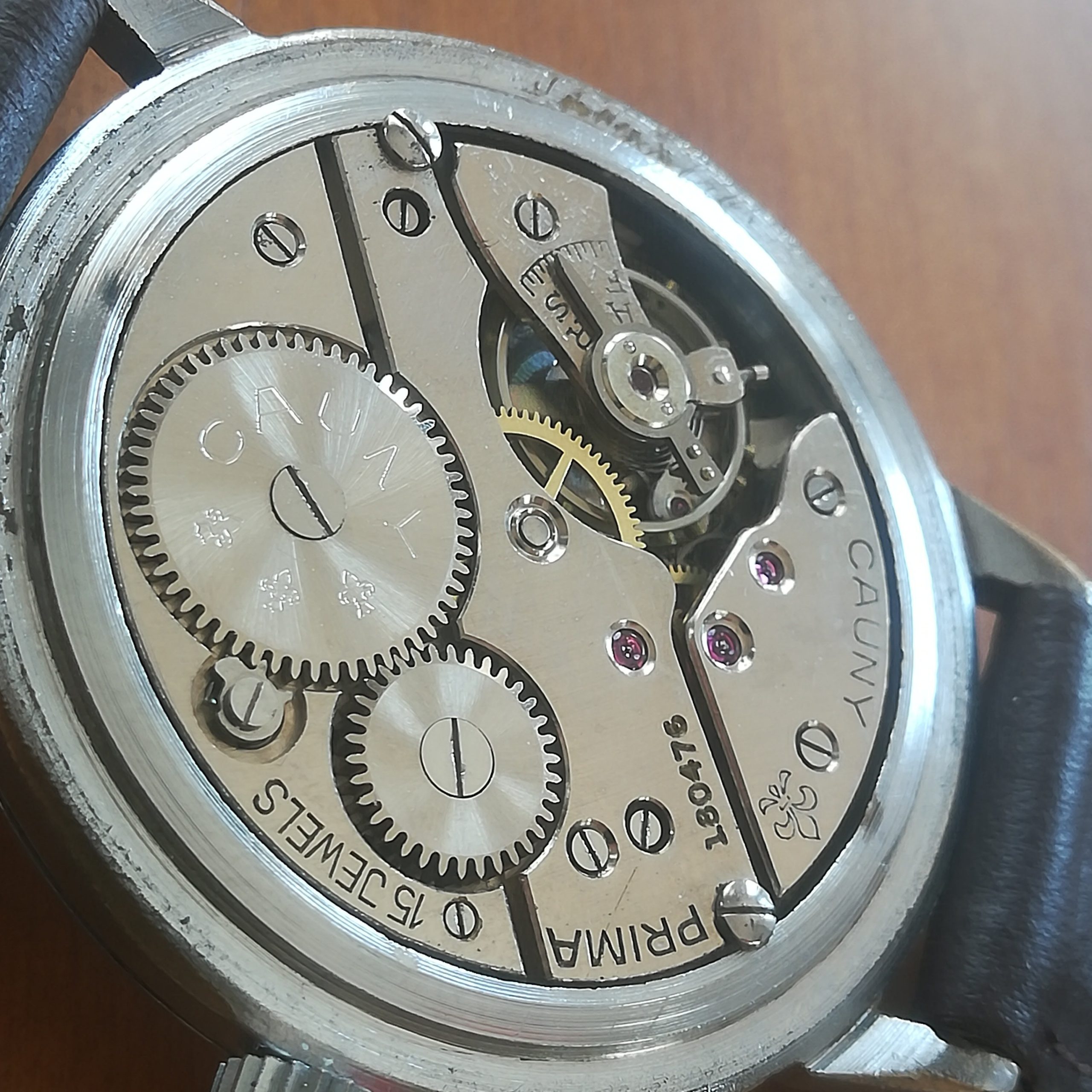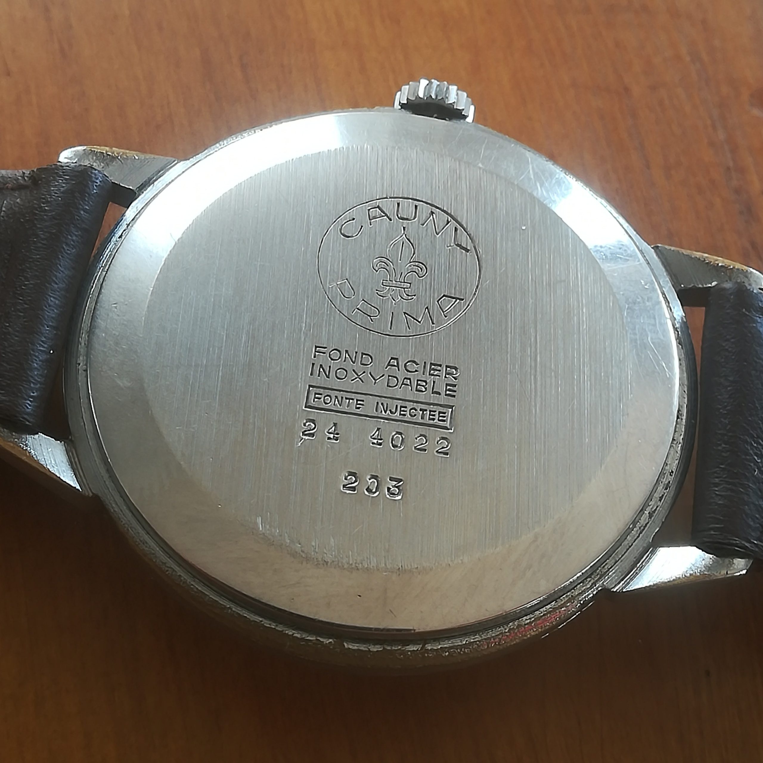 Very rare CAUNY Prima vintage watch, with Landeron 203 movement, Swiss made in the 50s, 39 mm across excluding the crown, hand-wound (mechanical, no battery!), working fine and serviced.
