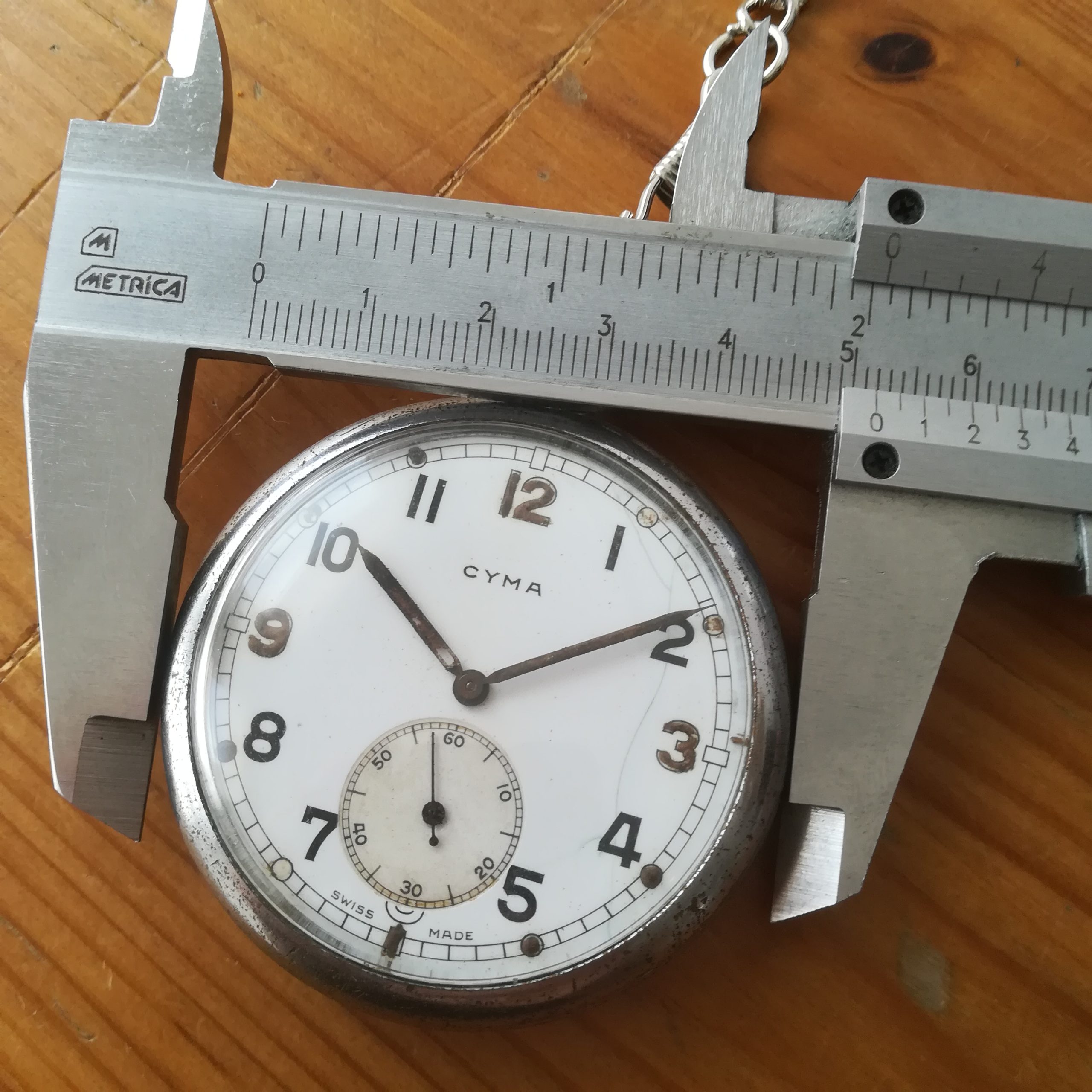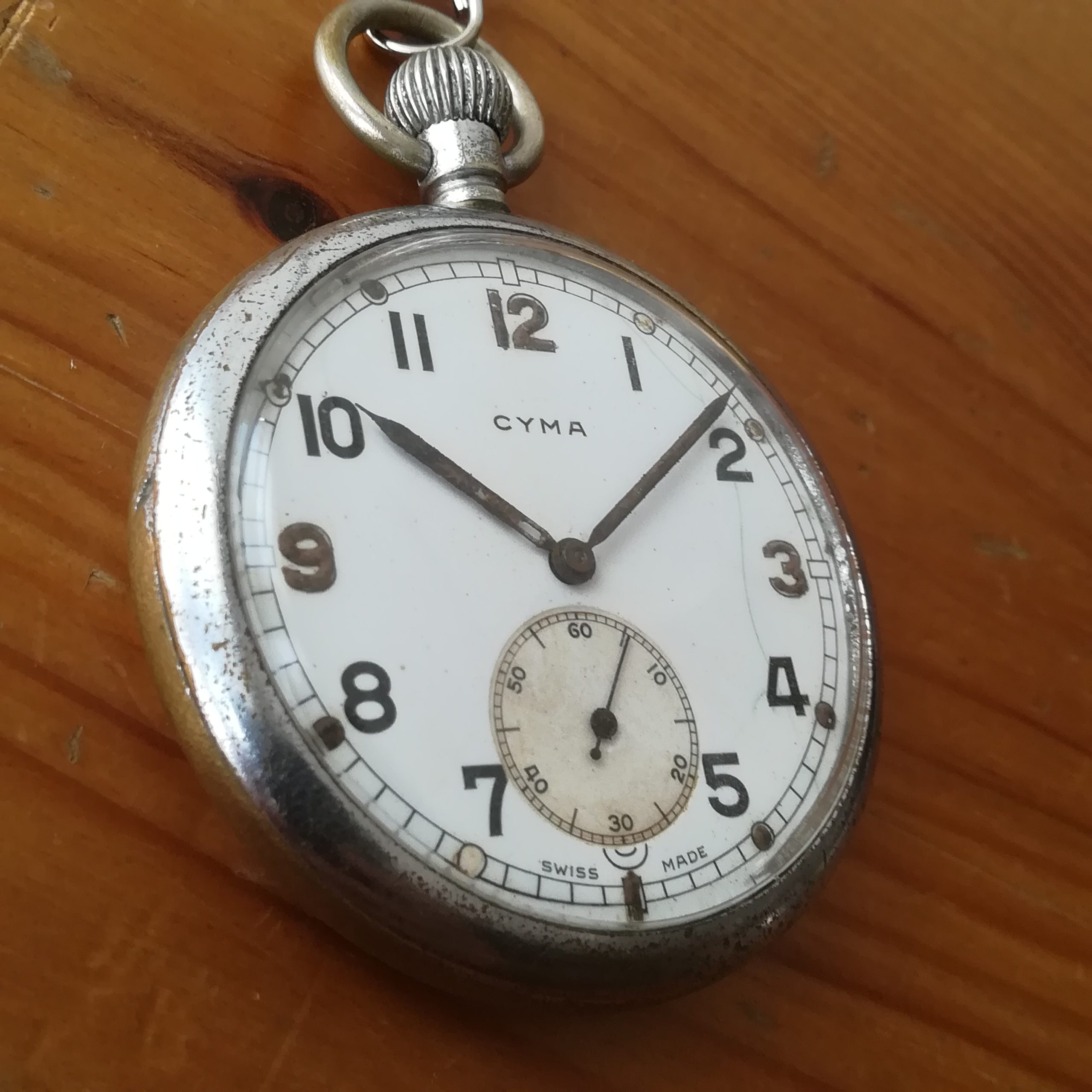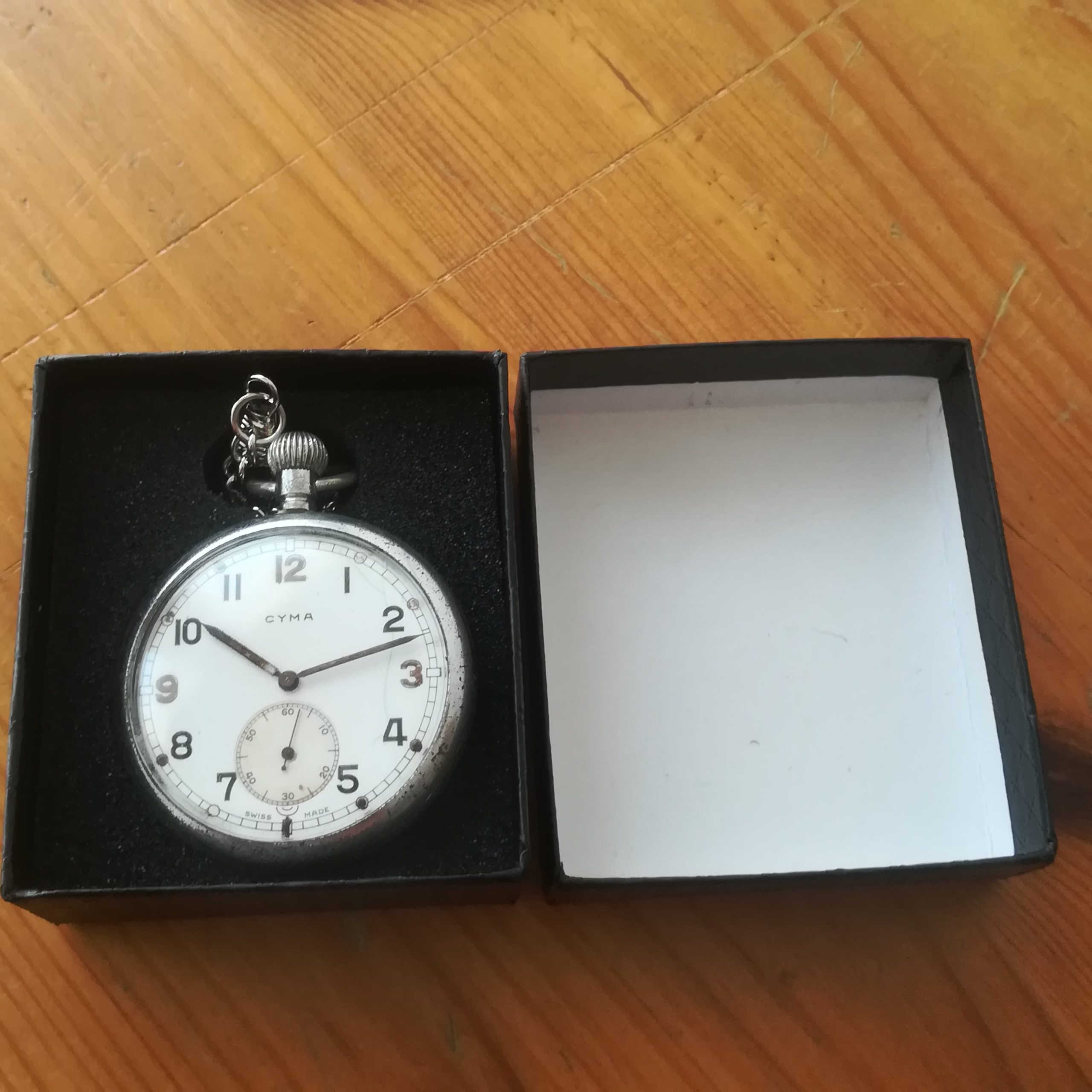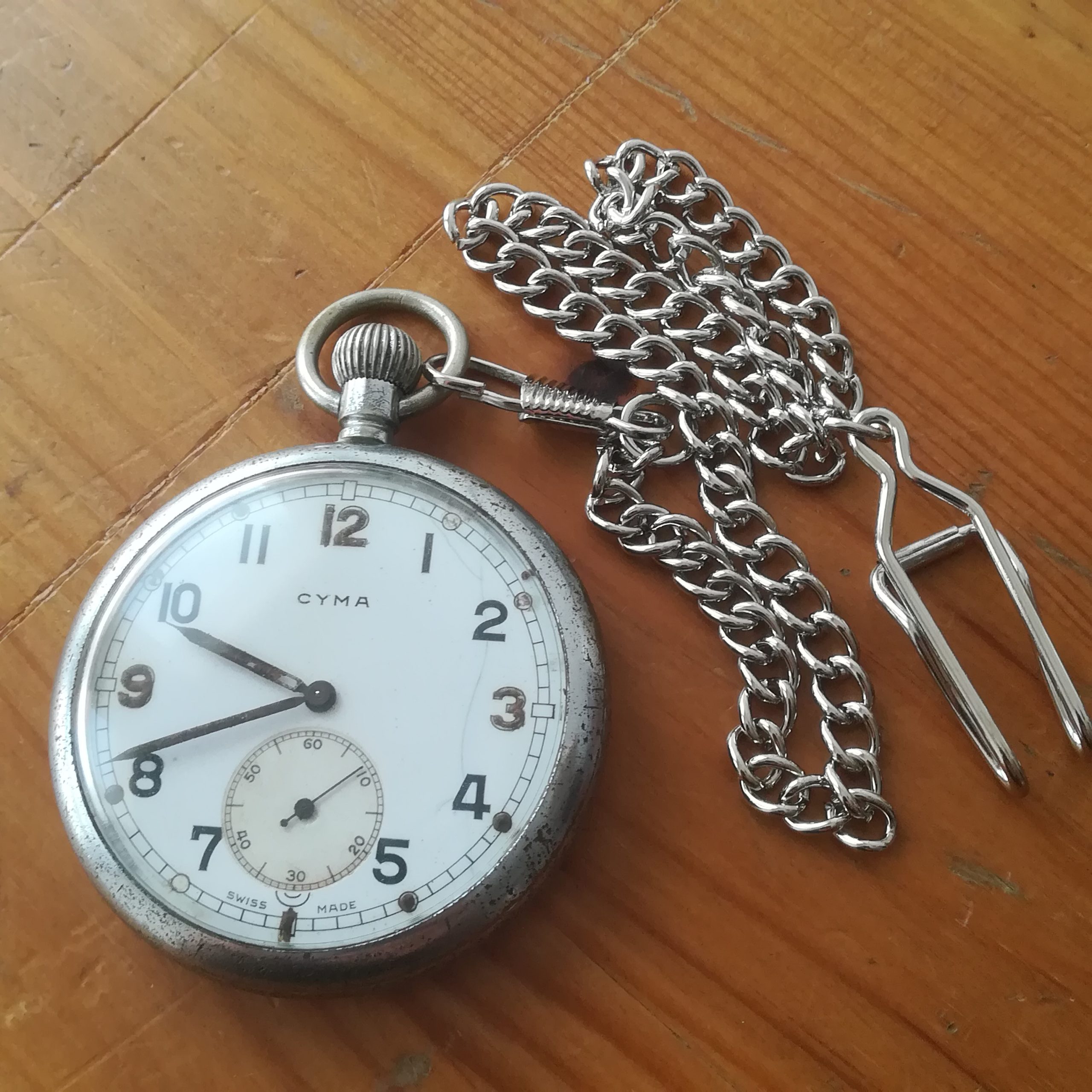 British Army CYMA pocket watch, with Cyma 775 movement, Swiss made in the late 1930s for use by the British Army during World War II, case of 52 mm, hand-wound (mechanical, no battery!), working fine and serviced.