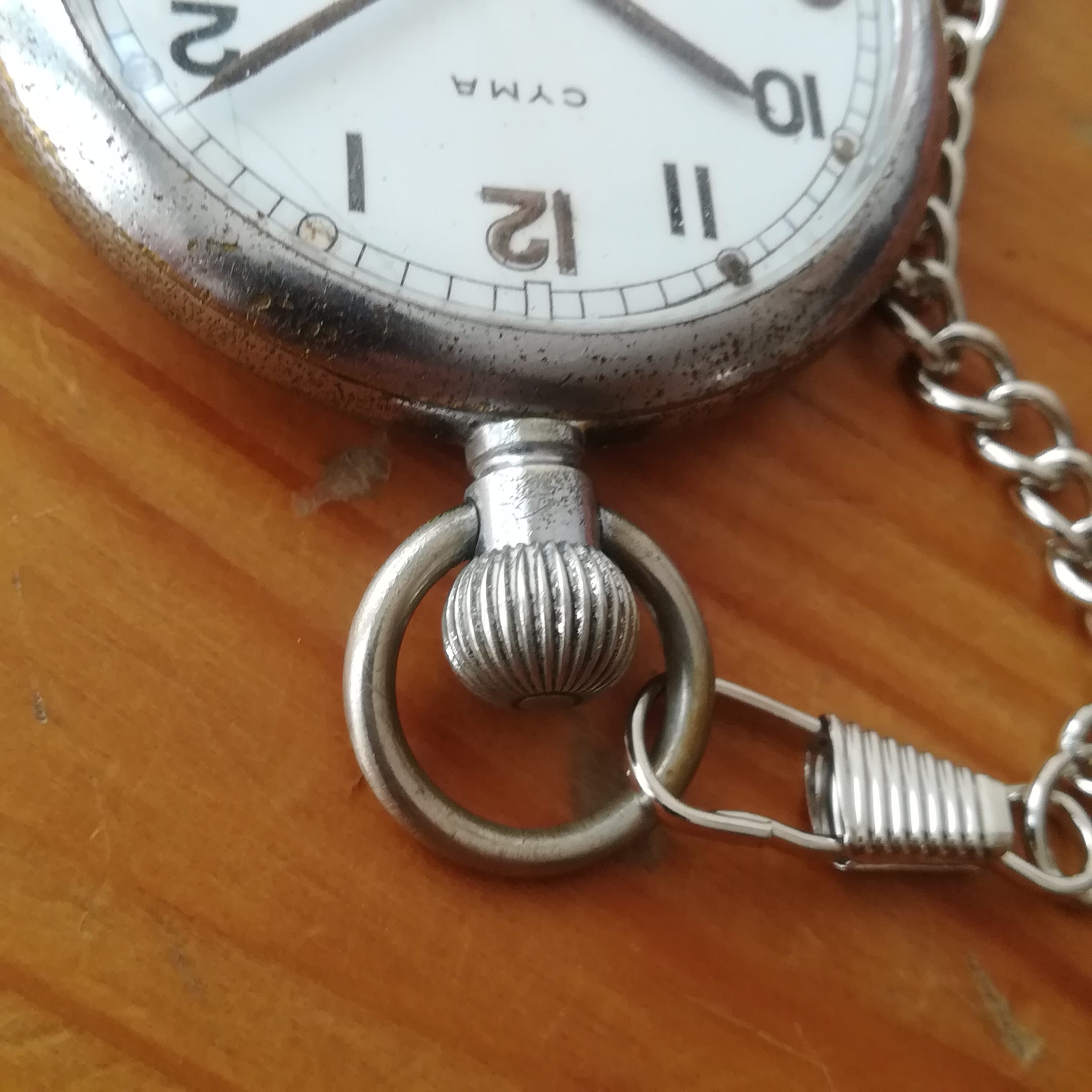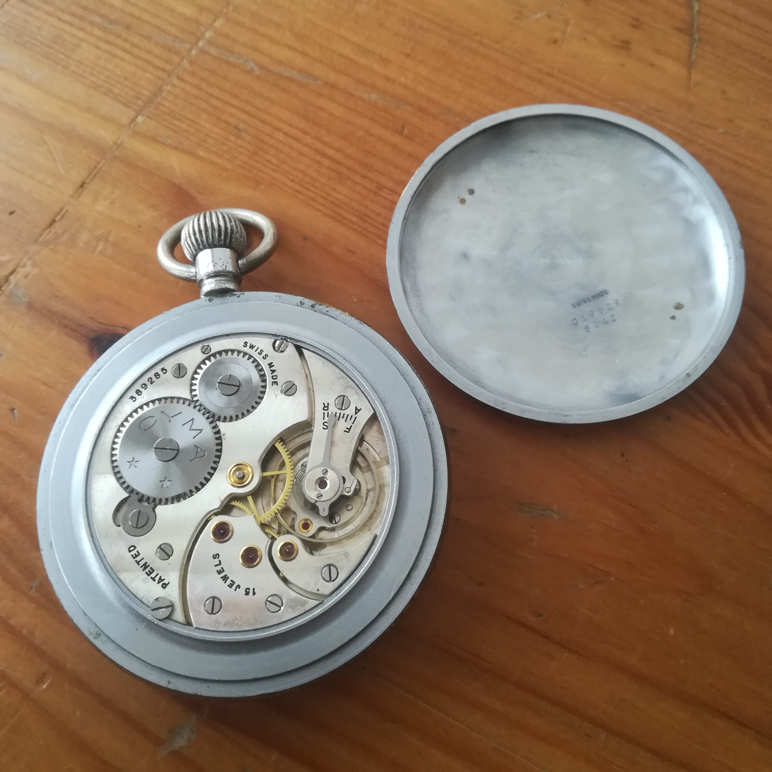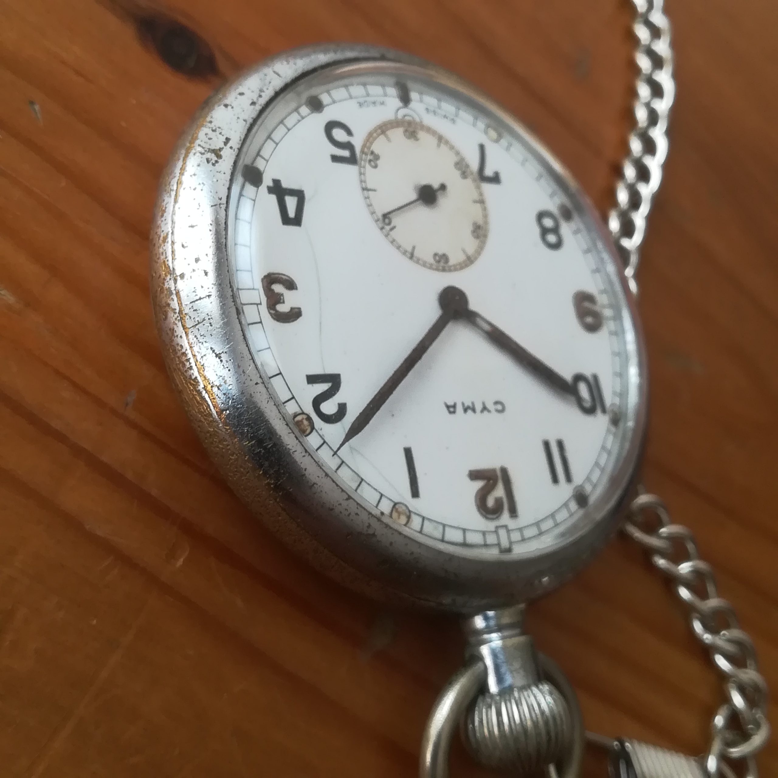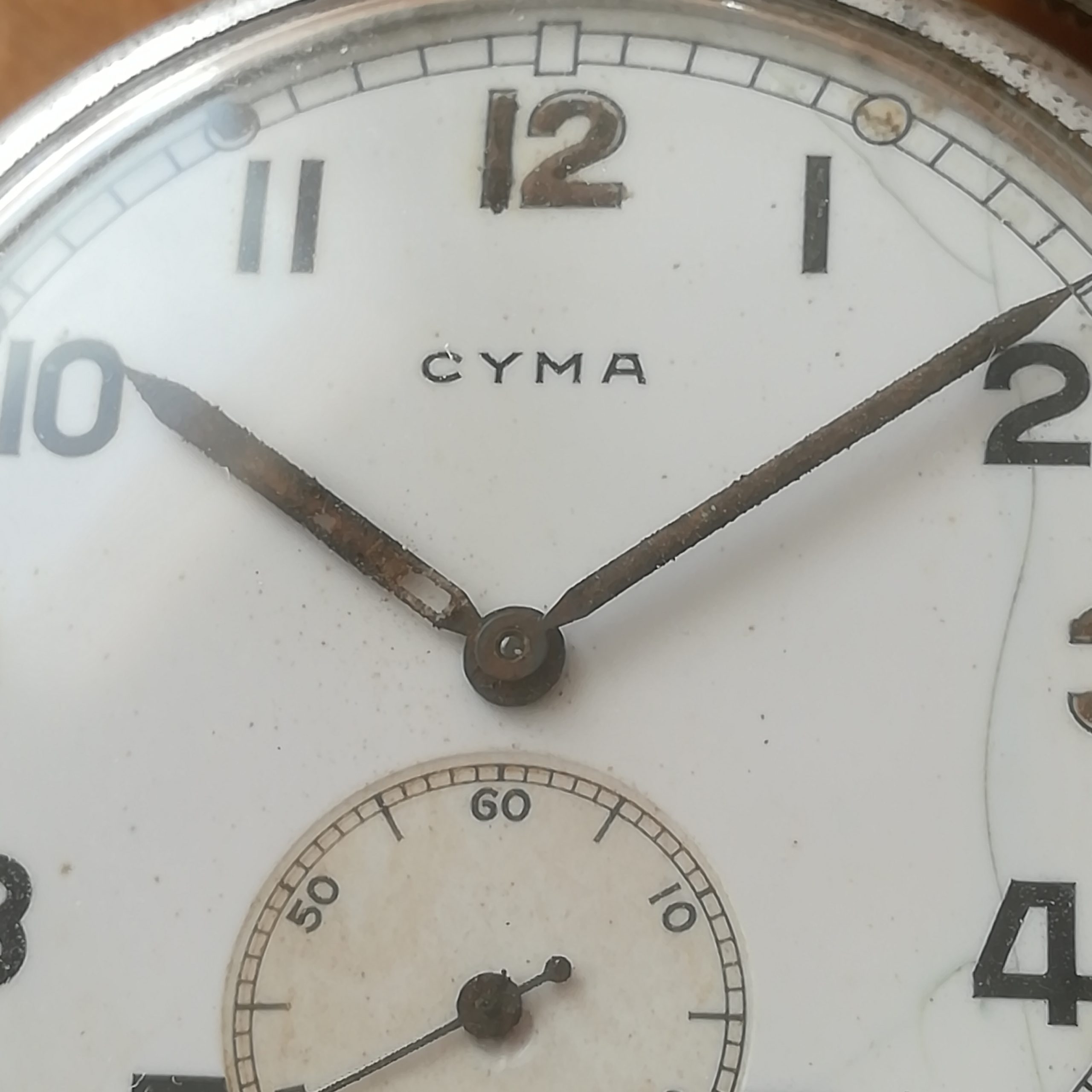 British Army CYMA pocket watch, with Cyma 775 movement, Swiss made in the late 1930s for use by the British Army during World War II, case of 52 mm, hand-wound (mechanical, no battery!), working fine and serviced.